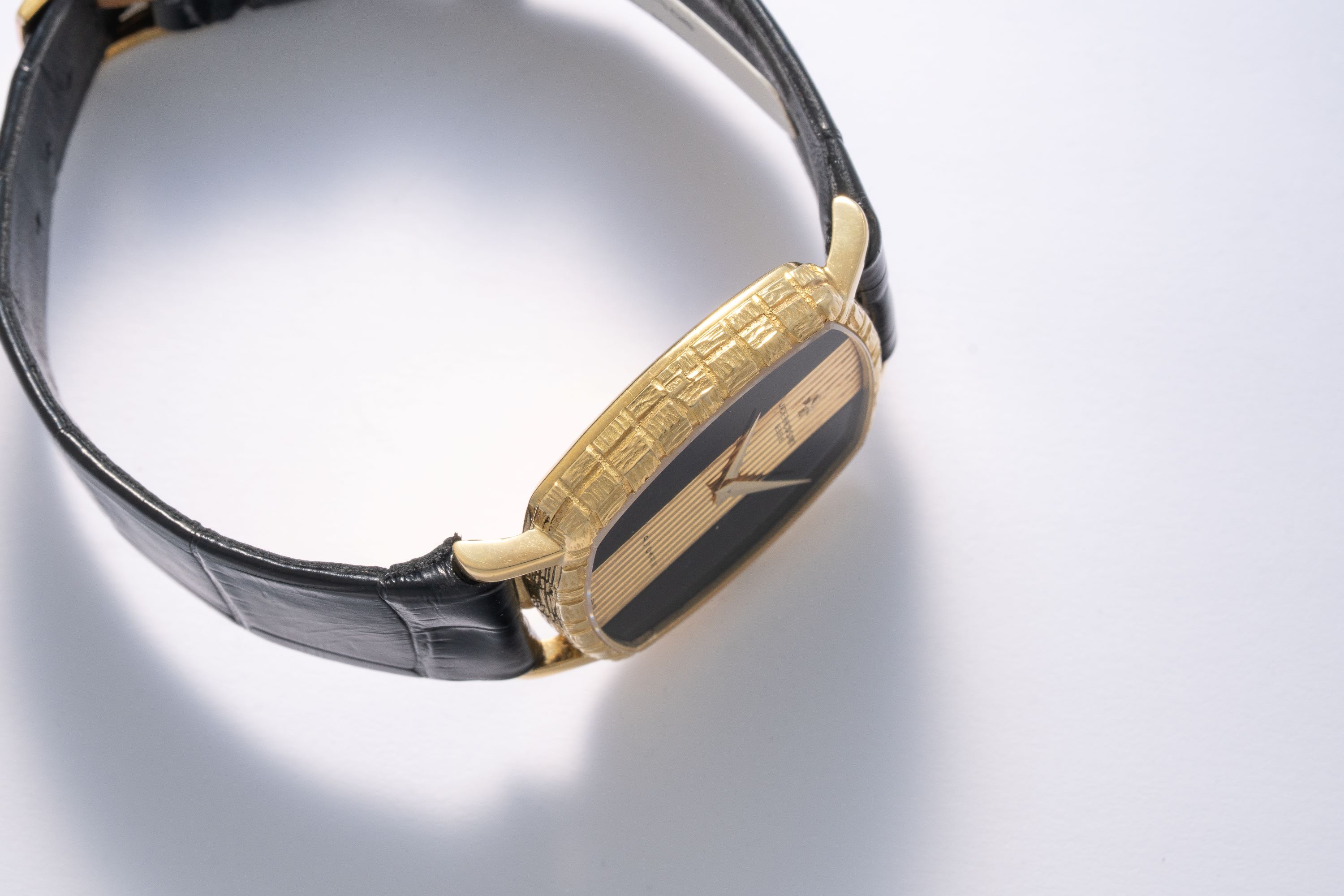 CaseRounded square case in 18k yellow gold with engraved woven pattern, crown at 3 o'clock