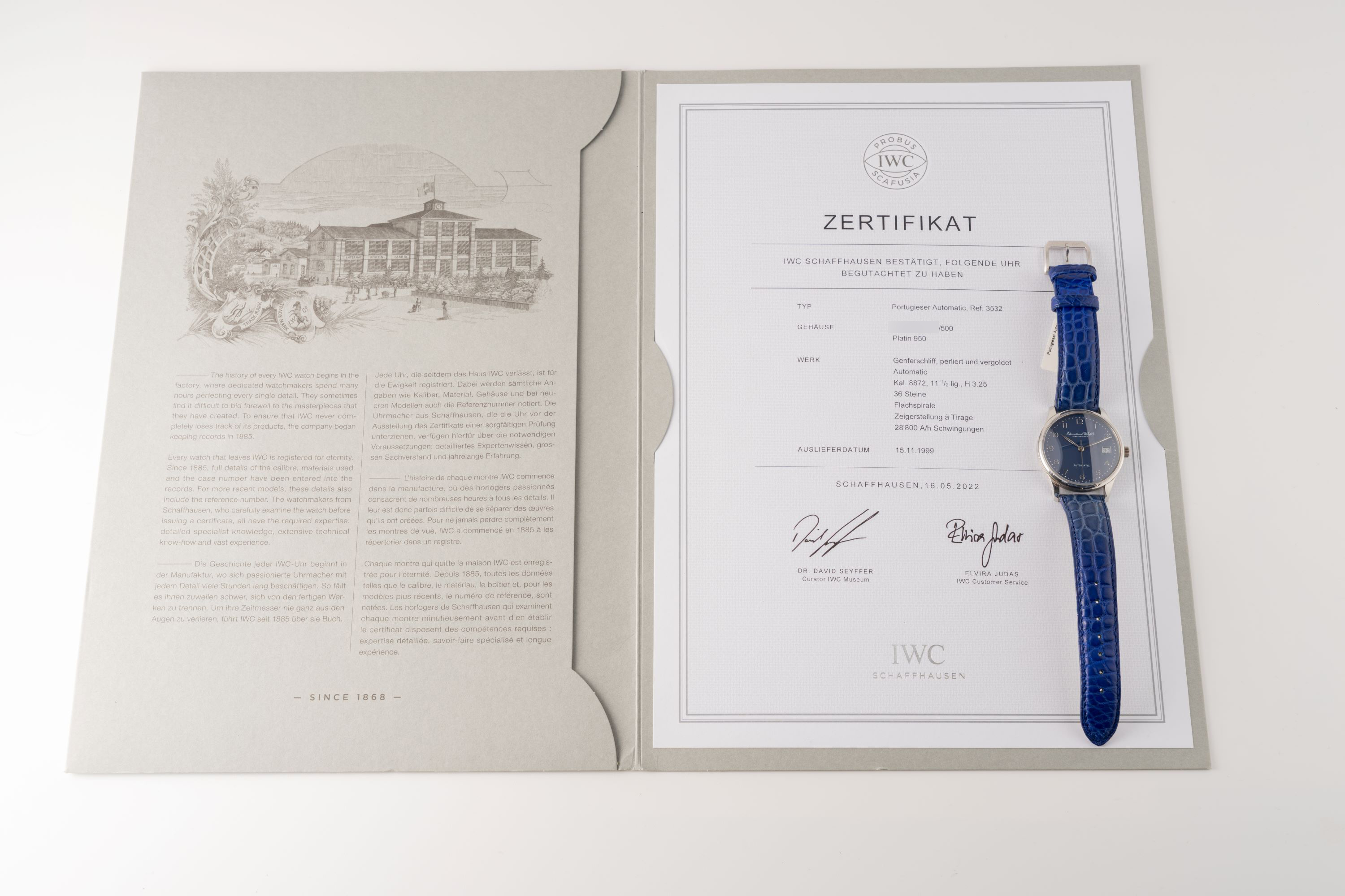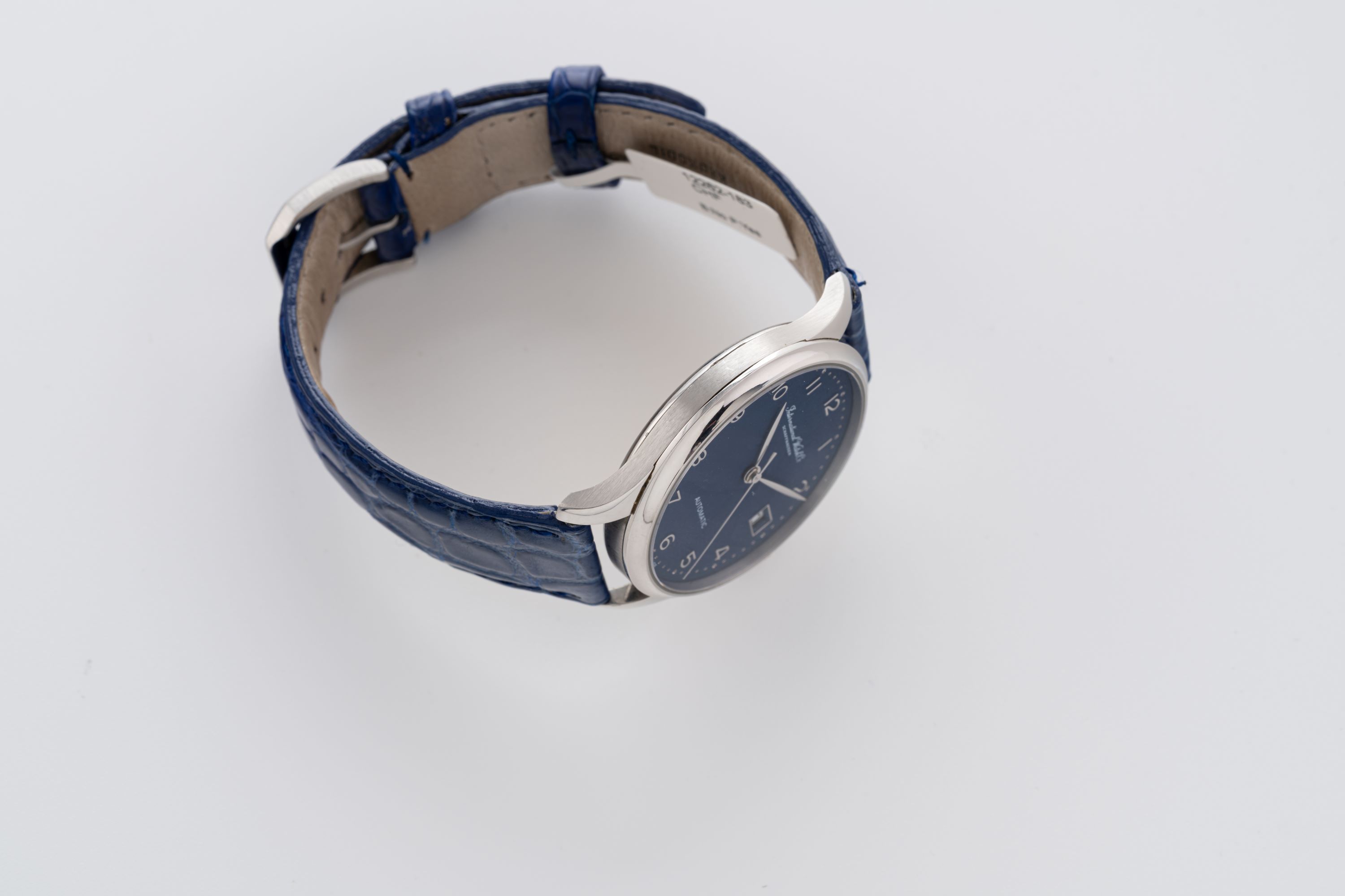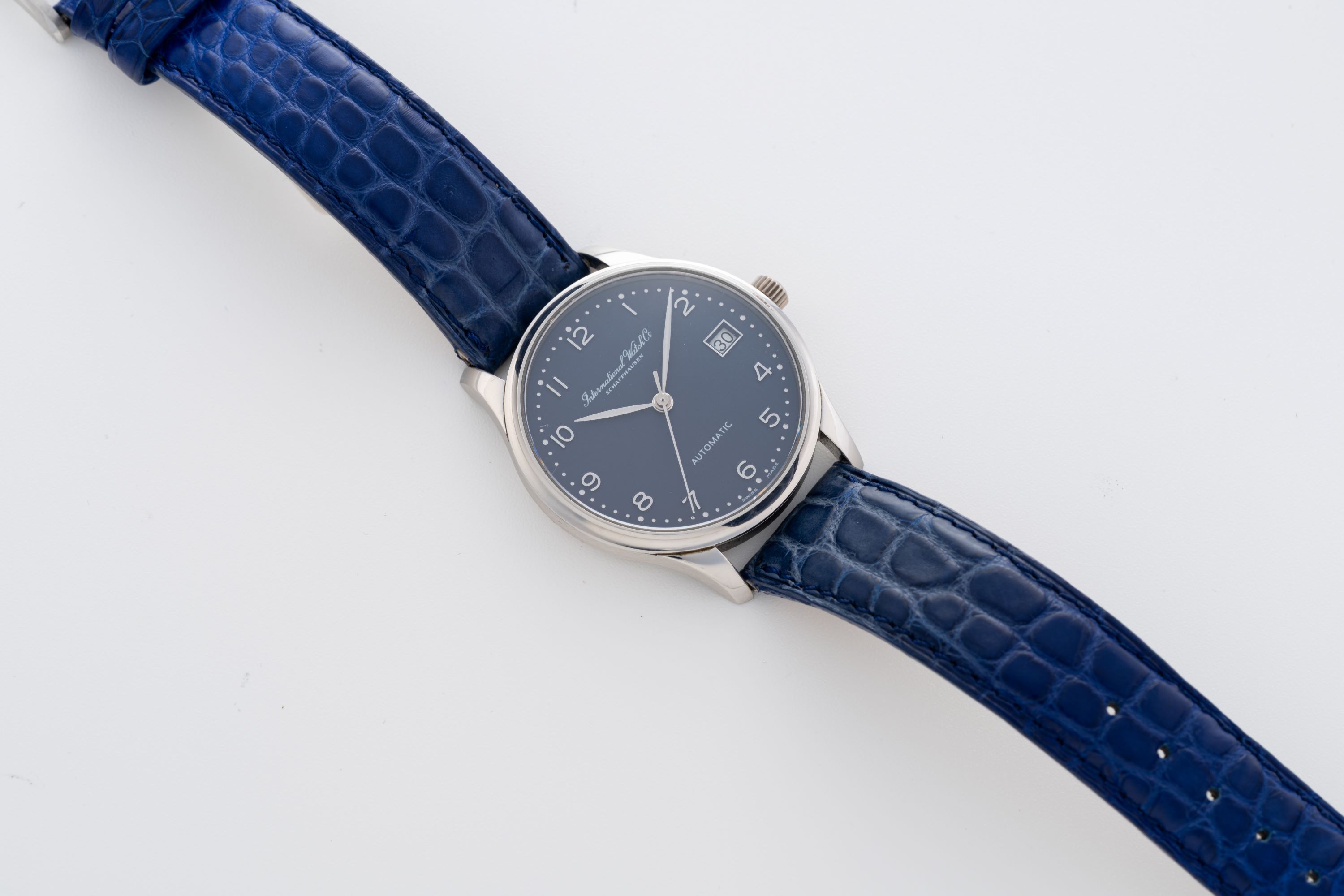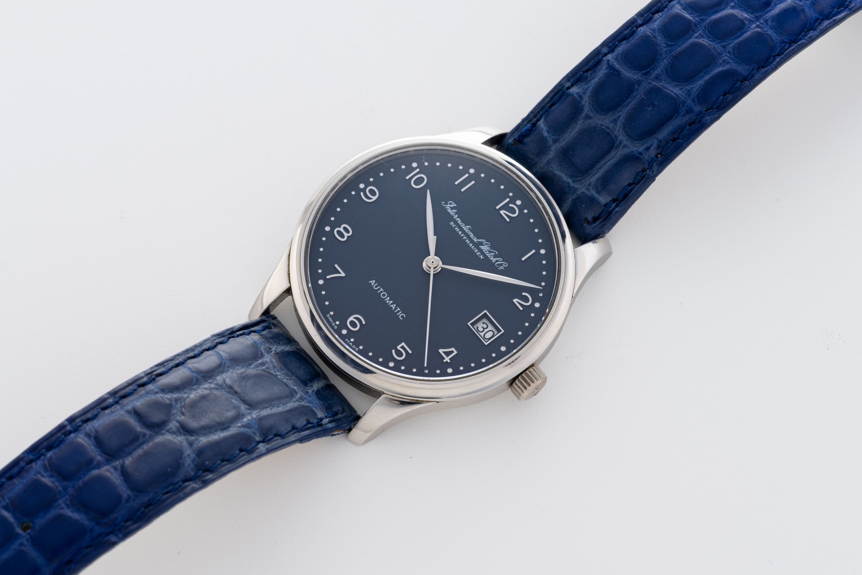 DialBlue dial with applied numerals, leaf hands, date window at 3 o'clock, signed 'International Watch Co.' at 12 o'clock
