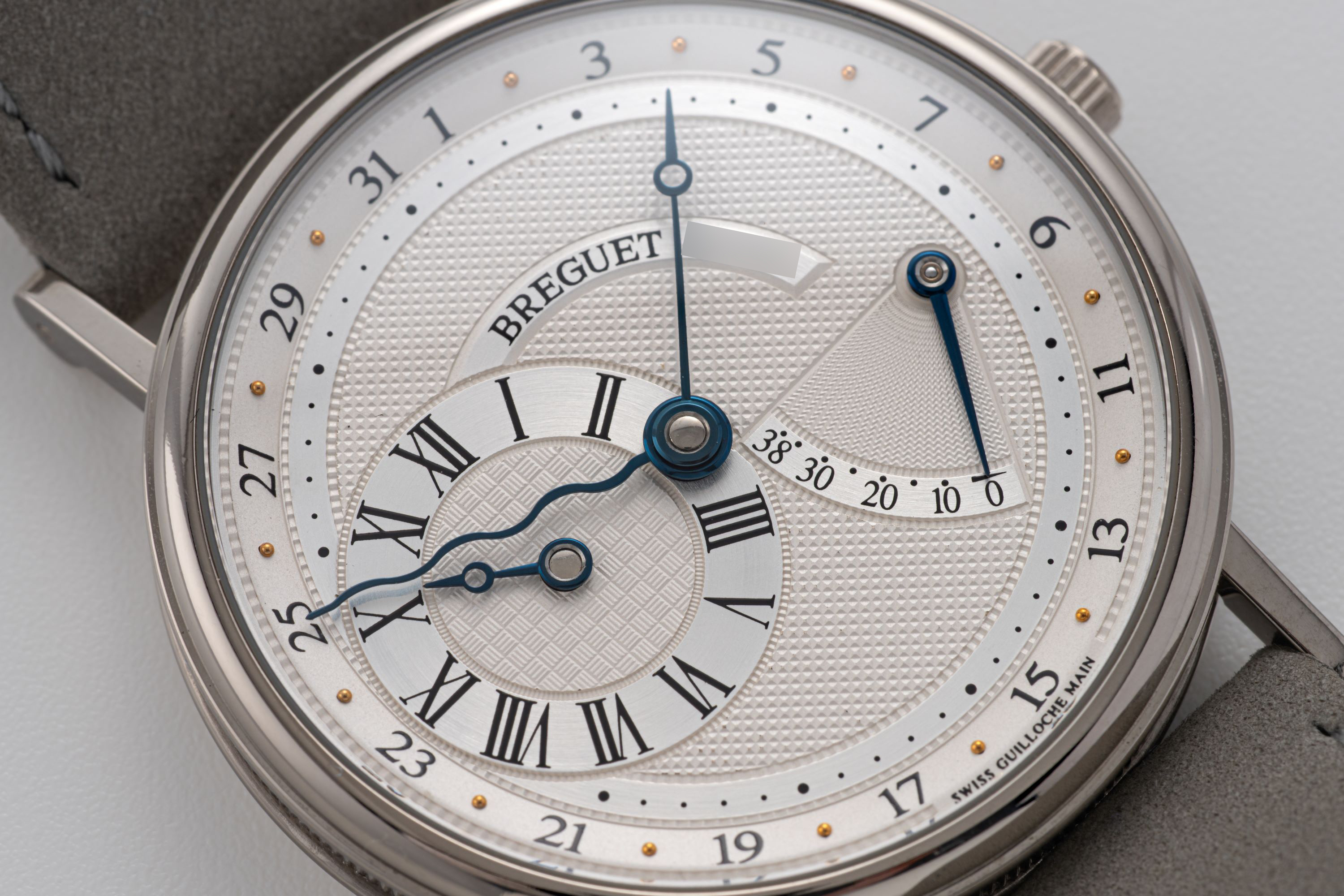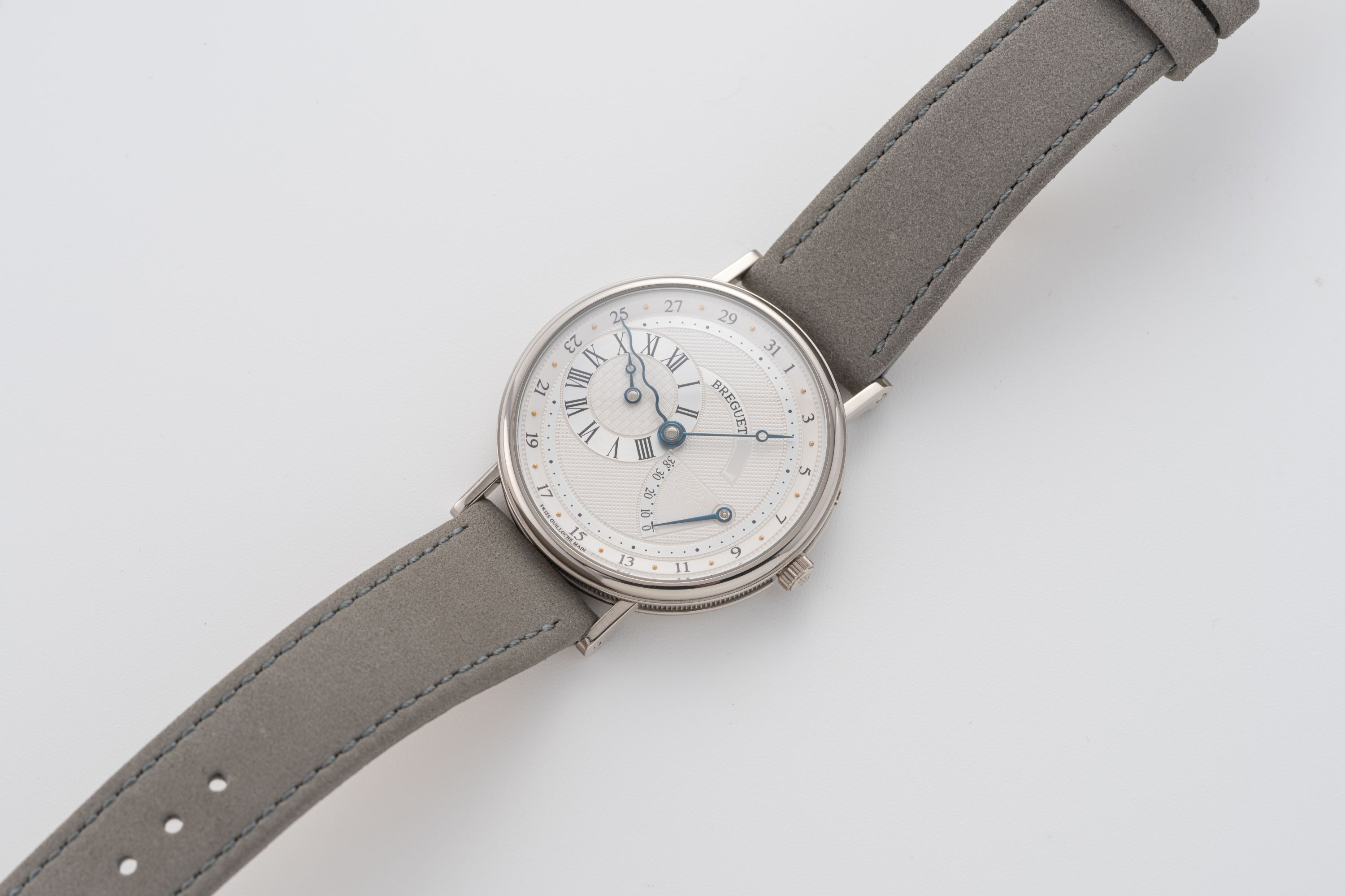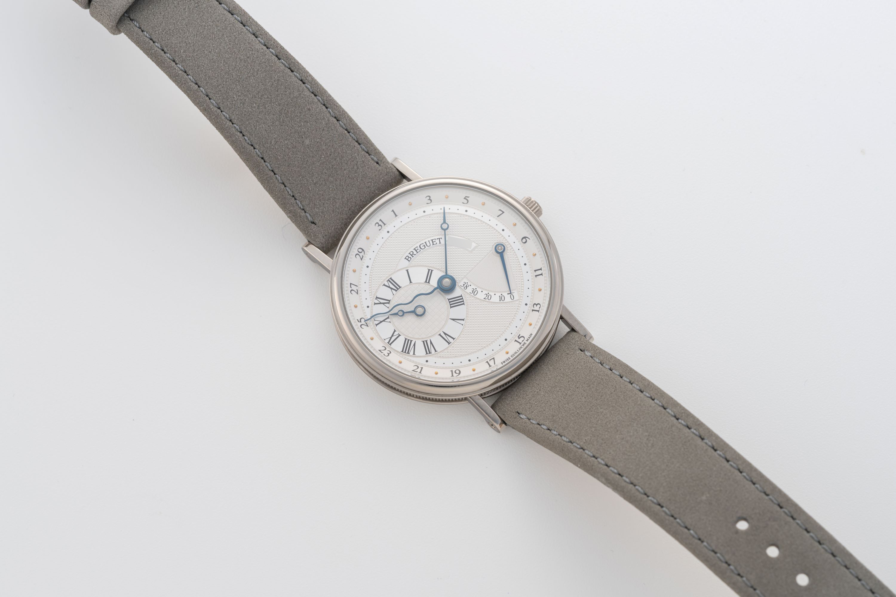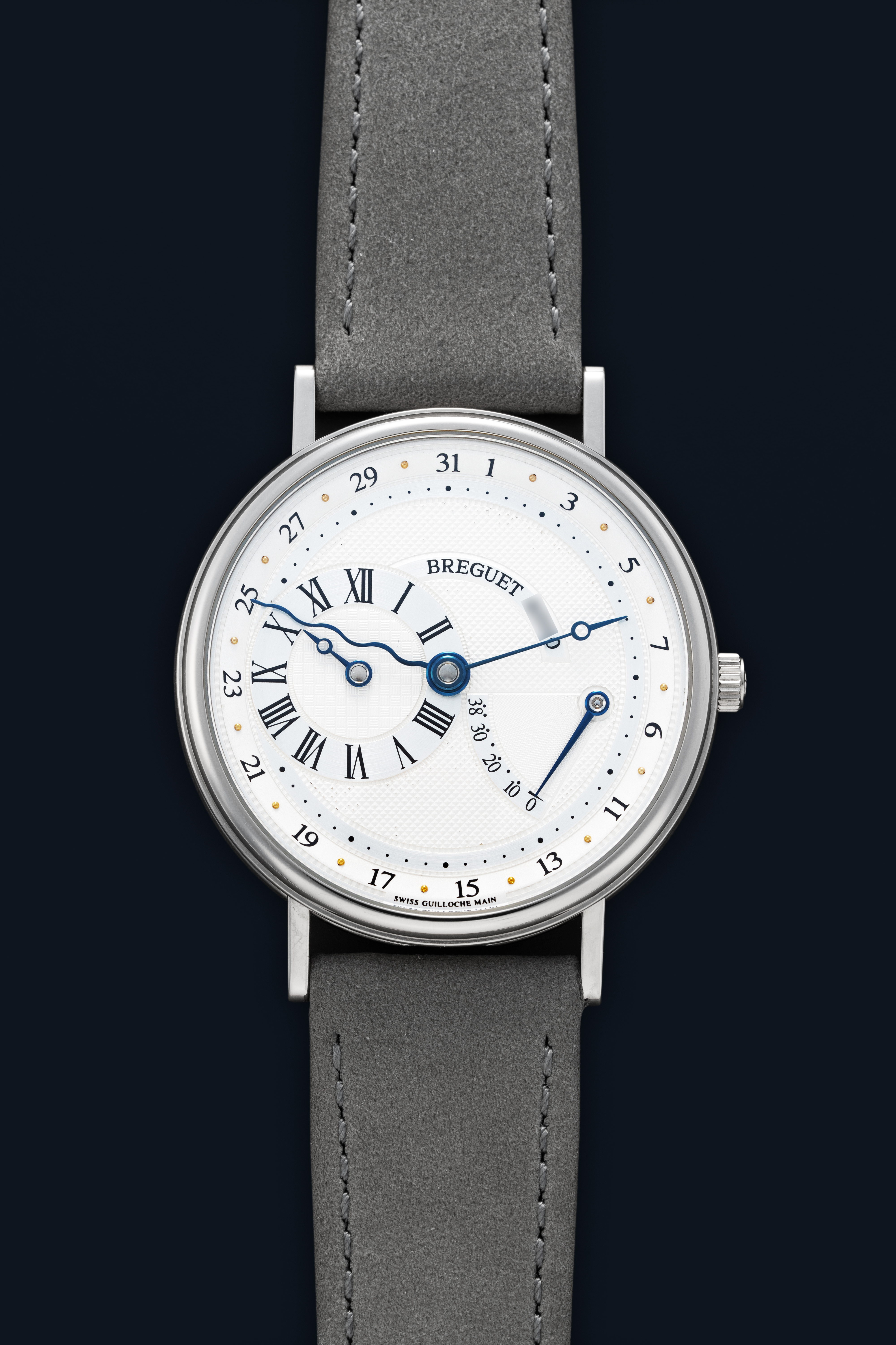 DialSilver guilloche dial with outer date track, heat-blued hands, hour subdial at 9 o'clock, central minutes, power reserve at 3:30