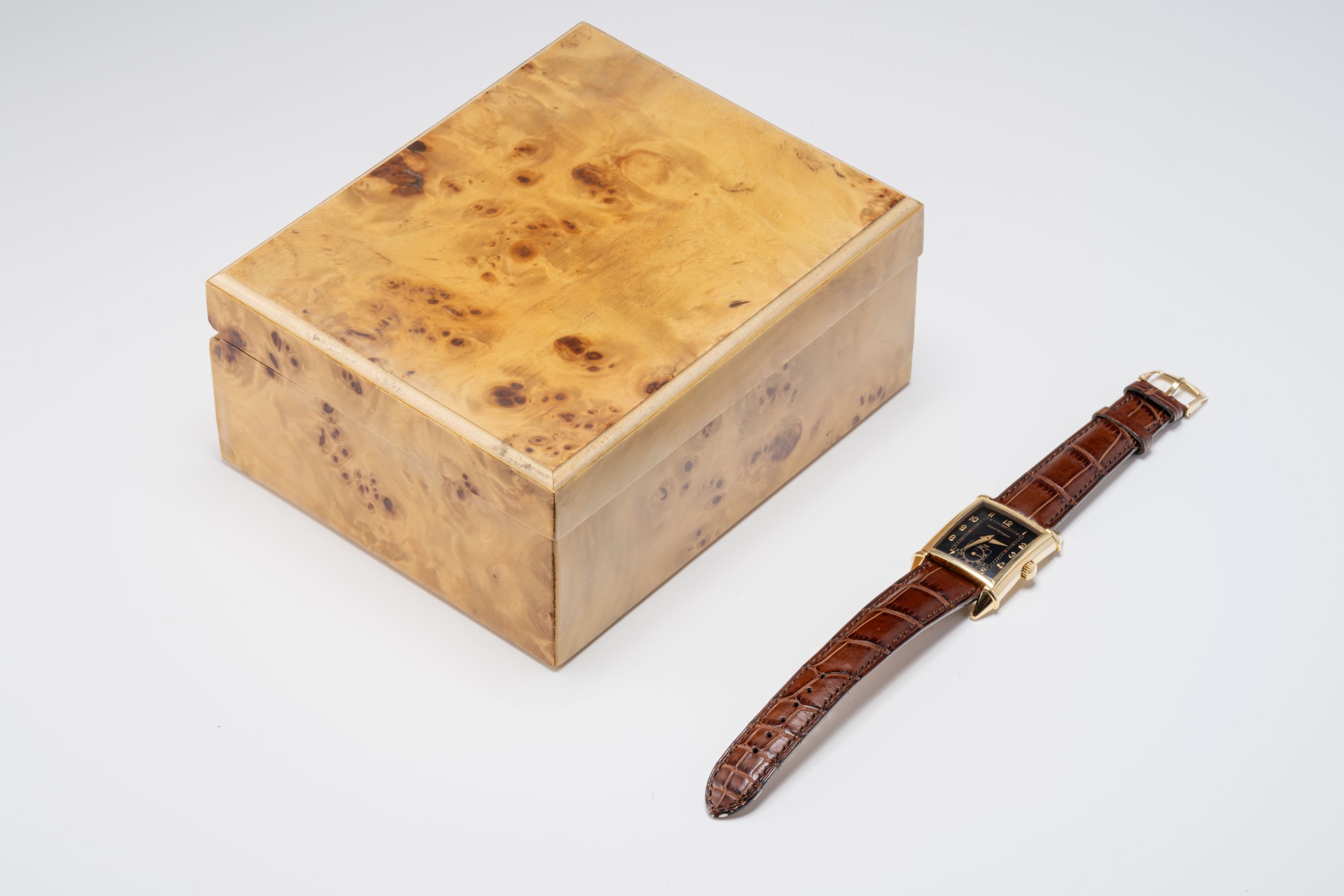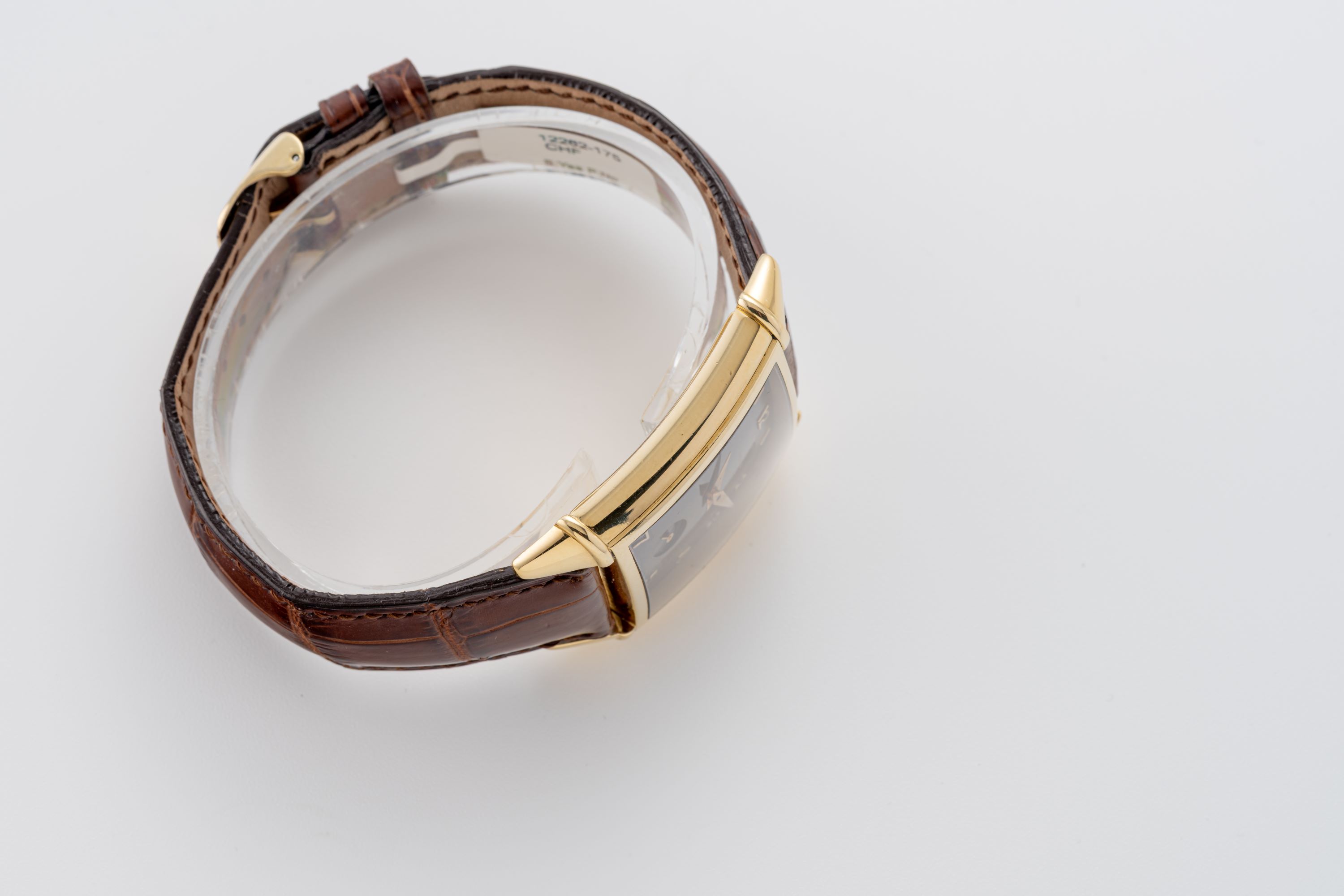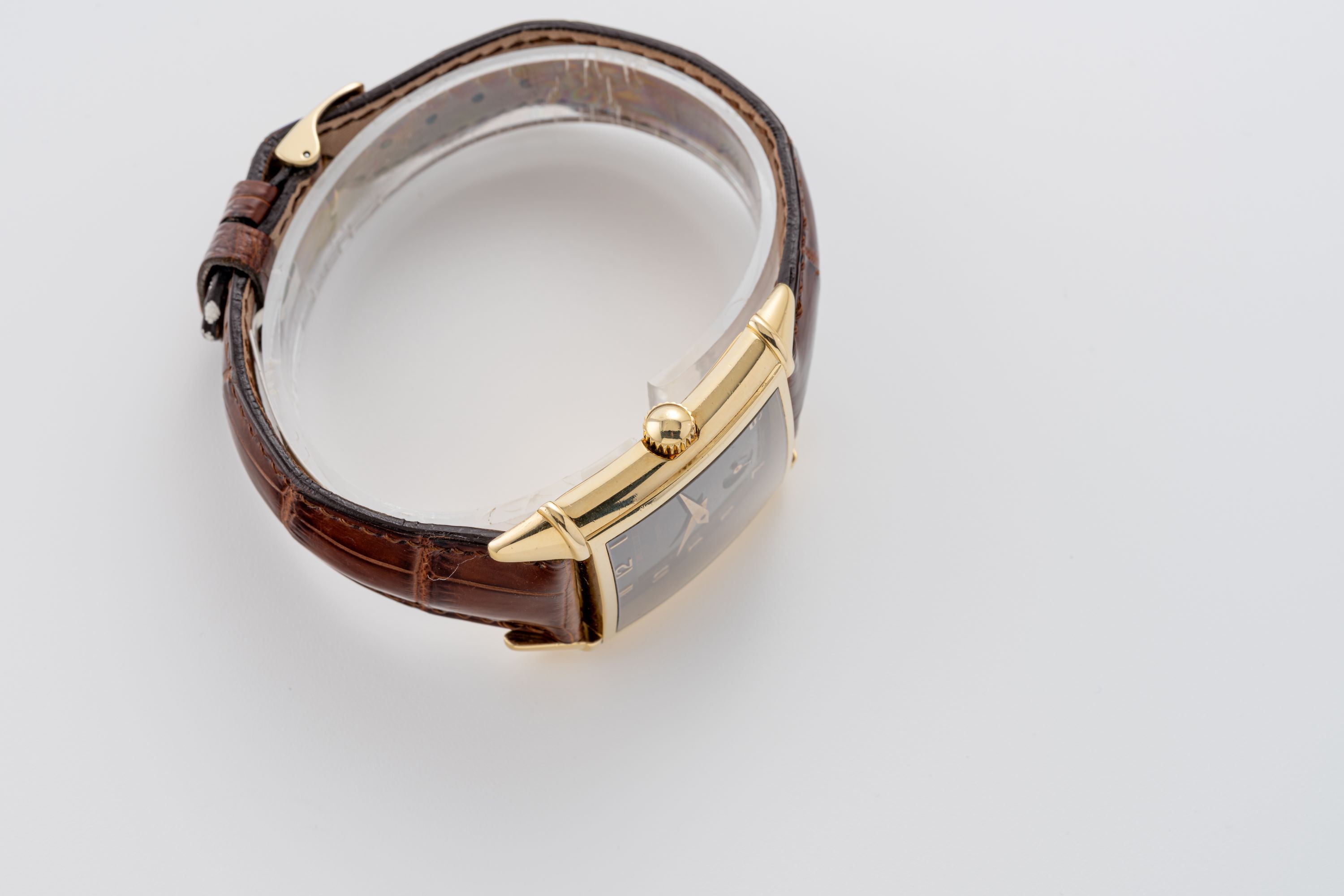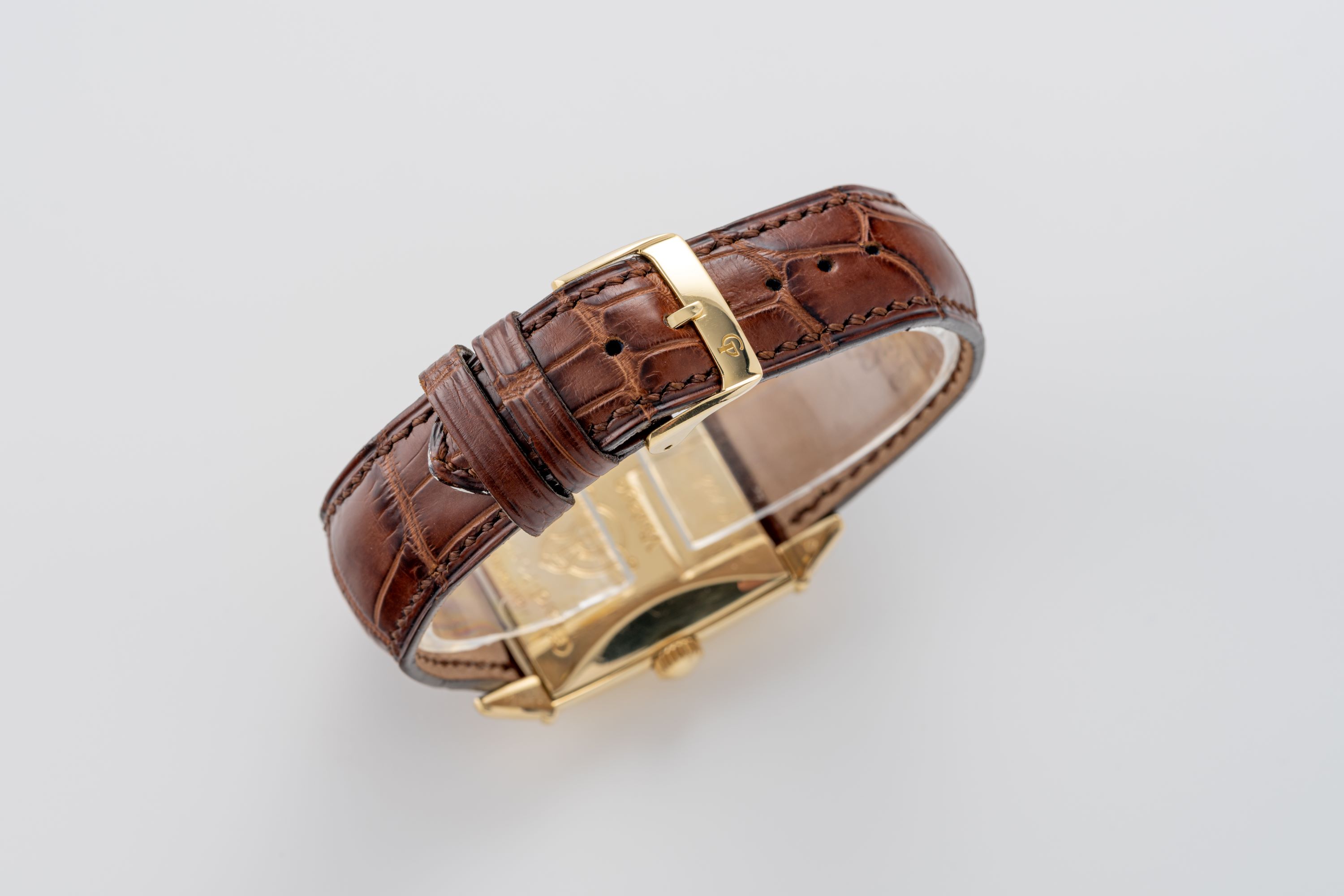 CaseCurved rectangular case in 18k yellow gold with winding crown at 3 o'clock, solid caseback