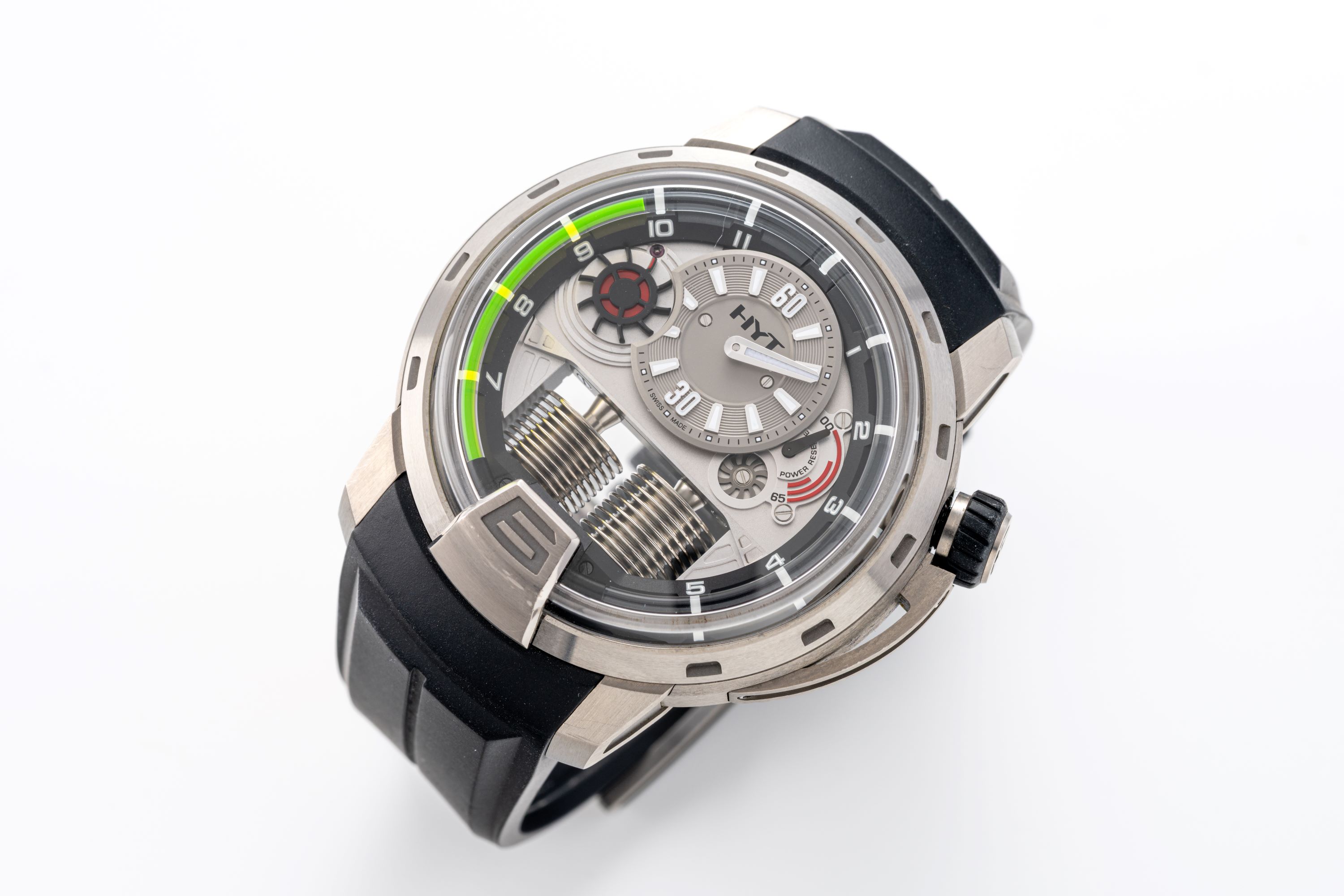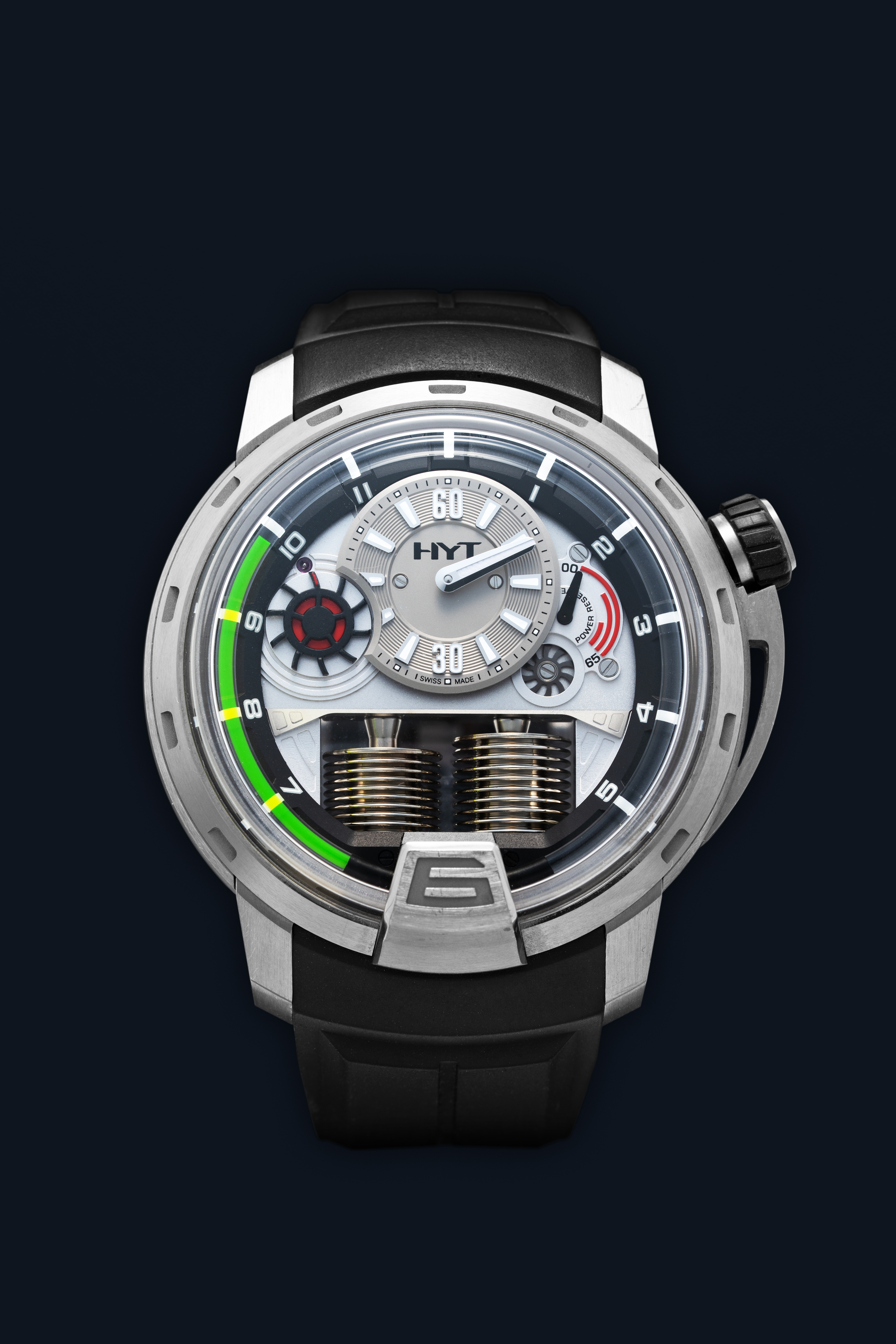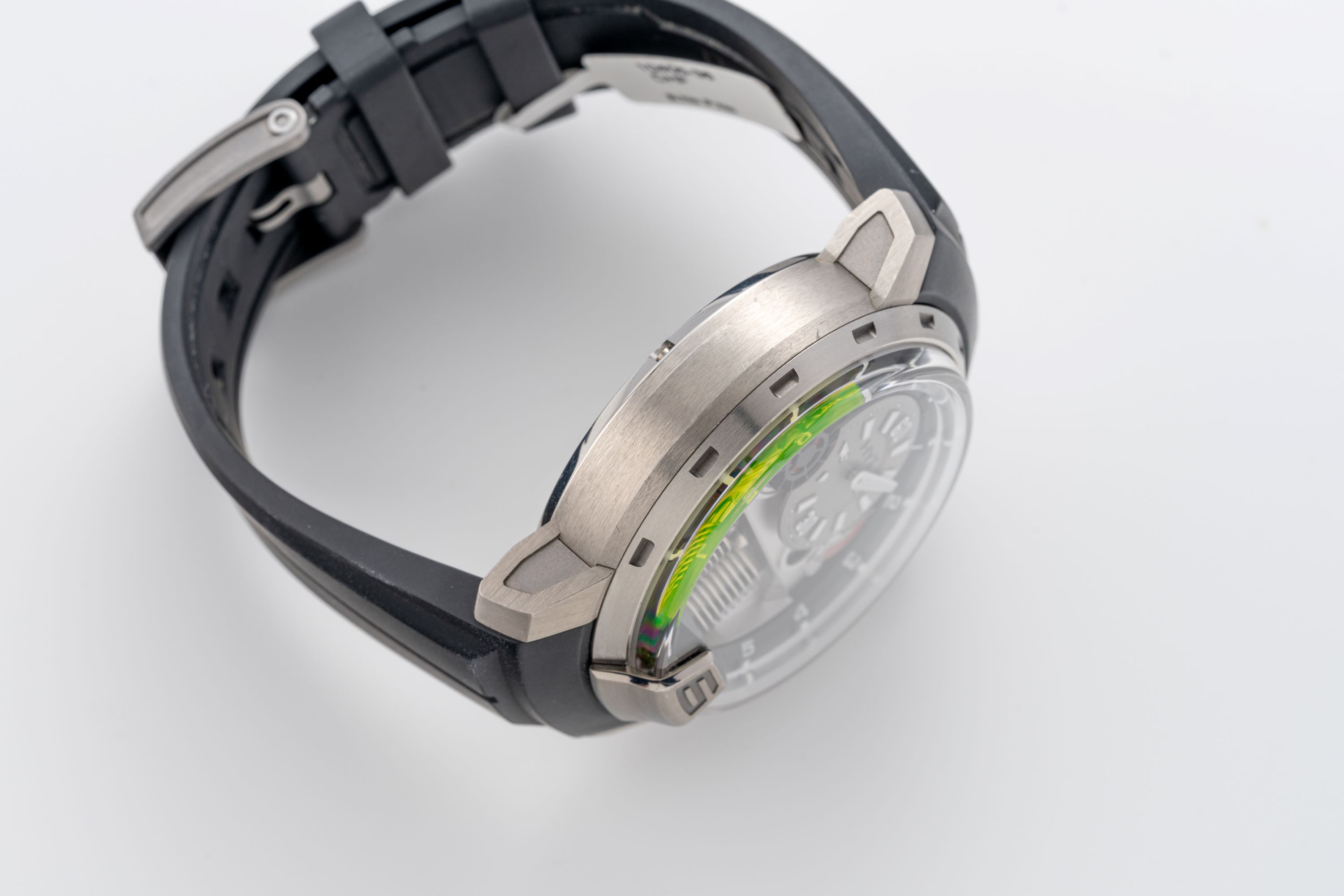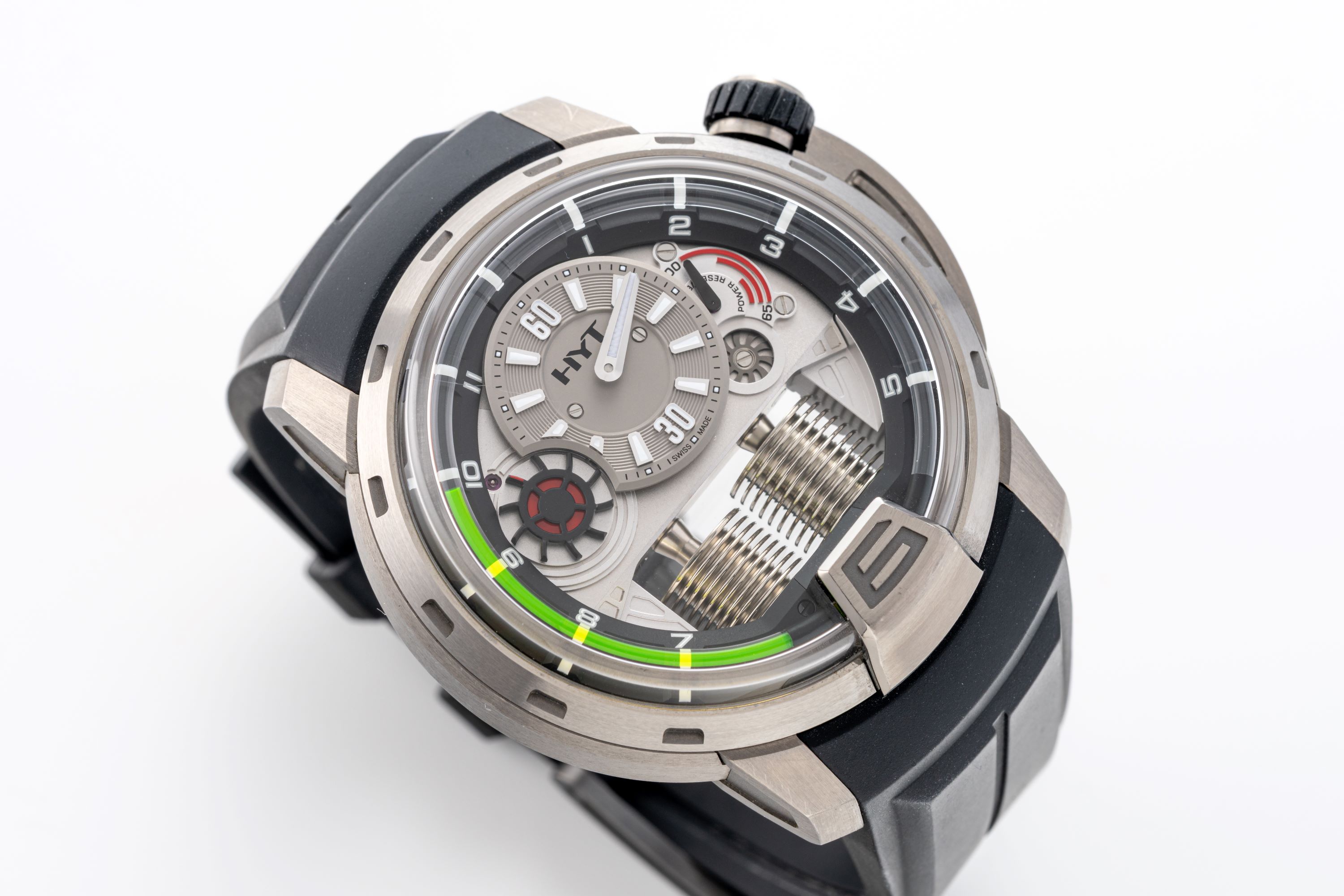 DialPartially openworked dial with hours at 12 o'clock, running seconds indicator wheel at 10 o'clock, power reserve at 2 o'clock, oil minute tube around the dial with bright green liquid