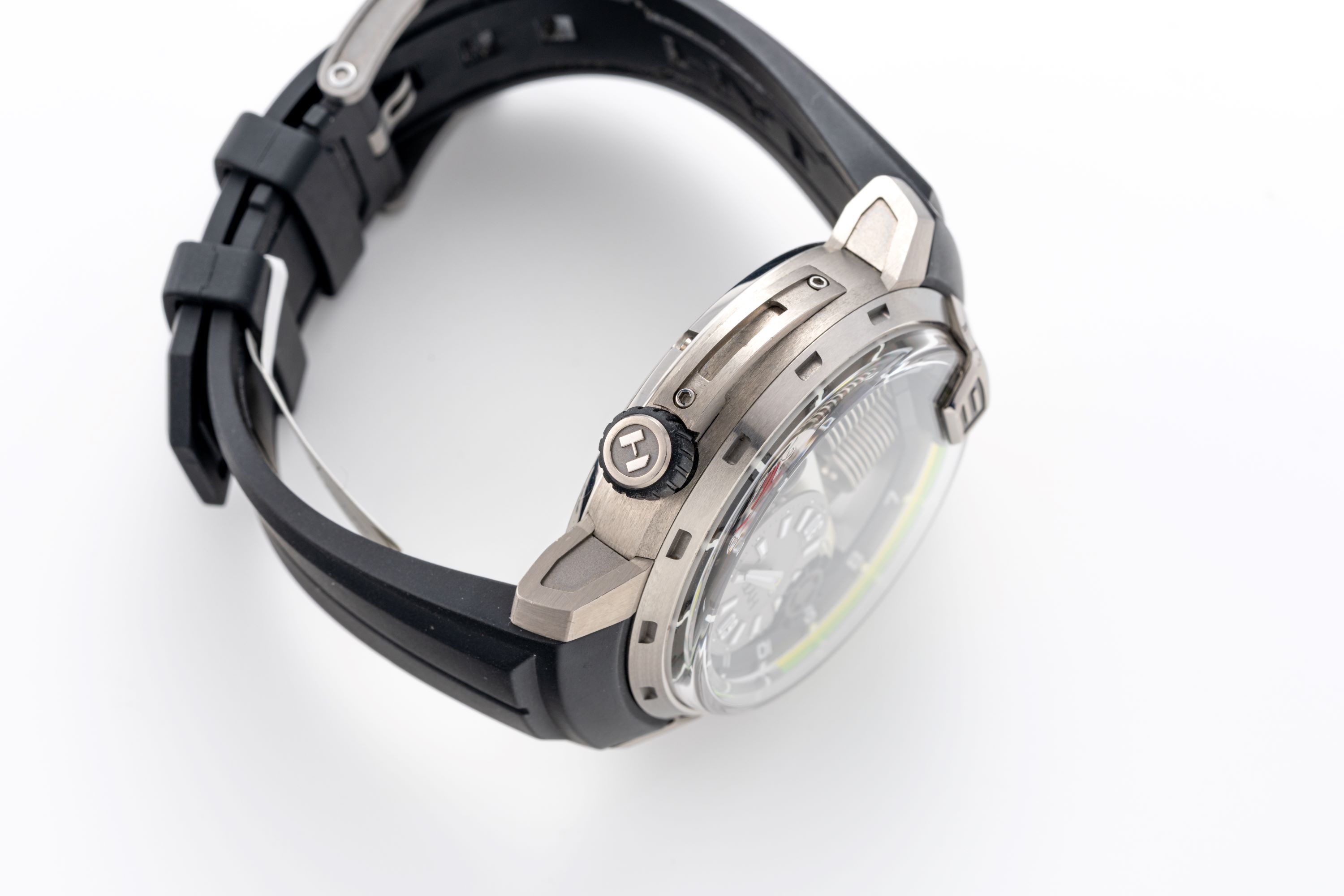 CaseRound case in titanium with large crown at 2 o'clock, display caseback