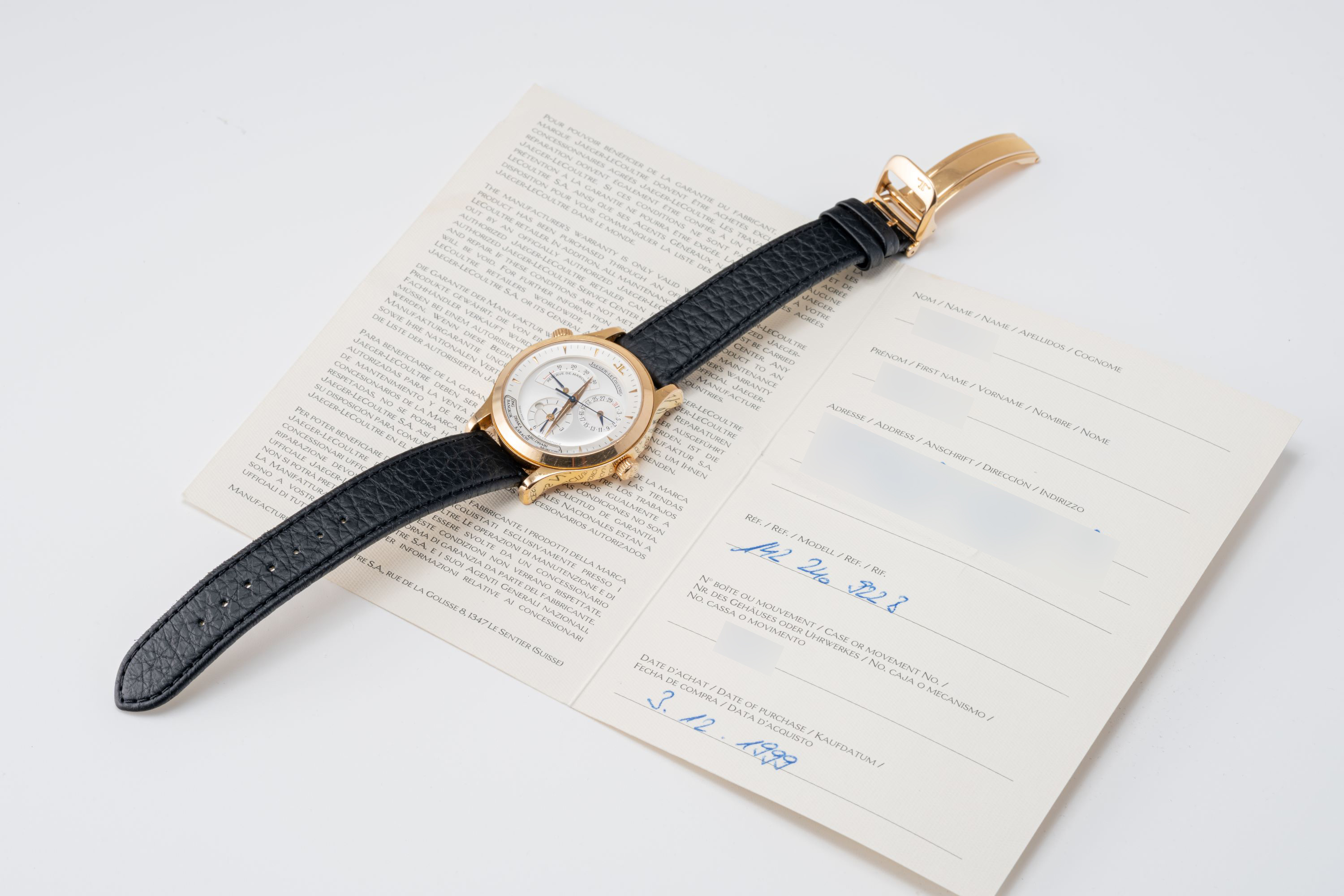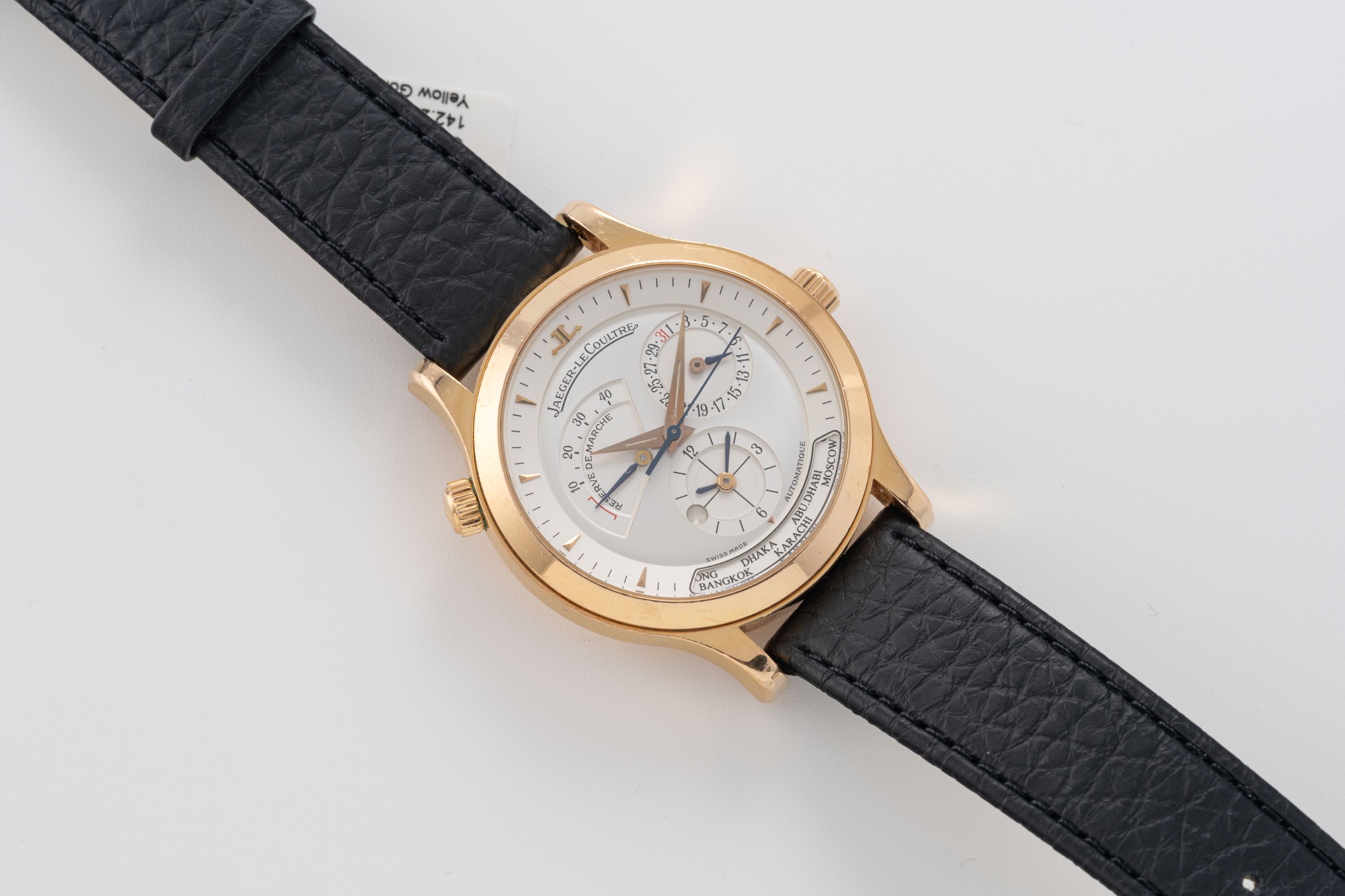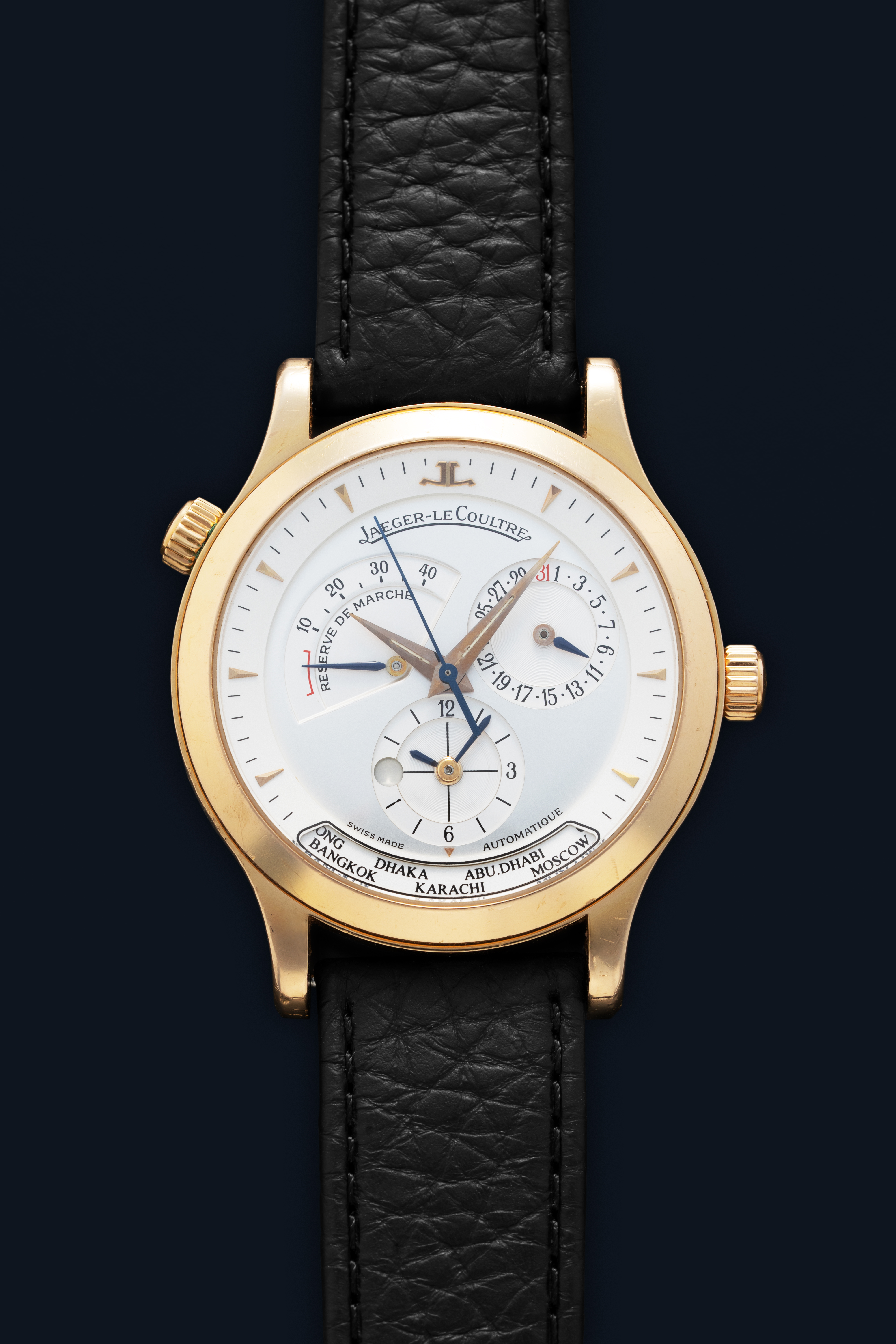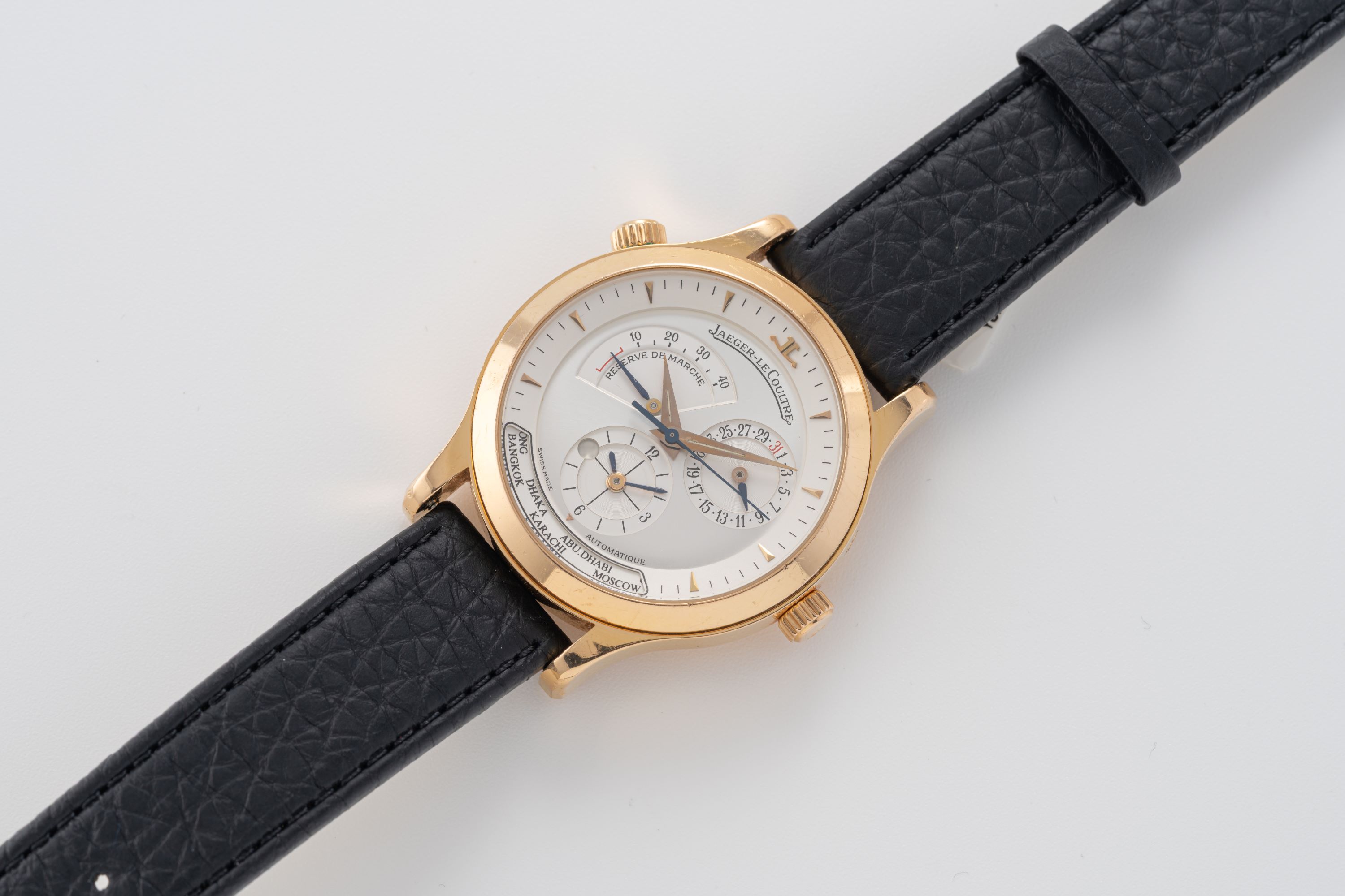 DialSilver dial with applied rose gold indices, rose gold hands, power reserve indicator at 10 o'clock, date at 2 o'clock, second timezone subdial with day/night indicator and city wheel at 6 o'clock, signed 'Jaeger LeCoultre' at 21 o'clock