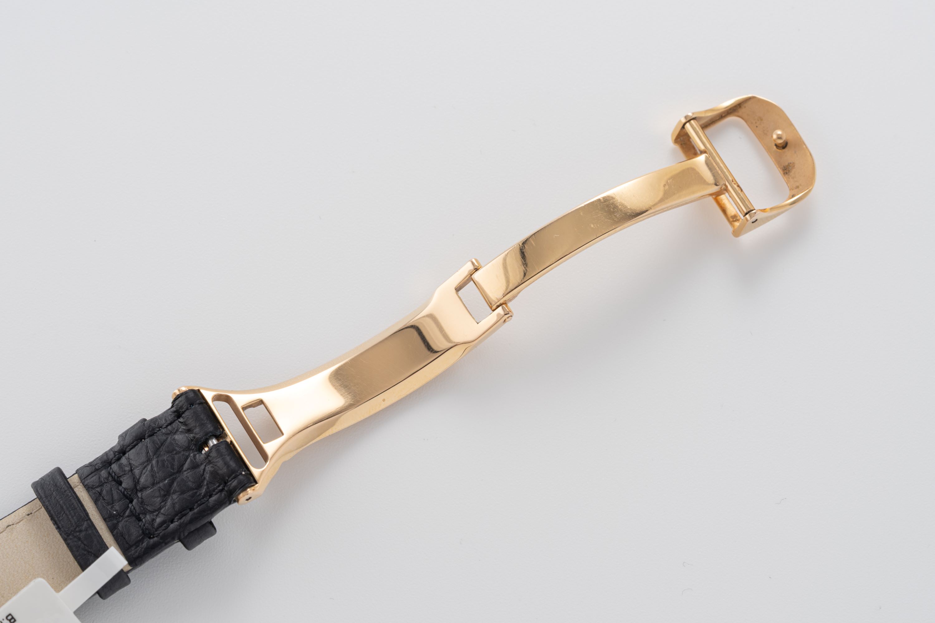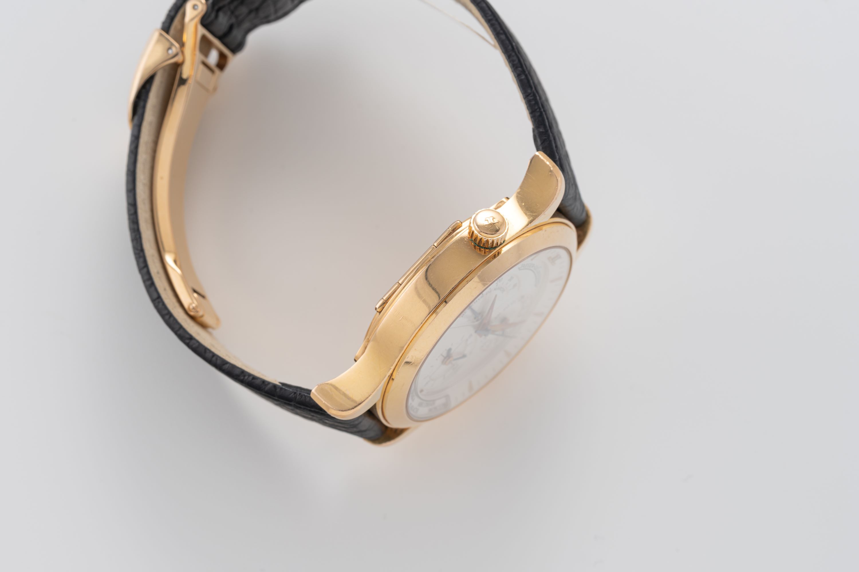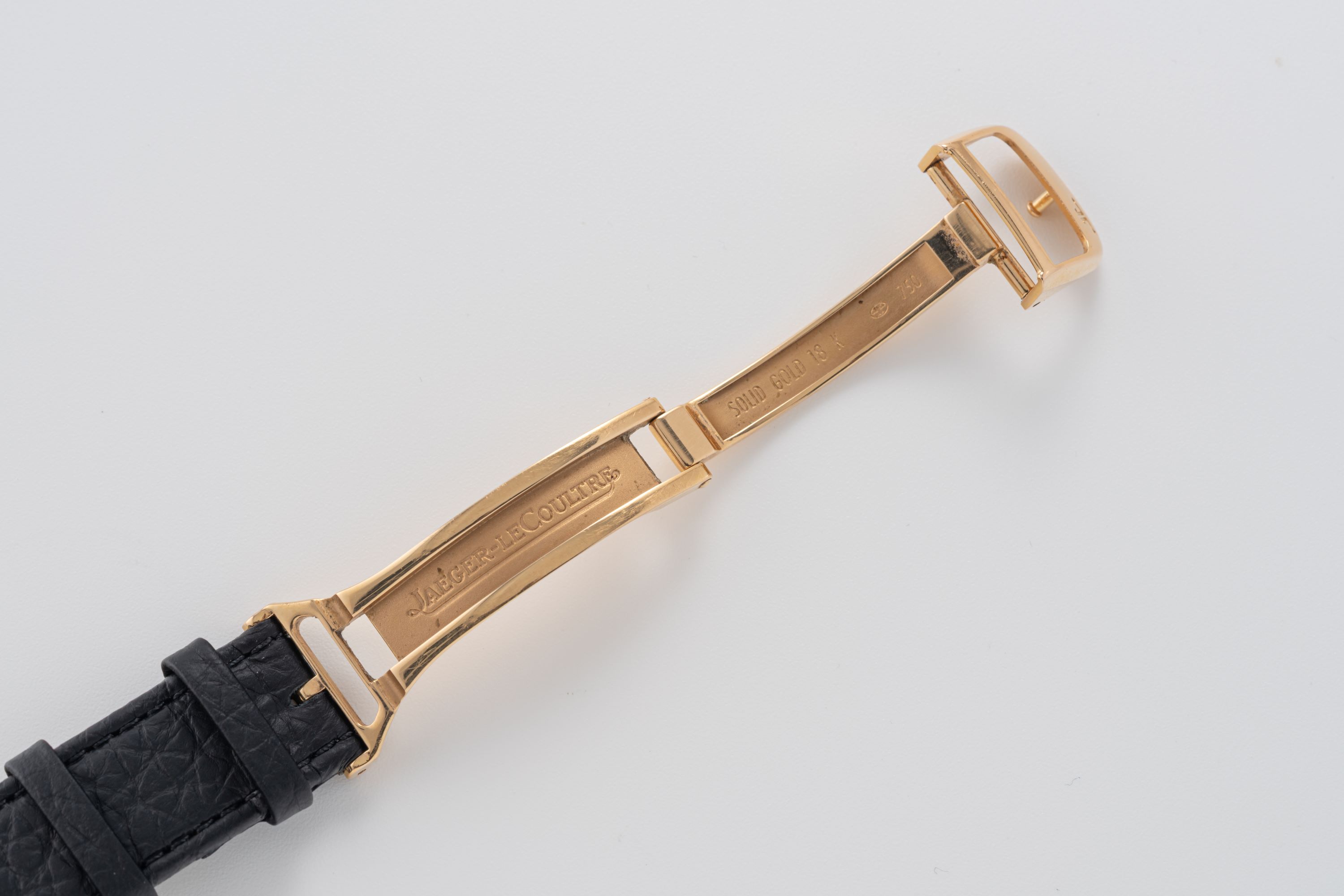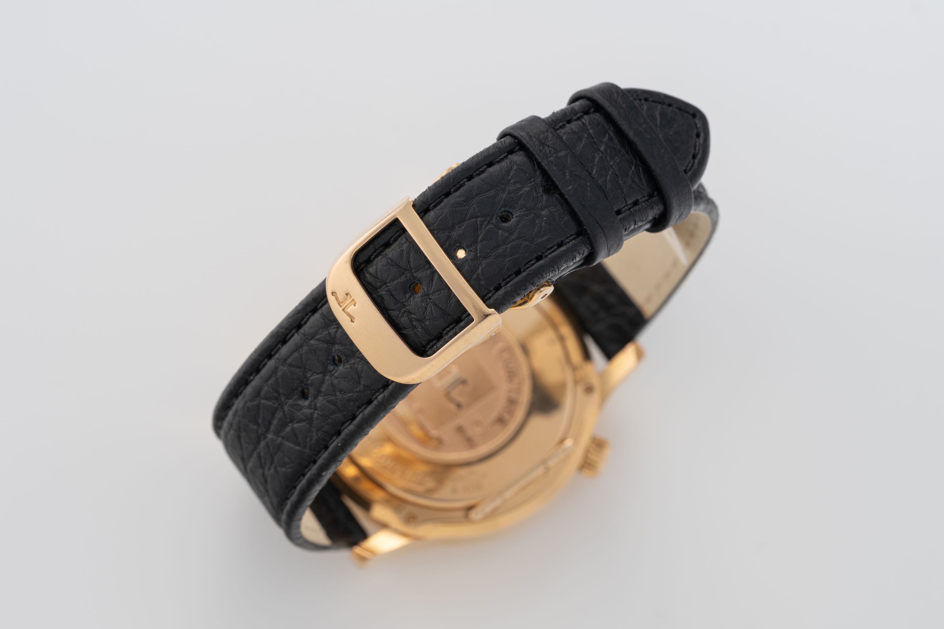 DialSilver dial with applied rose gold indices, rose gold hands, power reserve indicator at 10 o'clock, date at 2 o'clock, second timezone subdial with day/night indicator and city wheel at 6 o'clock, signed 'Jaeger LeCoultre' at 21 o'clock