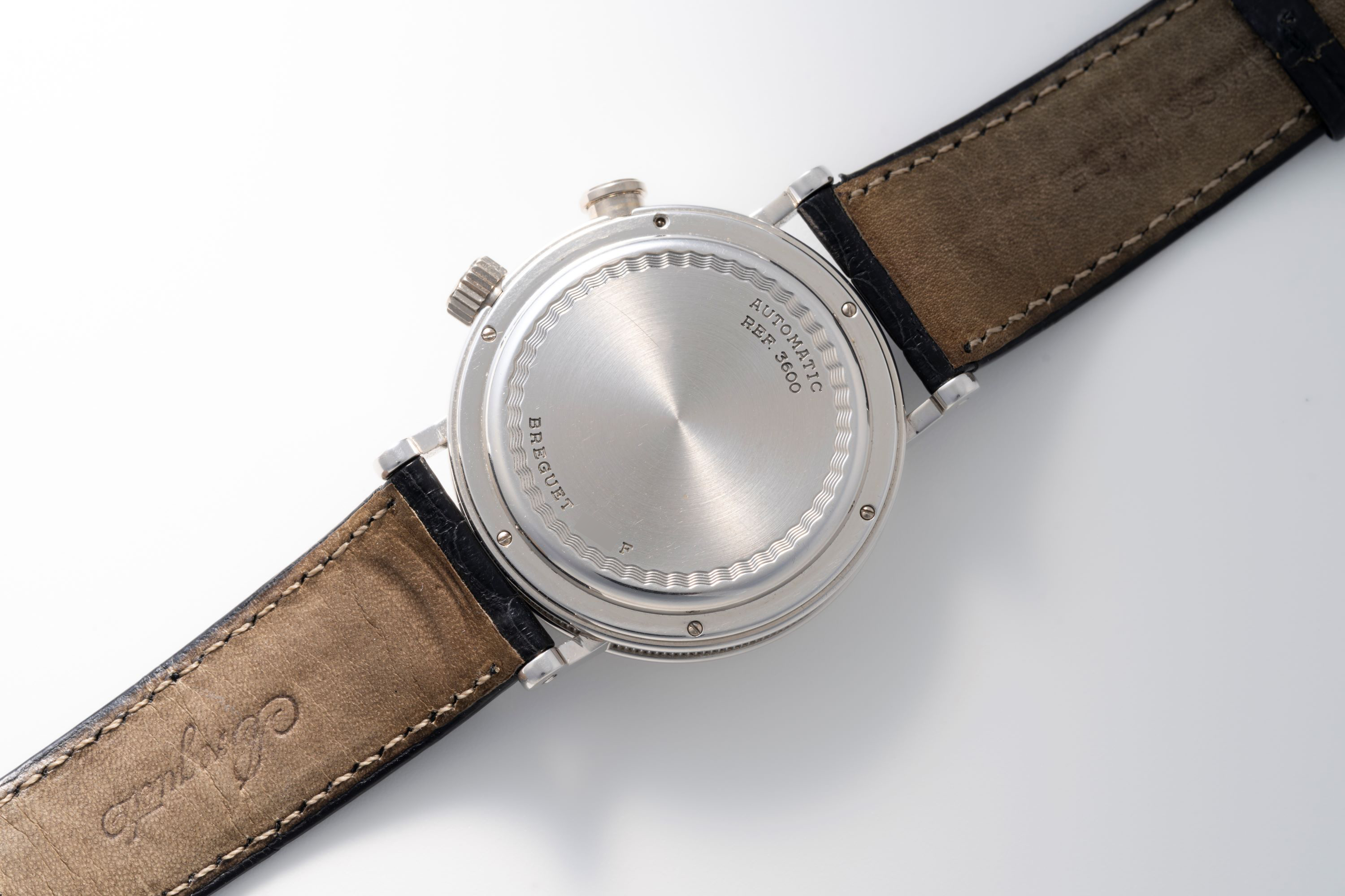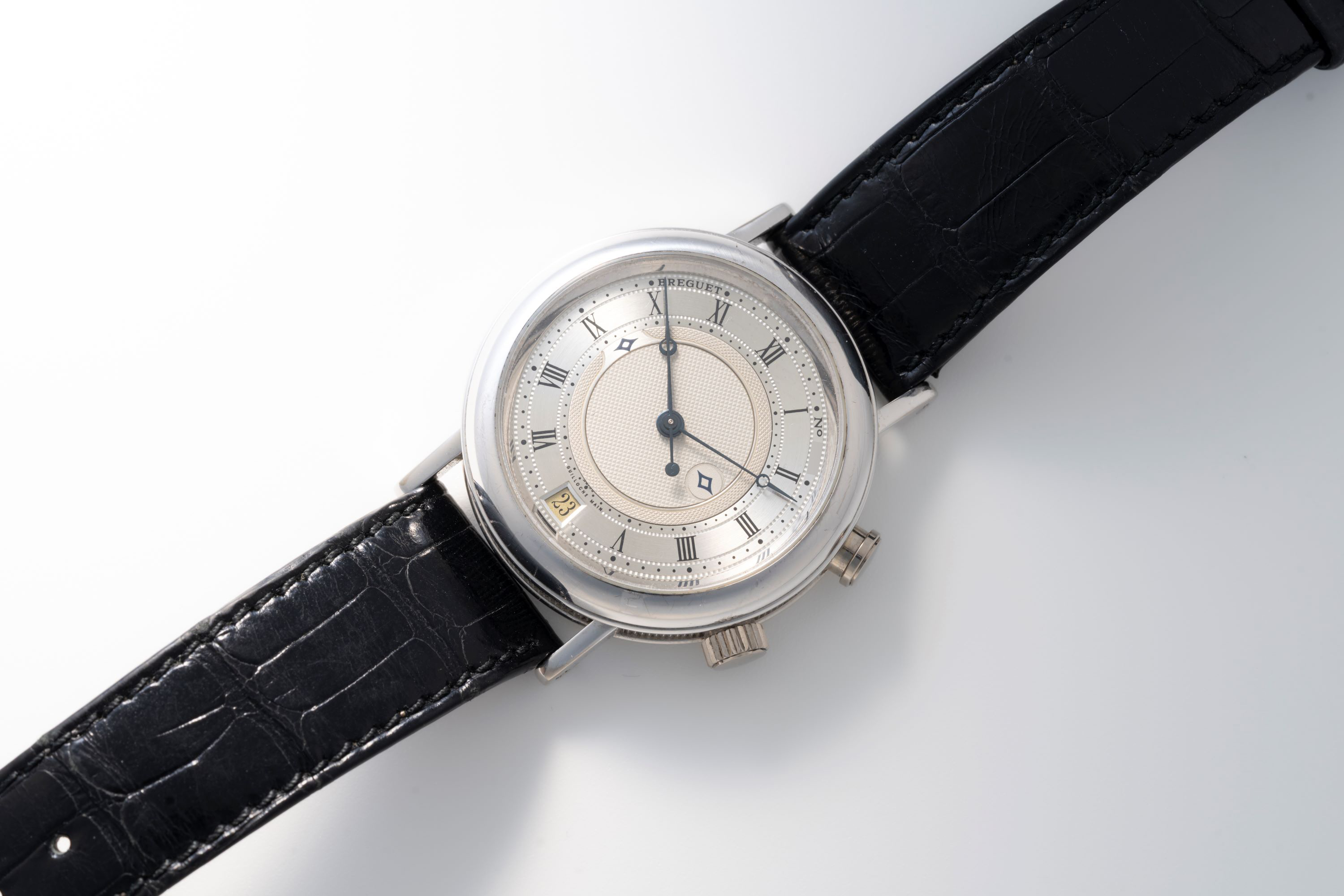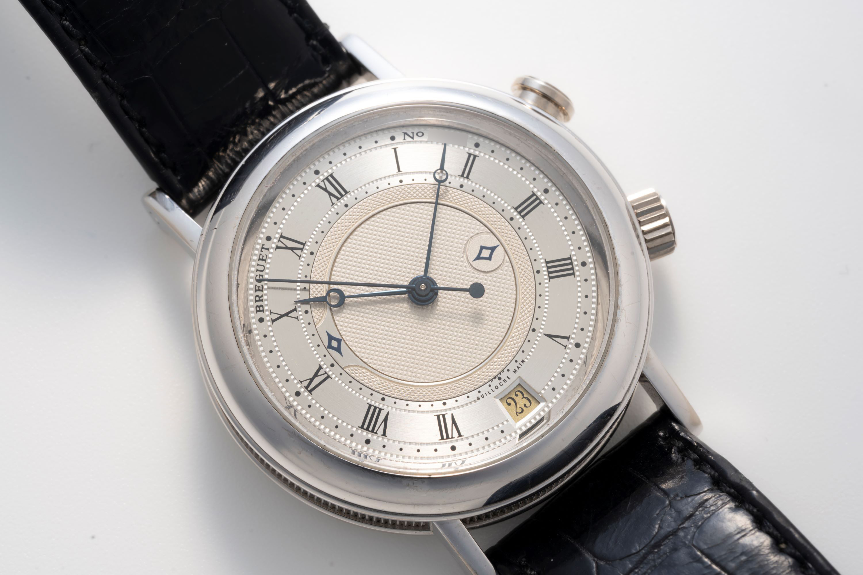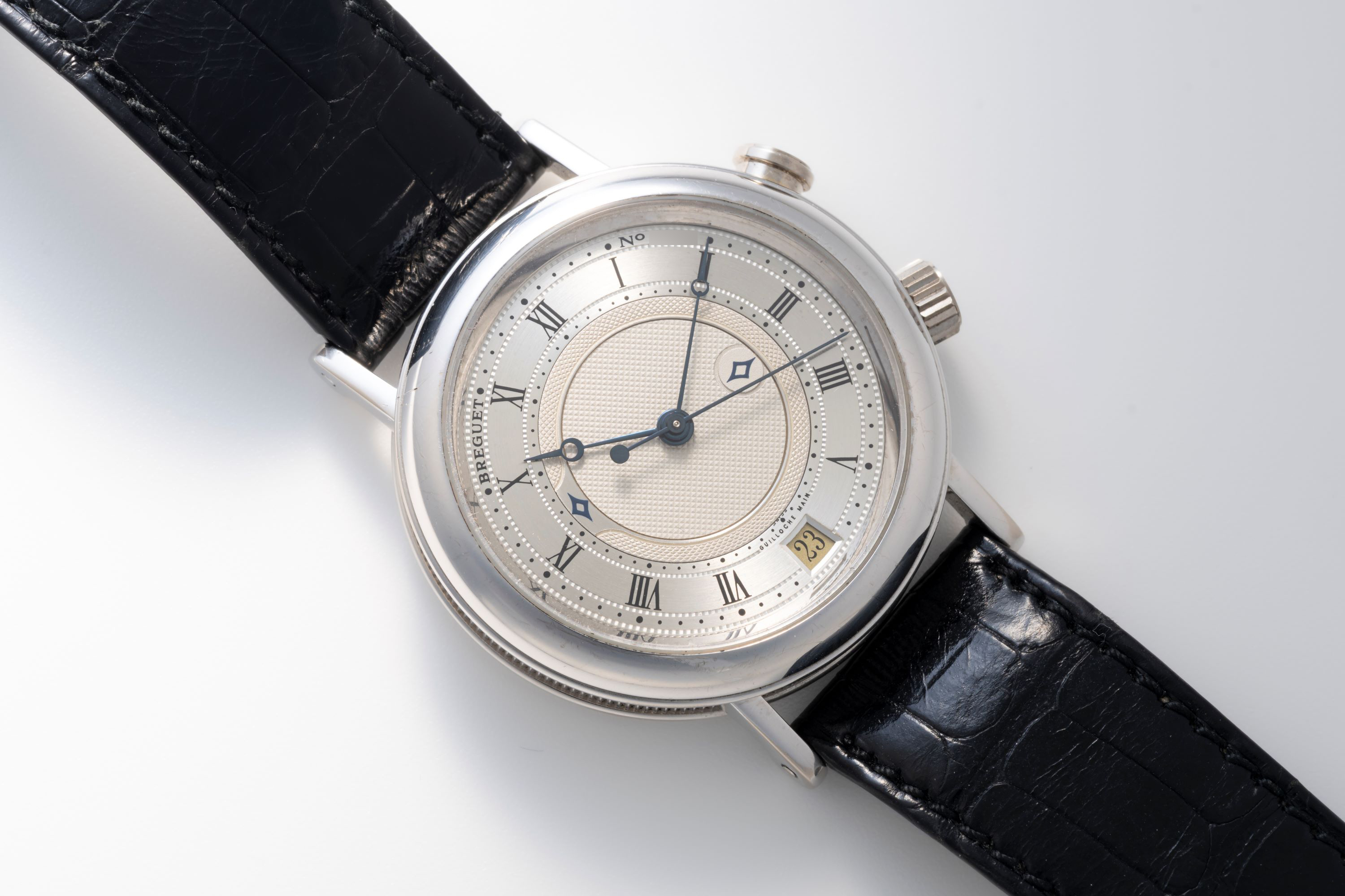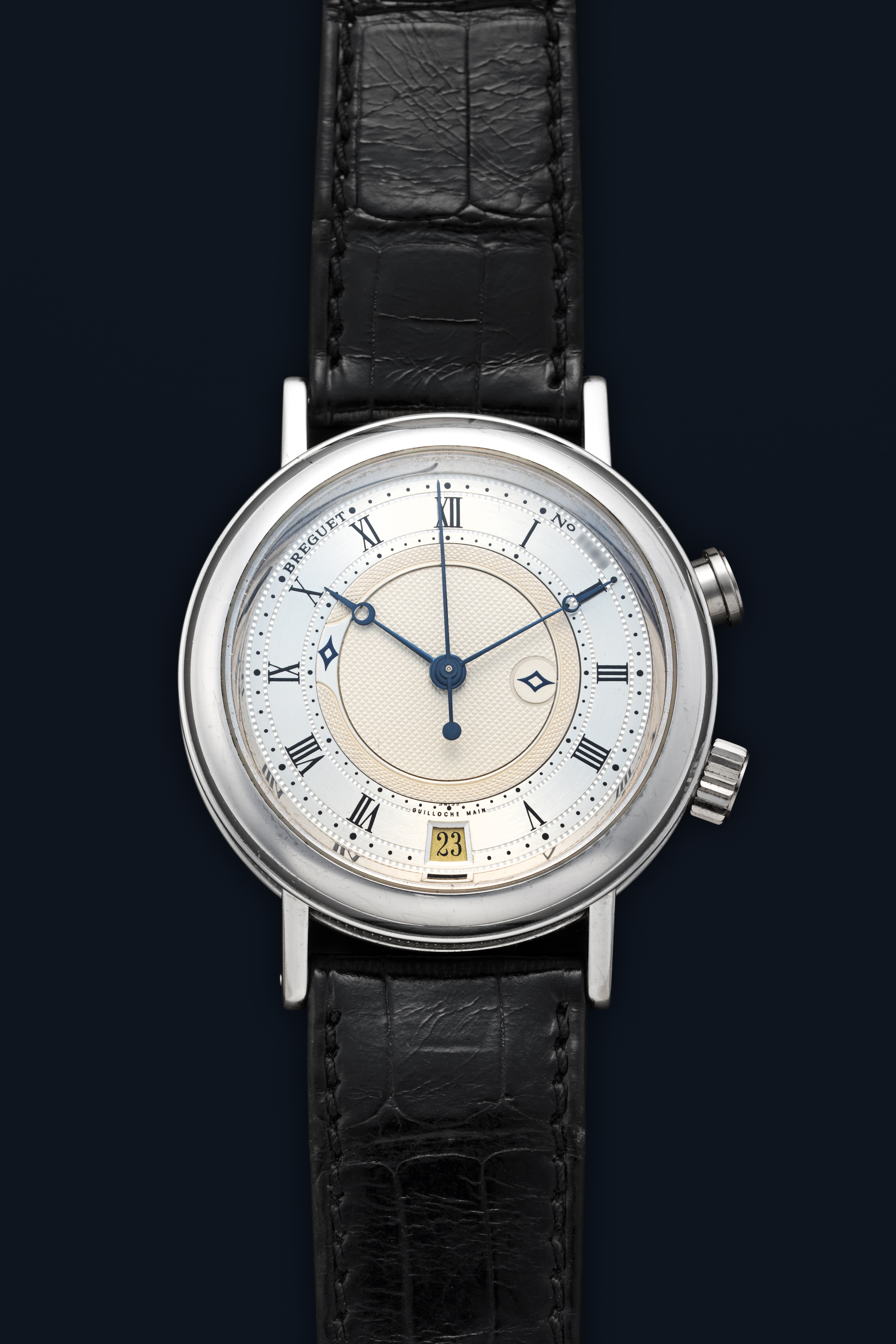 DialSilver guilloche dial with roman numerals, heat-blued Breguet hands, date window at 6 o'clock, inner alarm time indicator discs, signed 'Breguet' between 10 and 11 o'clock