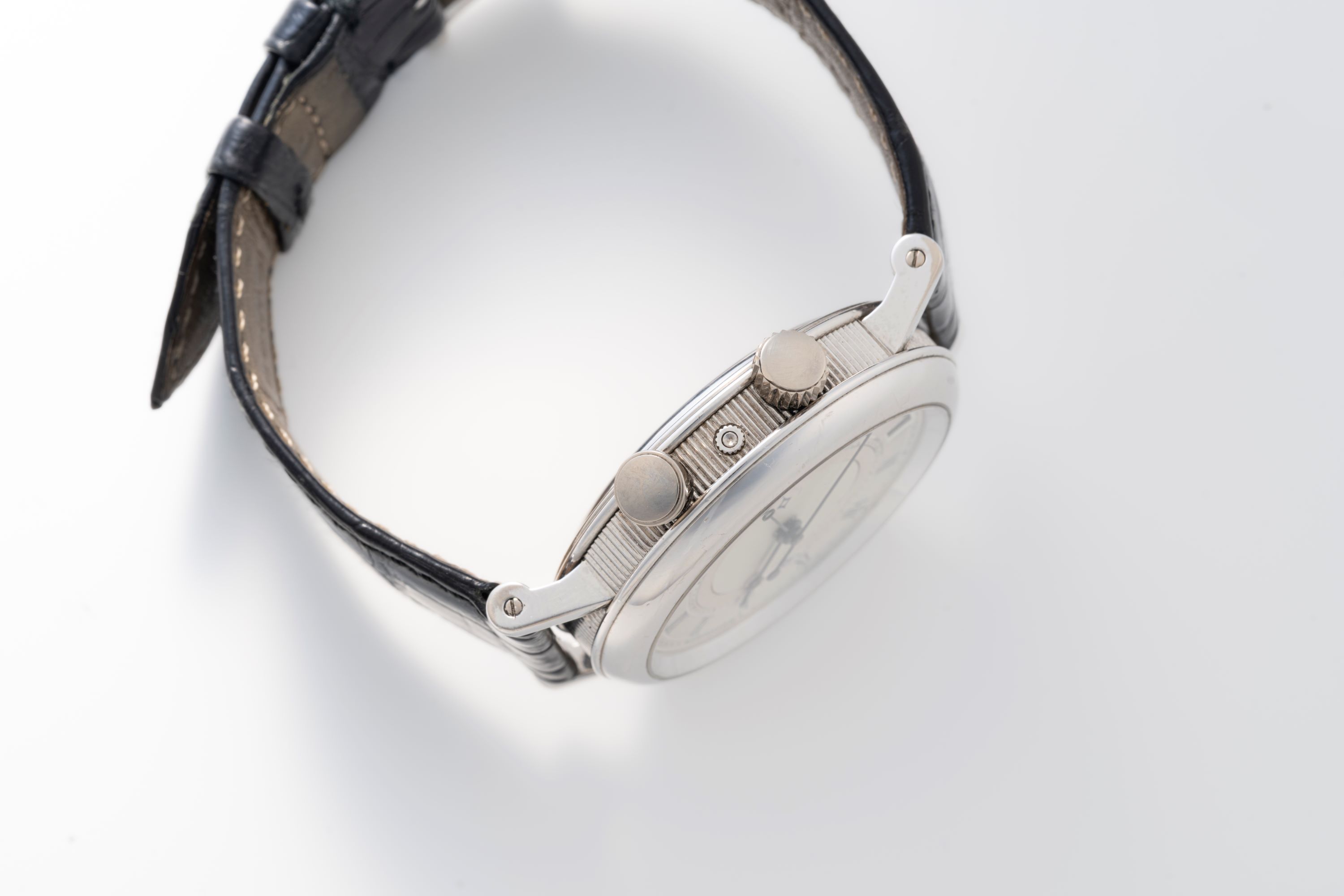 CaseRound case in 18k white gold with alarm setting crown at 2 o'clock and crown at 4 o'clock, date pusher at 3 o'clock, solid caseback