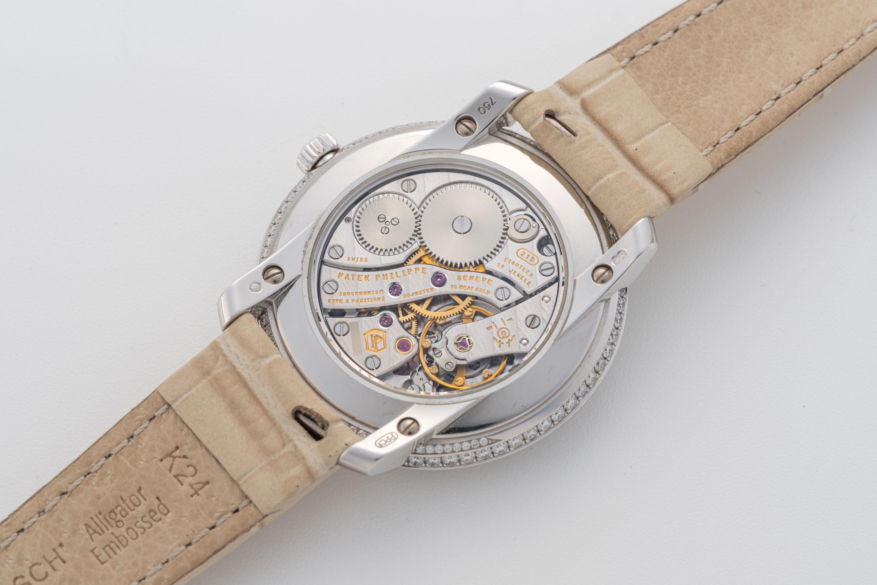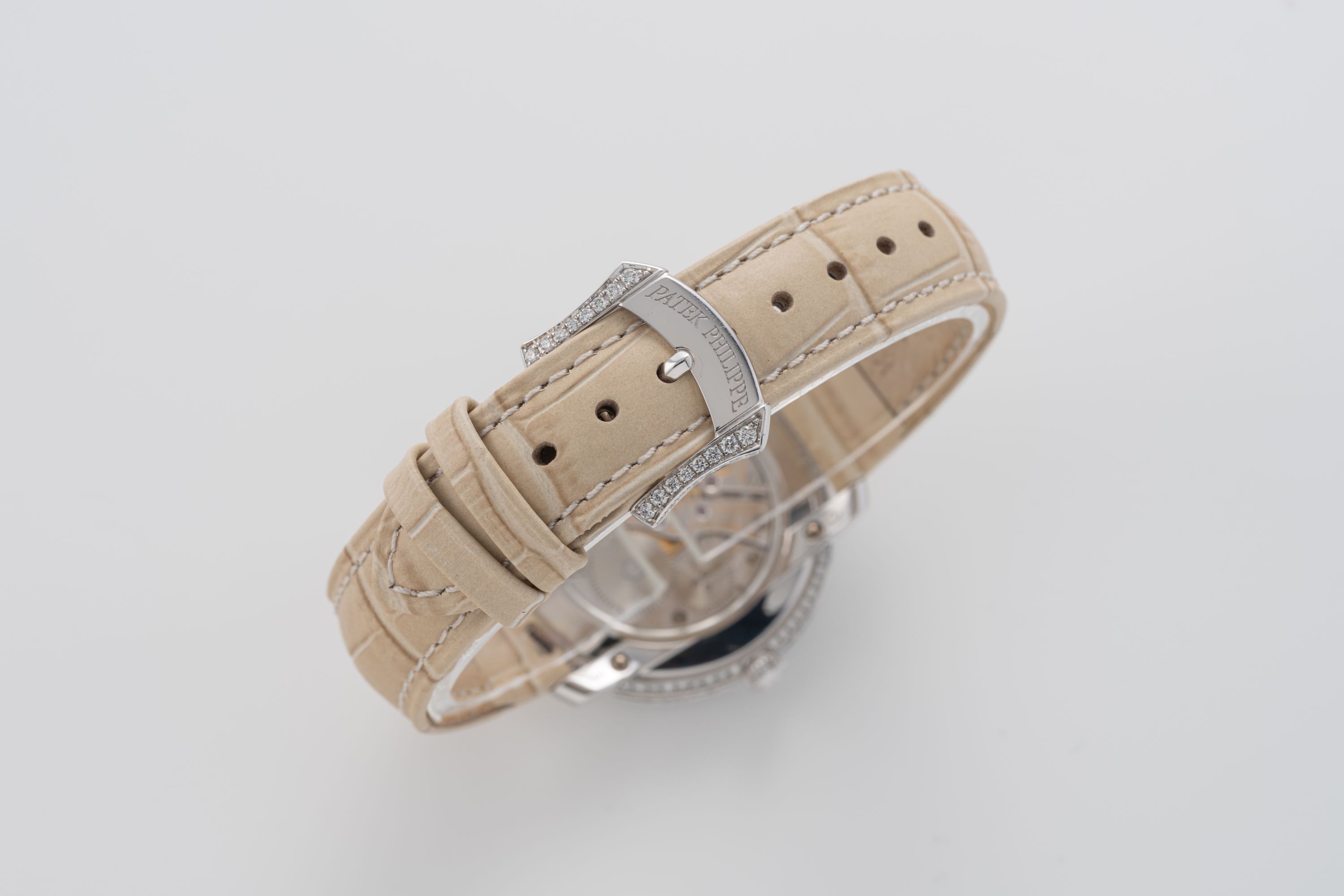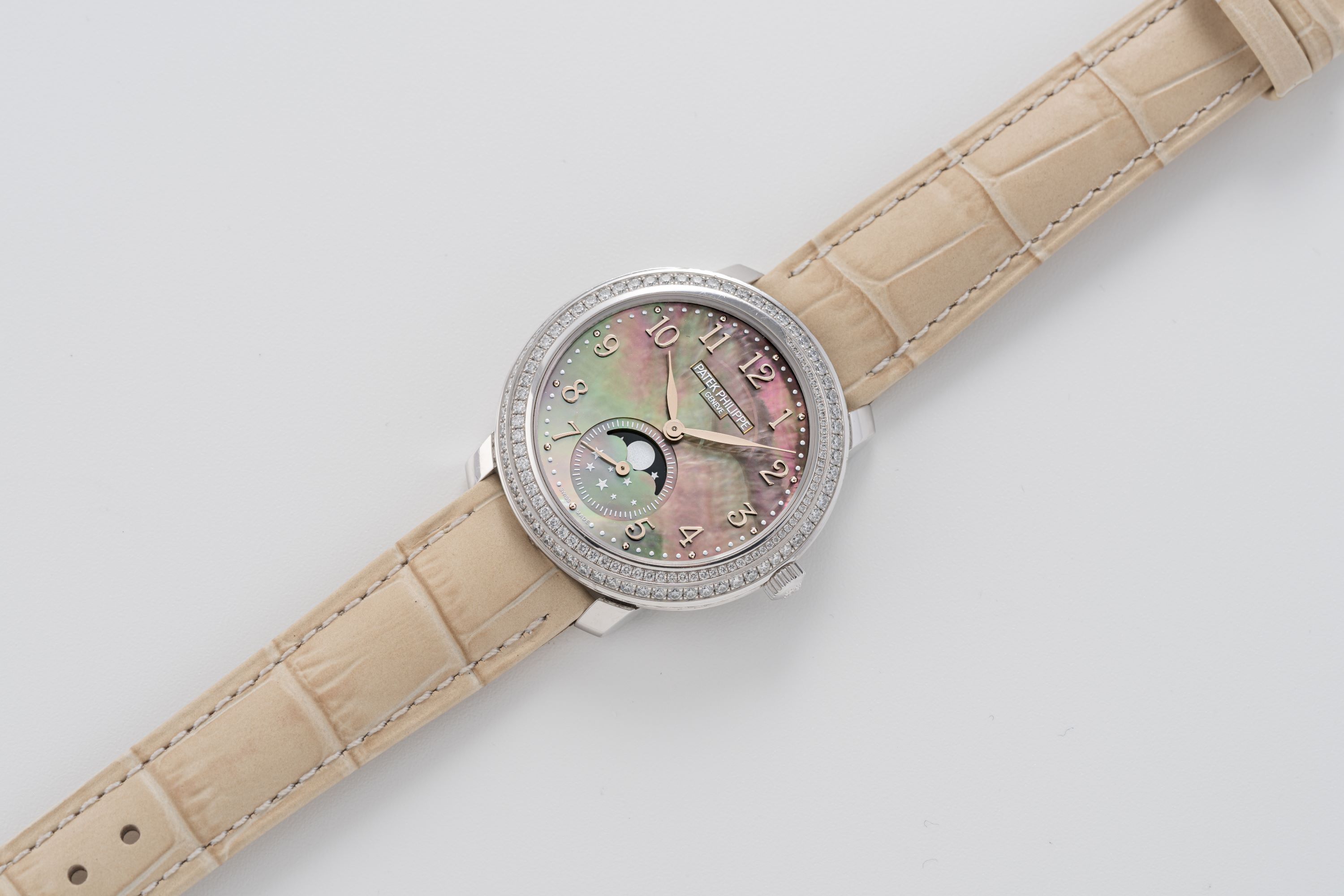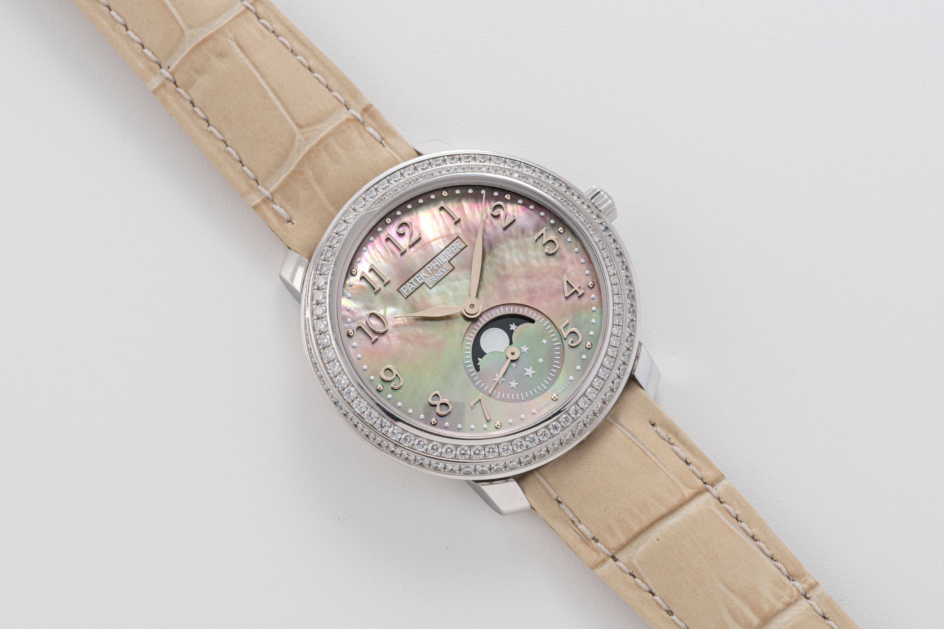 DialMother of pearl dial with applied numerals in white gold, white gold leaf hands, small seconds with moonphase at 6 o'clock, signed 'Patek Philippe' at 12 o'clock