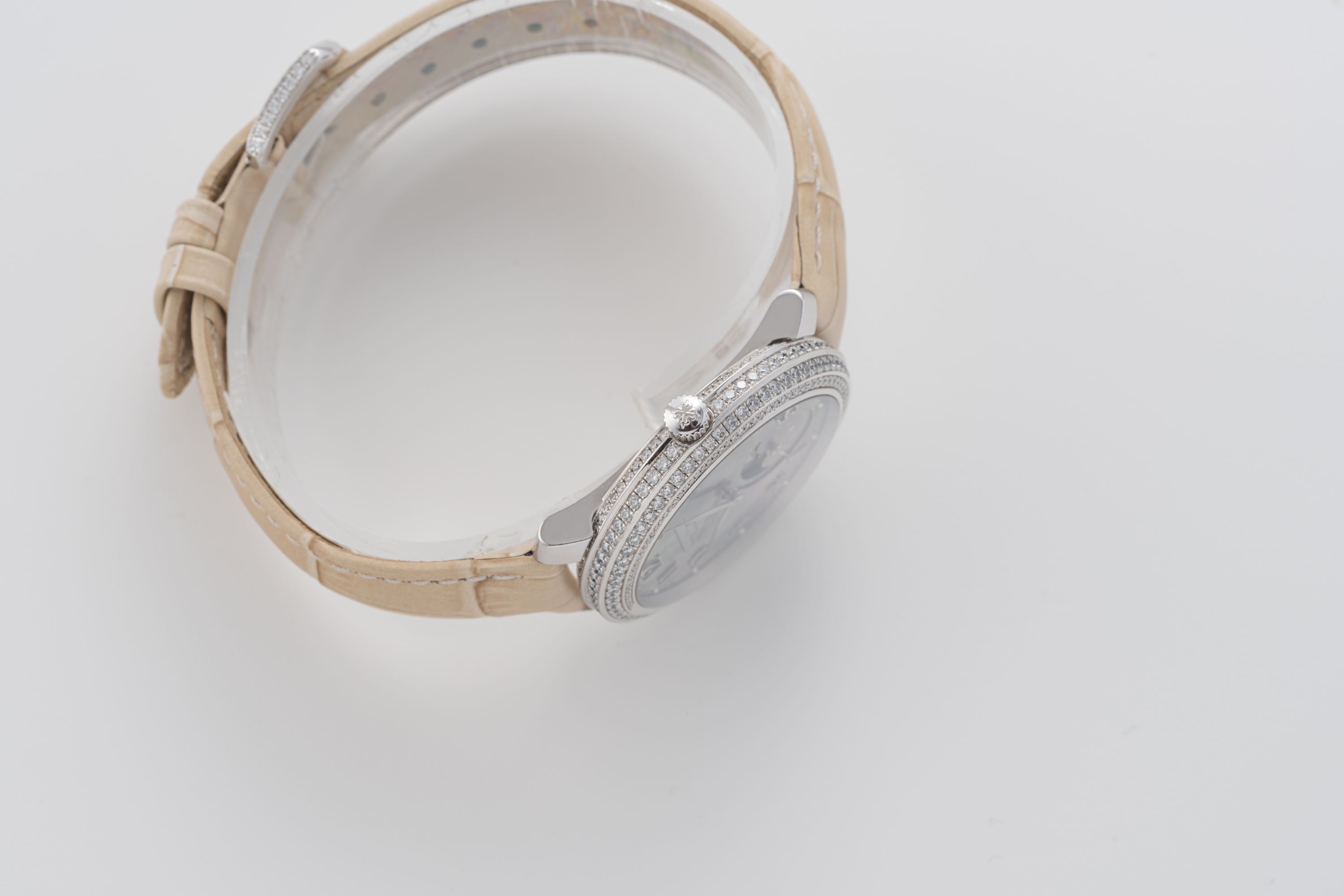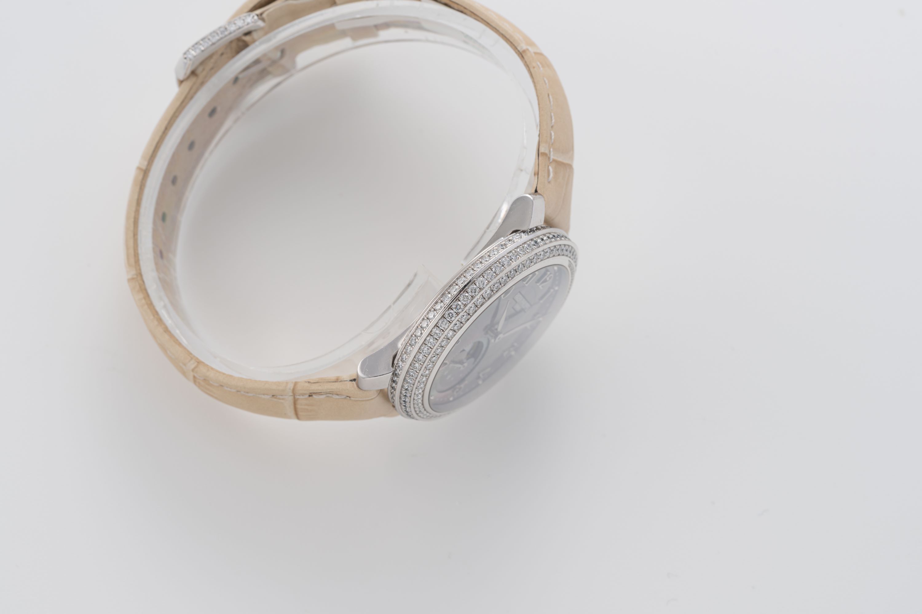CaseRound case in 18k white gold with pavé diamond setting on the front, winding crown at 3 o'clock, display caseback