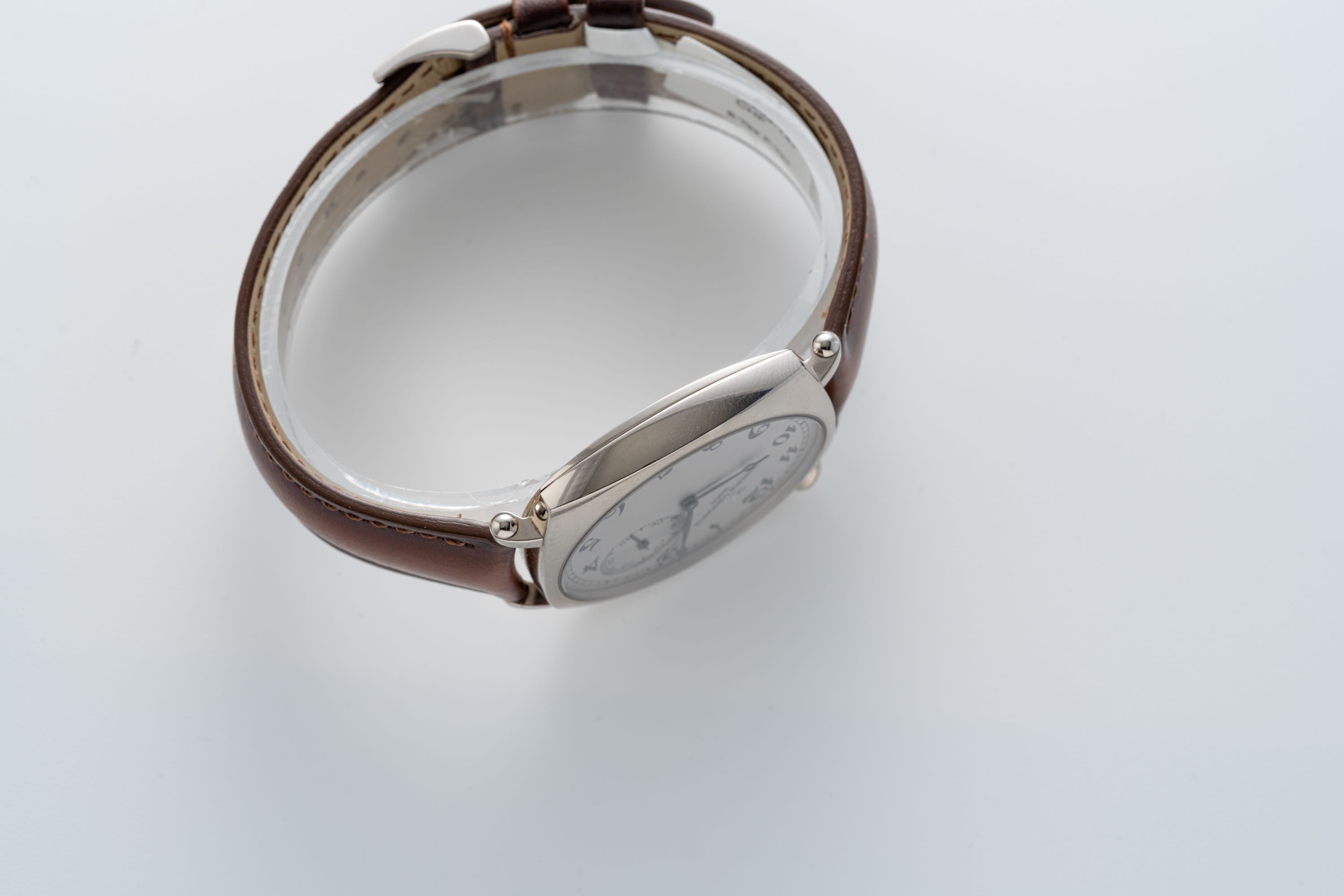 CaseRounded square cushion case in 18k white gold with winding crown in the upper right corner, display caseback