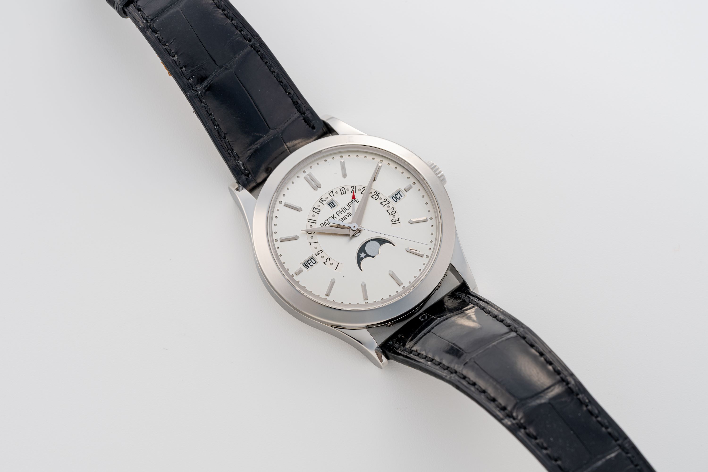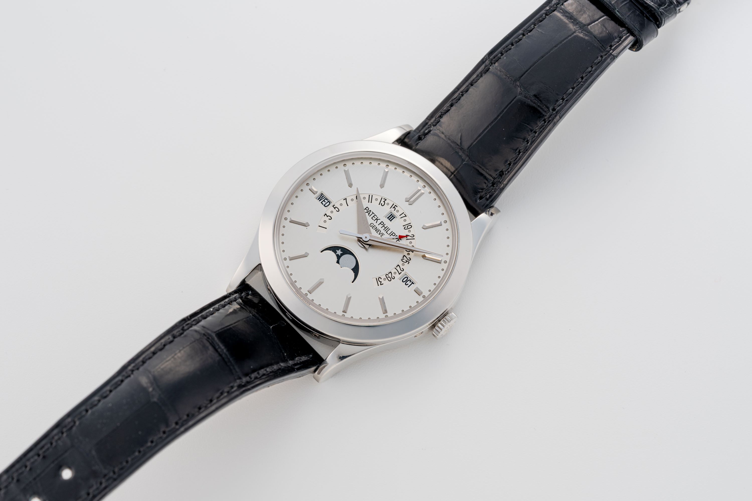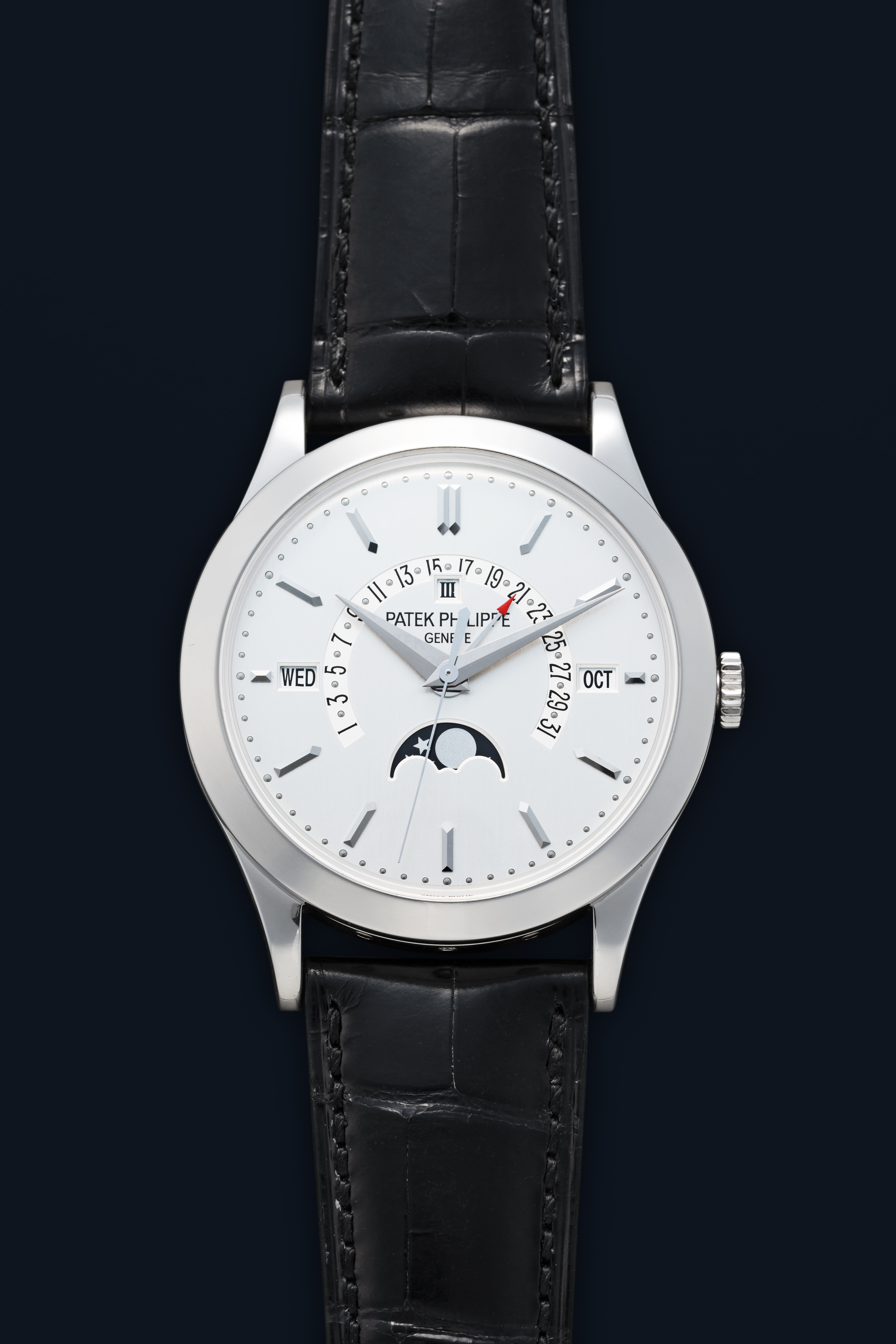 DialVertically brushed silver dial with applied white gold indices, white gold dauphine hands, analog date track between 8 and 4 o'clock, day window at 9 o'clock, month window at 3 o'clock, moonphase at 6 o'clock, leap year indicator and signed 'Patek Philippe' at 12 o'clock