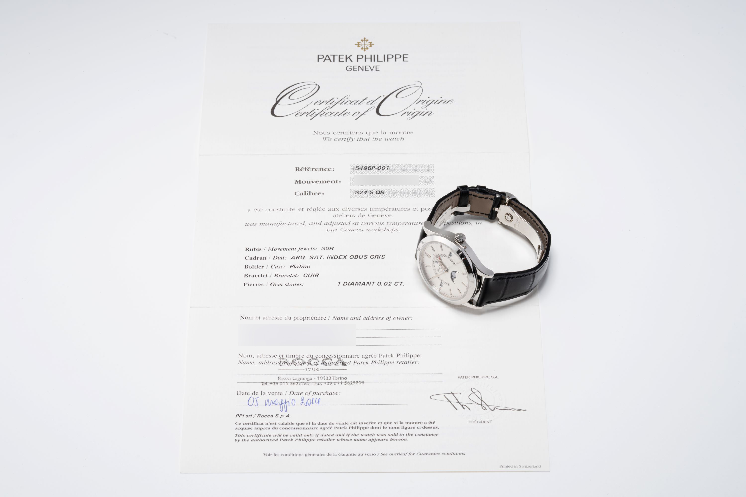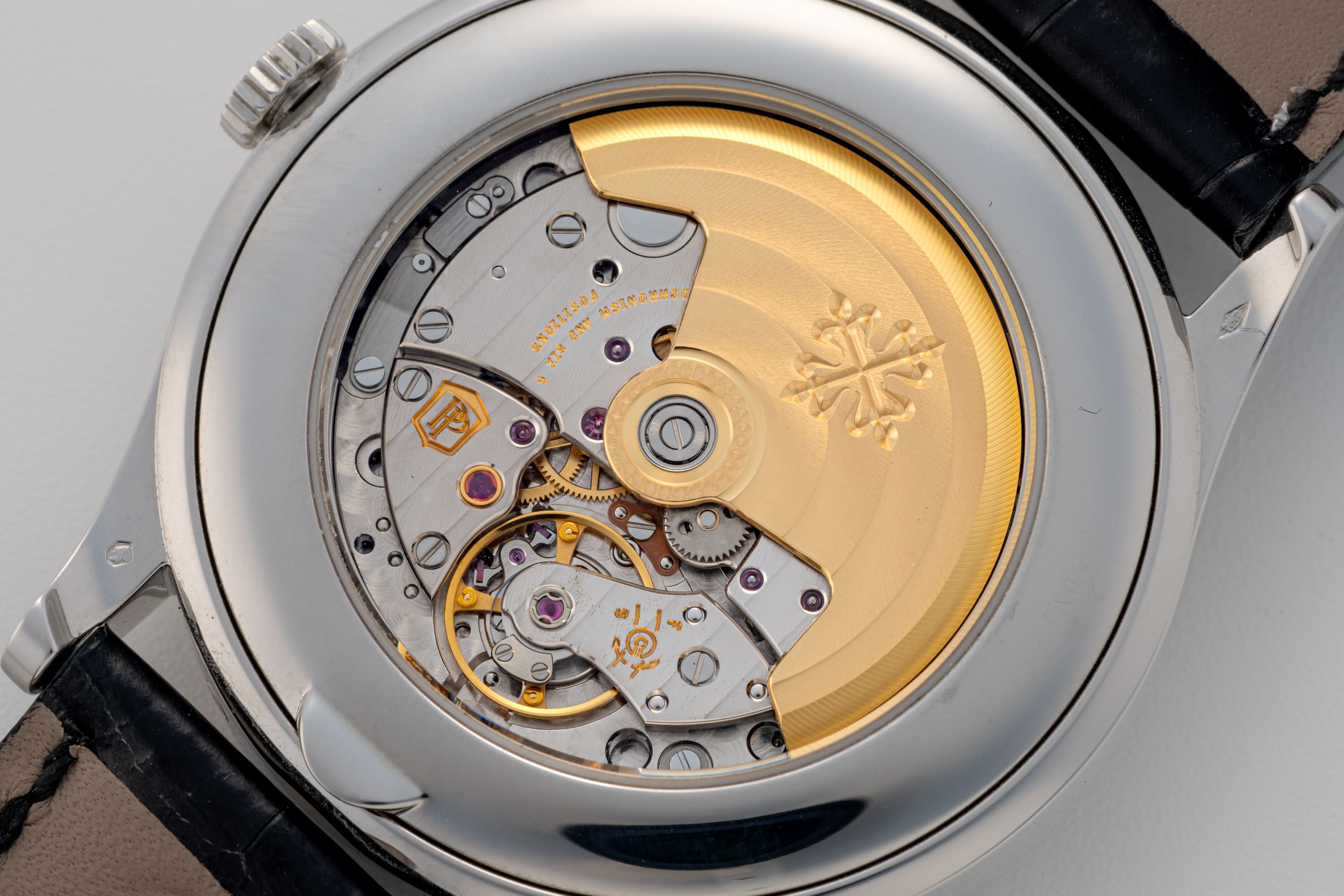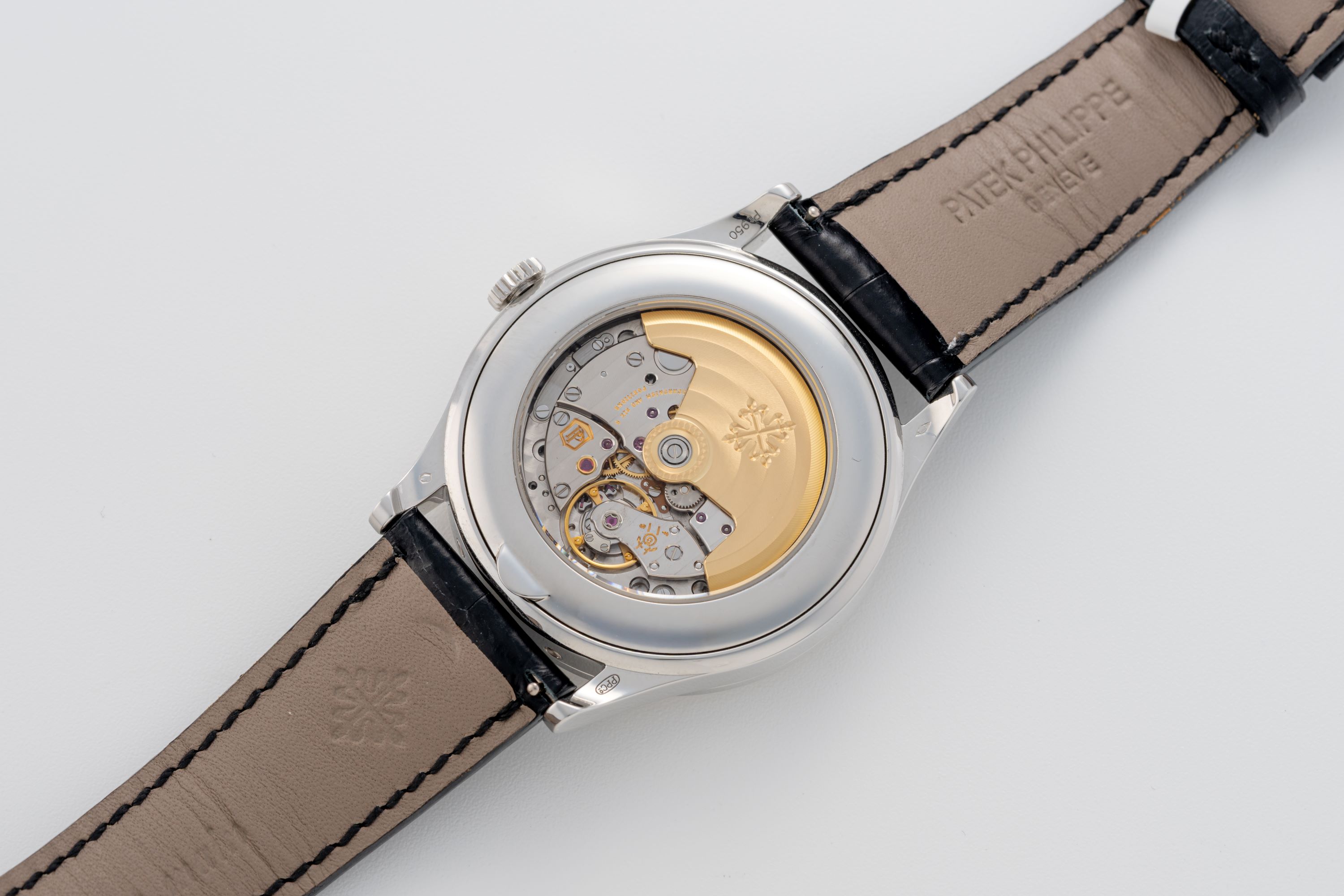 DialVertically brushed silver dial with applied white gold indices, white gold dauphine hands, analog date track between 8 and 4 o'clock, day window at 9 o'clock, month window at 3 o'clock, moonphase at 6 o'clock, leap year indicator and signed 'Patek Philippe' at 12 o'clock