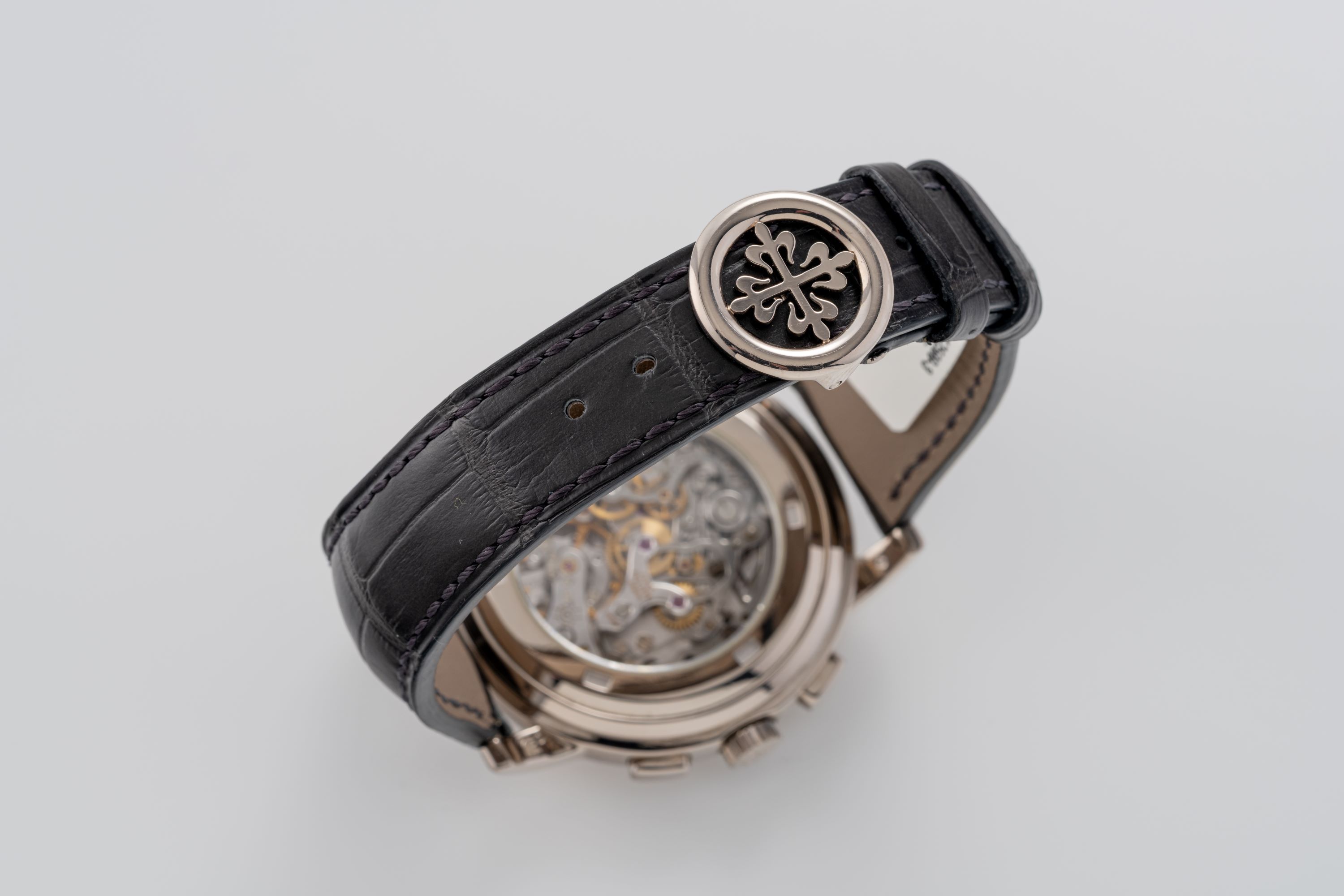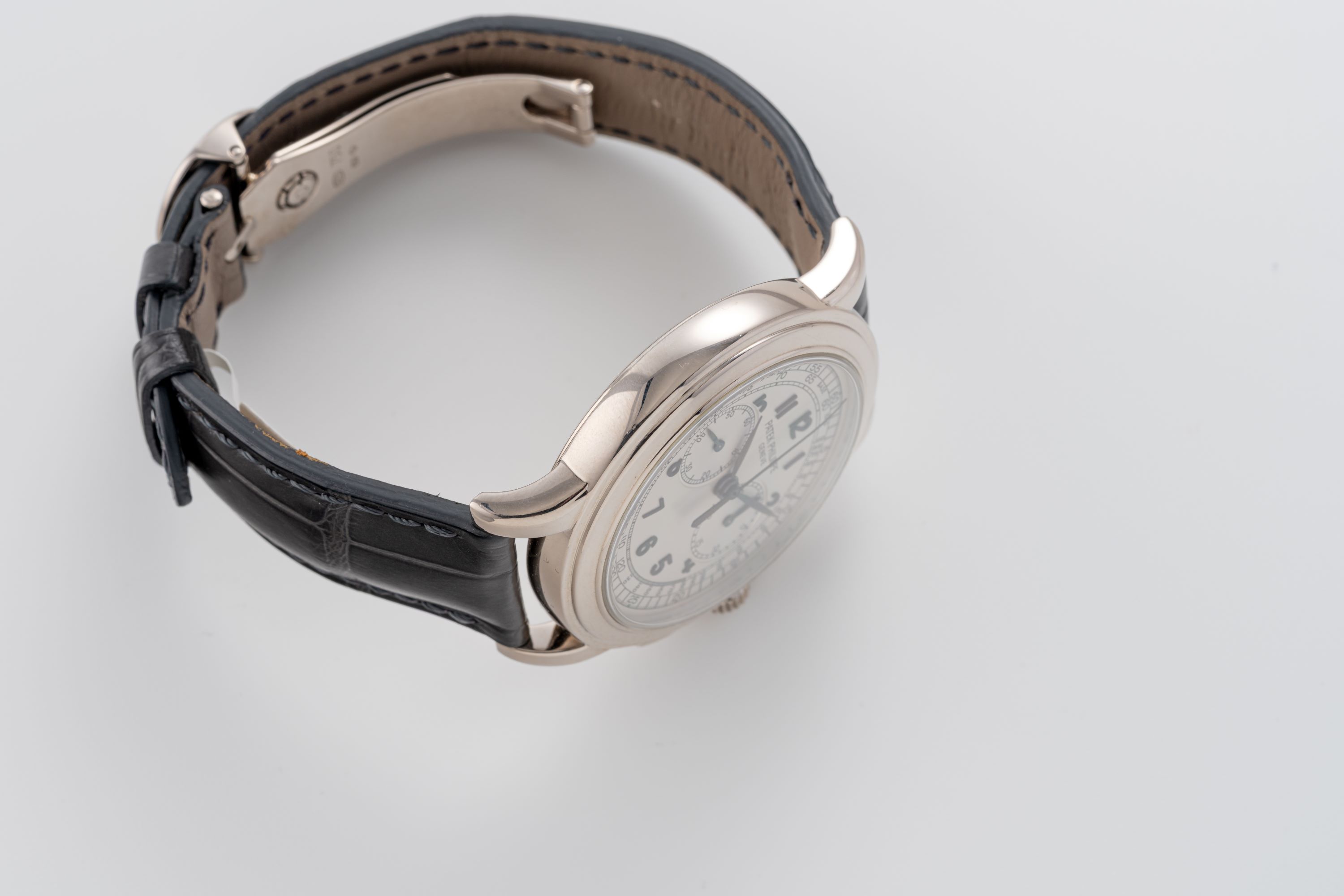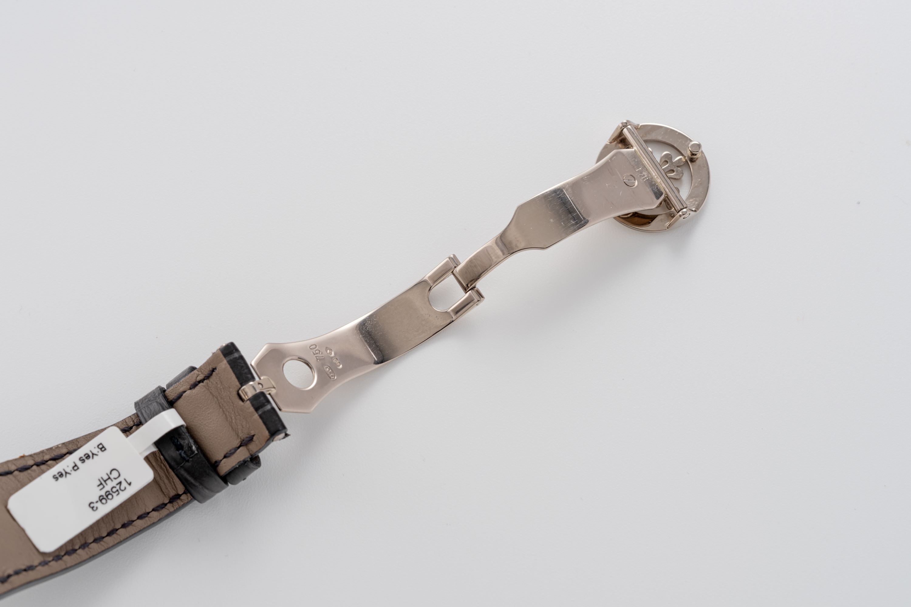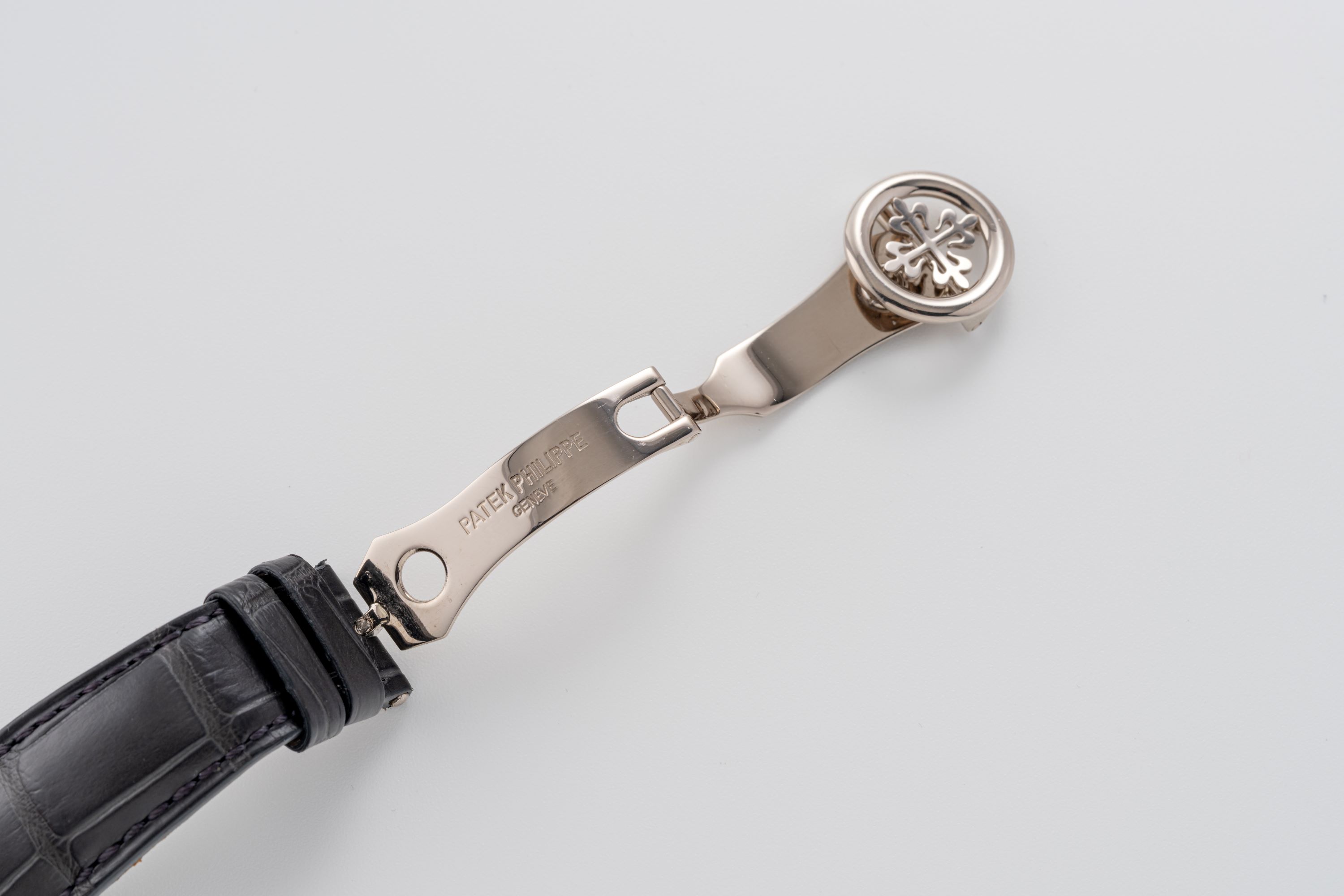 StrapGrey alligator leather strap with Patek Philippe deployant clasp in 18k white gold