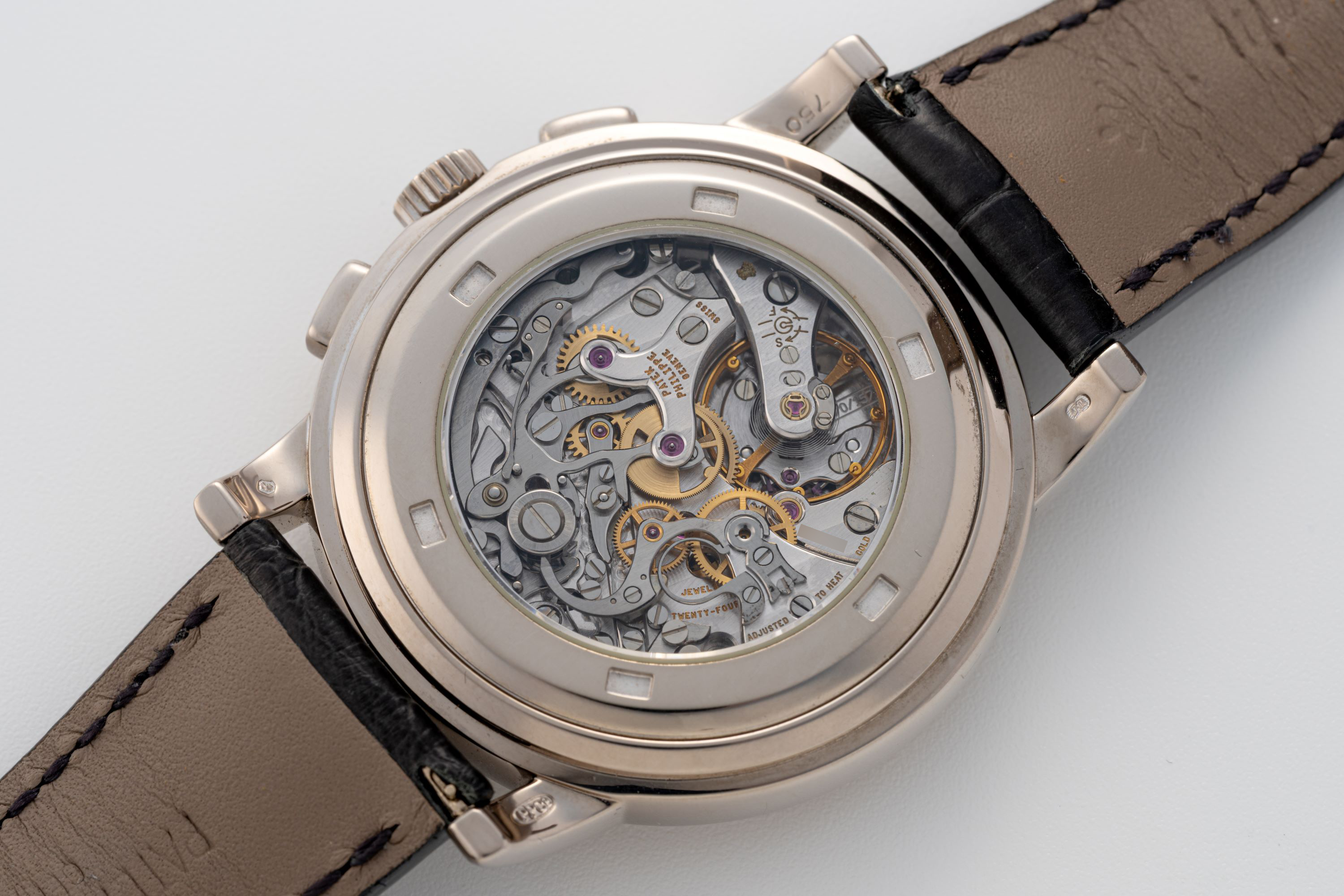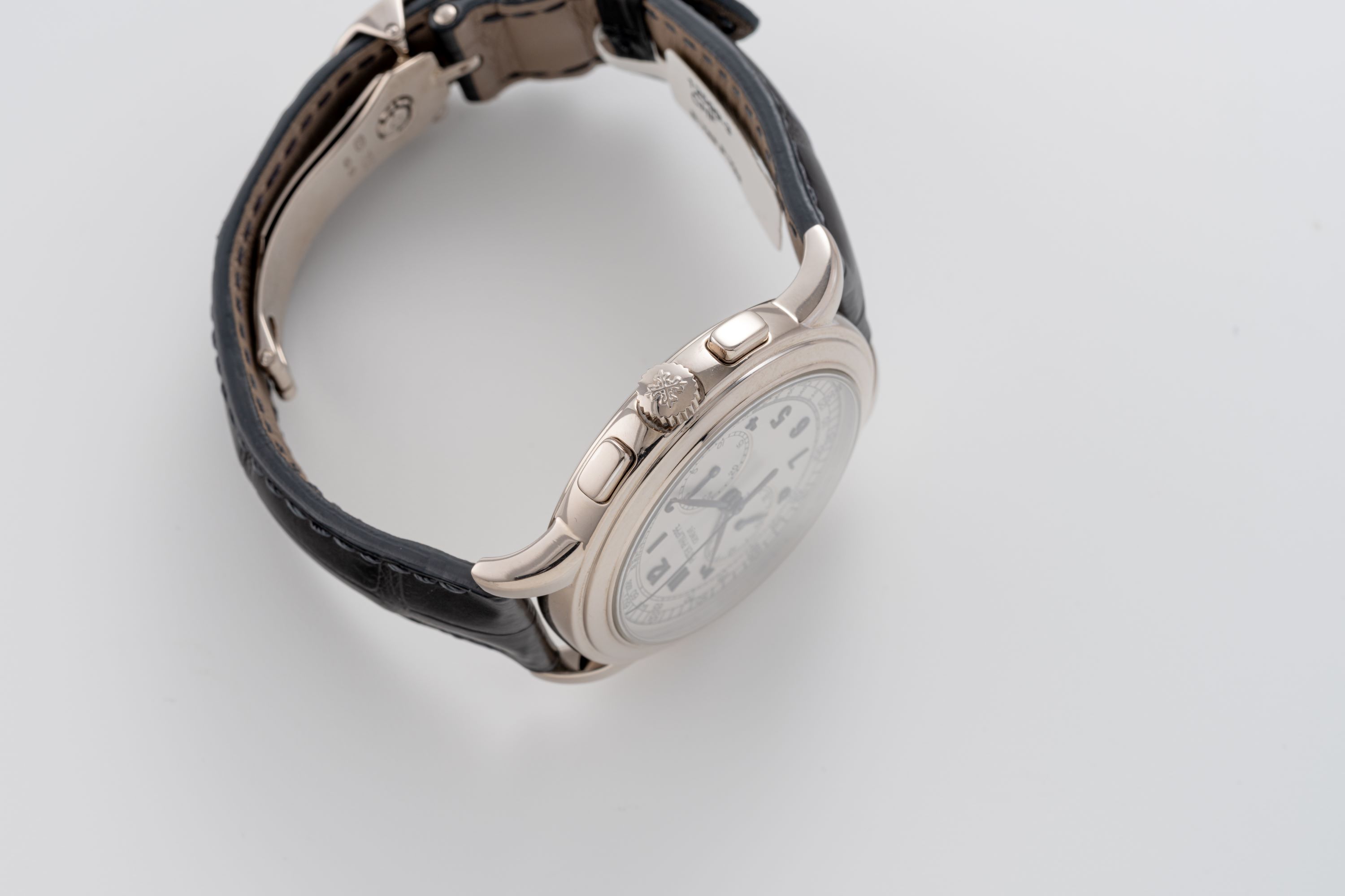 CaseRound case in 18k white gold with chronograph pushers at 2 and 4 o'clock, winding crown at 3 o'clock, display caseback