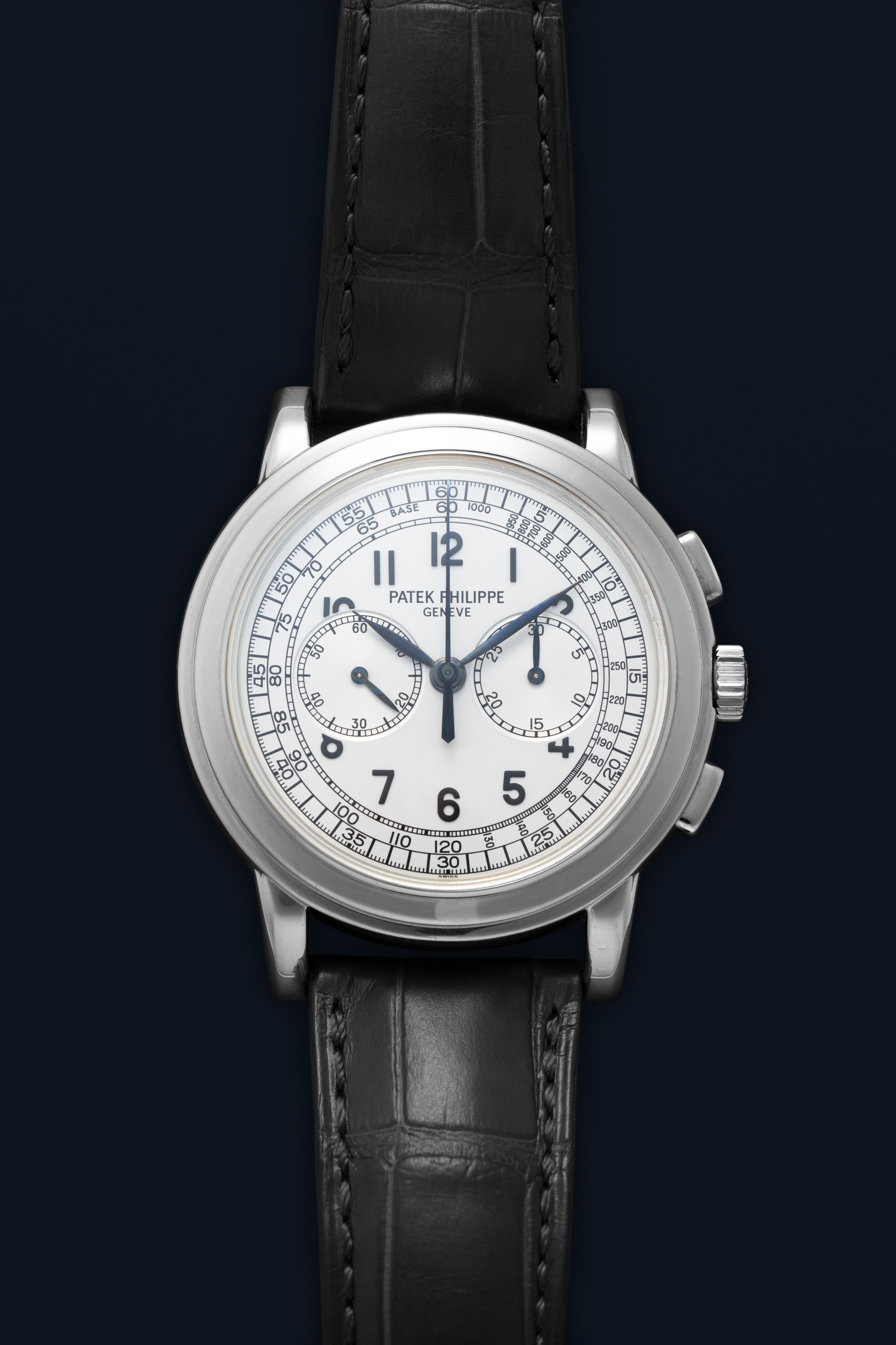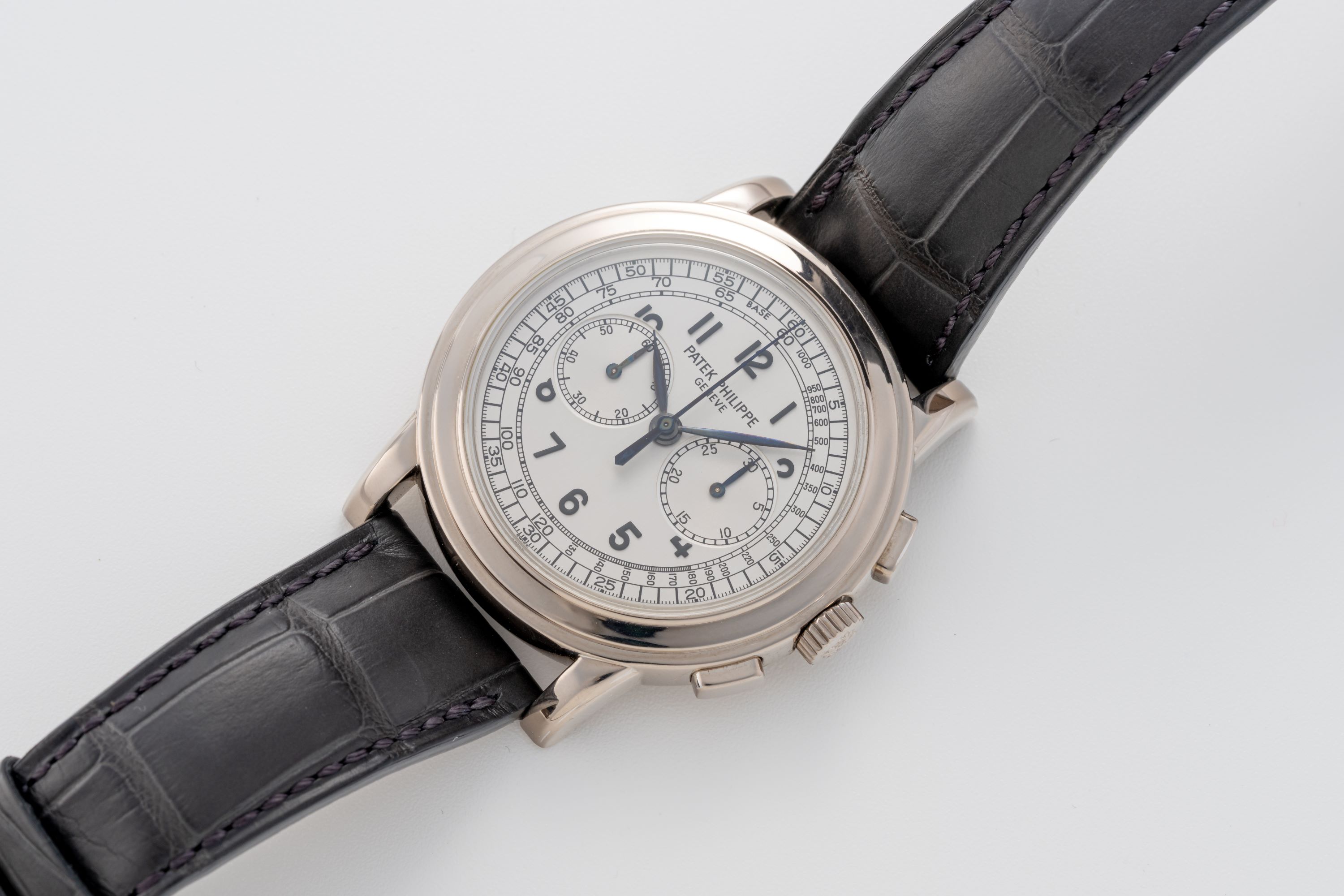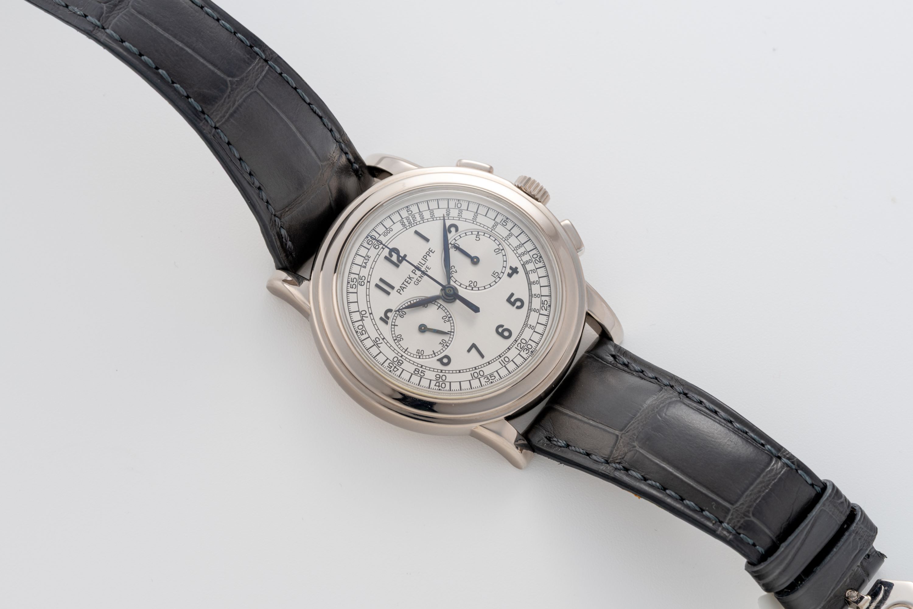 DialSilver dial with applied black numerals, outer tachymeter scale, black leaf hands, small seconds at 9 o'clock, 30 minute chronograph counter at 3 o'clock, signed 'Patek Philippe' at 12 o'clock