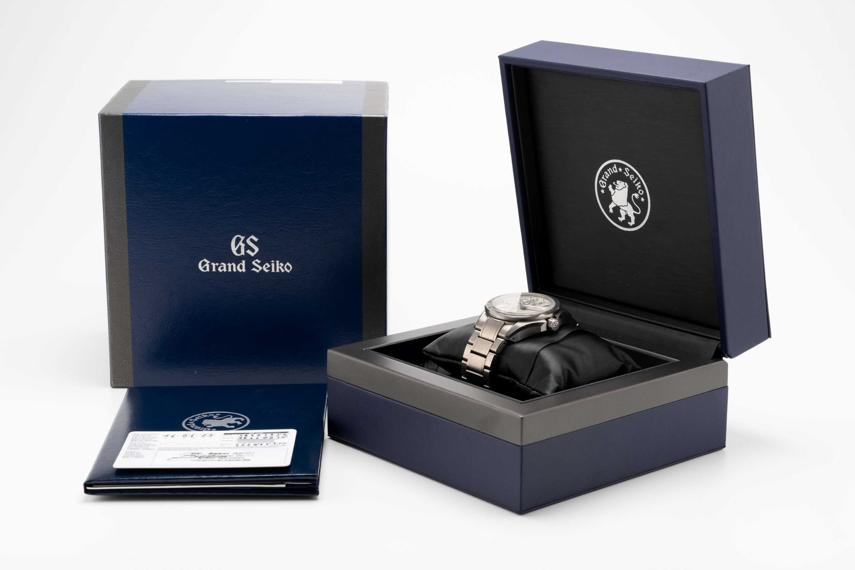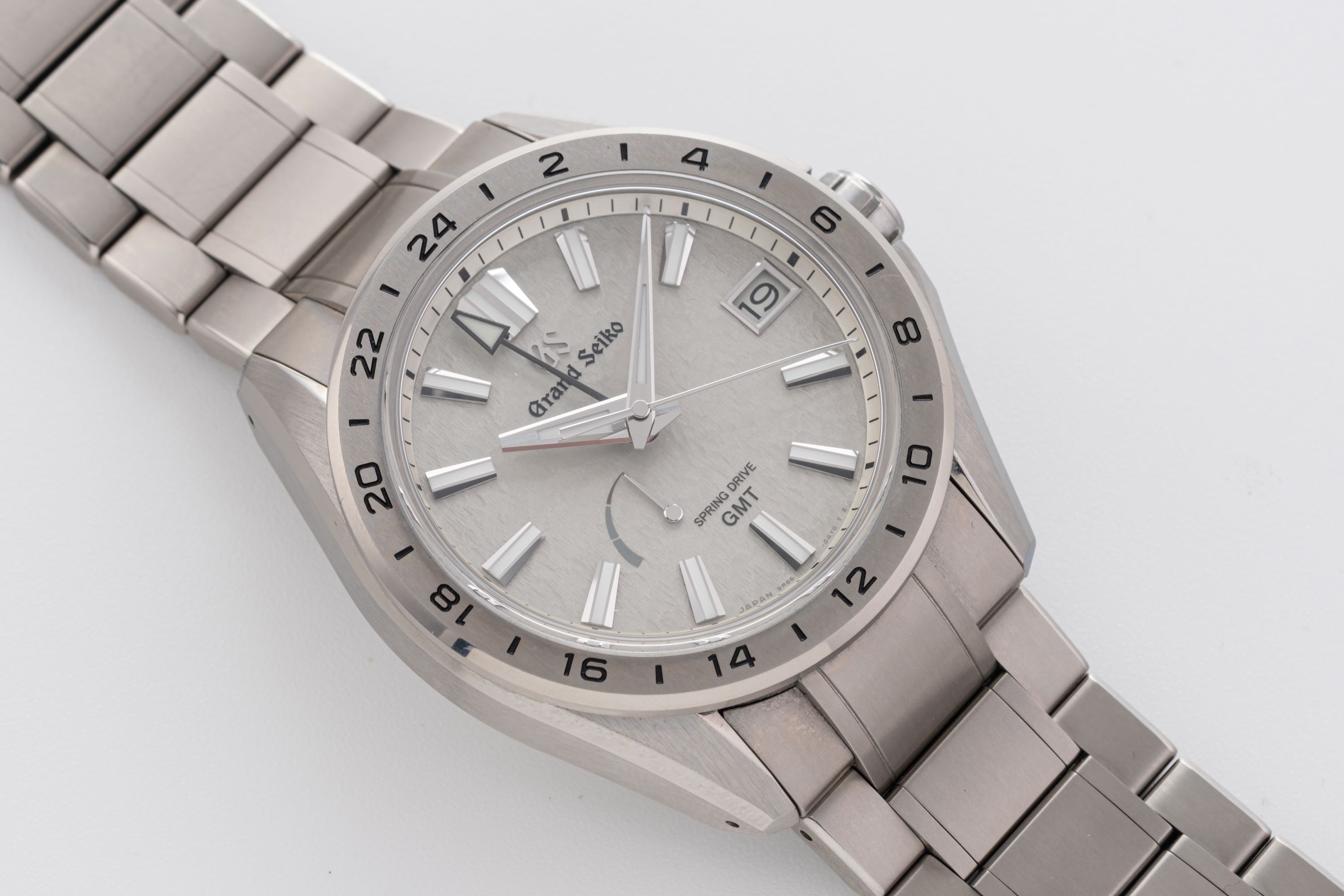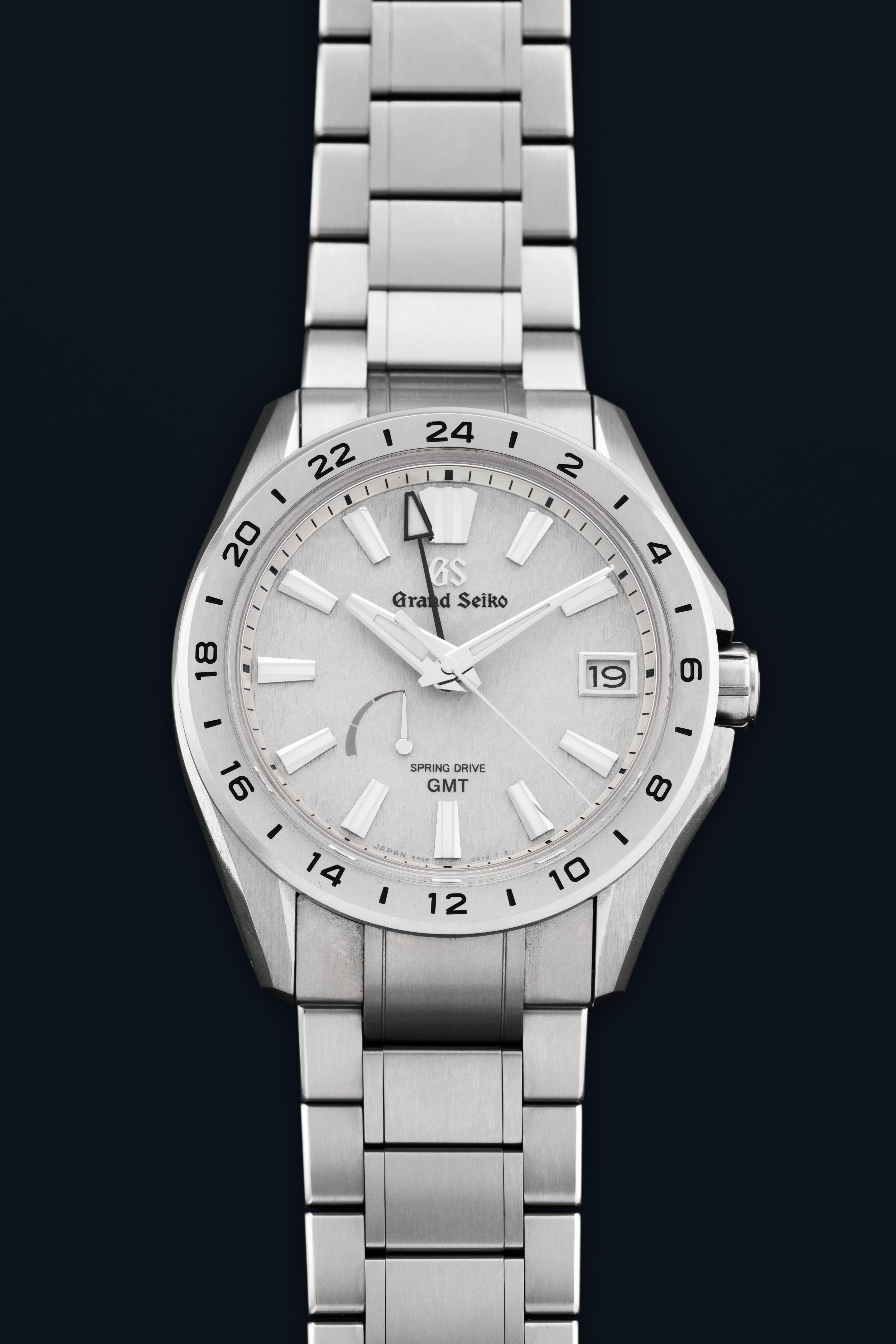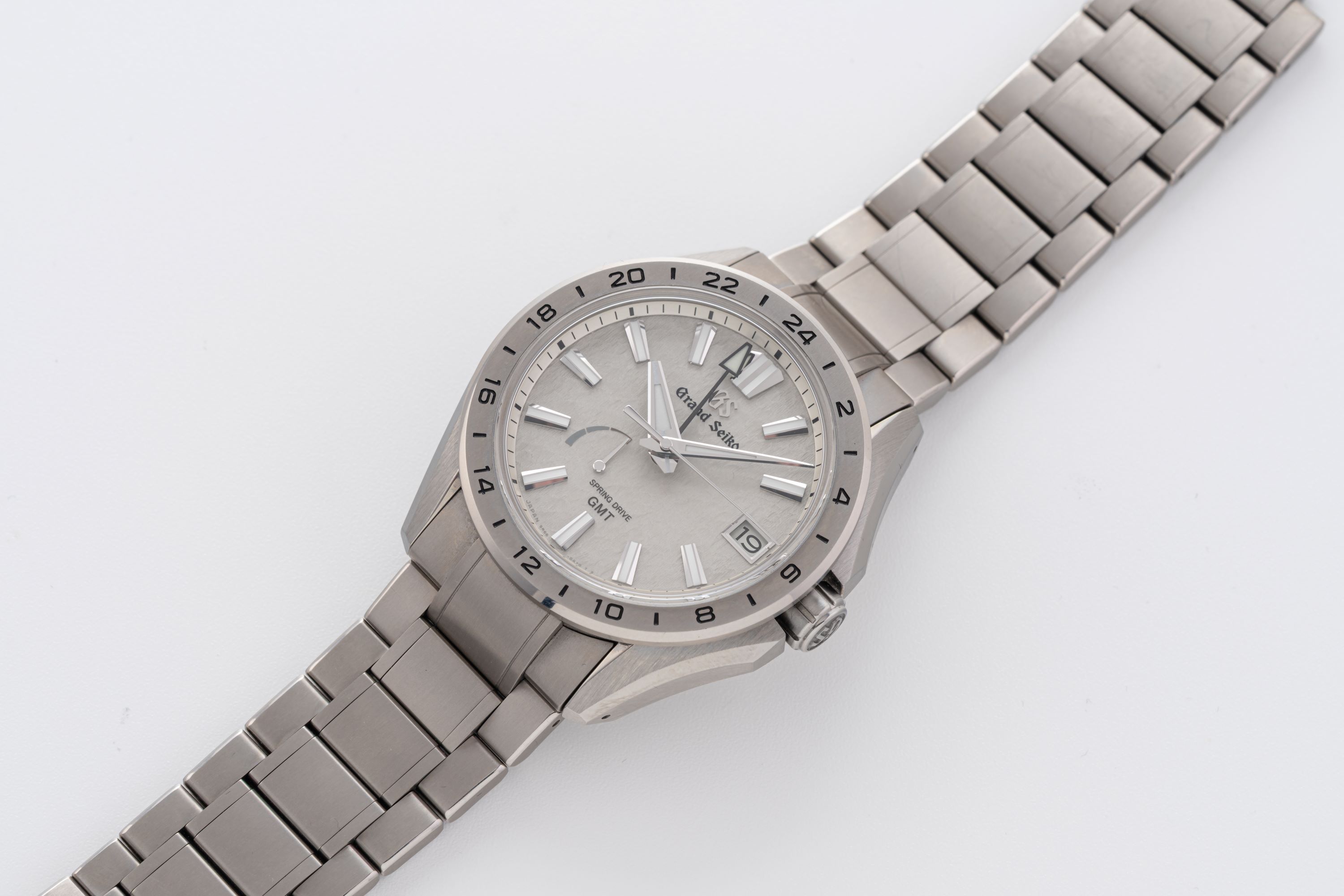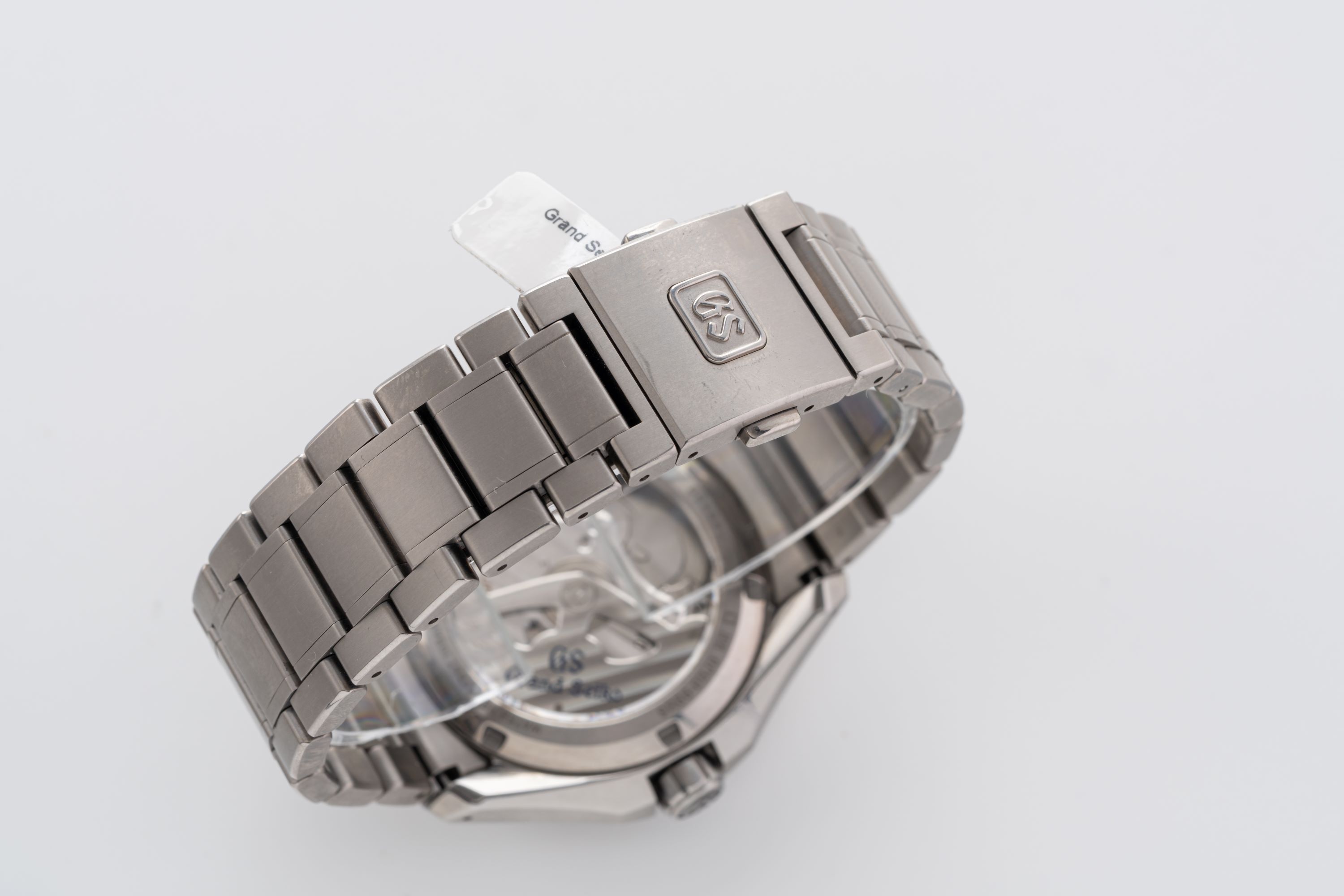 DialTextured grey dial with applied luminous indices, luminous hands, date window at 3 o'clock, signed 'Grand Seiko' at 12 o'clock