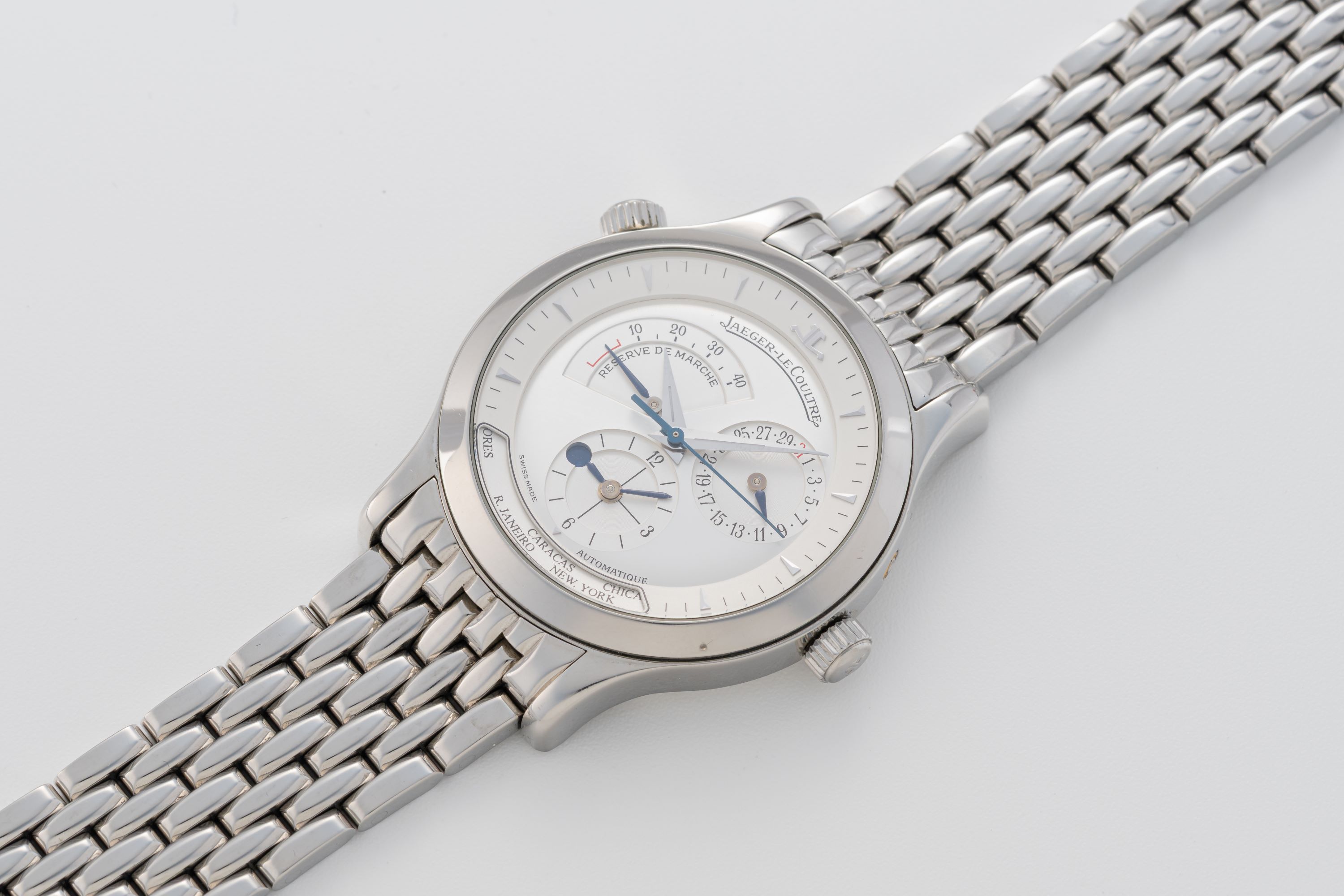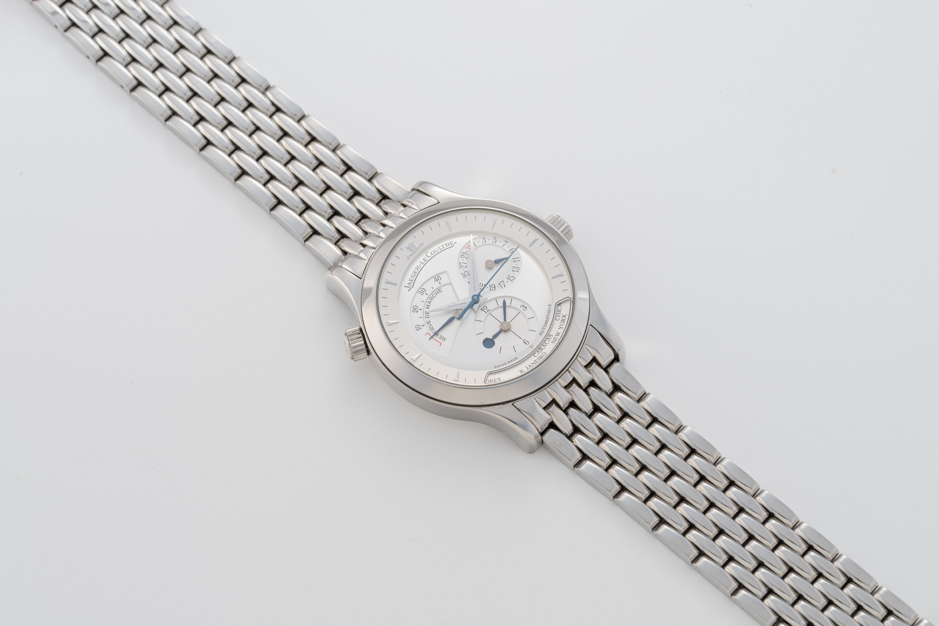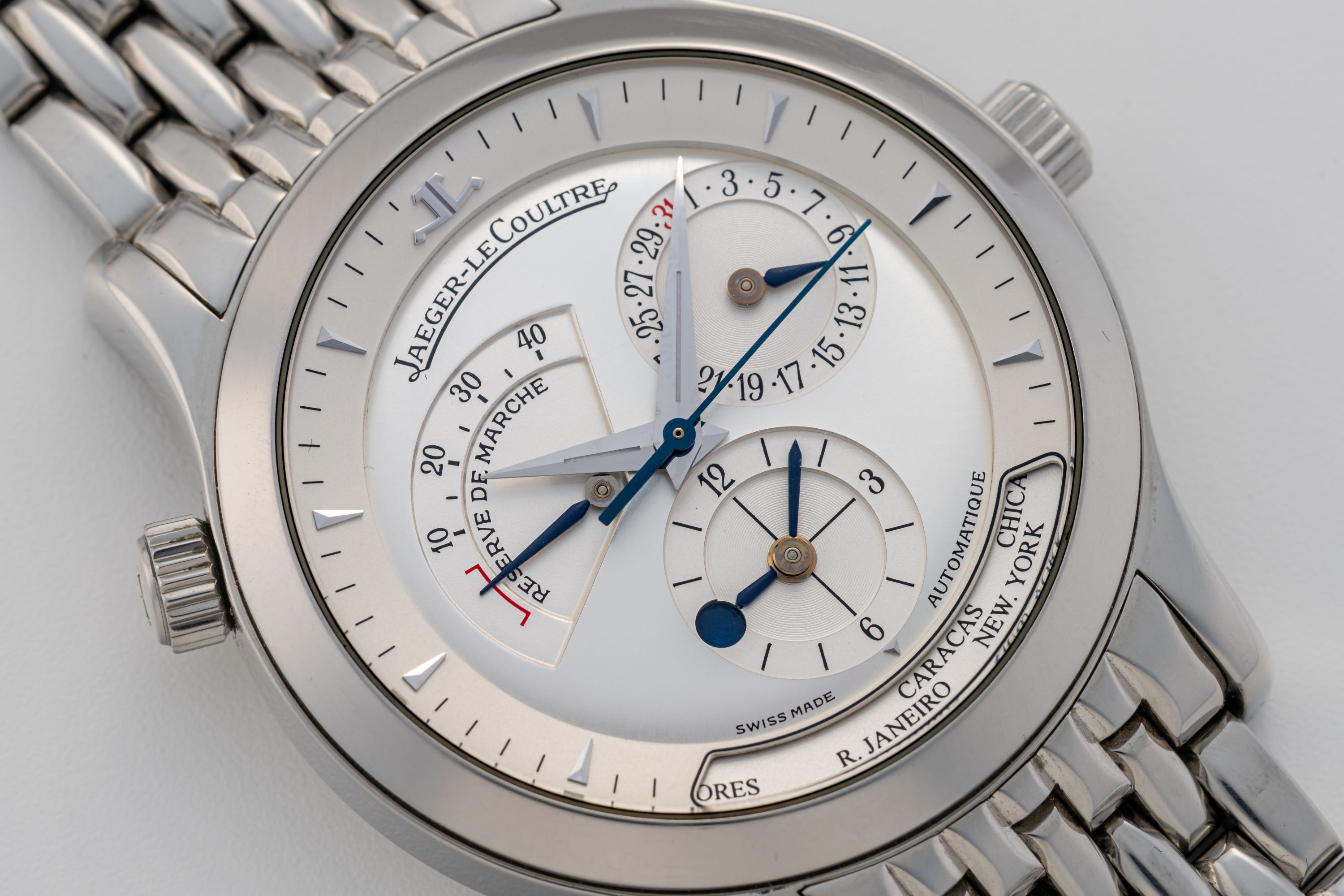 DialSilver dial with applied indices, dauphine hands, power reserve at 10 o'clock, date at 2 o'clock, second timezone with day/night indicator and city disc at 6 o'clock