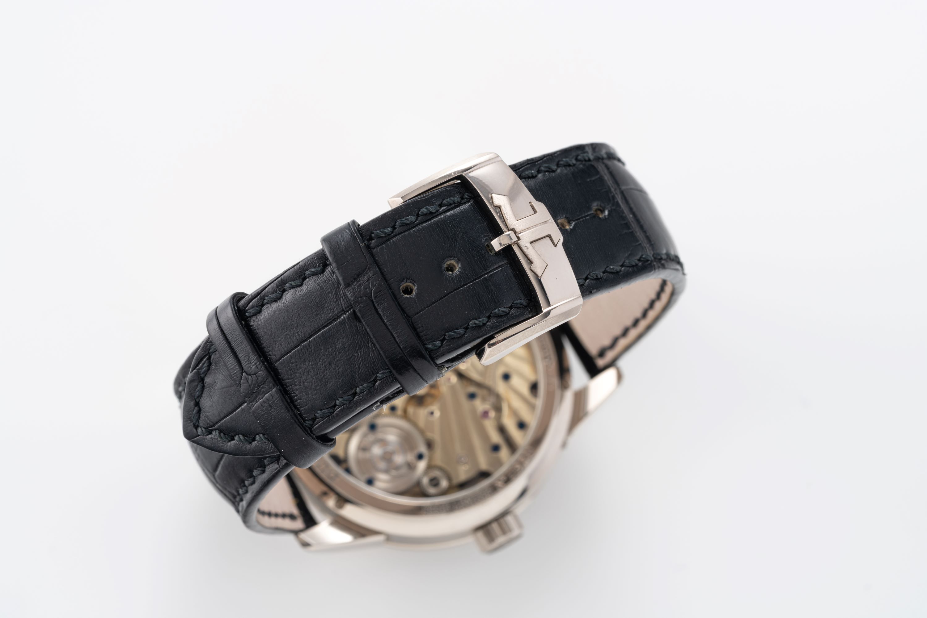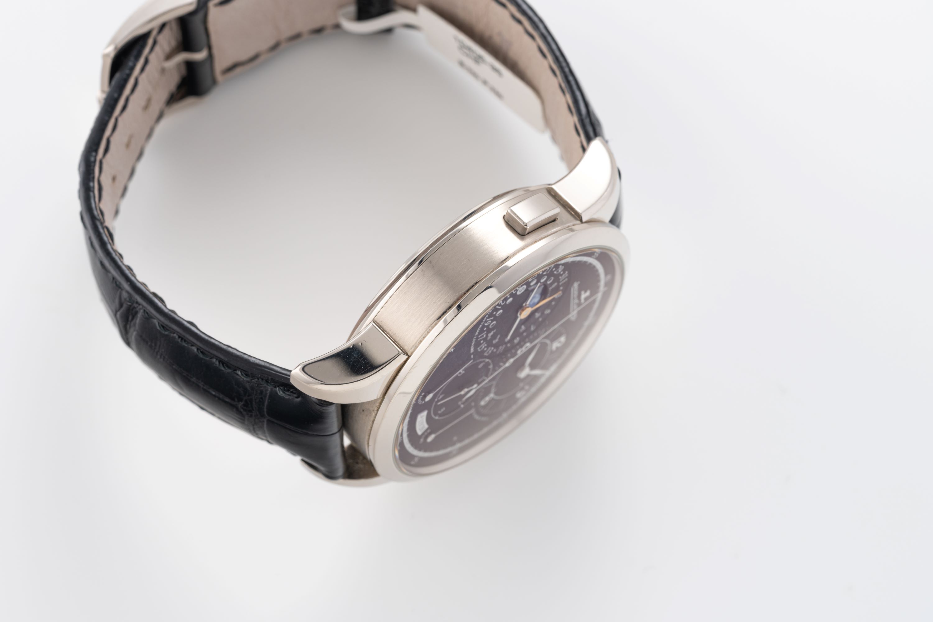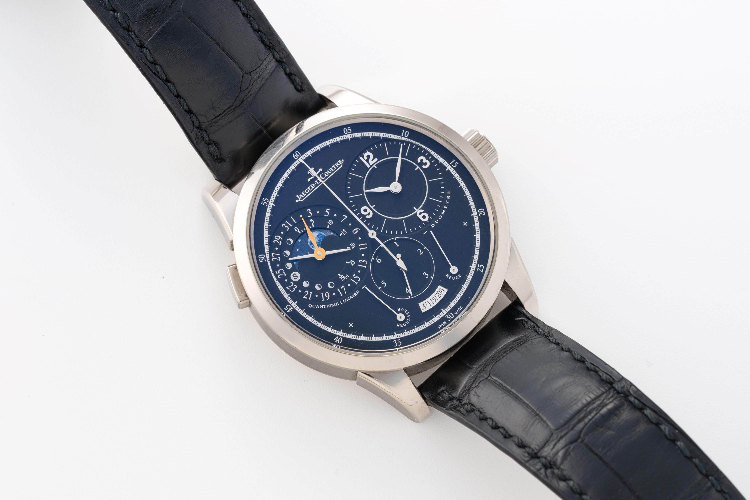 DialBlack dial with white gold hands, hours and minutes at 2 o'clock, central seconds, moonphase and date at 10 o'clock, 1/6th of a second at 6 o'clock, with power reserve at 7 o'clock, signed 'Jaeger LeCoultre' at 12 o'clock