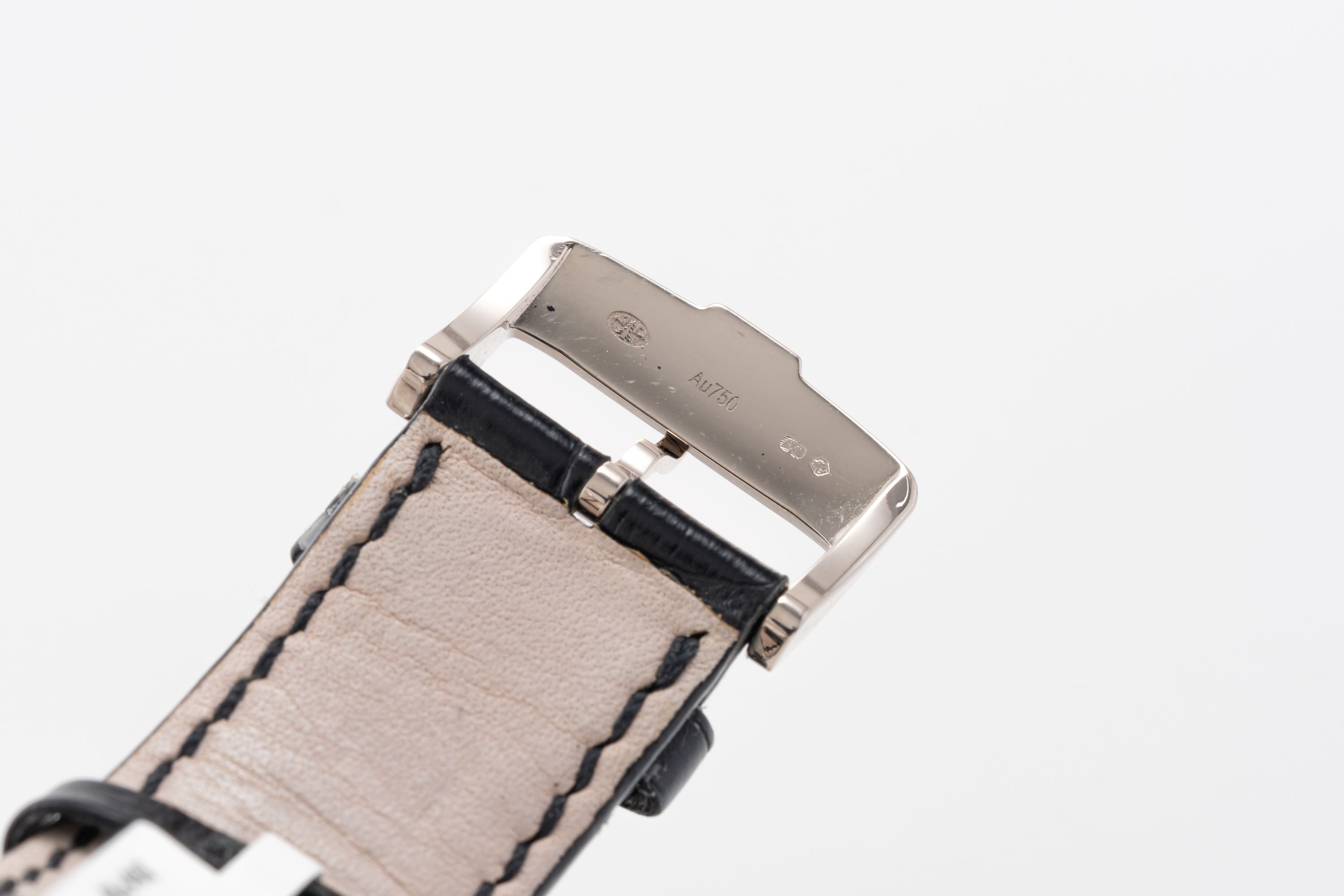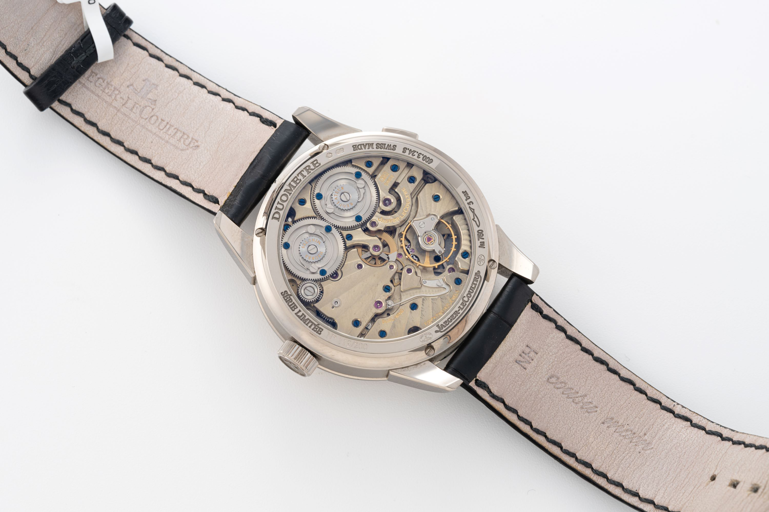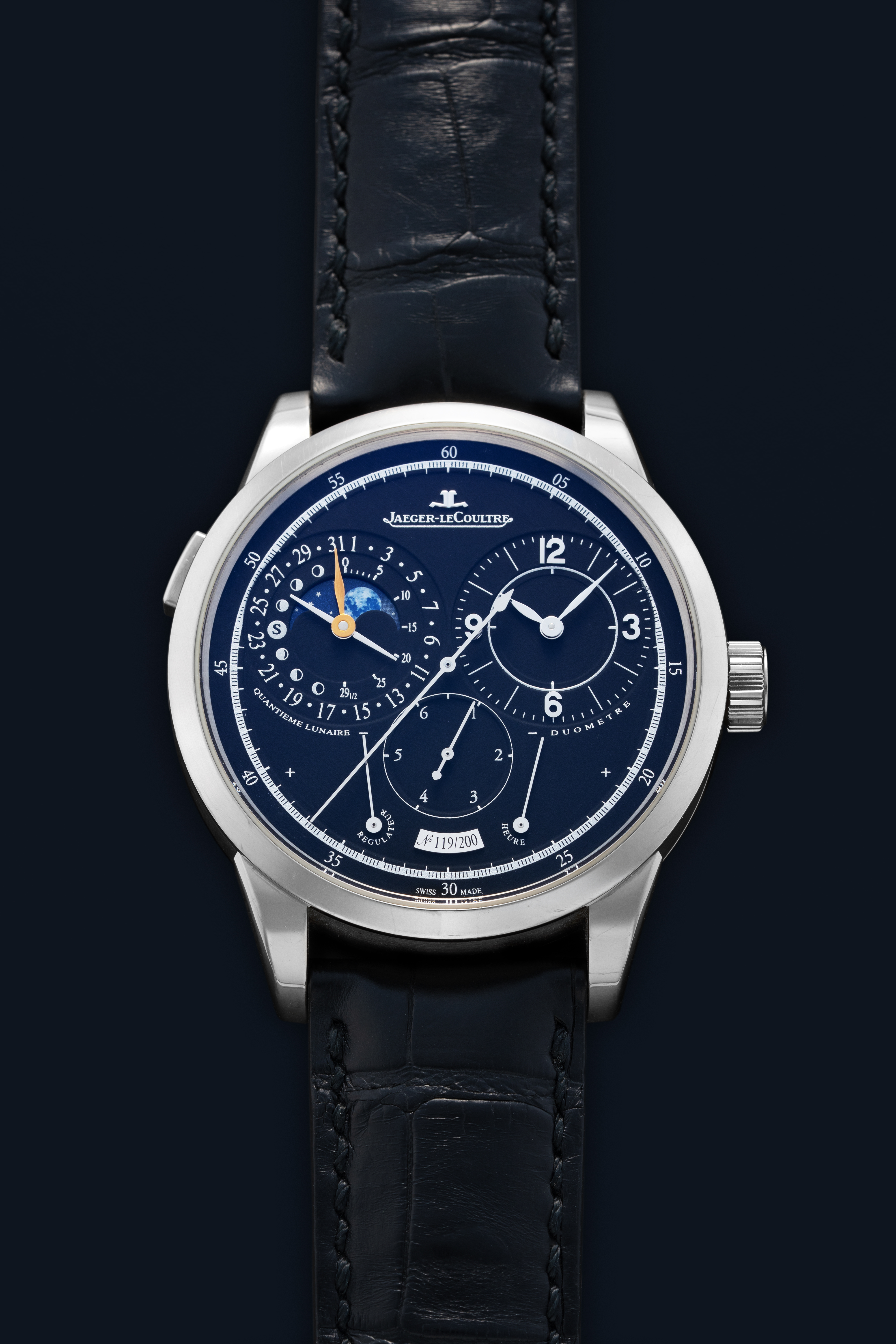 DialBlack dial with white gold hands, hours and minutes at 2 o'clock, central seconds, moonphase and date at 10 o'clock, 1/6th of a second at 6 o'clock, with power reserve at 7 o'clock, signed 'Jaeger LeCoultre' at 12 o'clock