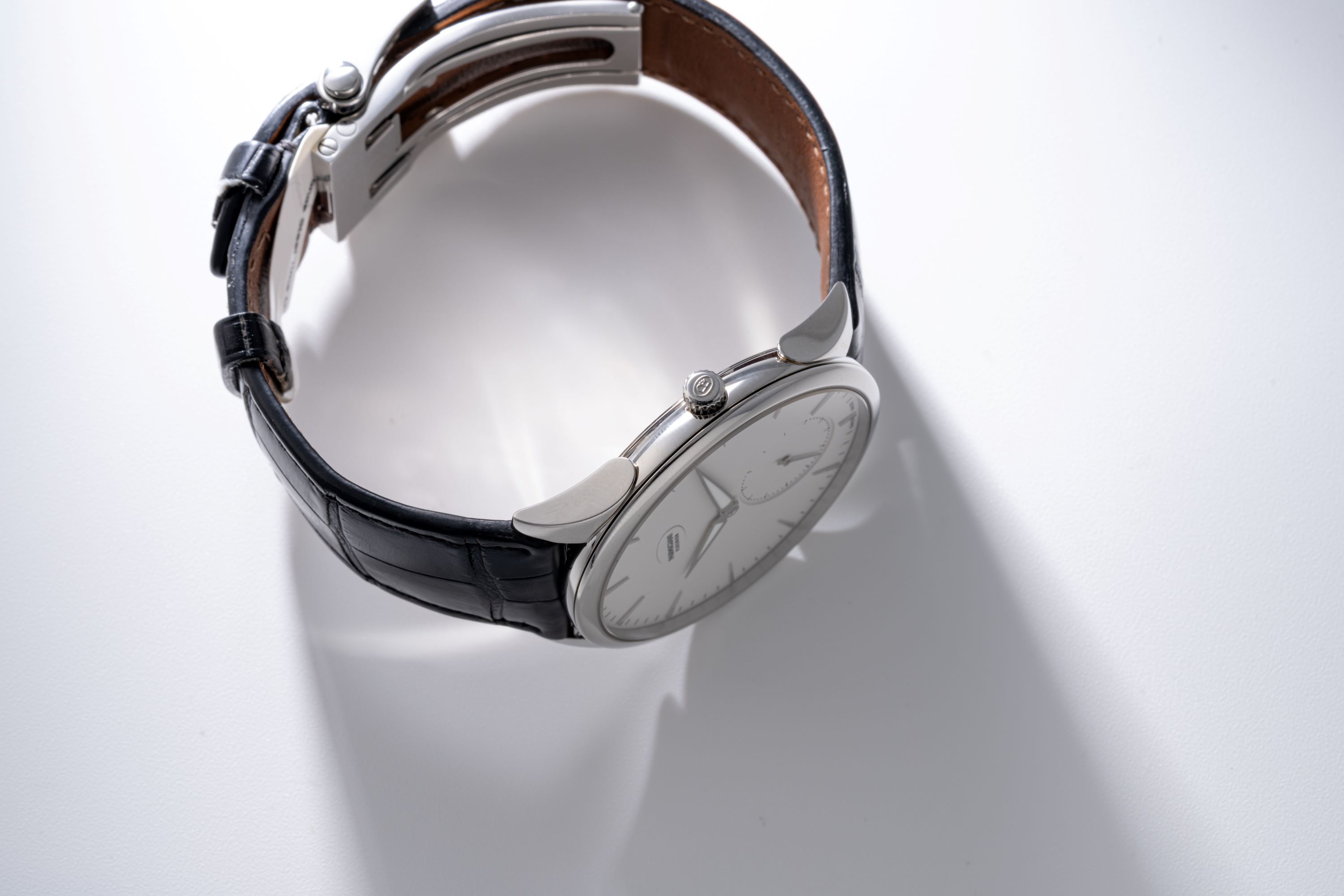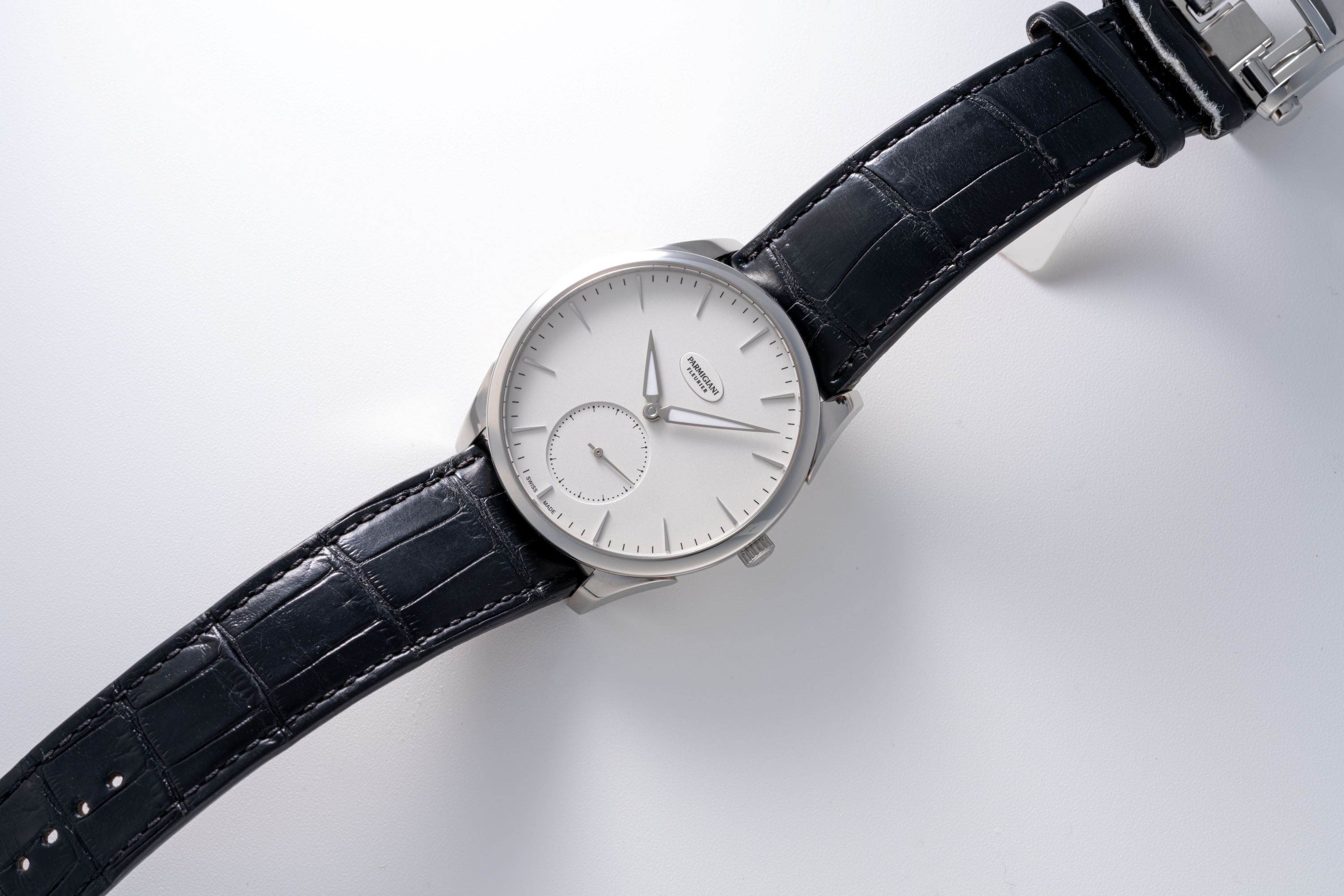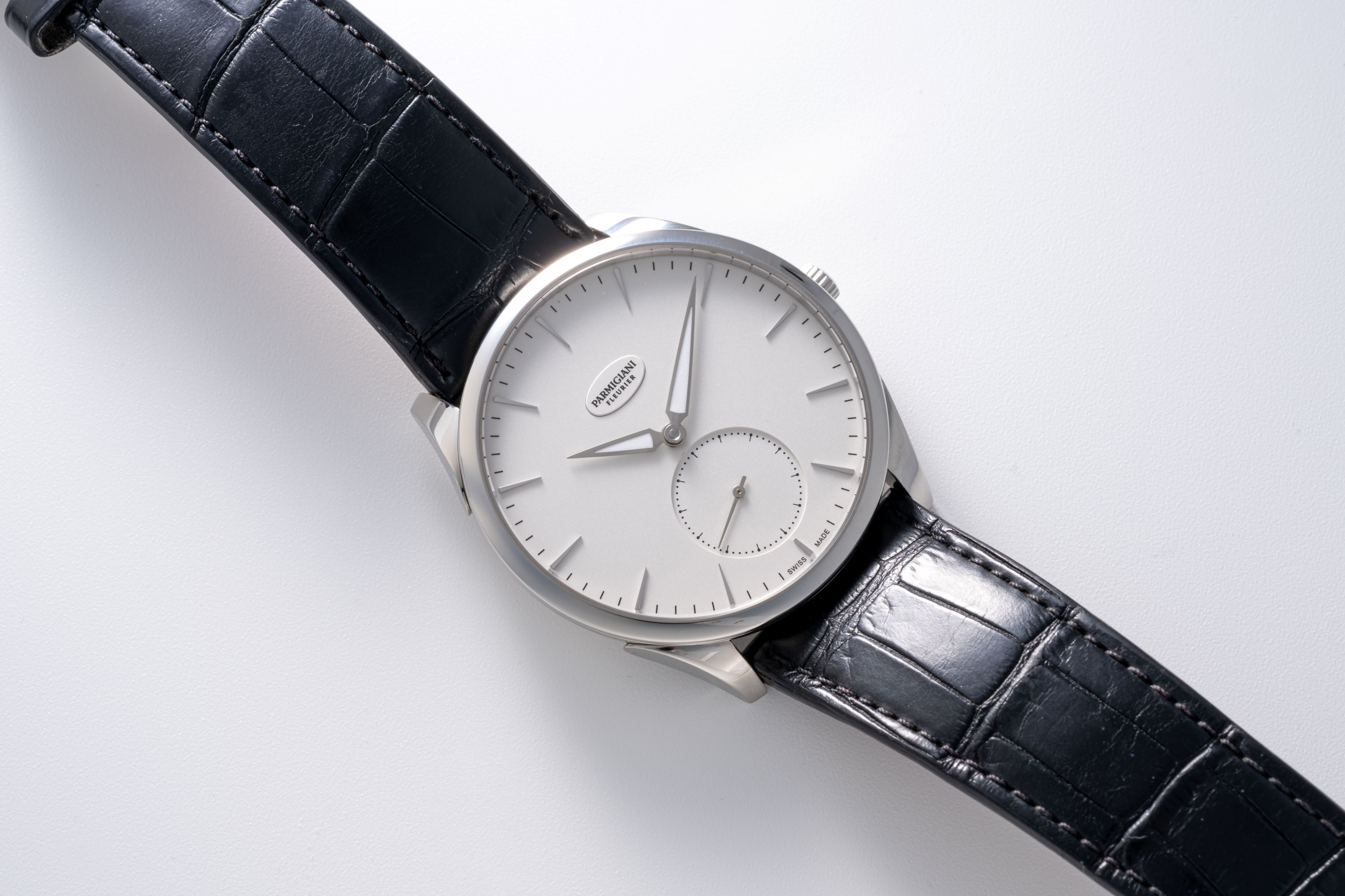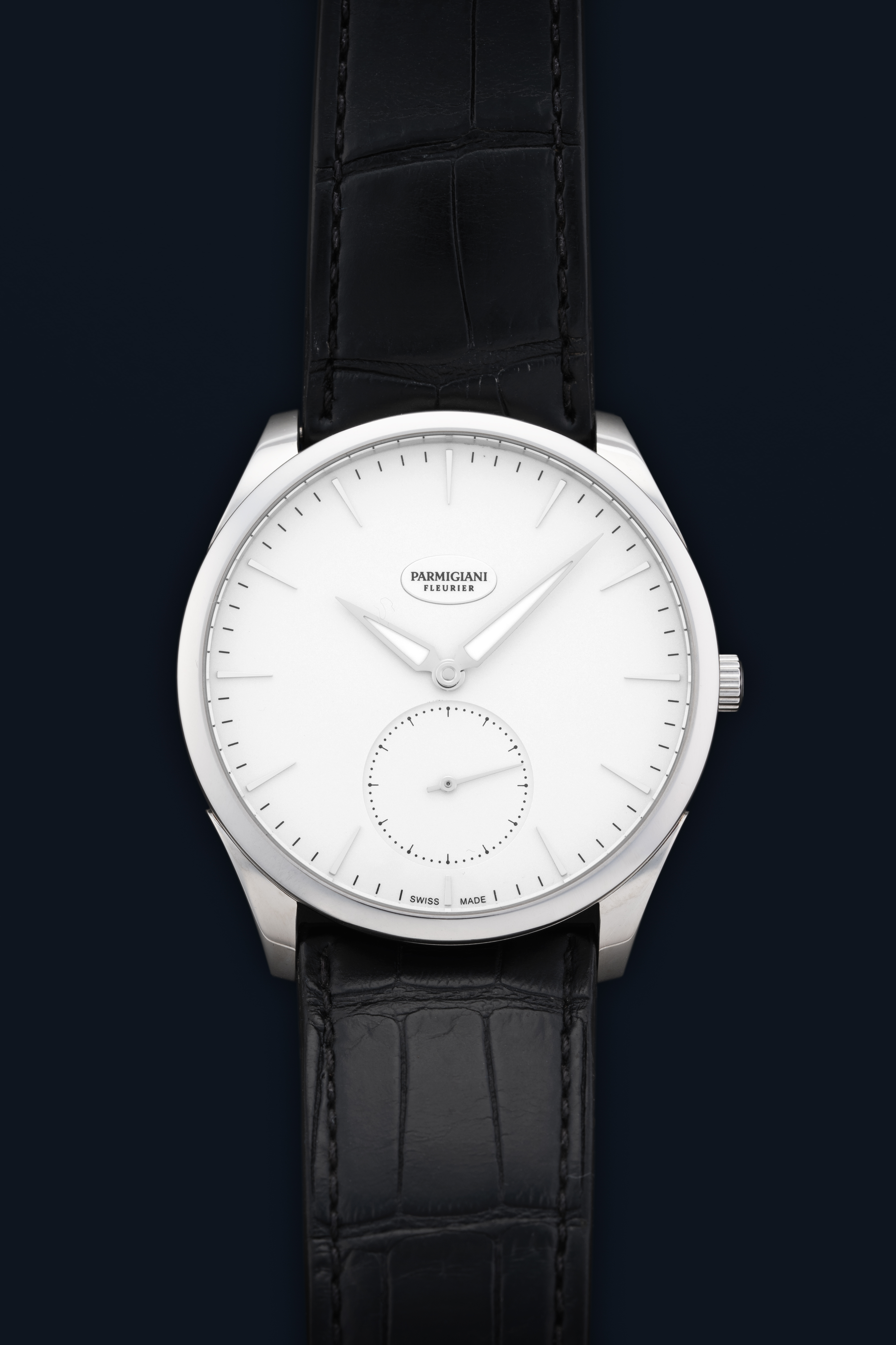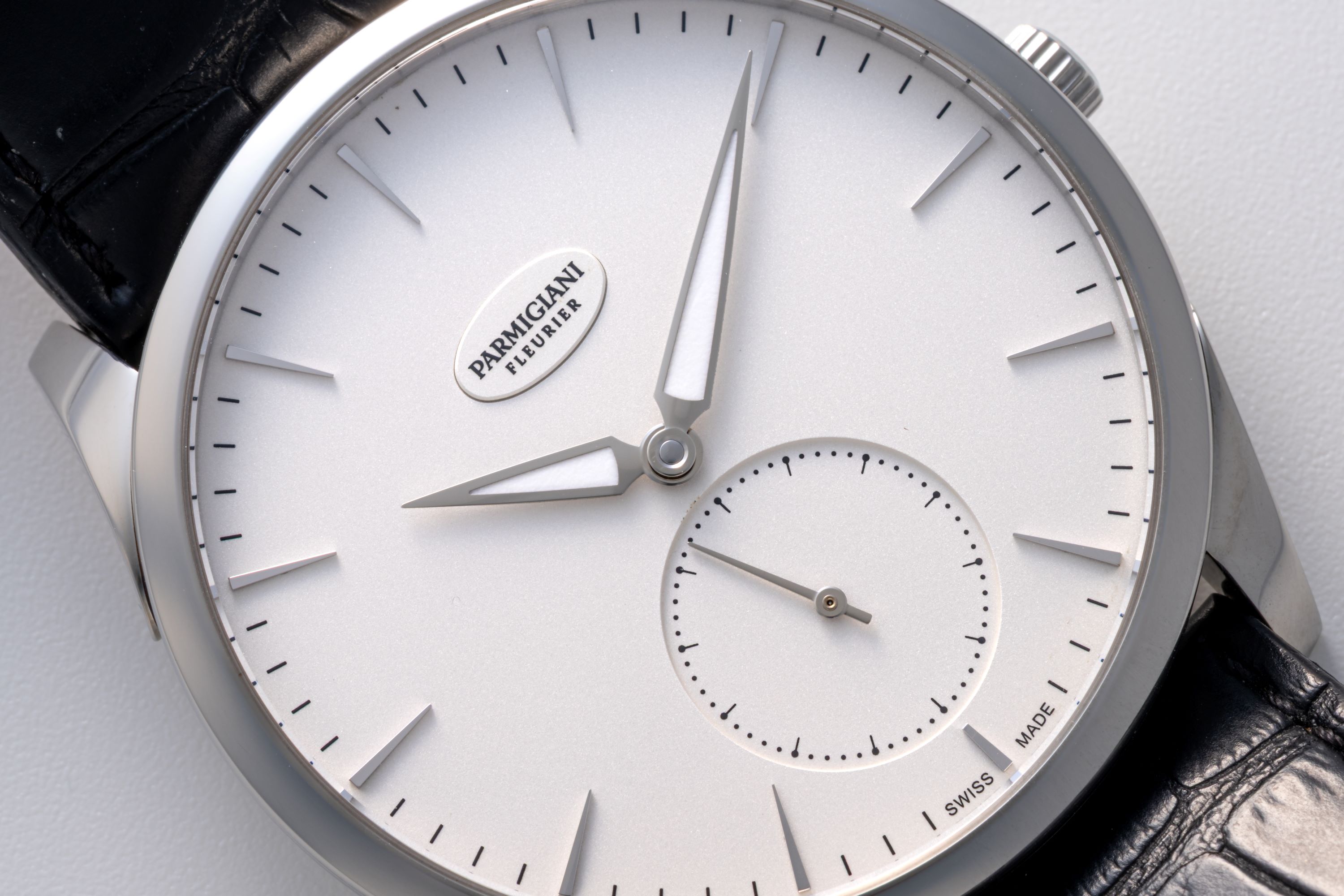 DialSilver-white dial with applied indices, luminous hands, small seconds at 6 o'clock, signed 'Parmigiani Fleurier' at 12 o'clock