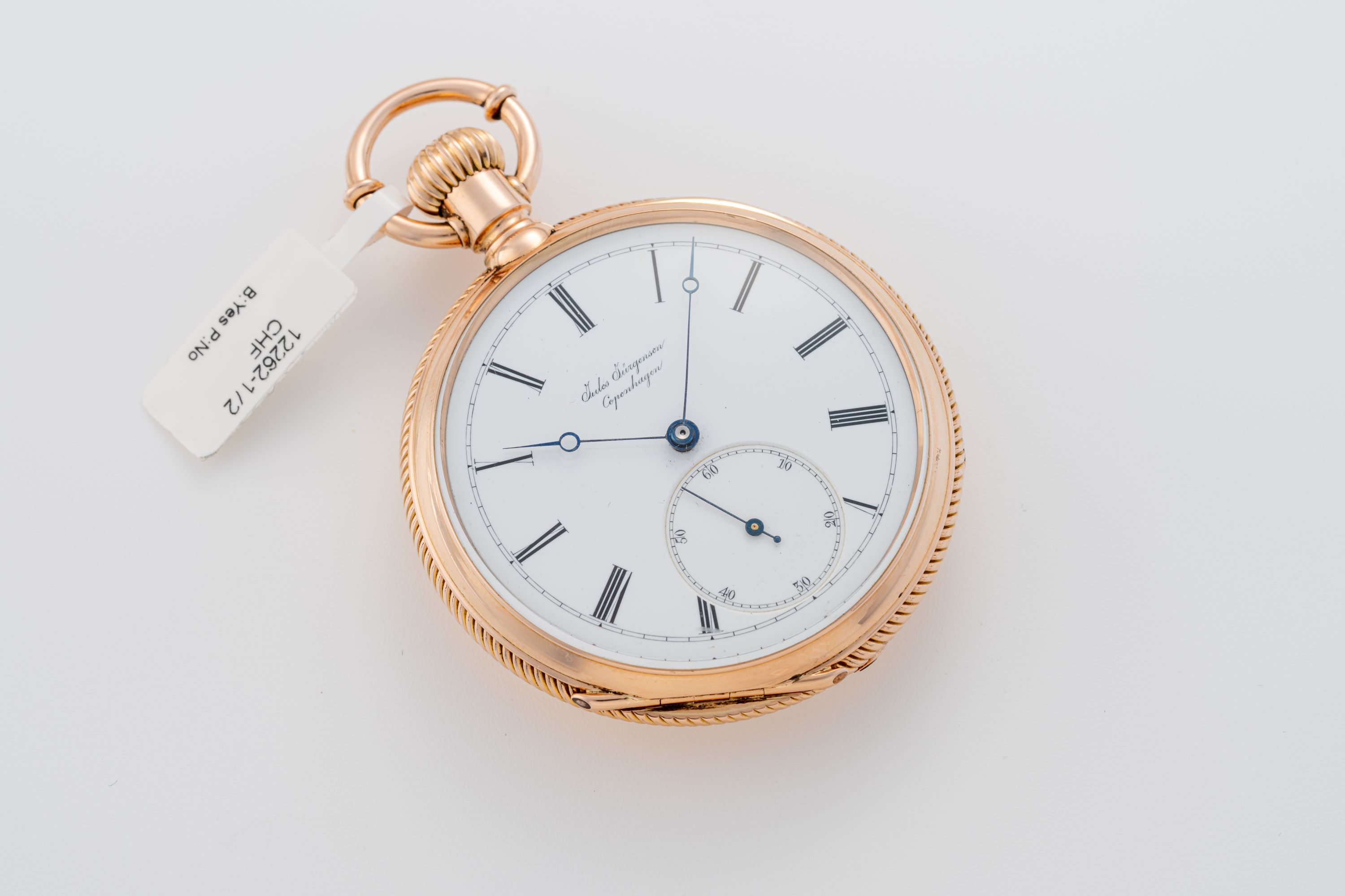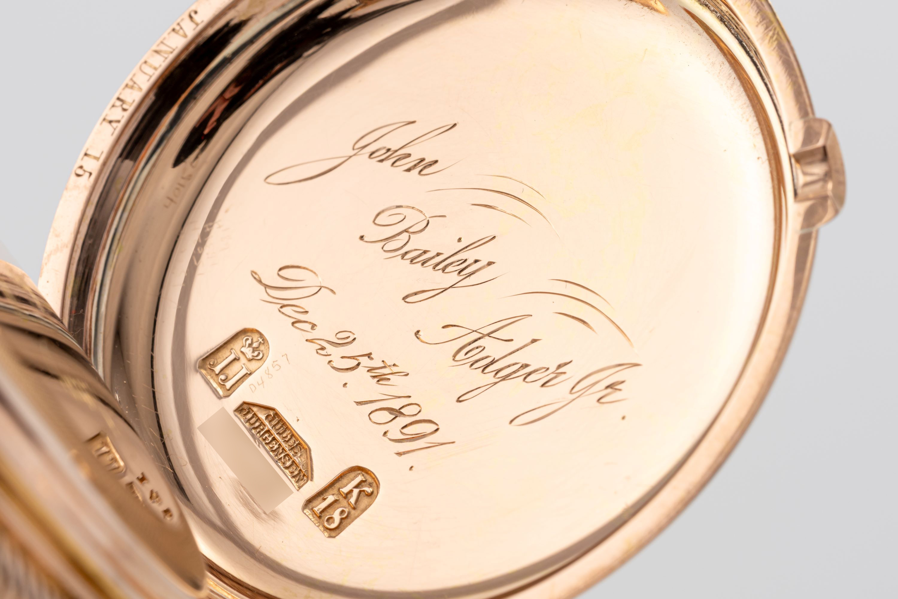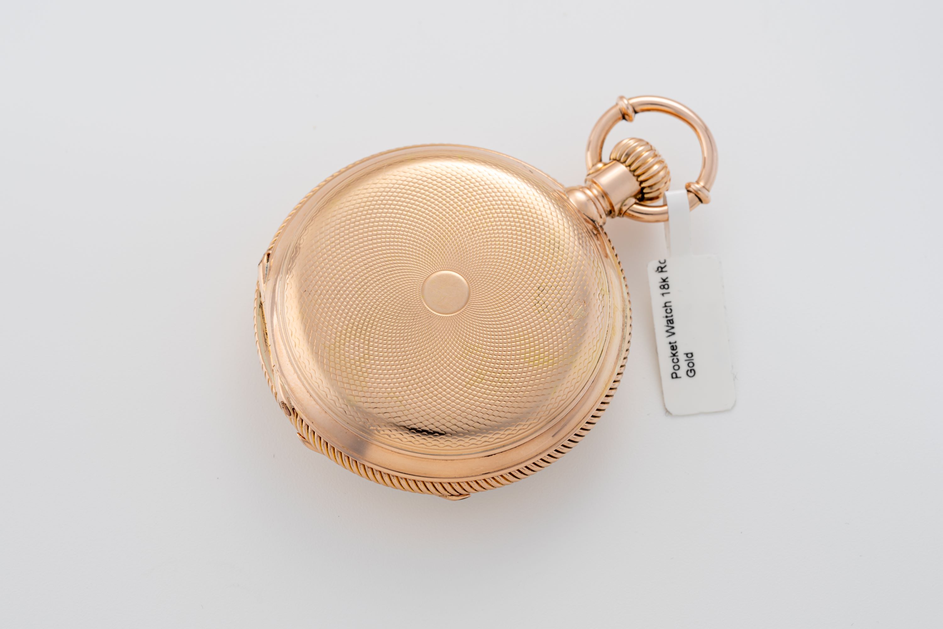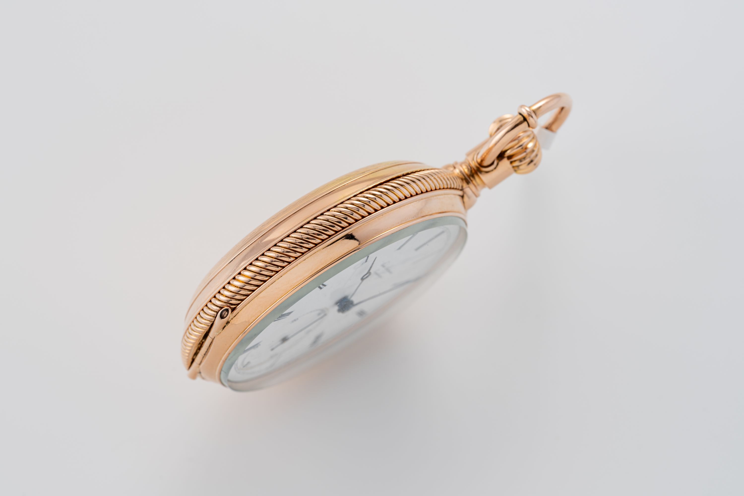 CaseRound case in 18k rose gold with fluted 'rope' flanks, double lid caseback, chain loop and winding crown at 12 o'clock