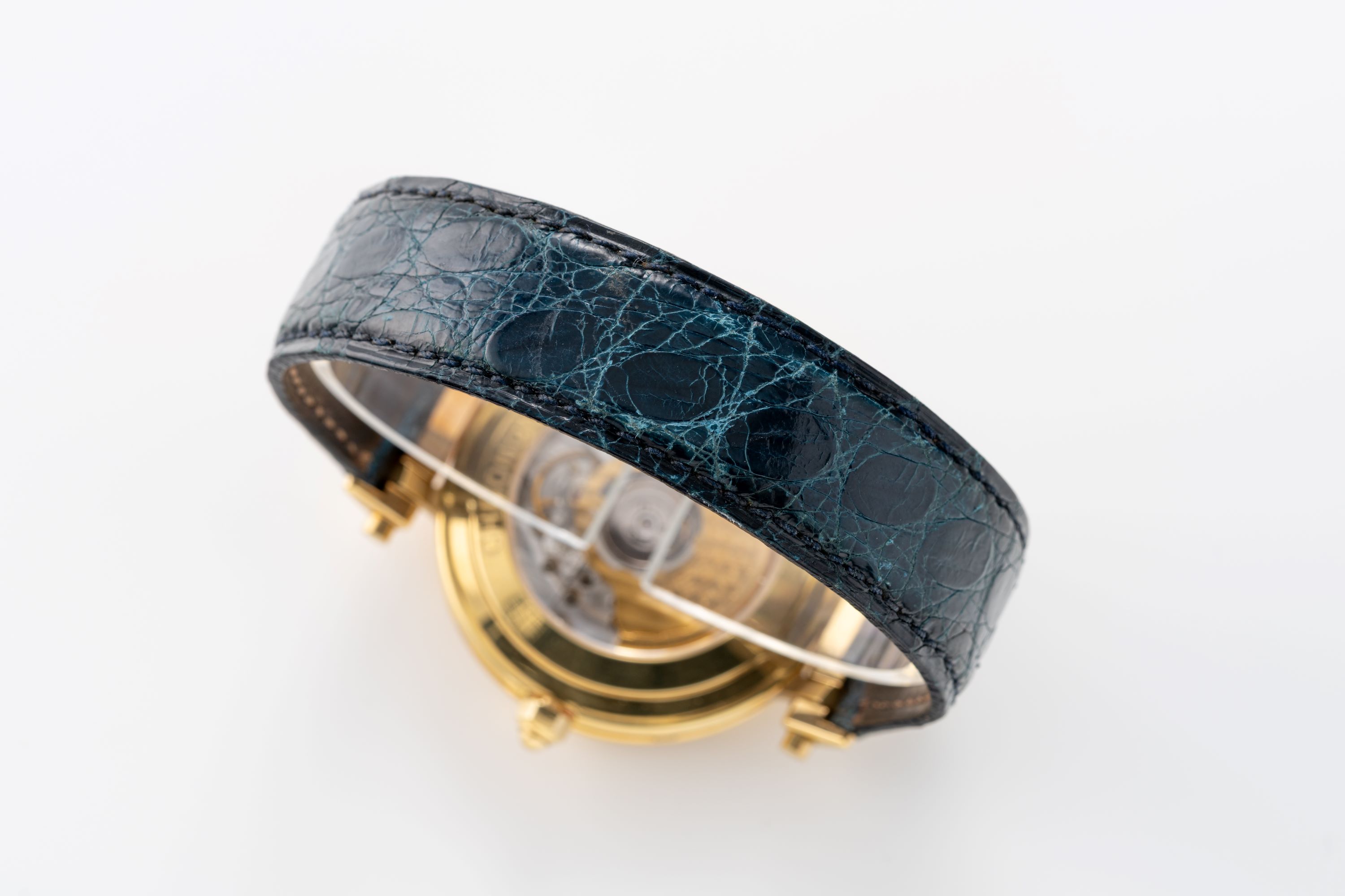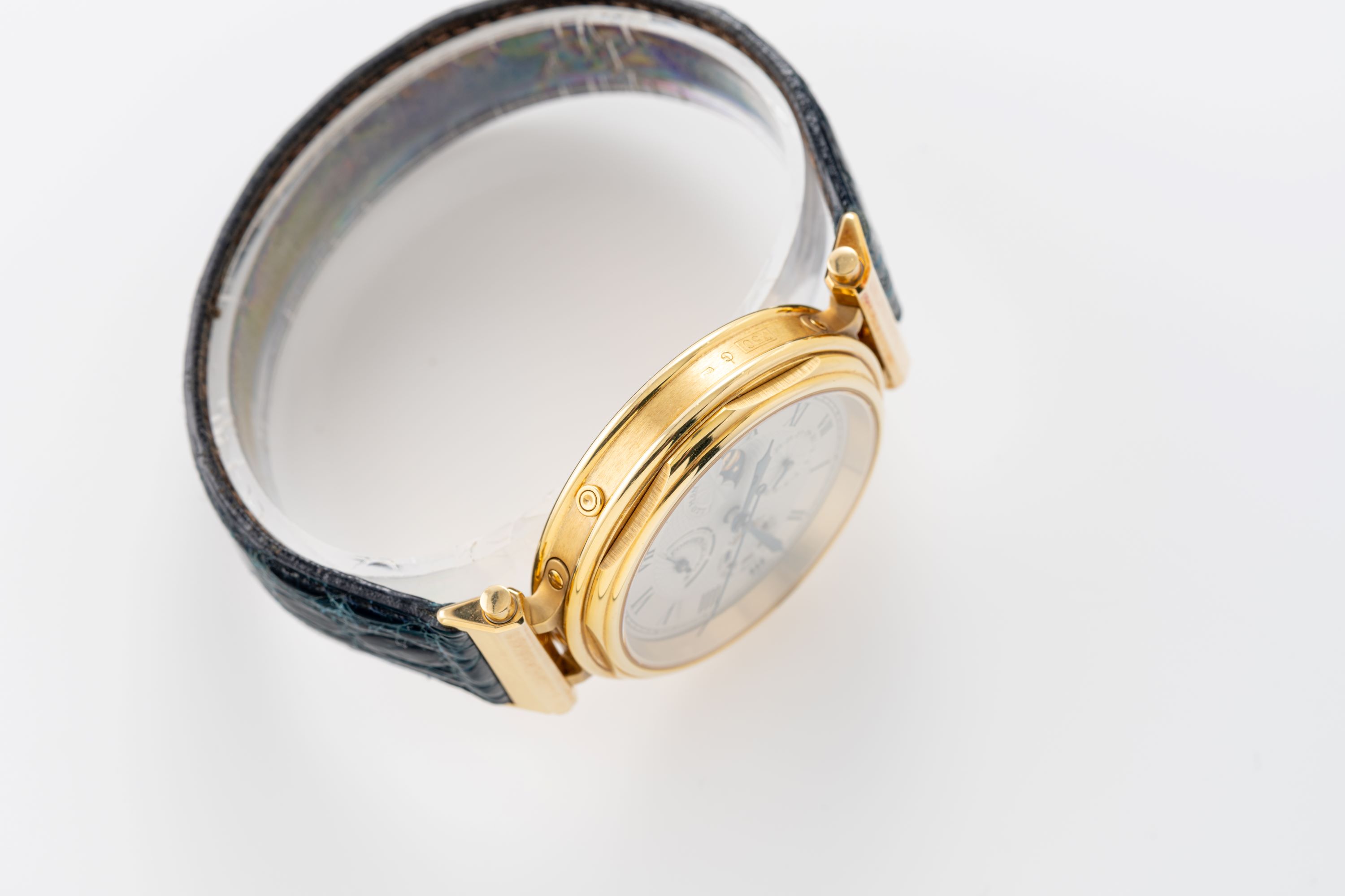 CaseRound case in 18k yellow gold with clip lug attachments, crown at 3 o'clock, calendar pushers around the case flanks, display caseback