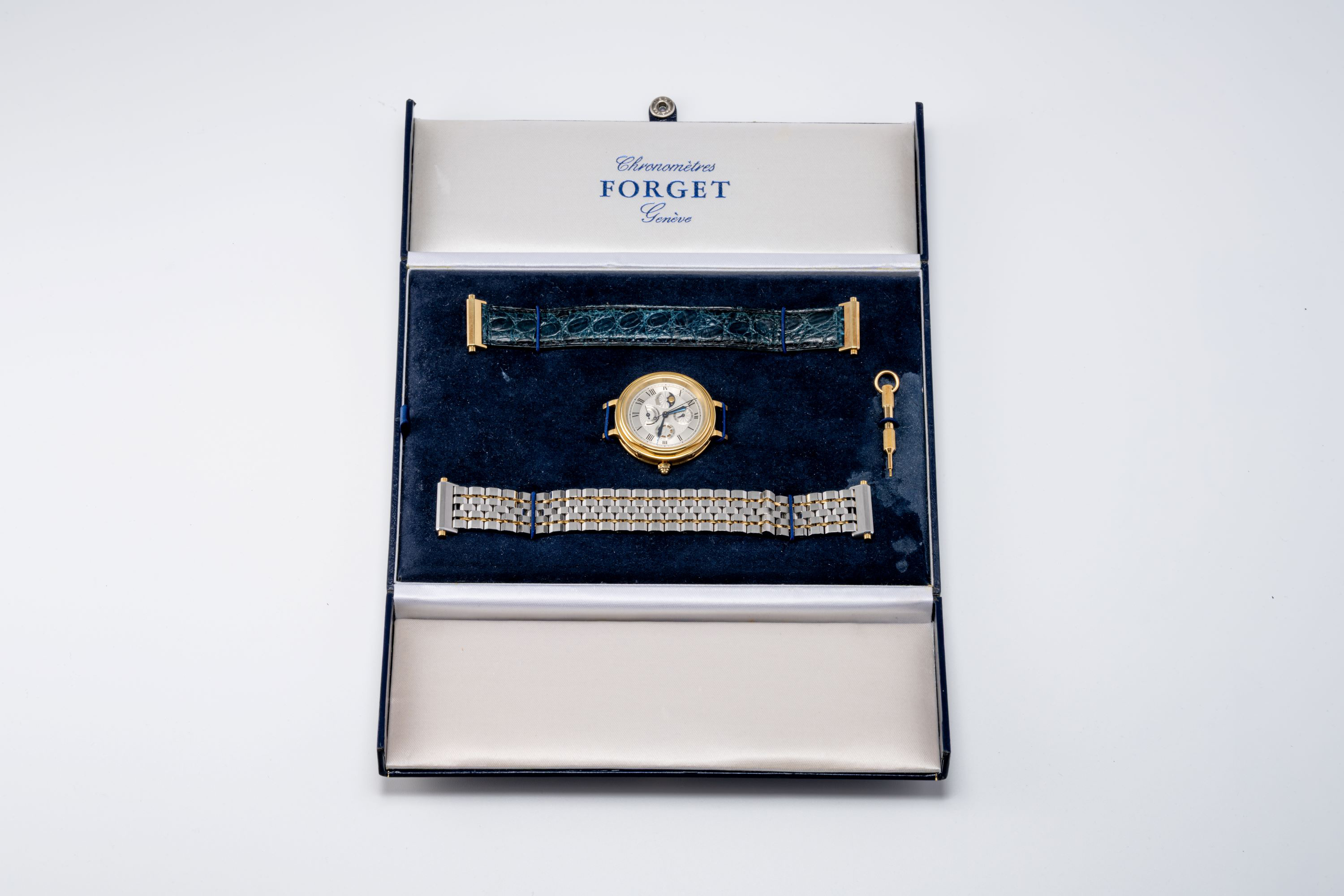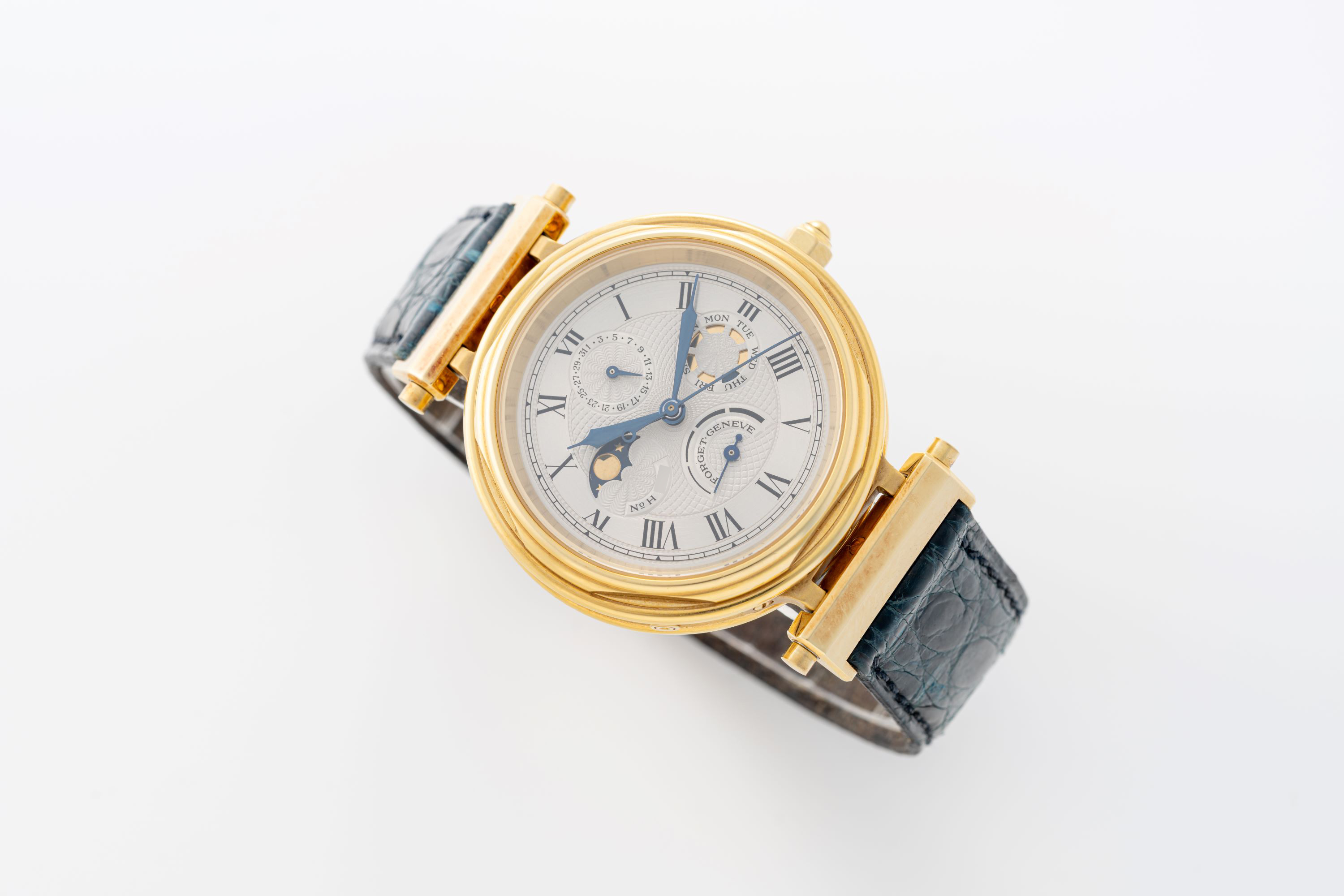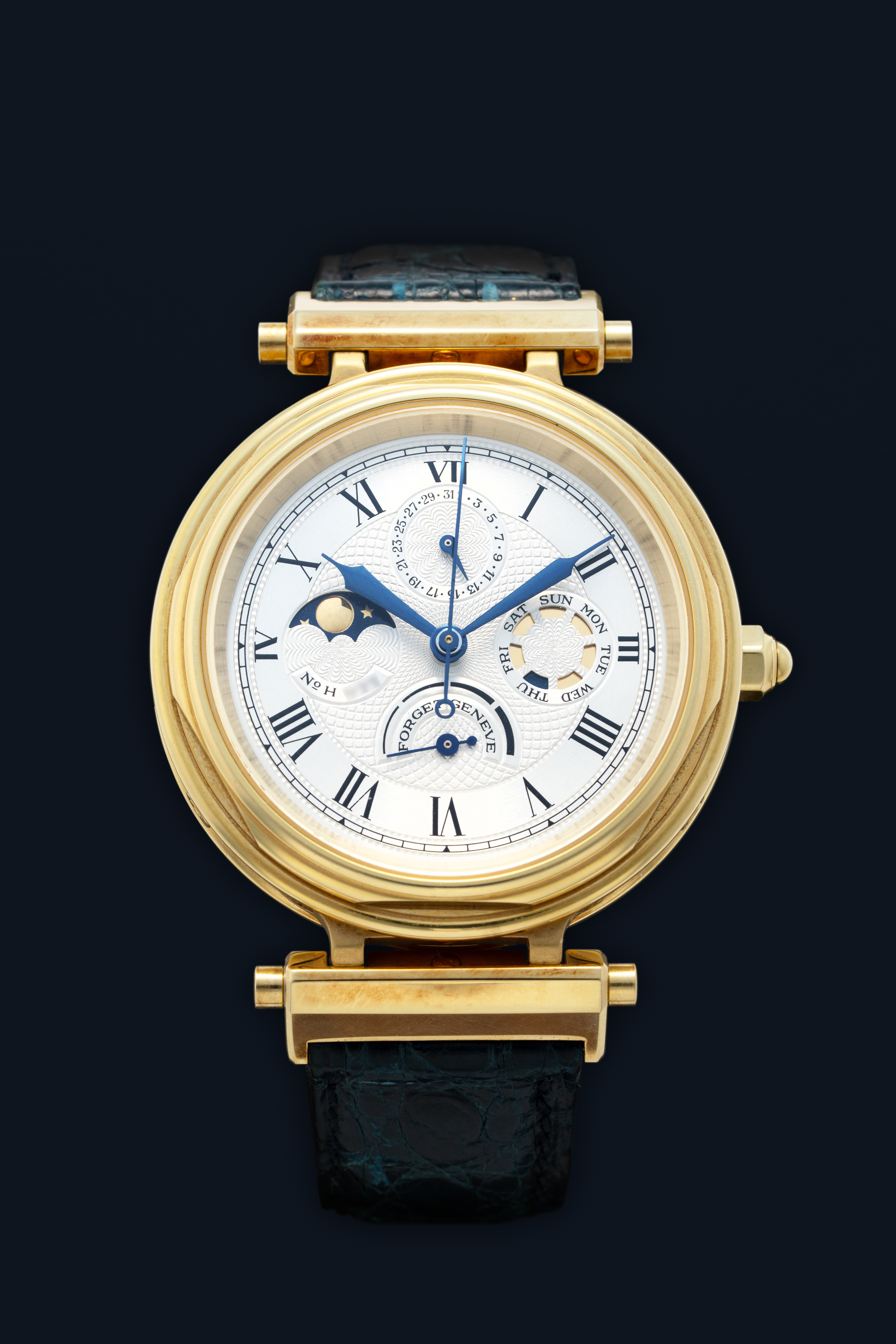 DialSilver guilloche dial with roman numerals, heat-blued hands, moonphase at 9 o'clock, date at 12 o'clock, day at 3 o'clock, power reserve at 6 o'clock