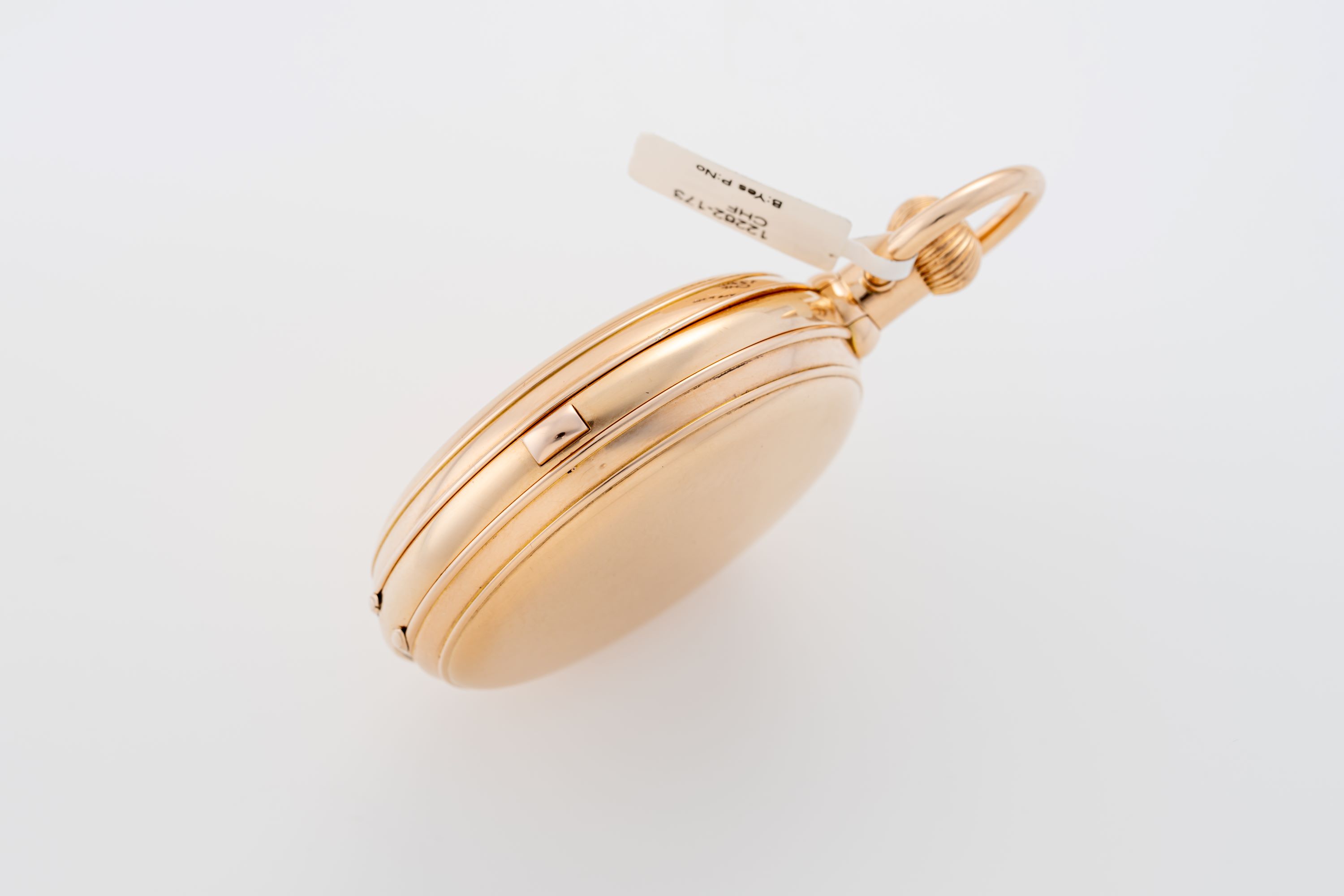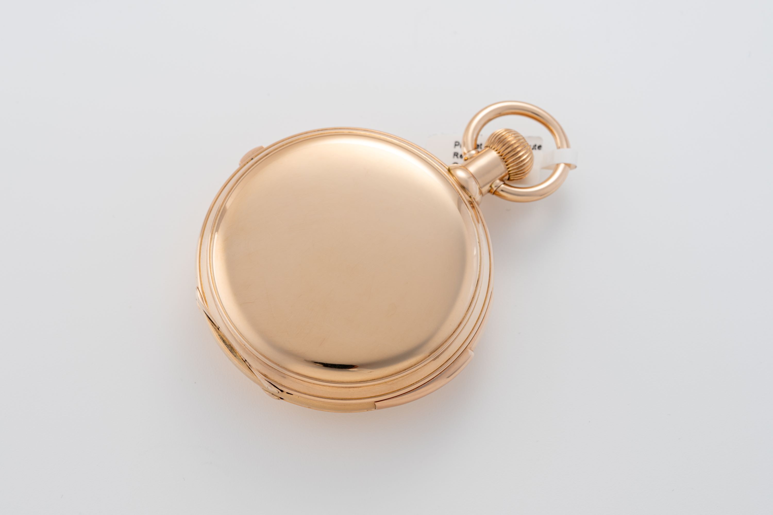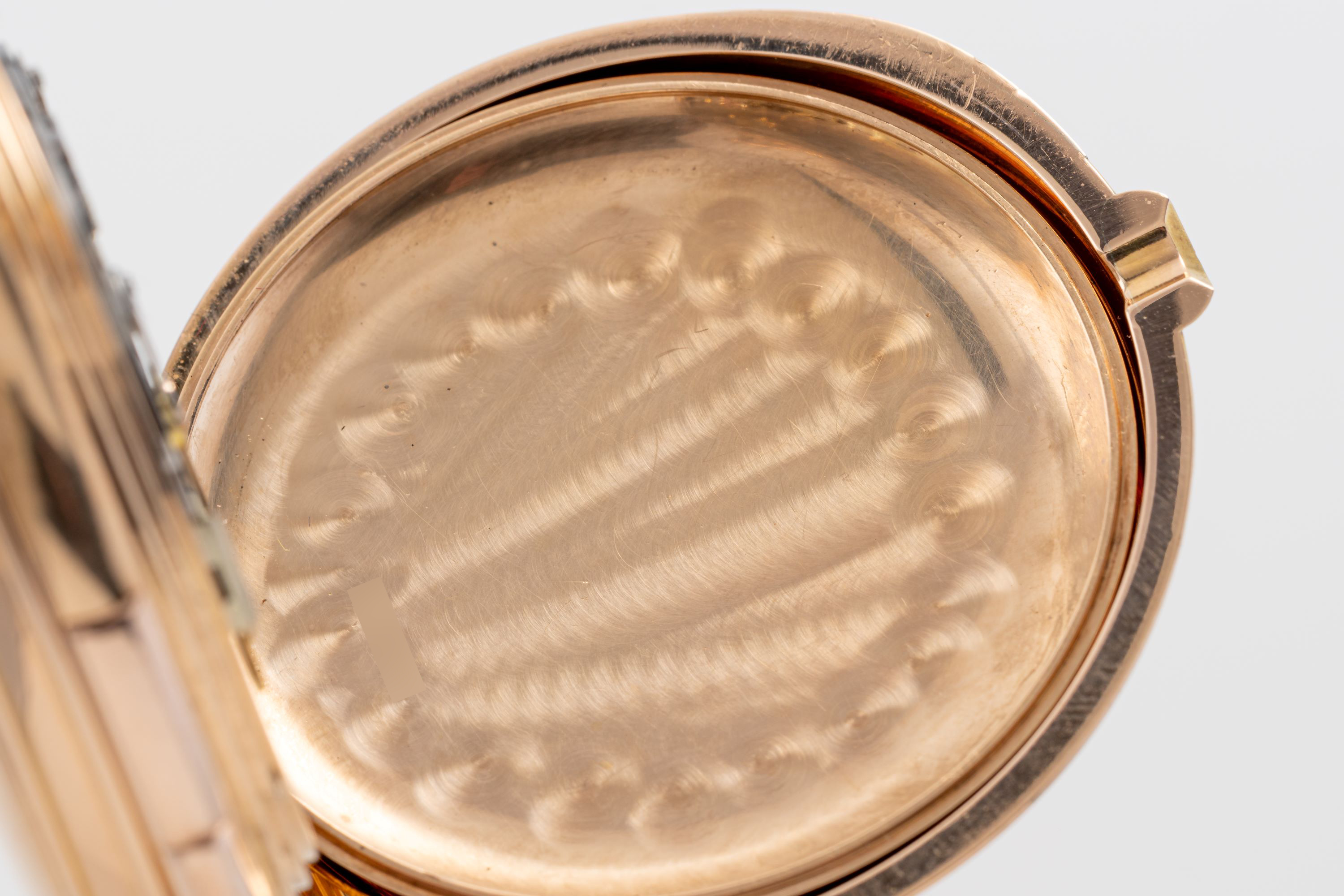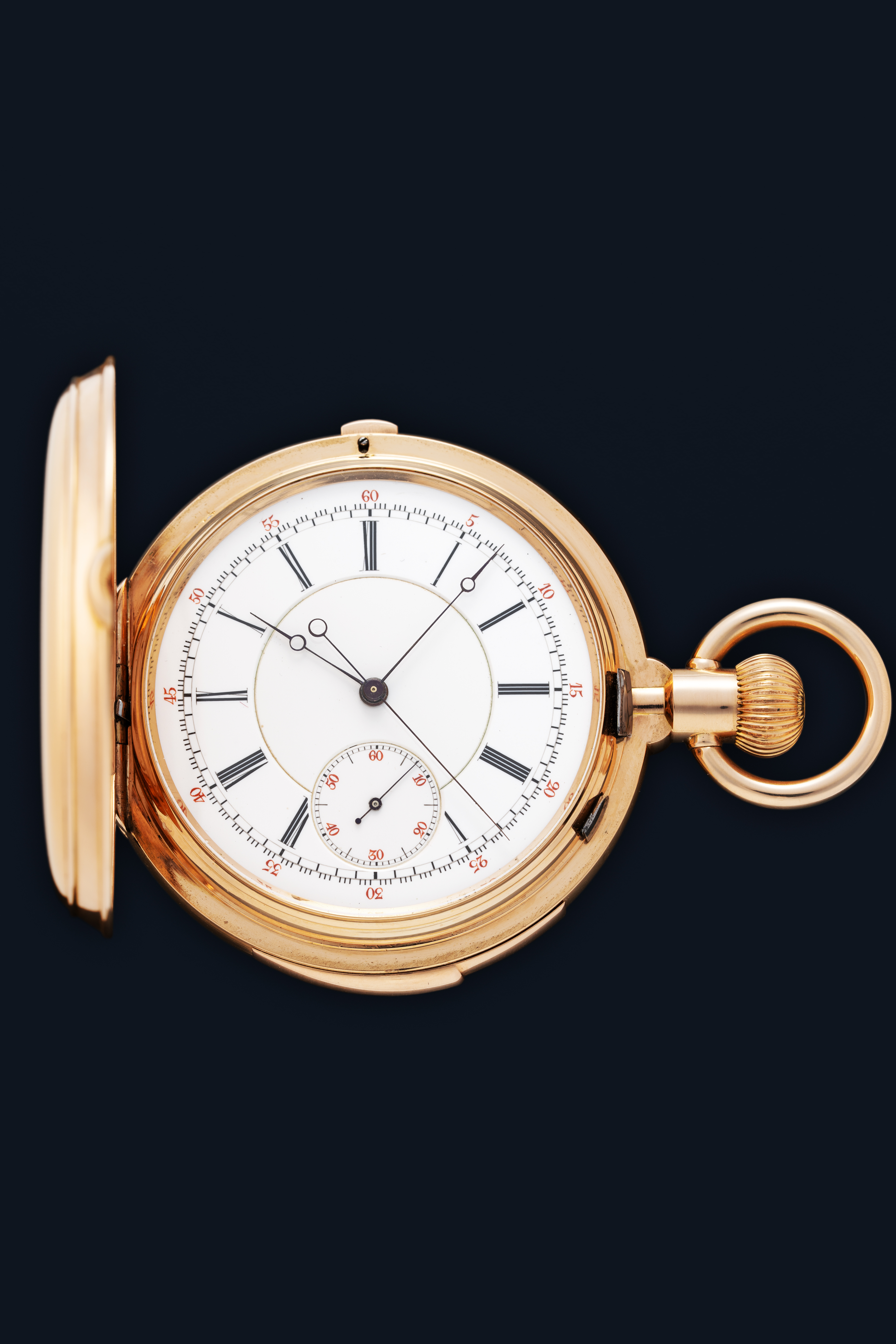 CaseRound case in 18k rose gold with chain loop and winding crown at 3 o'clock, spring-loaded front lid, double back lid, chronograph pusher at 12 o'clock