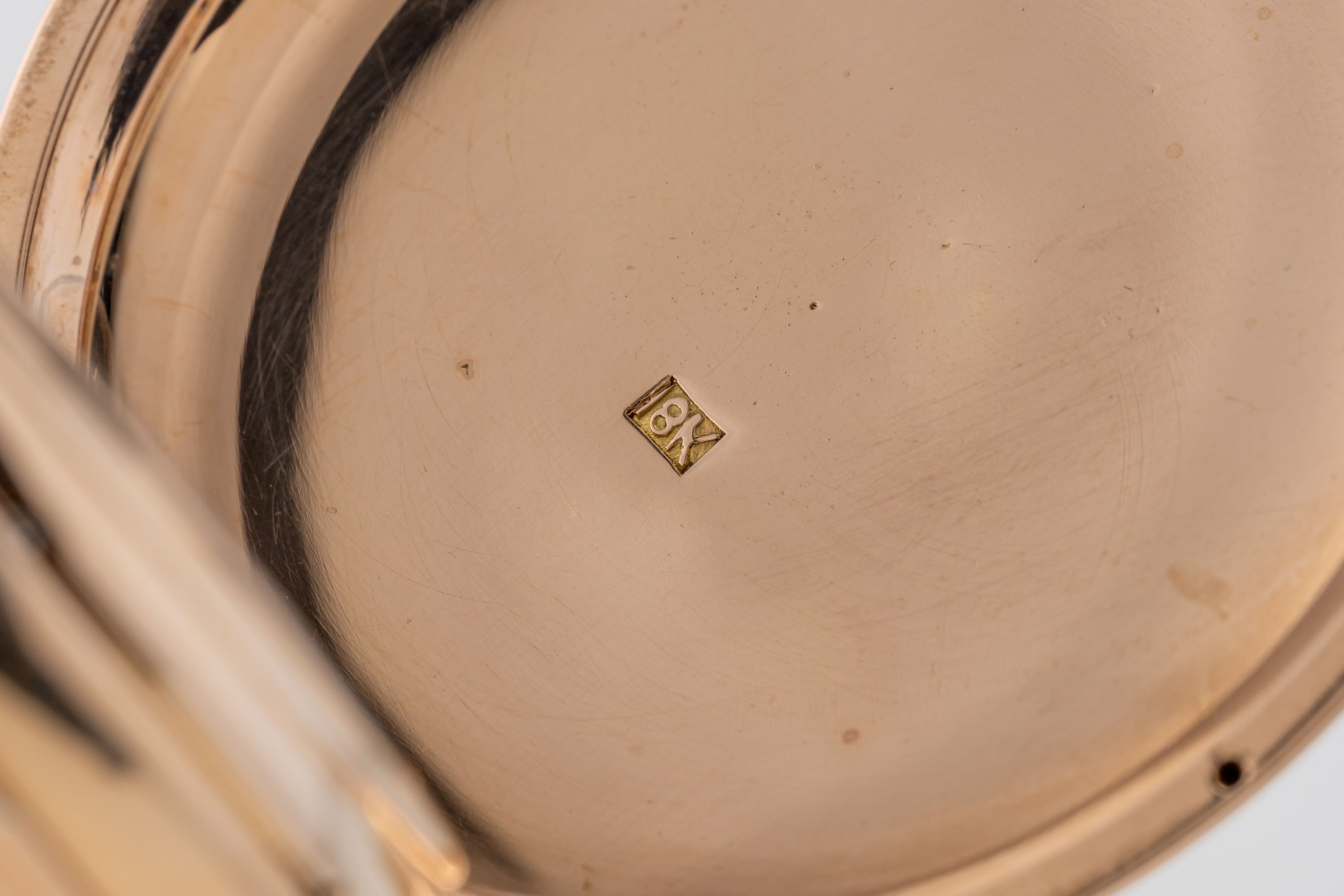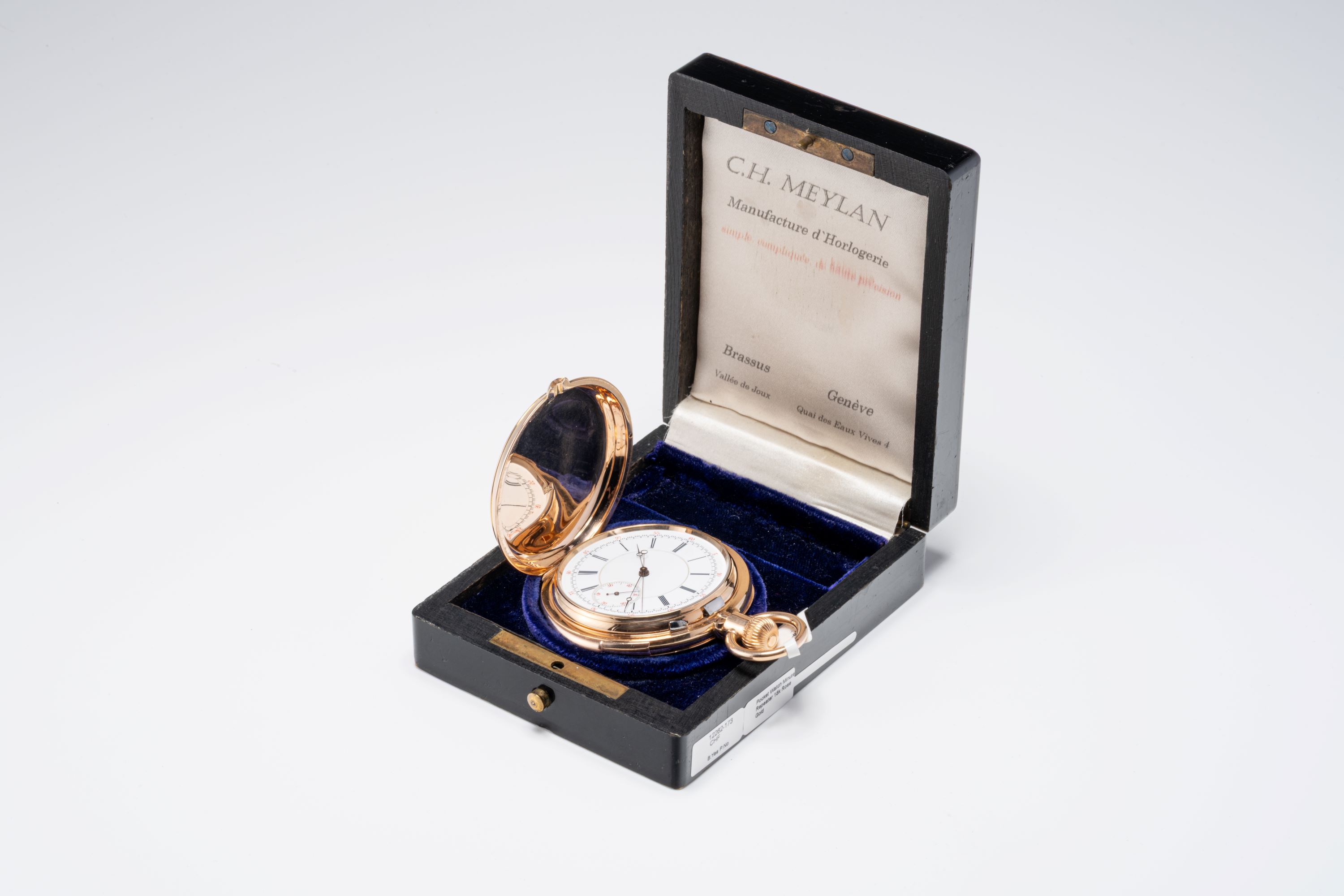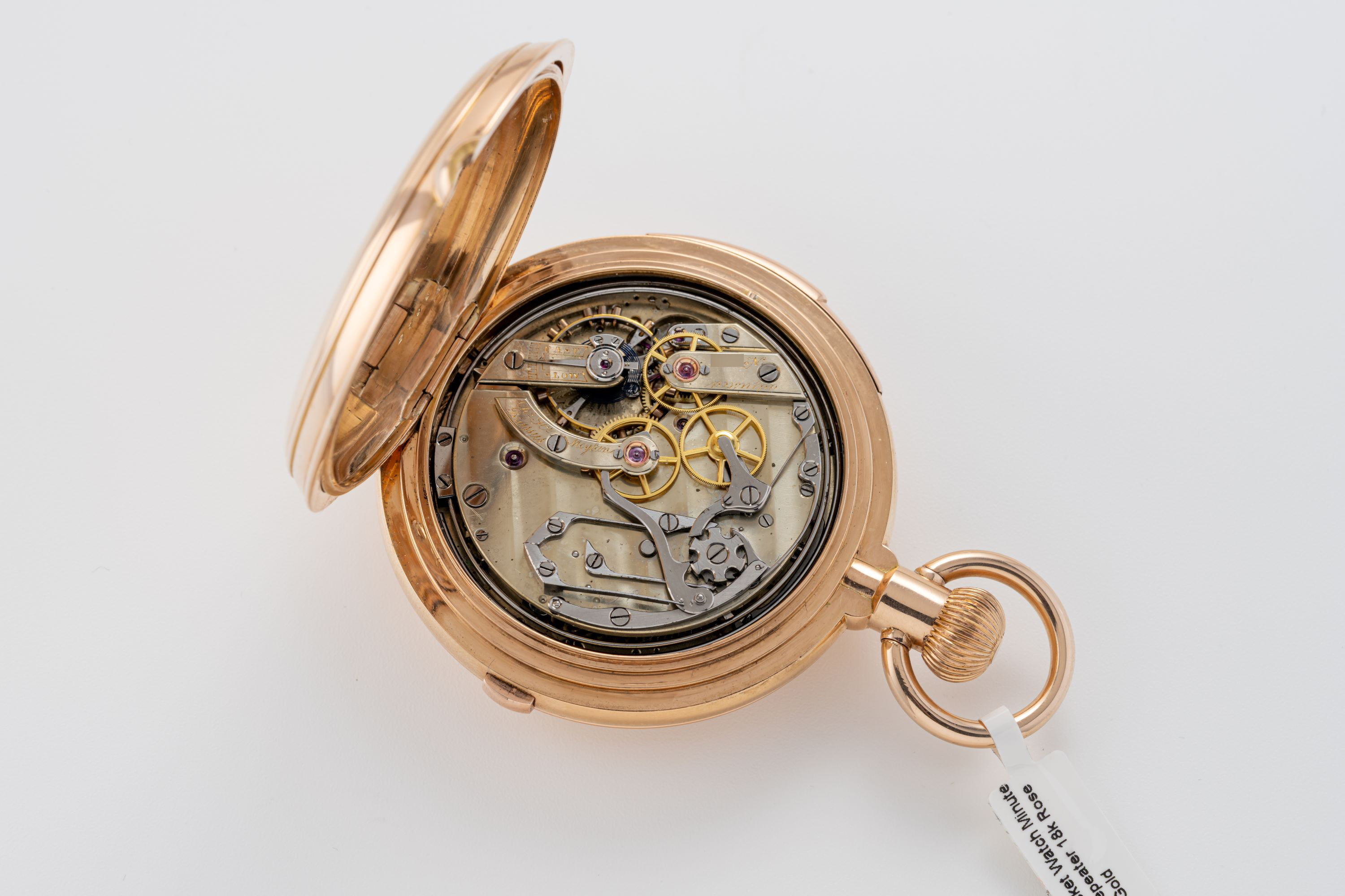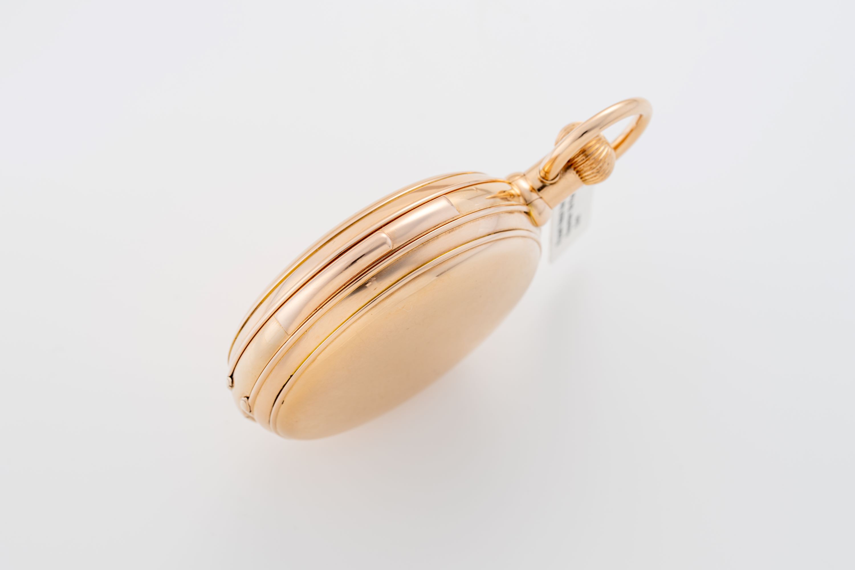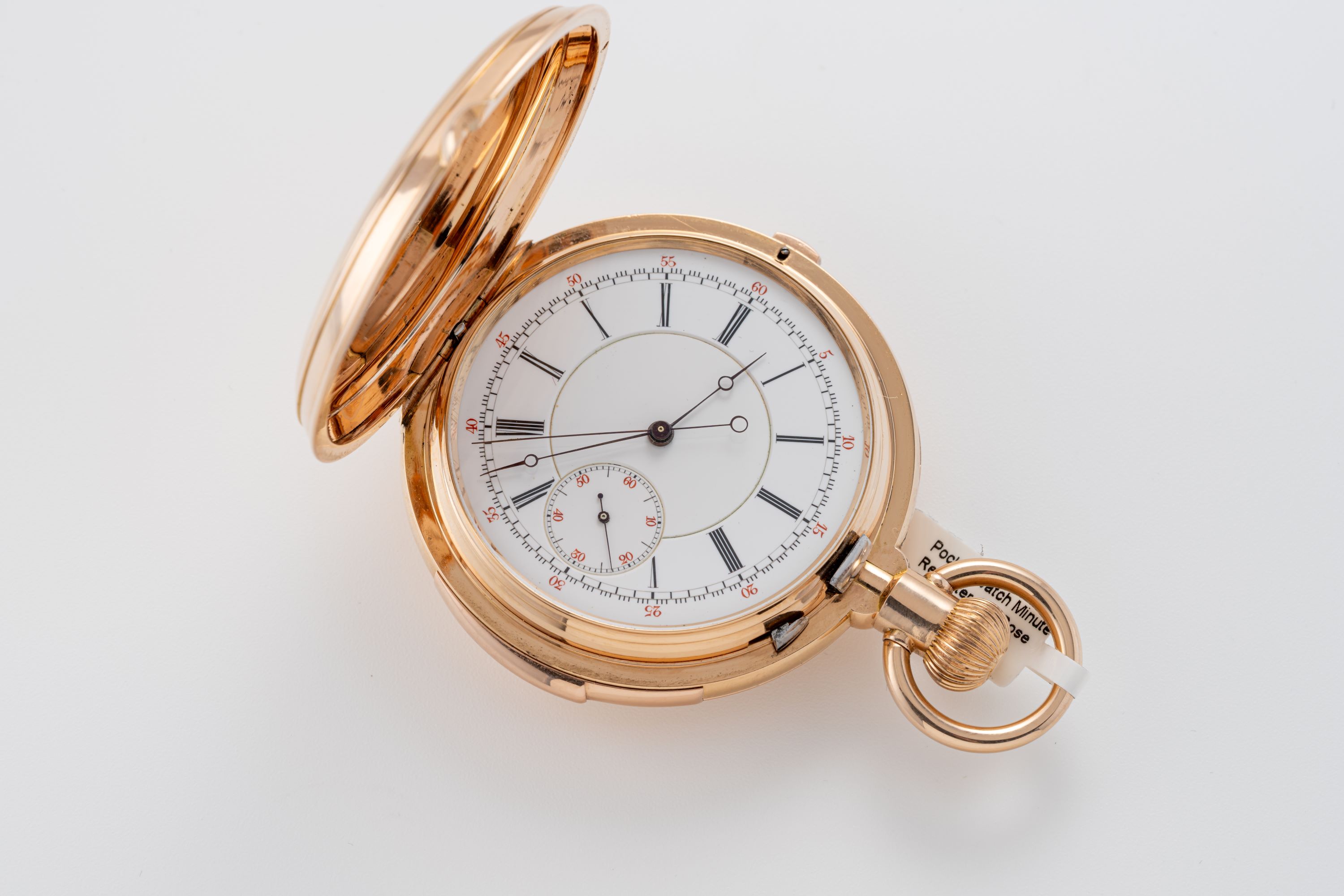 CaseRound case in 18k rose gold with chain loop and winding crown at 3 o'clock, spring-loaded front lid, double back lid, chronograph pusher at 12 o'clock