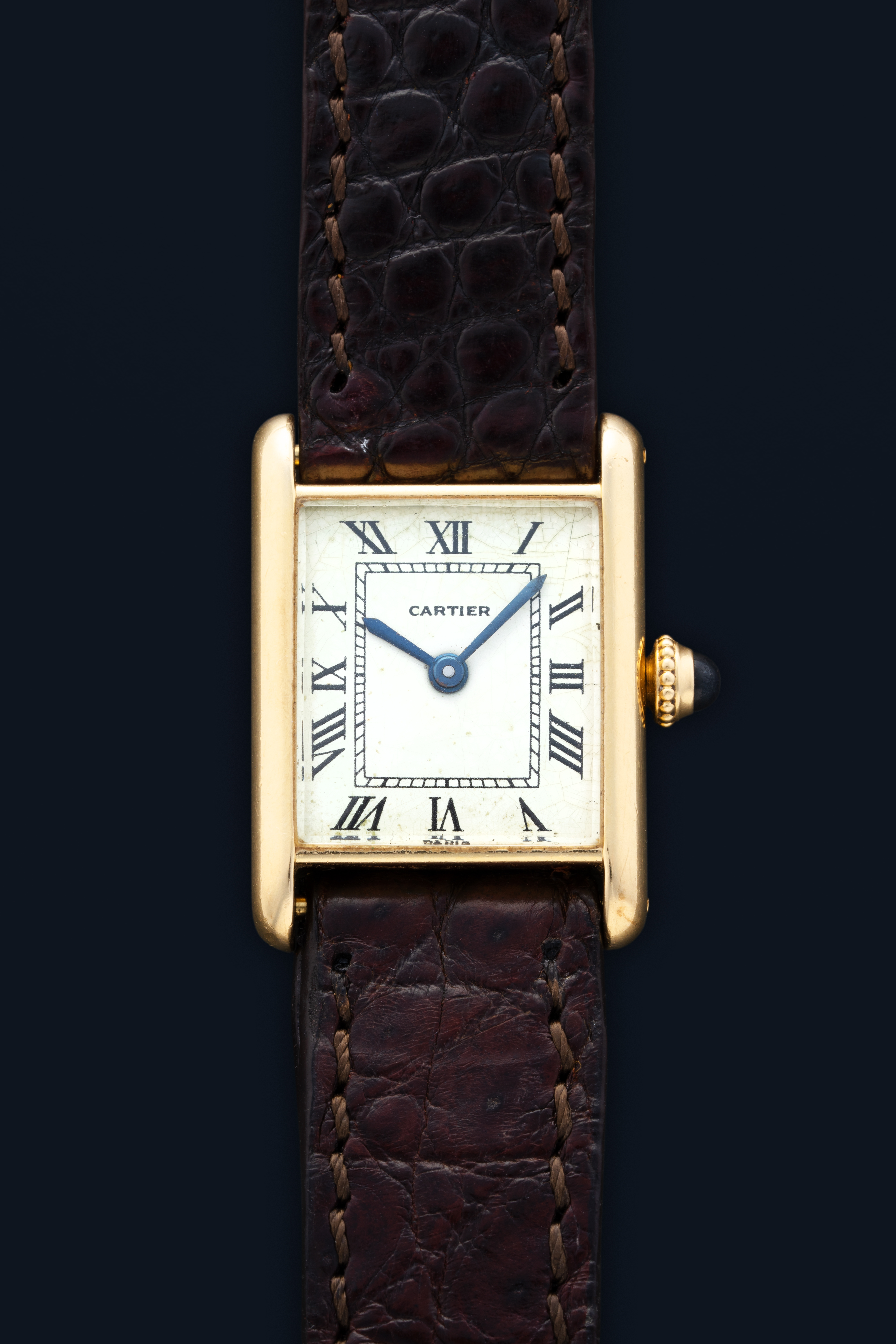 DialCream-white lacquer dial with roman numerals, heat-blued sword hands, signed 'Cartier' at 12 o'clock