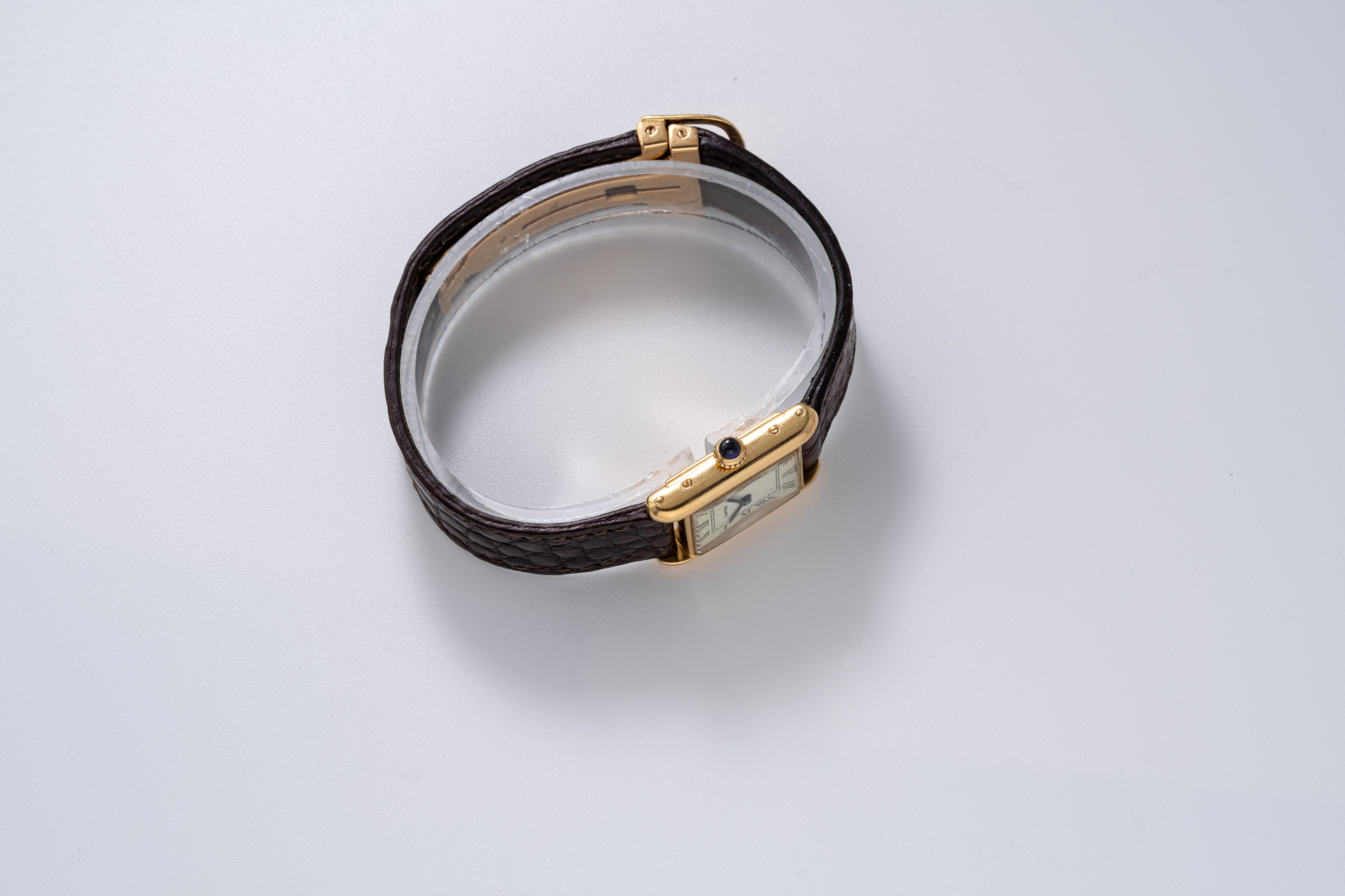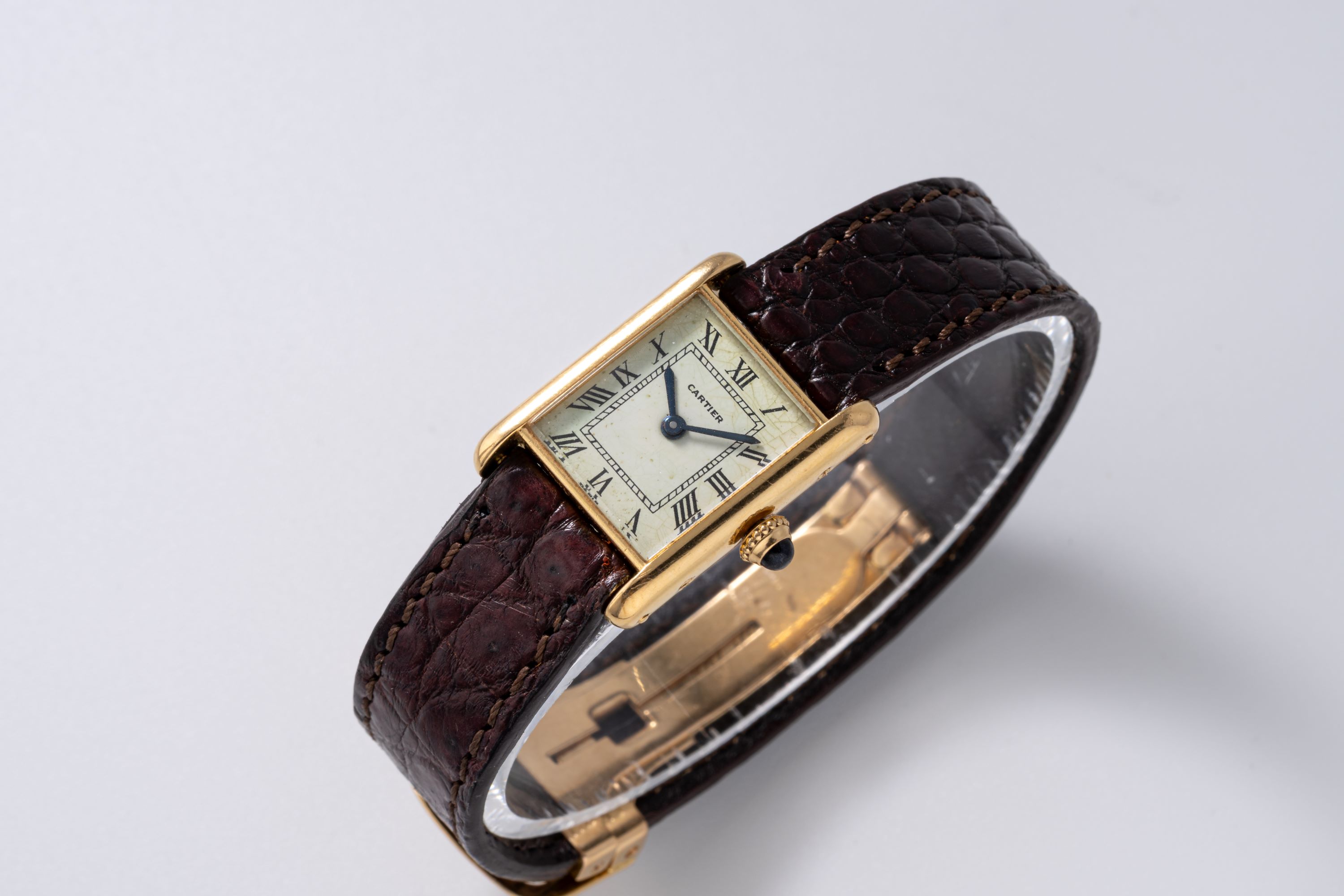 StrapBrown alligator leather strap with Cartier deployant clasp in 18k yellow gold, fitting wrist circumference for this strap: 17.5cm