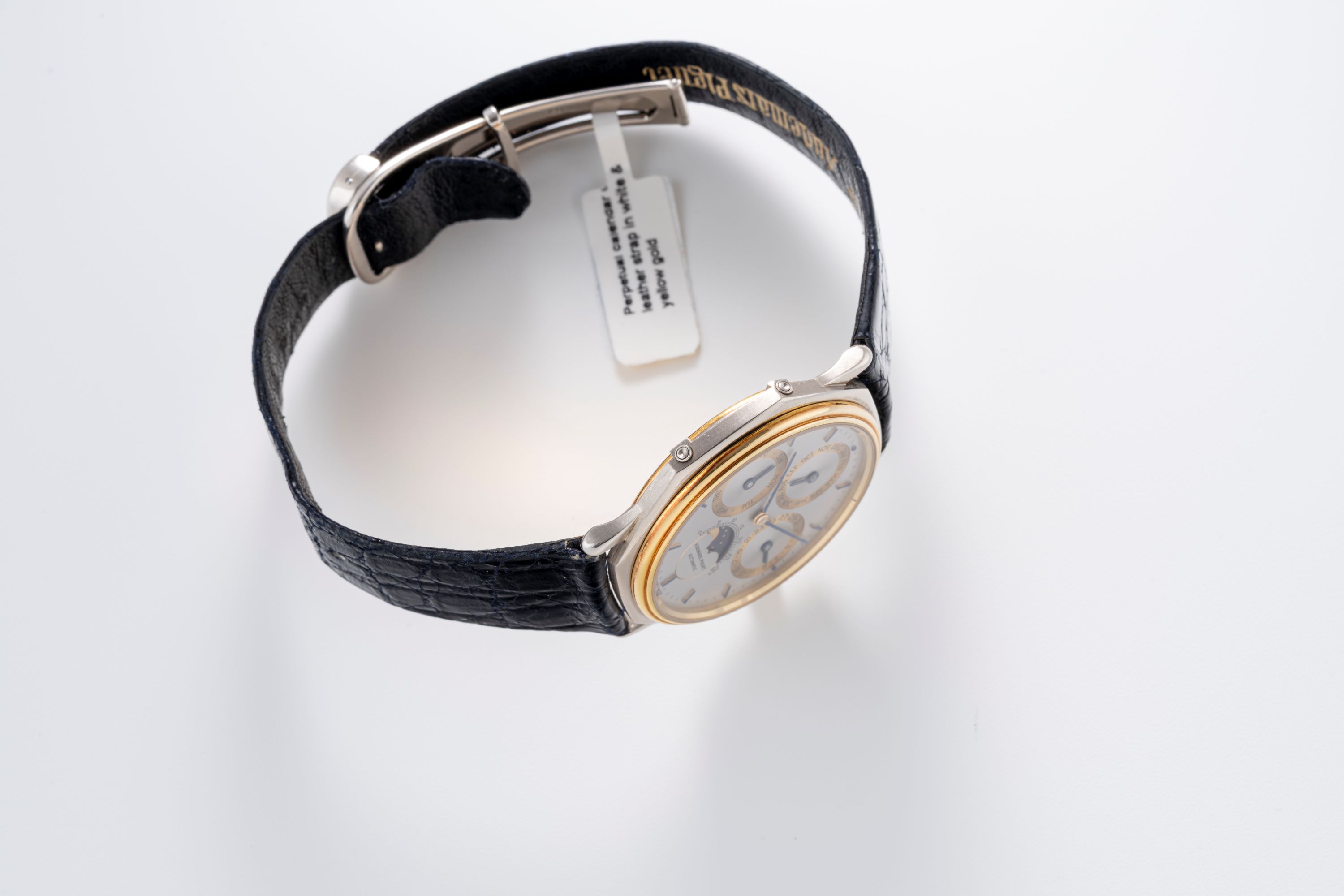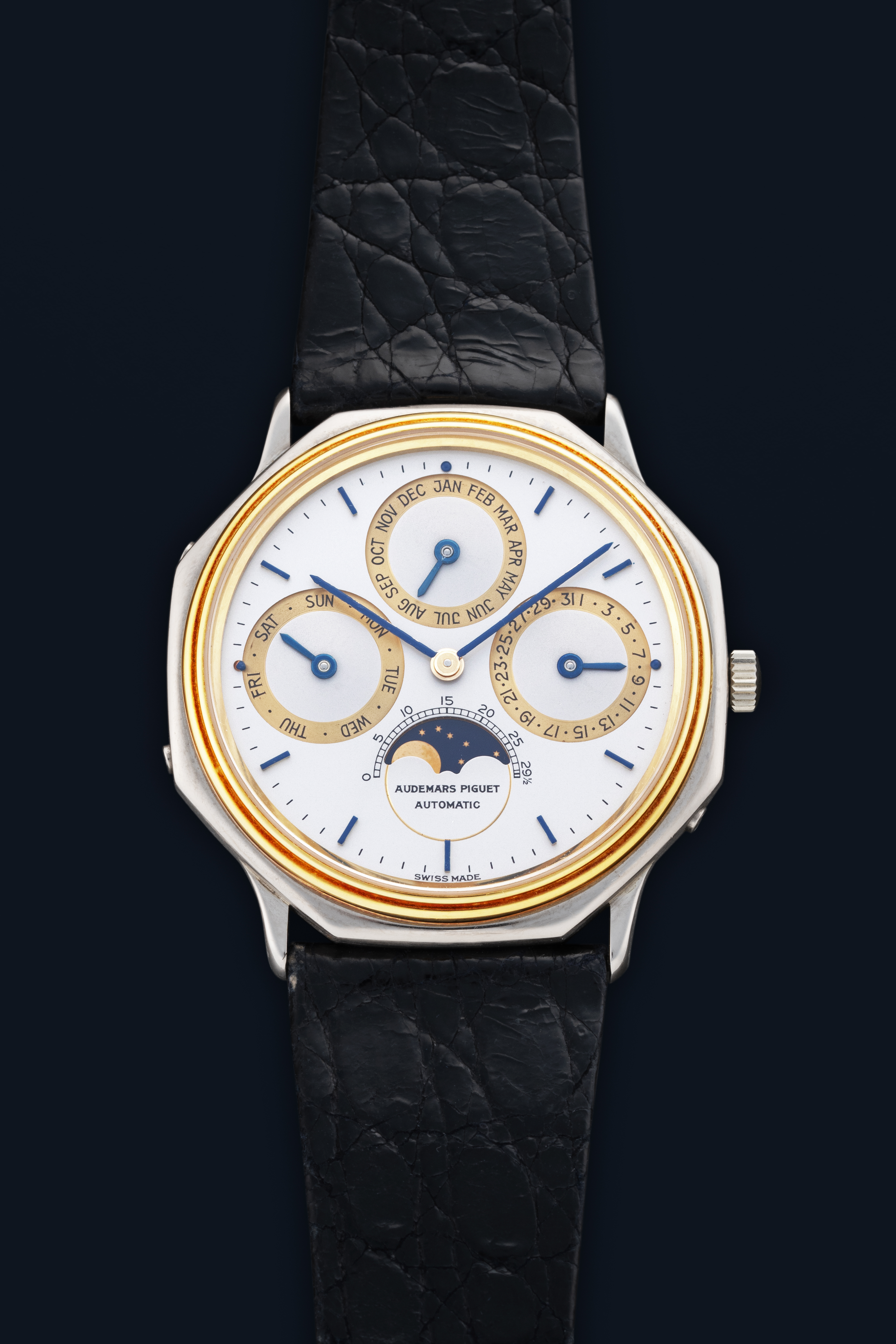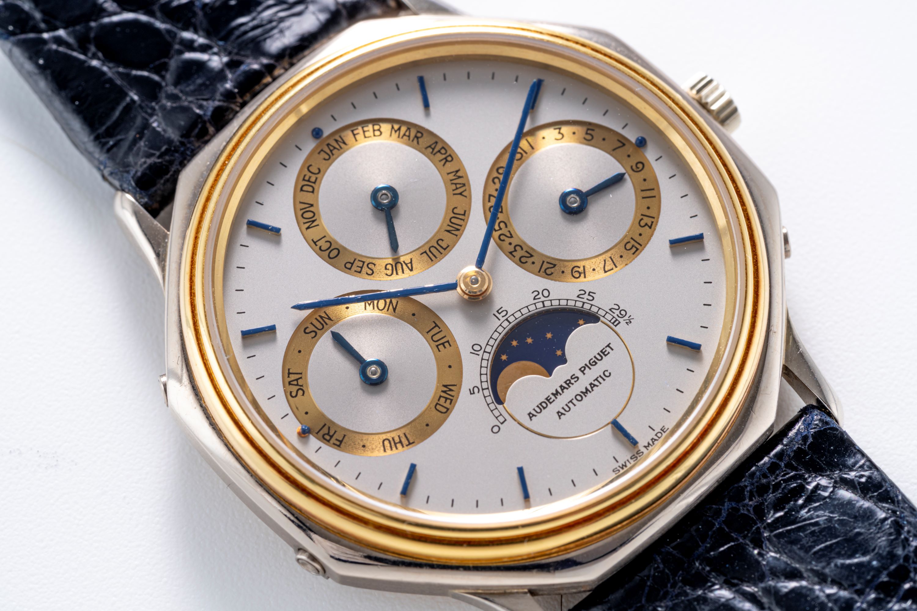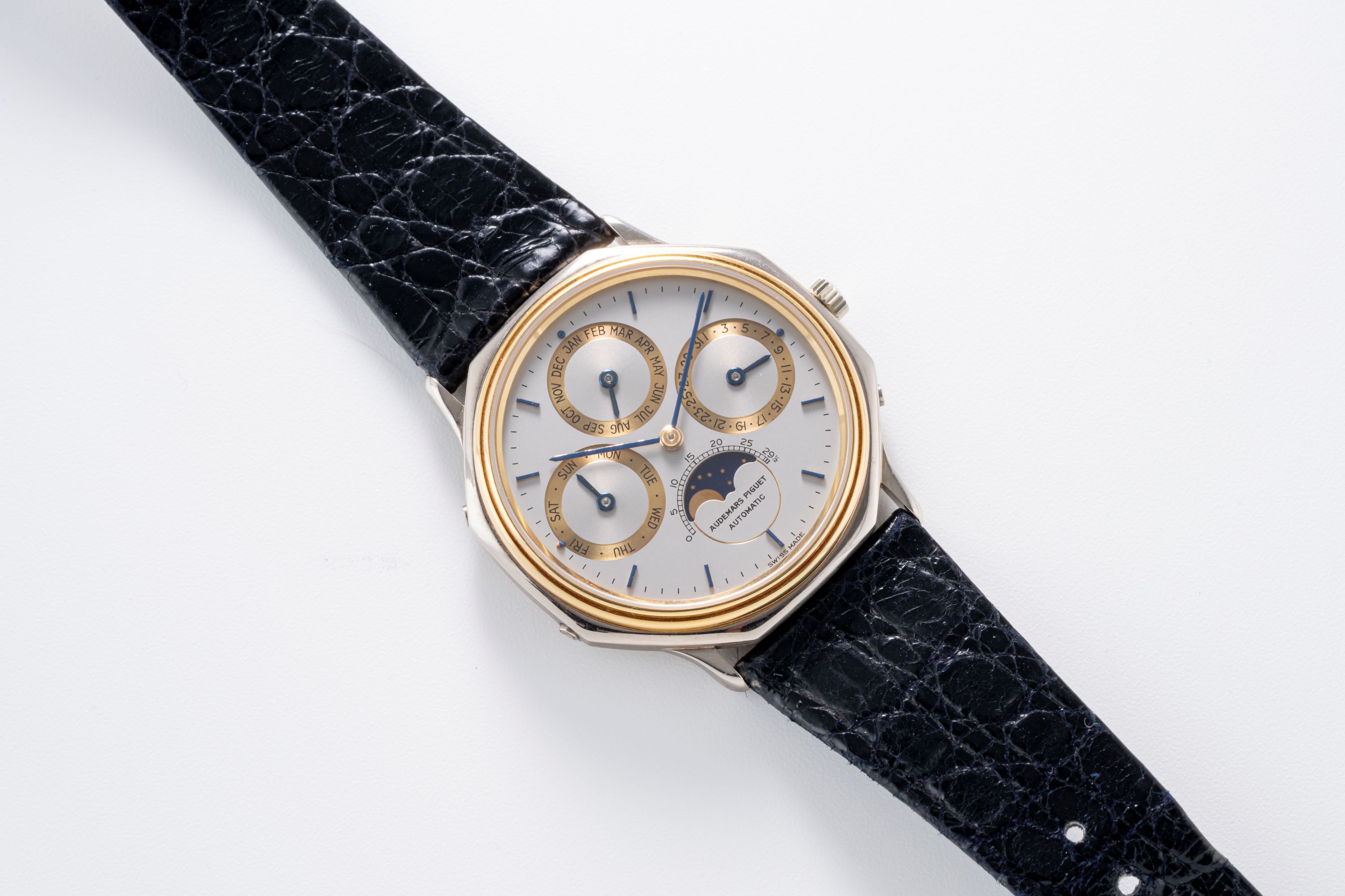 DialSilver dial with gold accents, applied indices, blue hands, moonphase at 6 o'clock, day at 9 o'clock, month at 12 o'clock, date at 3 o'clock, signed 'Audemars Piguet' at 6 o'clock
