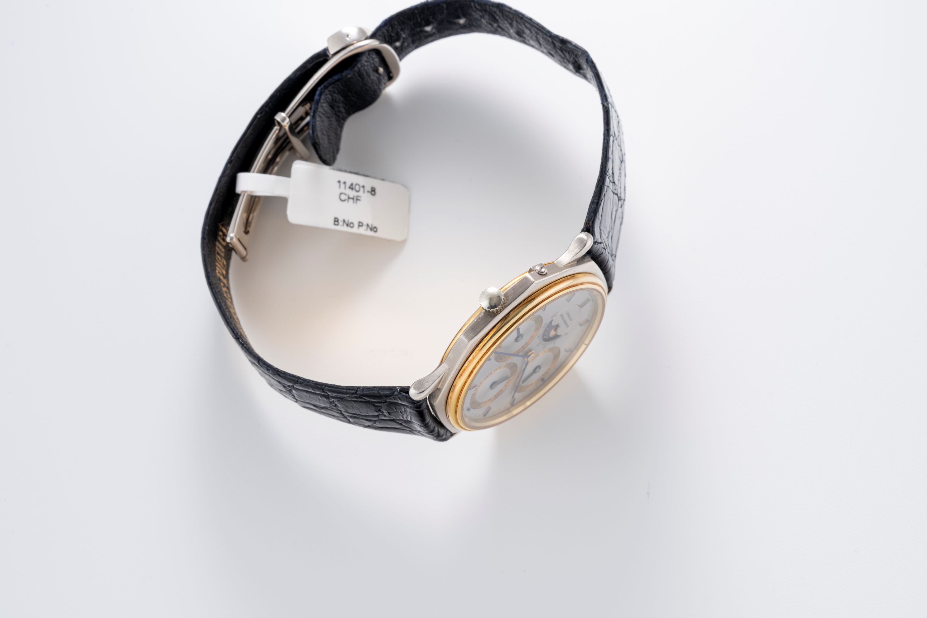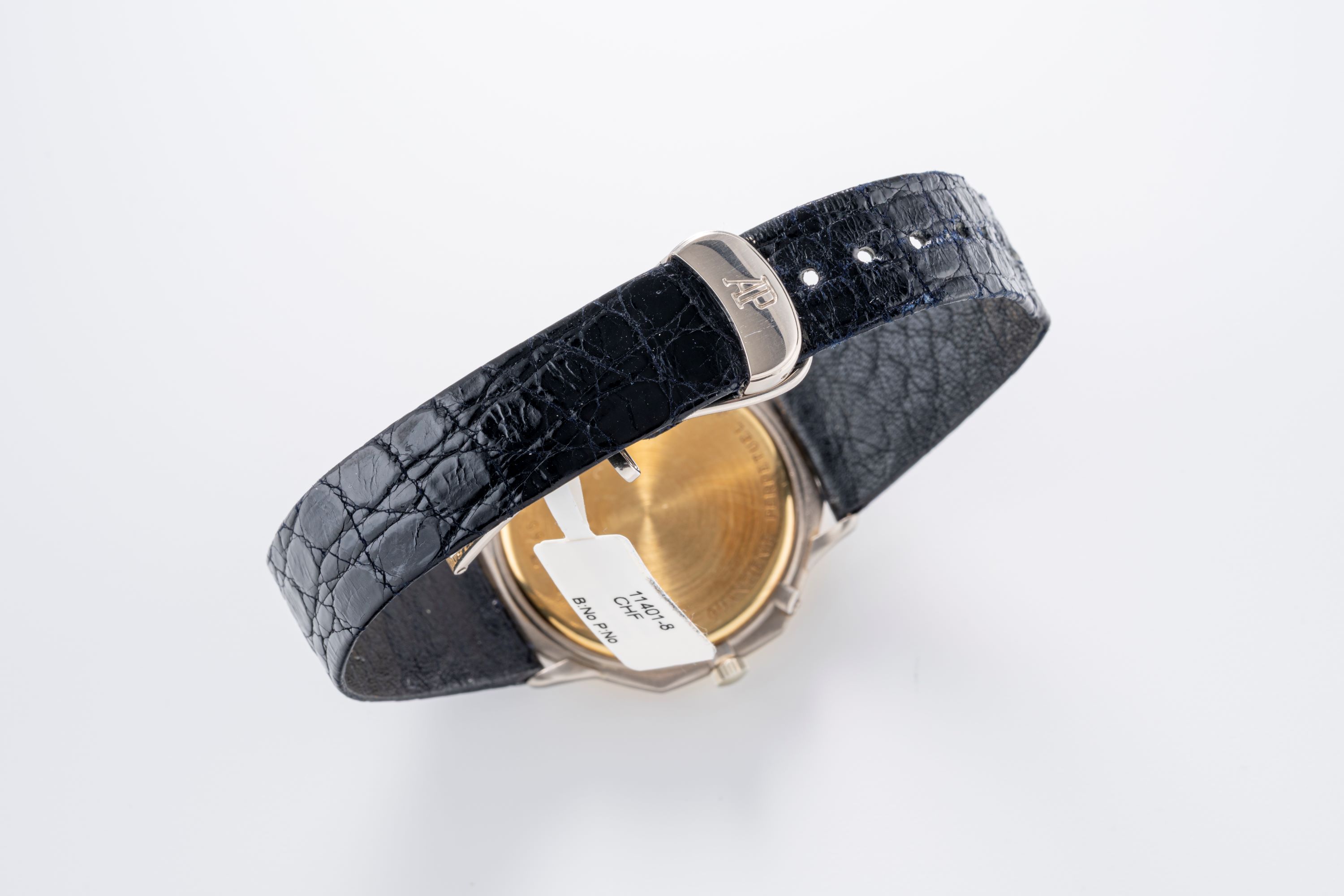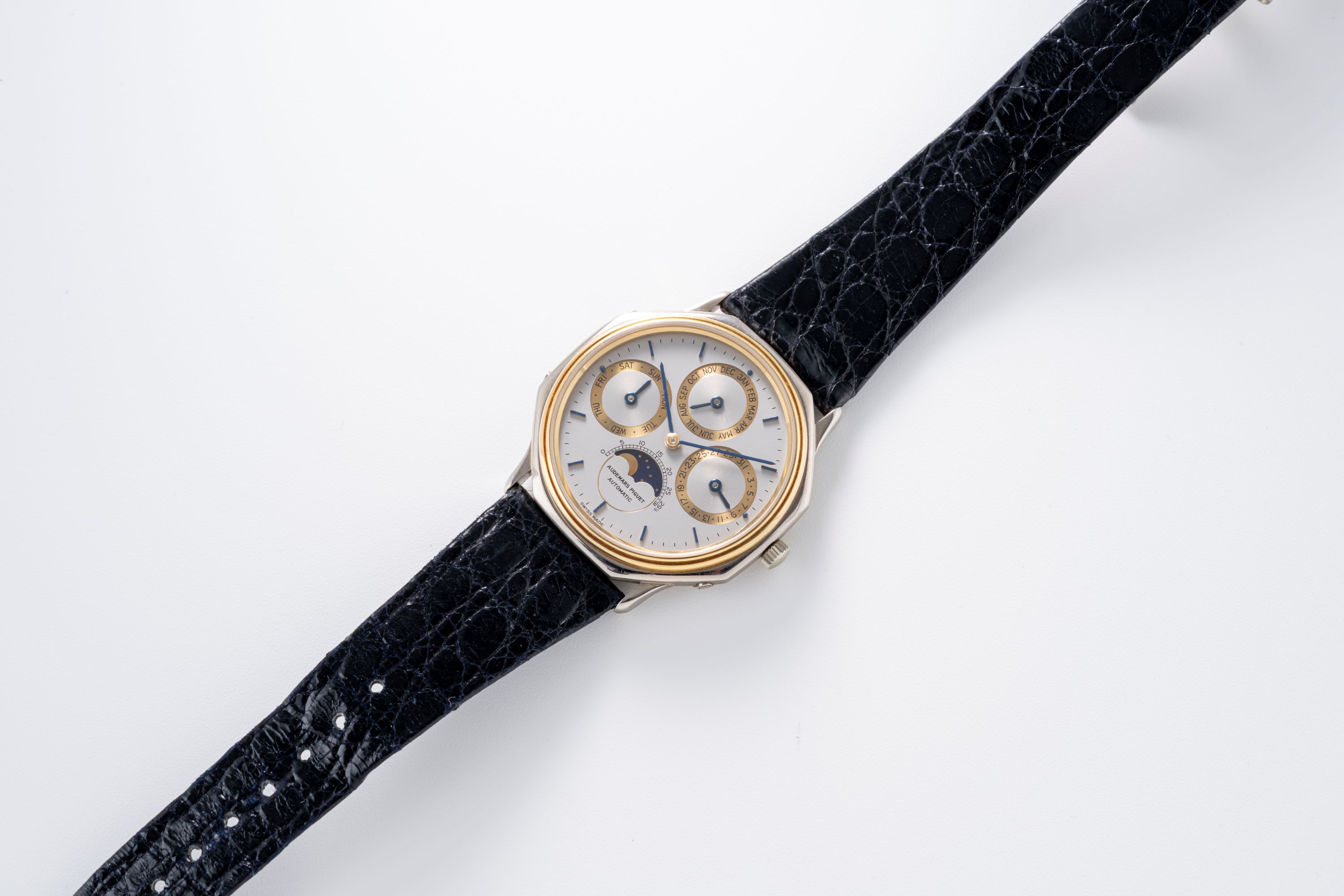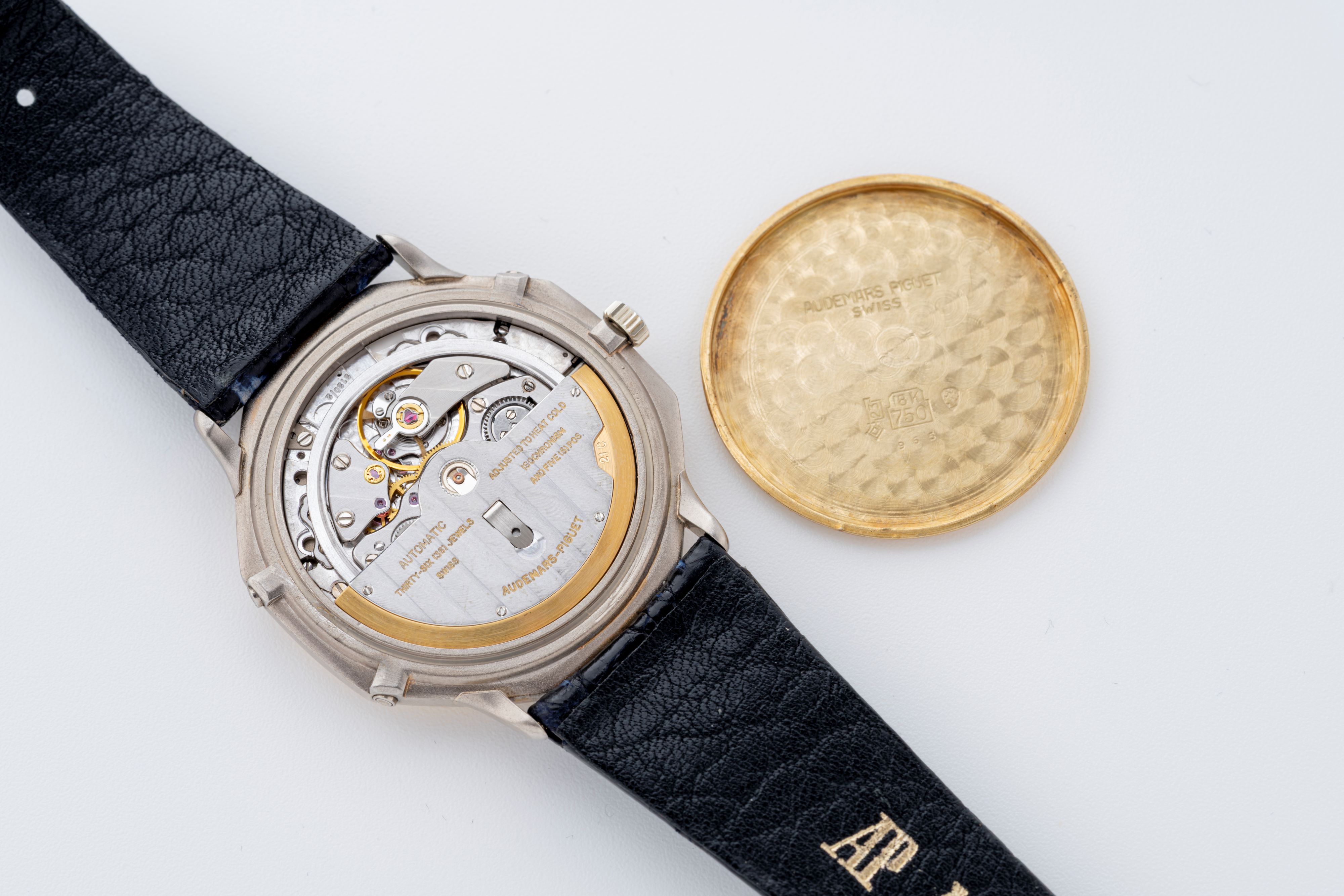 DialSilver dial with gold accents, applied indices, blue hands, moonphase at 6 o'clock, day at 9 o'clock, month at 12 o'clock, date at 3 o'clock, signed 'Audemars Piguet' at 6 o'clock