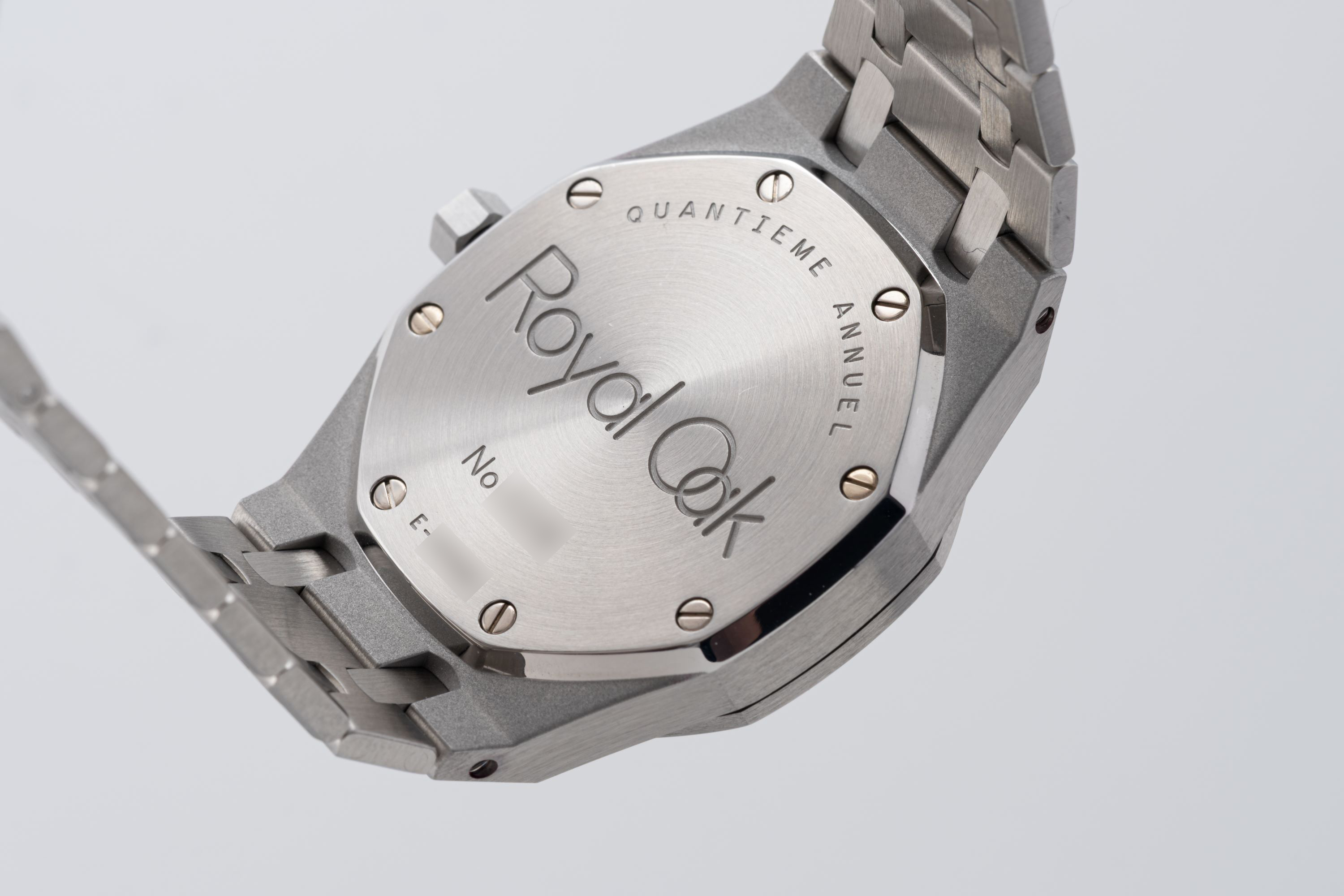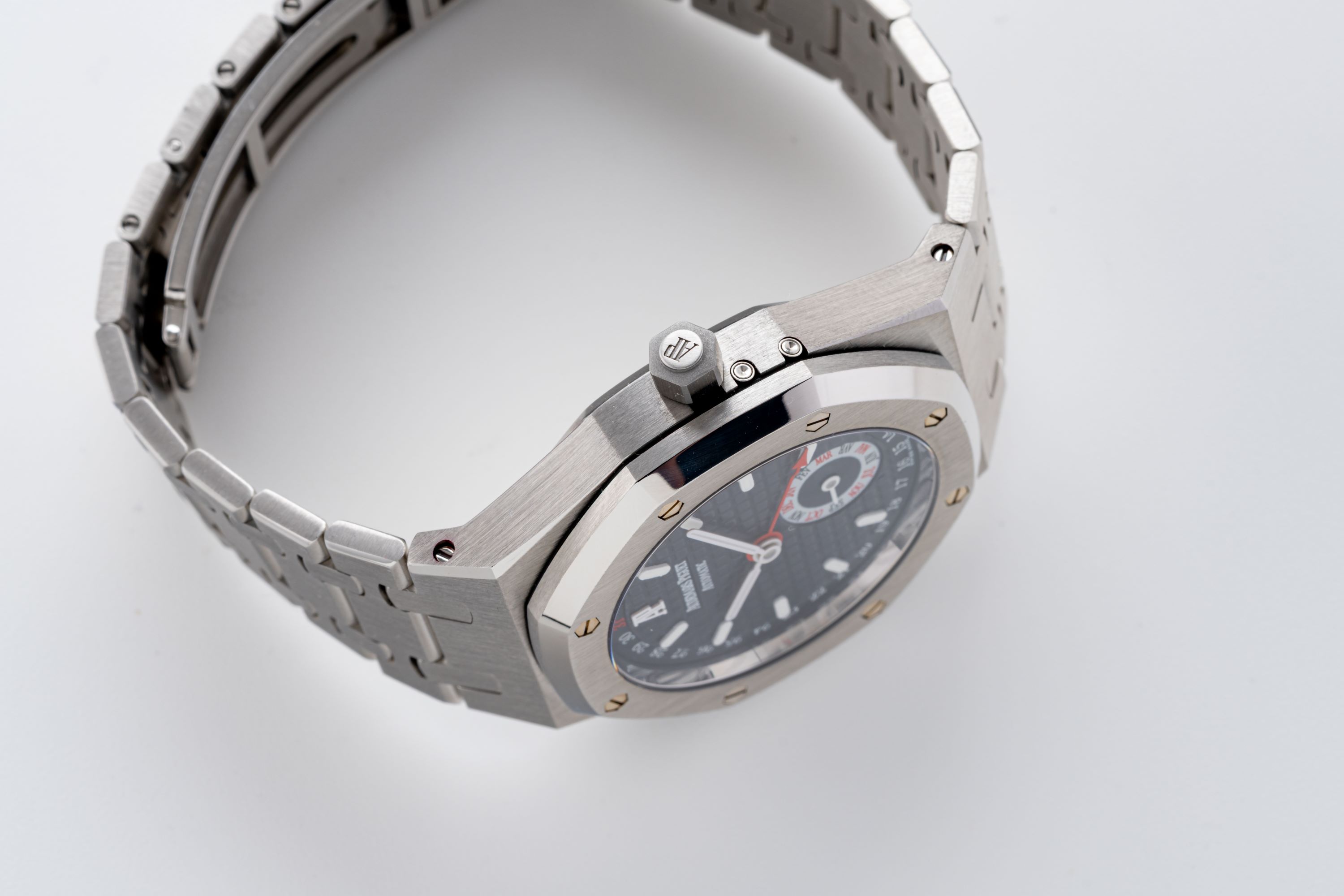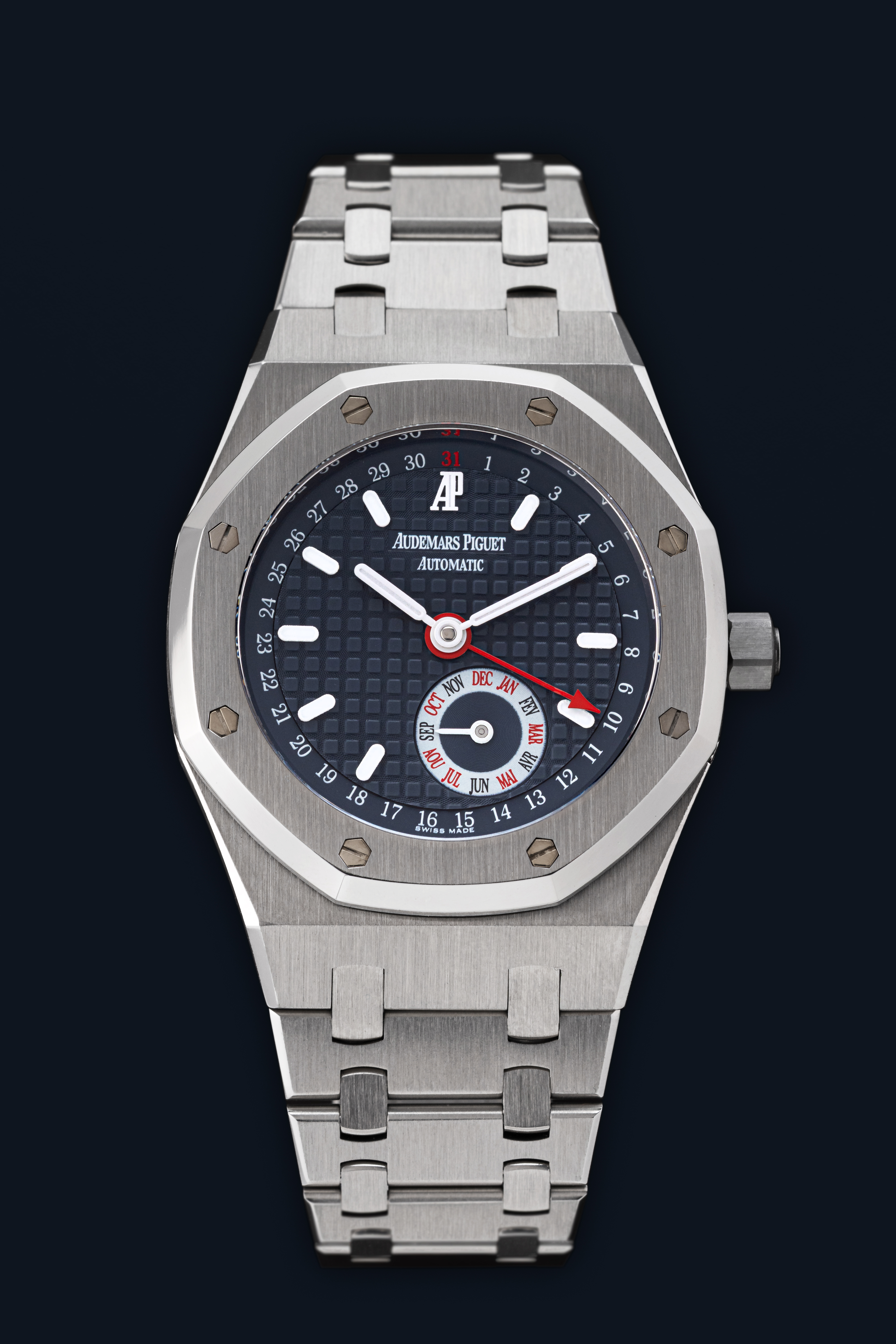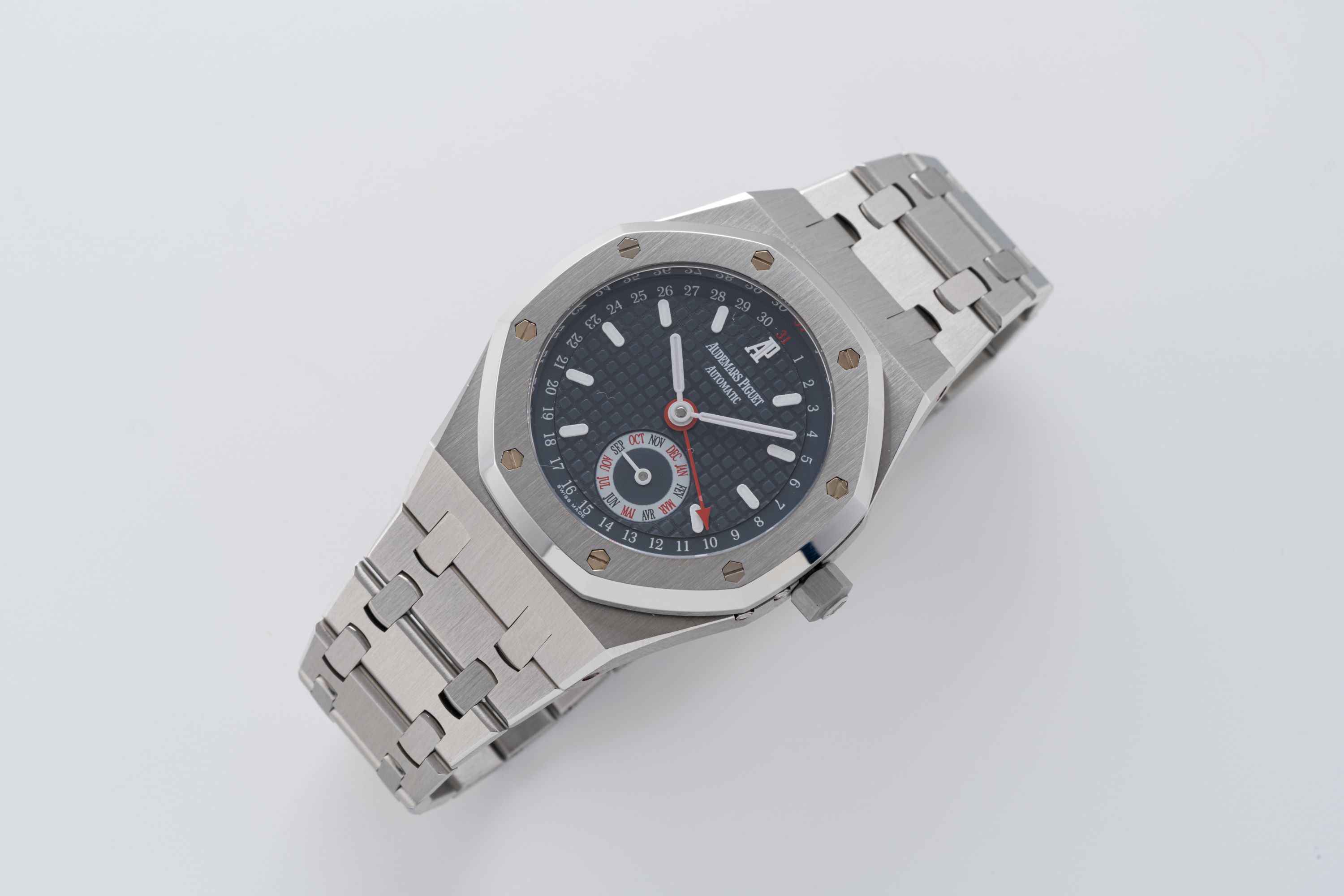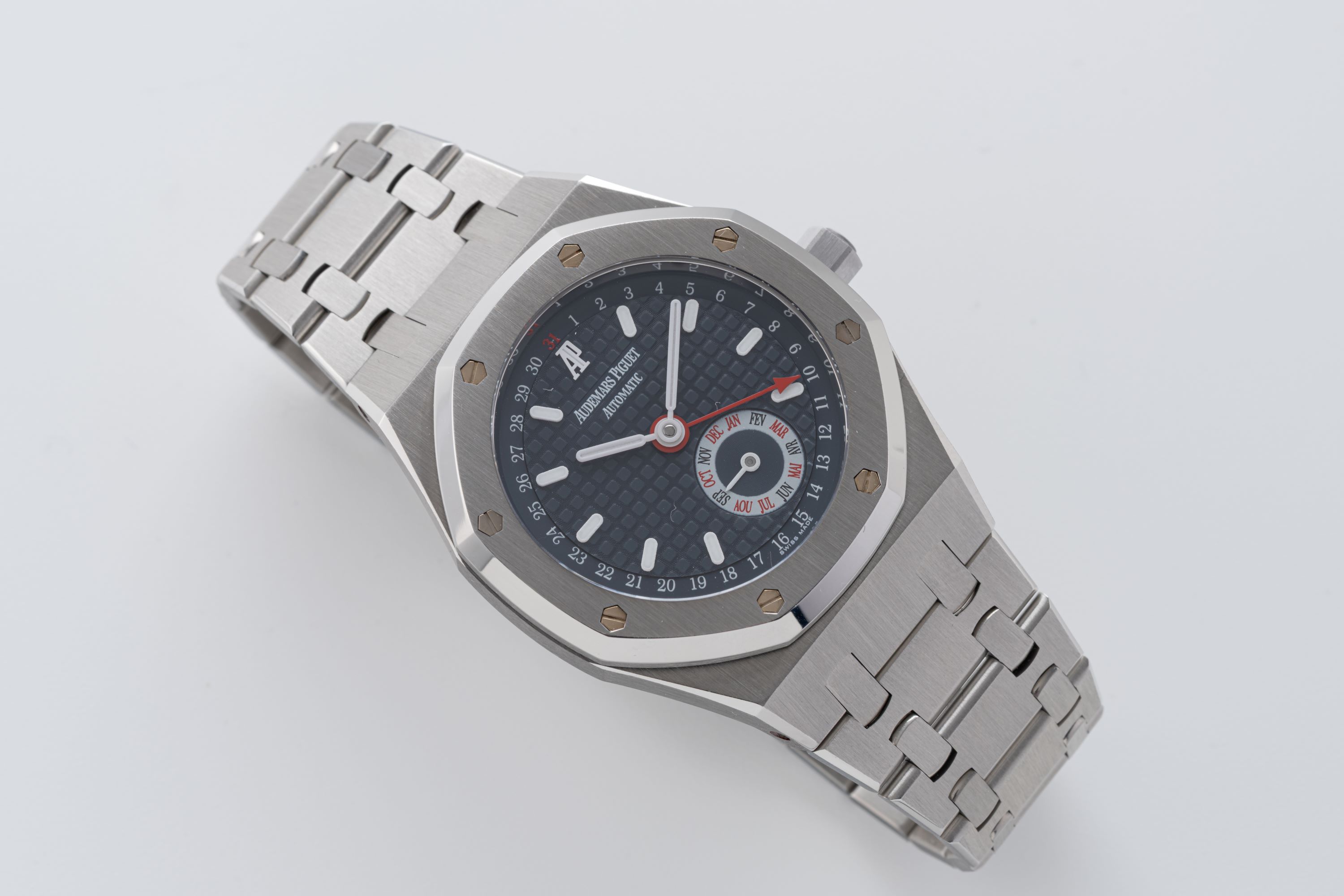DialBlue-grey large tapisserie dial with white applied luminous indices, luminous hands, pointer date, month at 5 o'clock, signed 'Audemars Piguet' at 12 o'clock