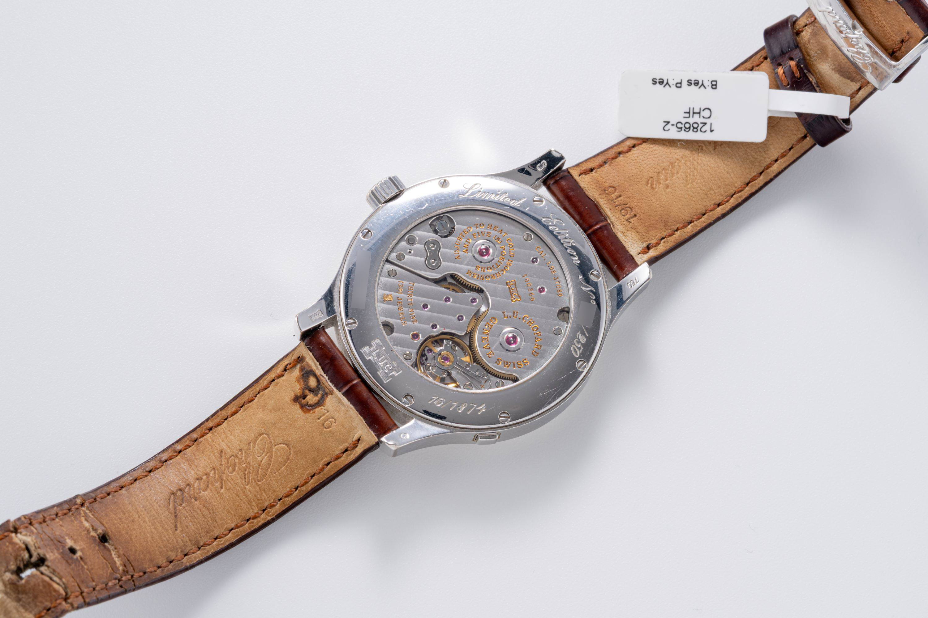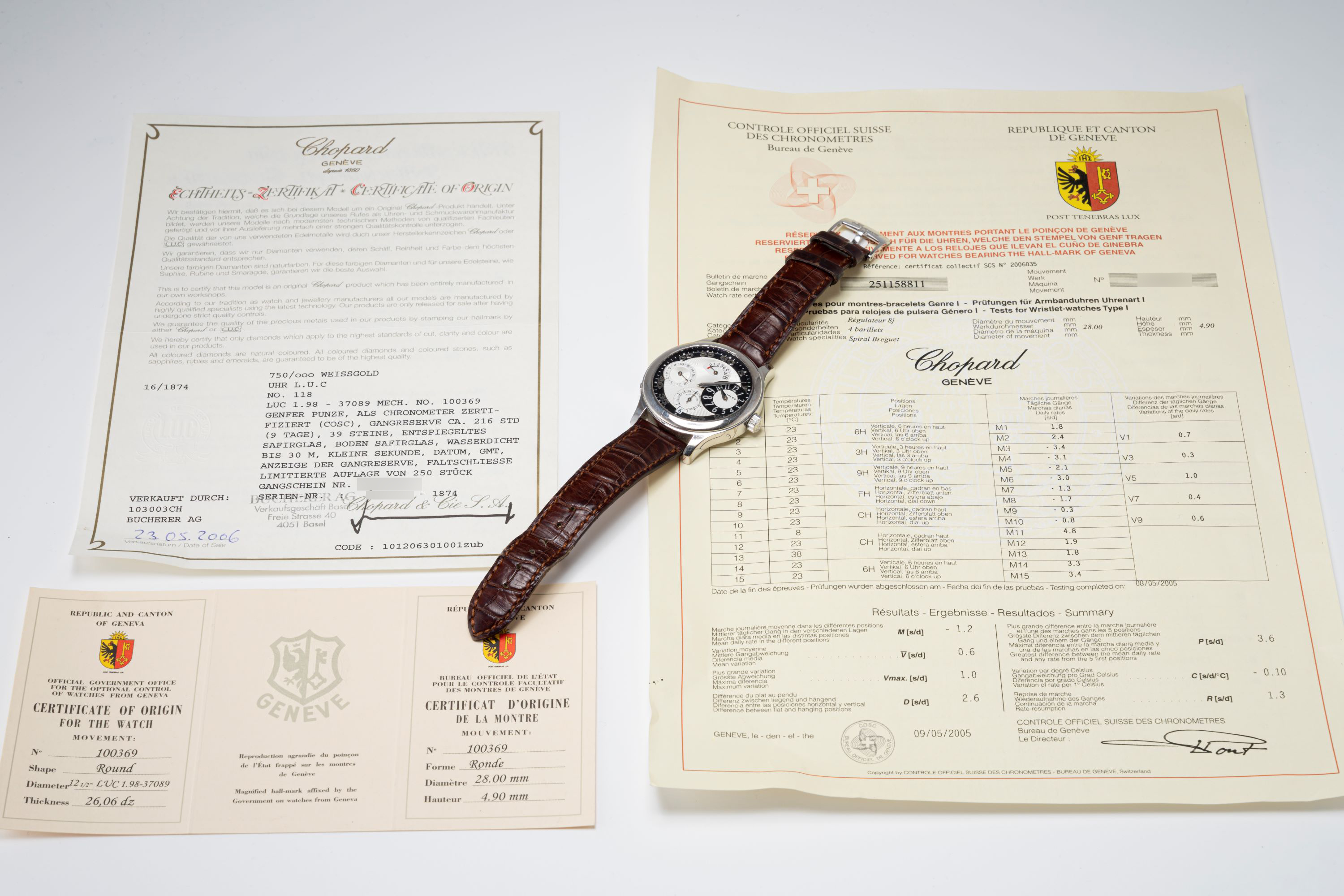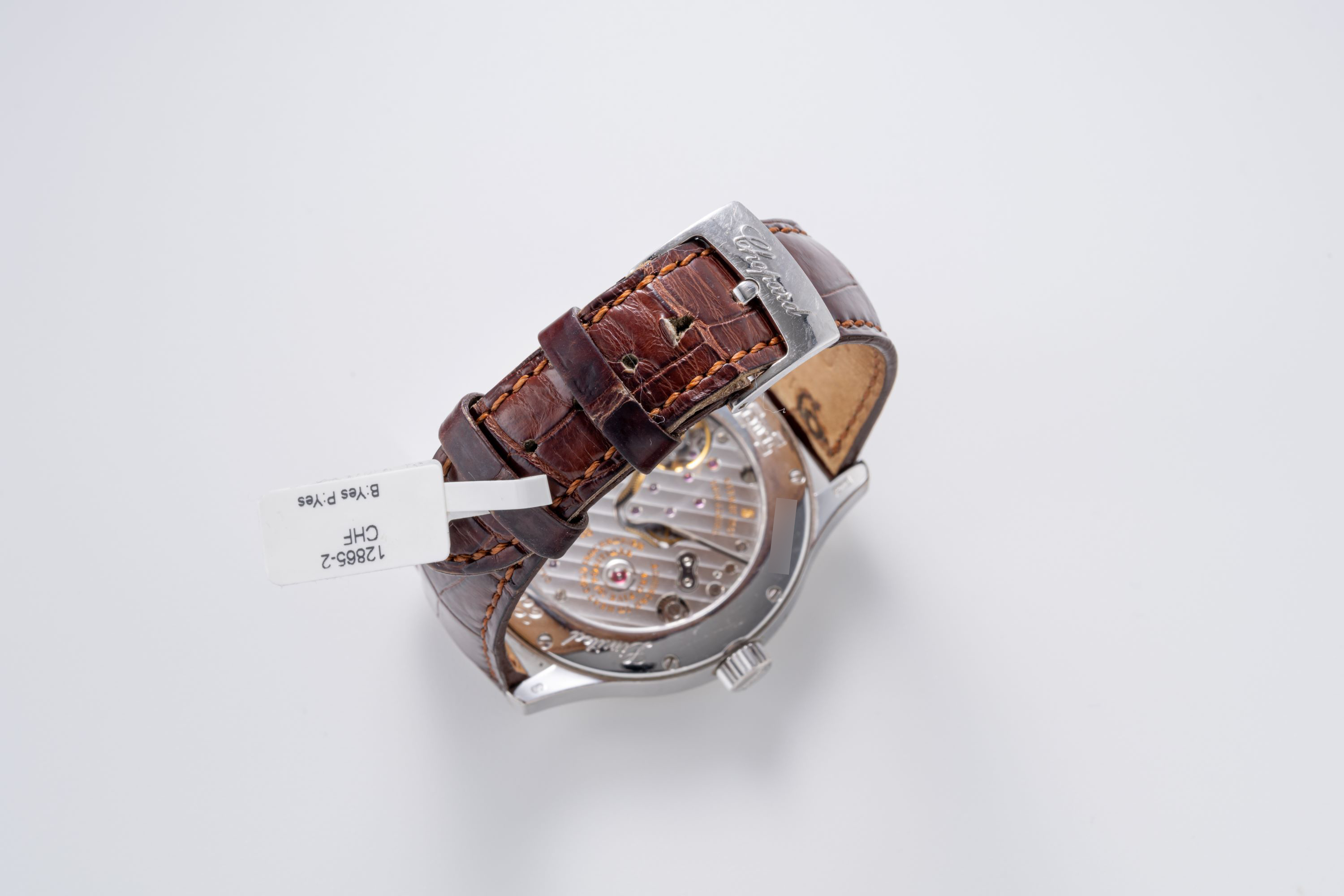 DialSilver guilloche dial with black outer track, applied numerals, white gold dauphine hands, power reserve at 12 o'clock, hours at 3 o'clock, central minutes, small seconds and date window at 6 o'clock, signed 'Chopard' in the hour subdial at 3 o'clock