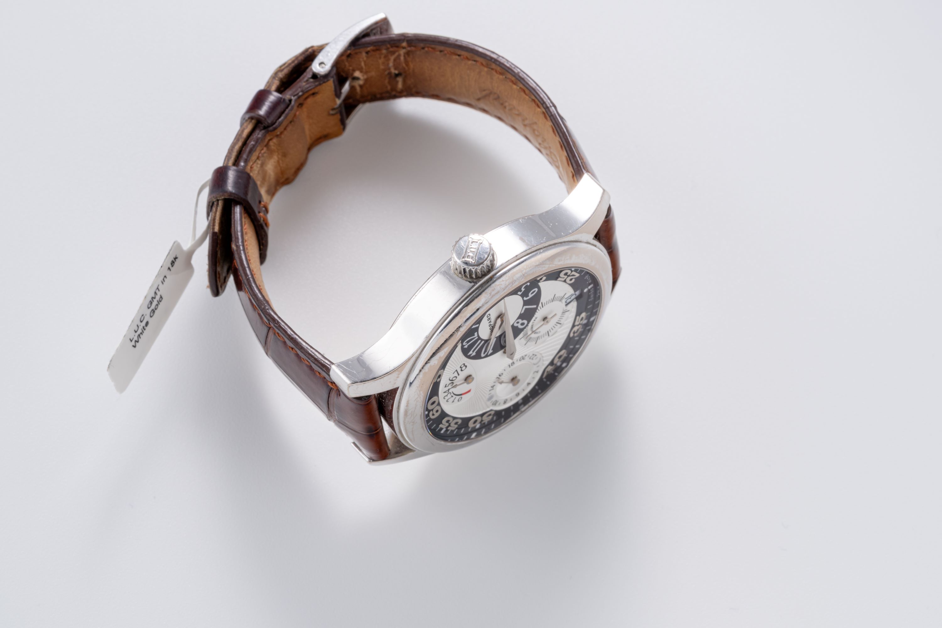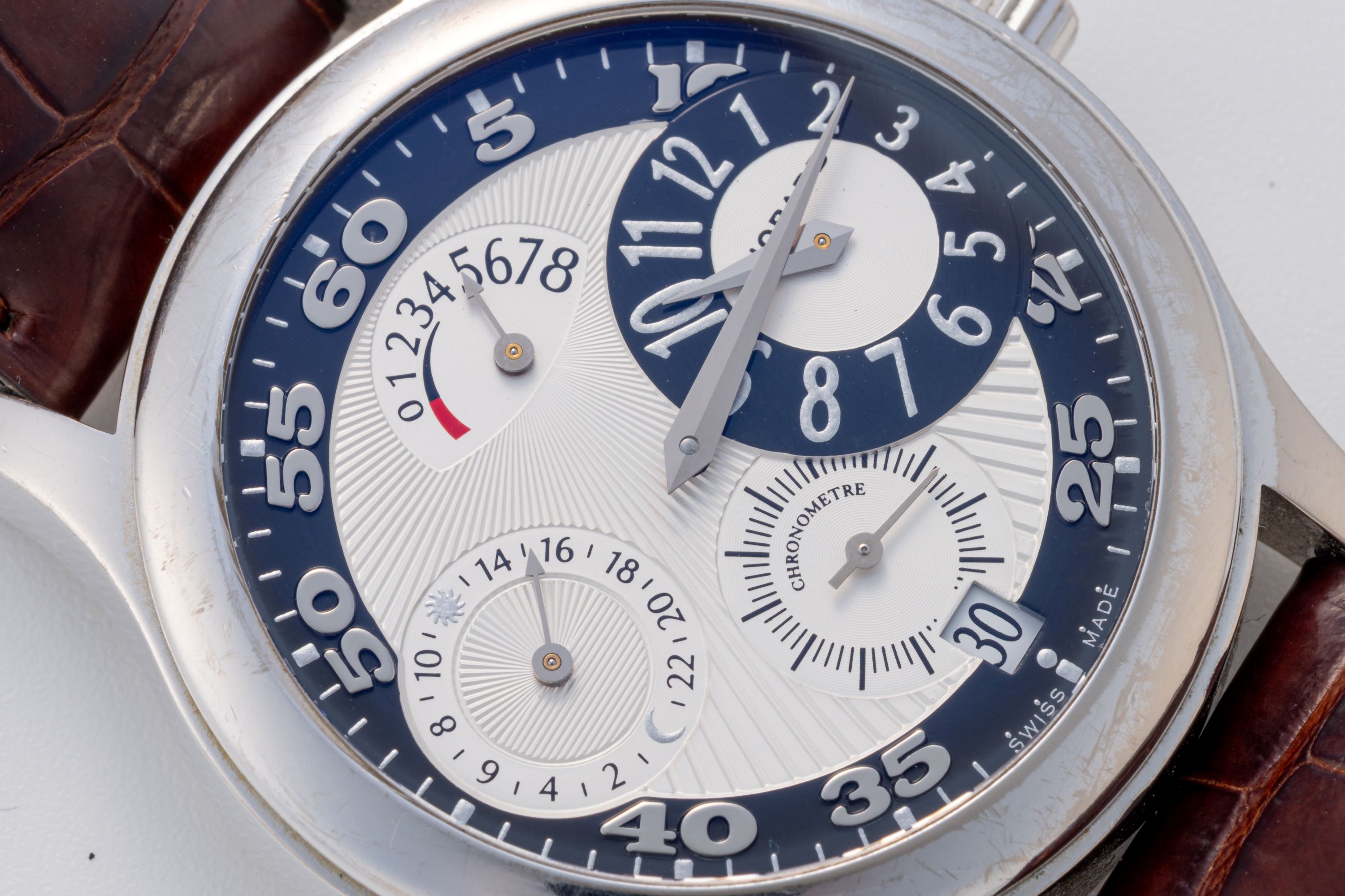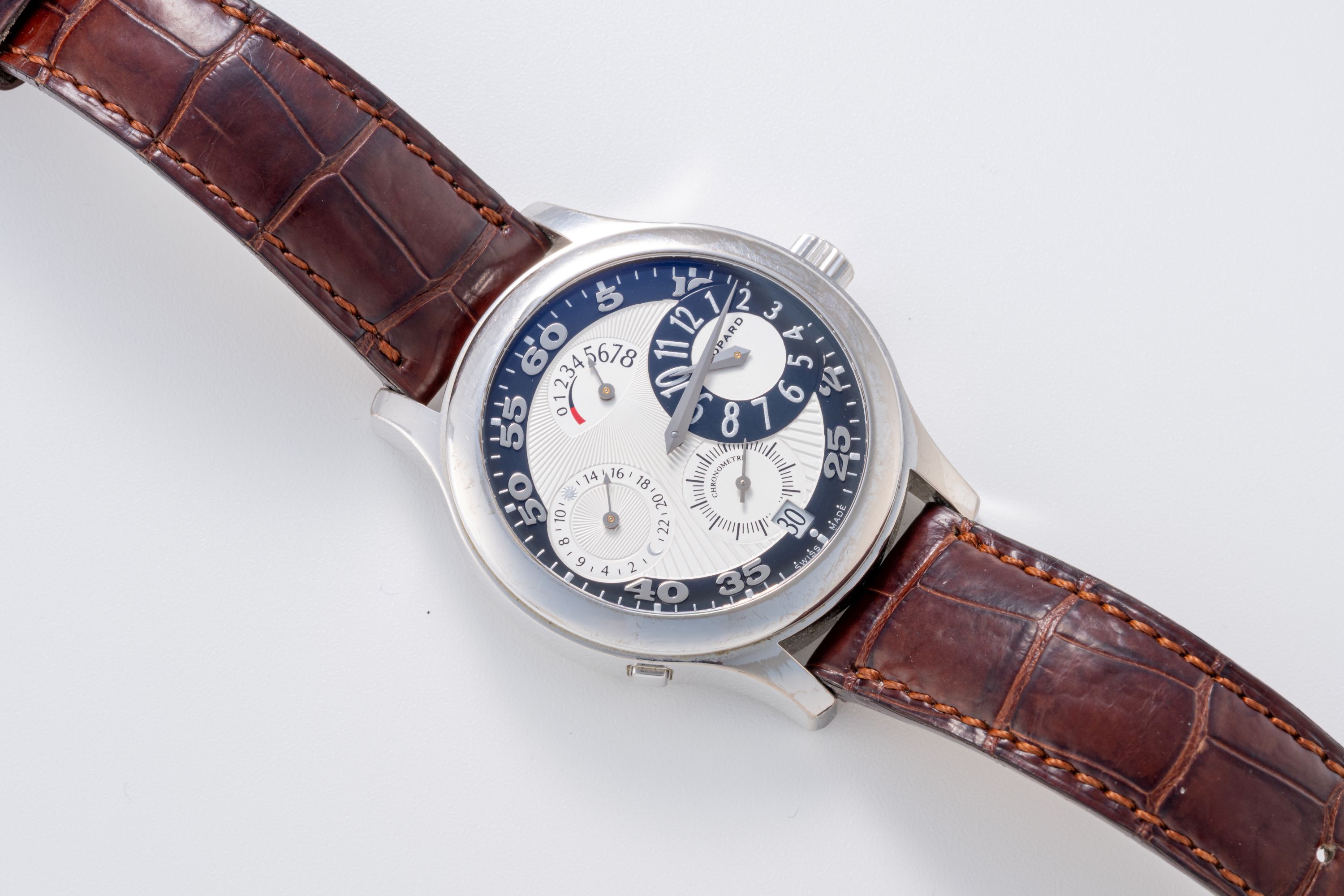 DialSilver guilloche dial with black outer track, applied numerals, white gold dauphine hands, power reserve at 12 o'clock, hours at 3 o'clock, central minutes, small seconds and date window at 6 o'clock, signed 'Chopard' in the hour subdial at 3 o'clock