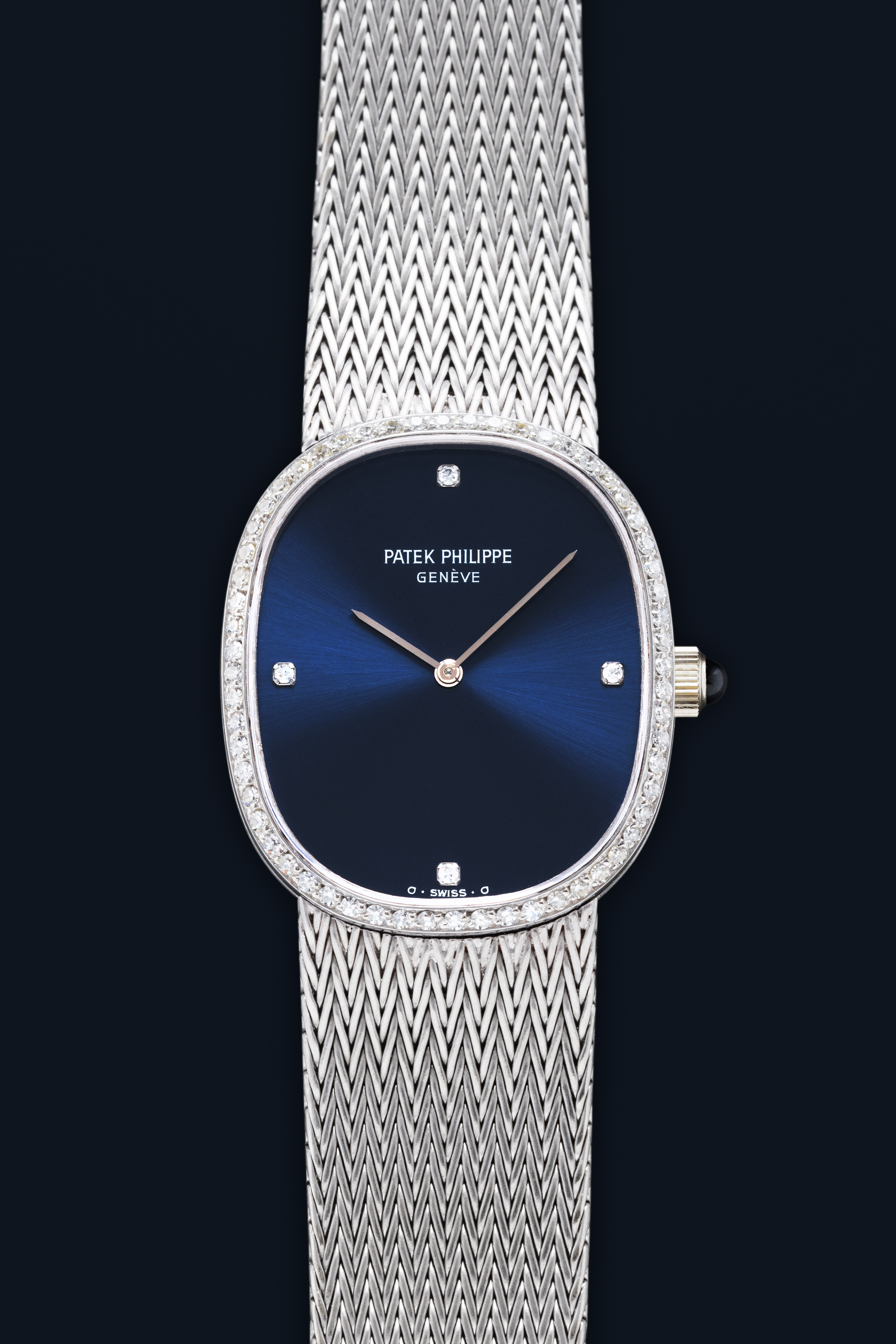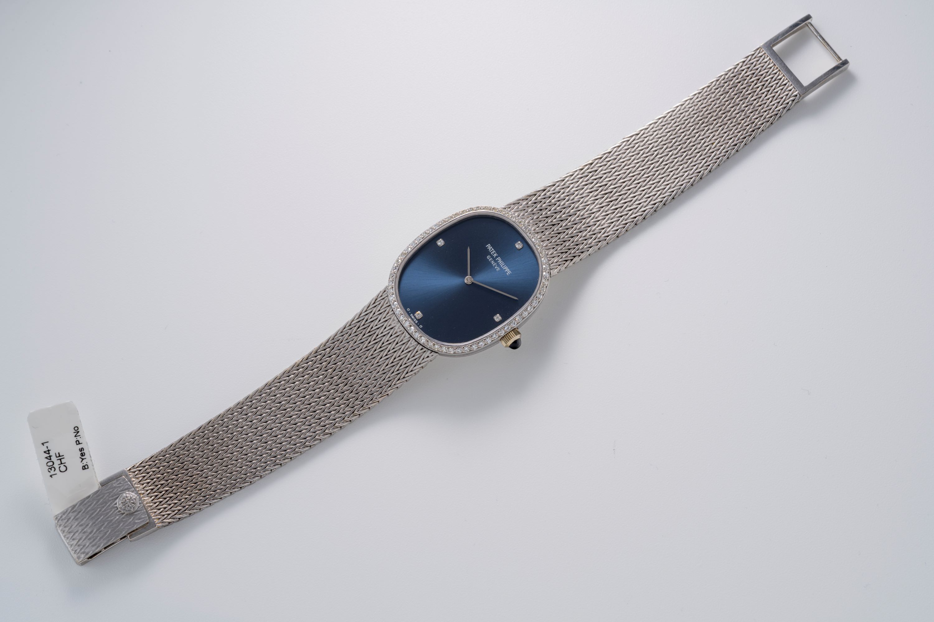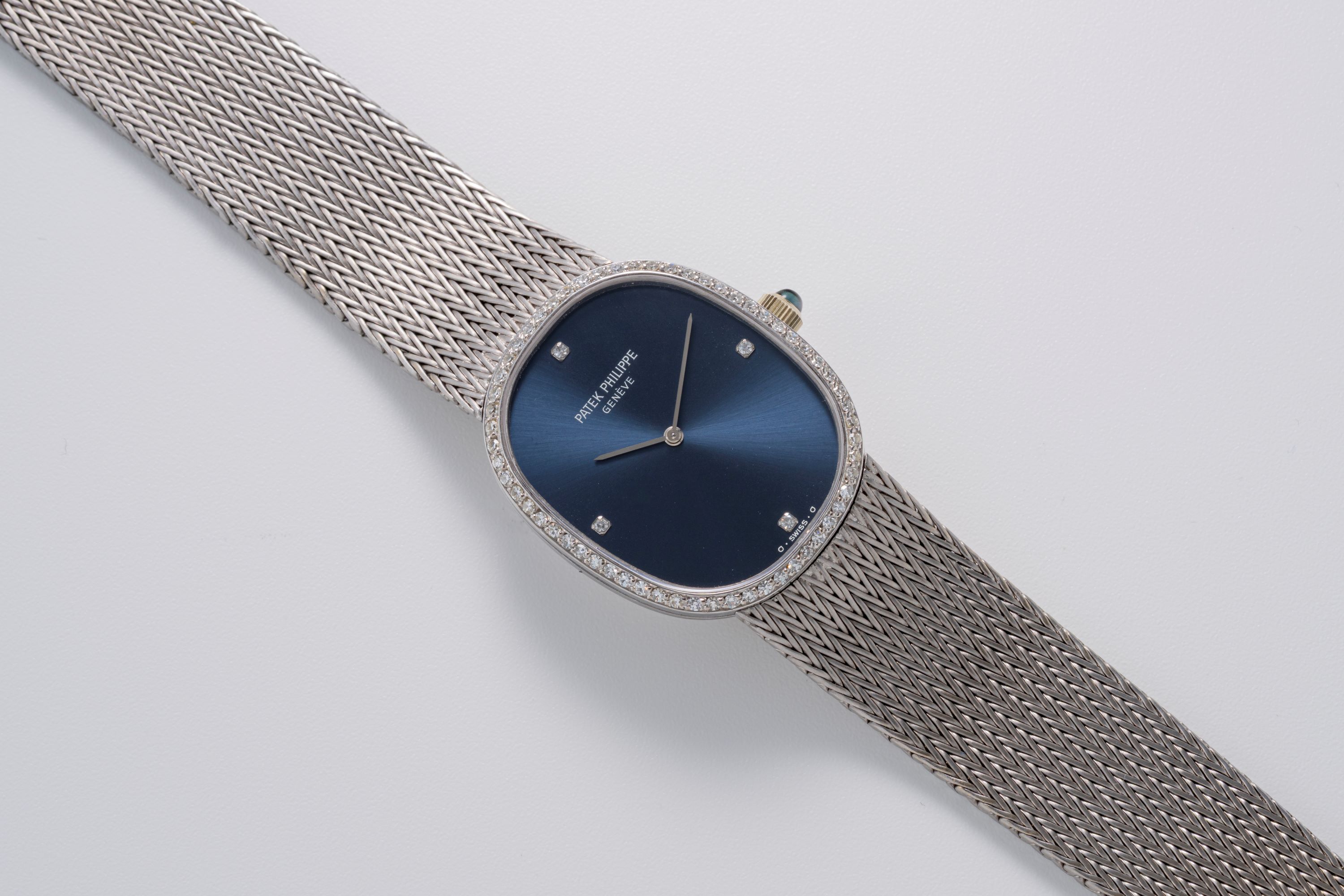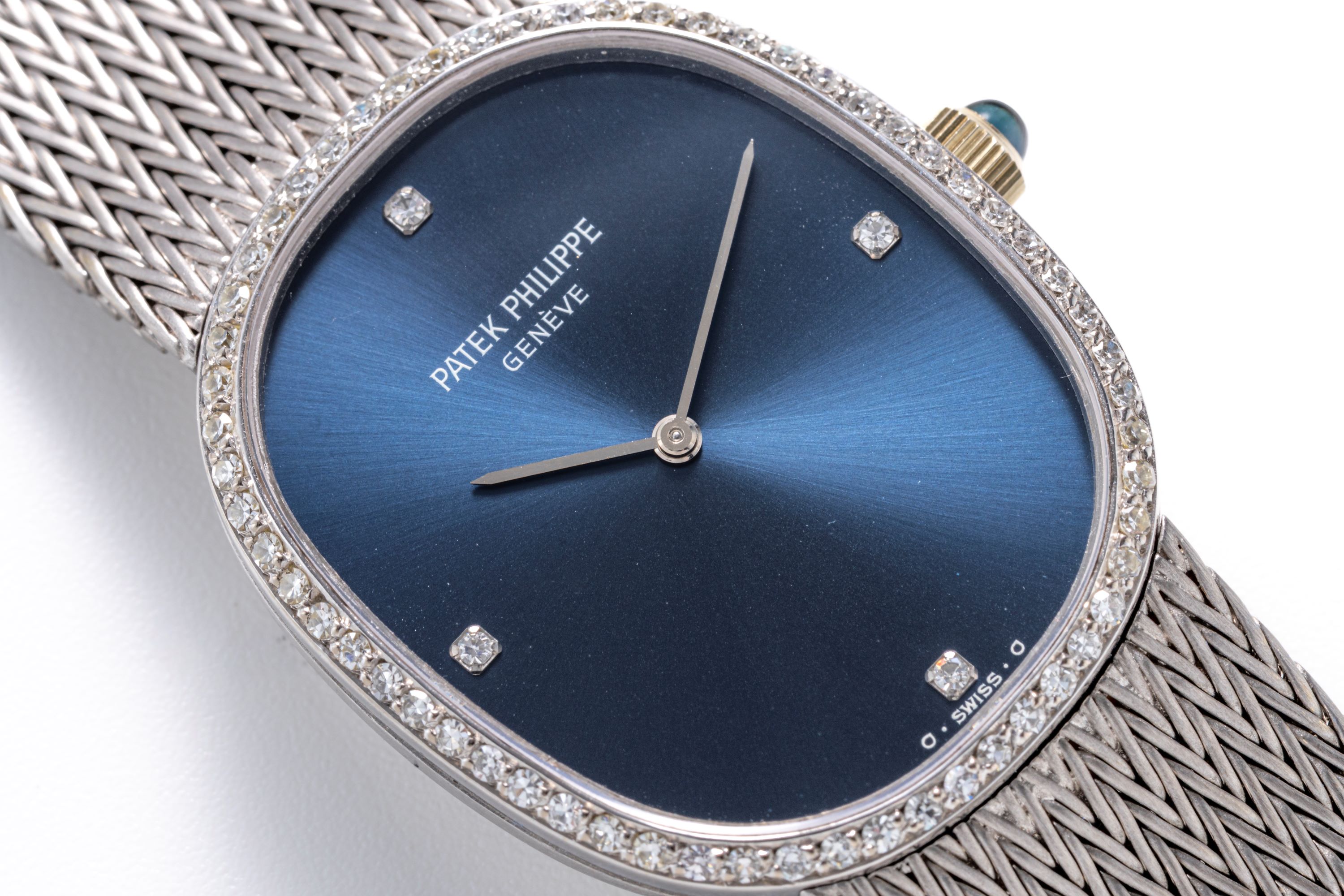 DialBlue sunburst dial with diamonds at 12, 3, 6, and 9 o'clock, white gold hands, signed 'Patek Philippe' at 12 o'clock