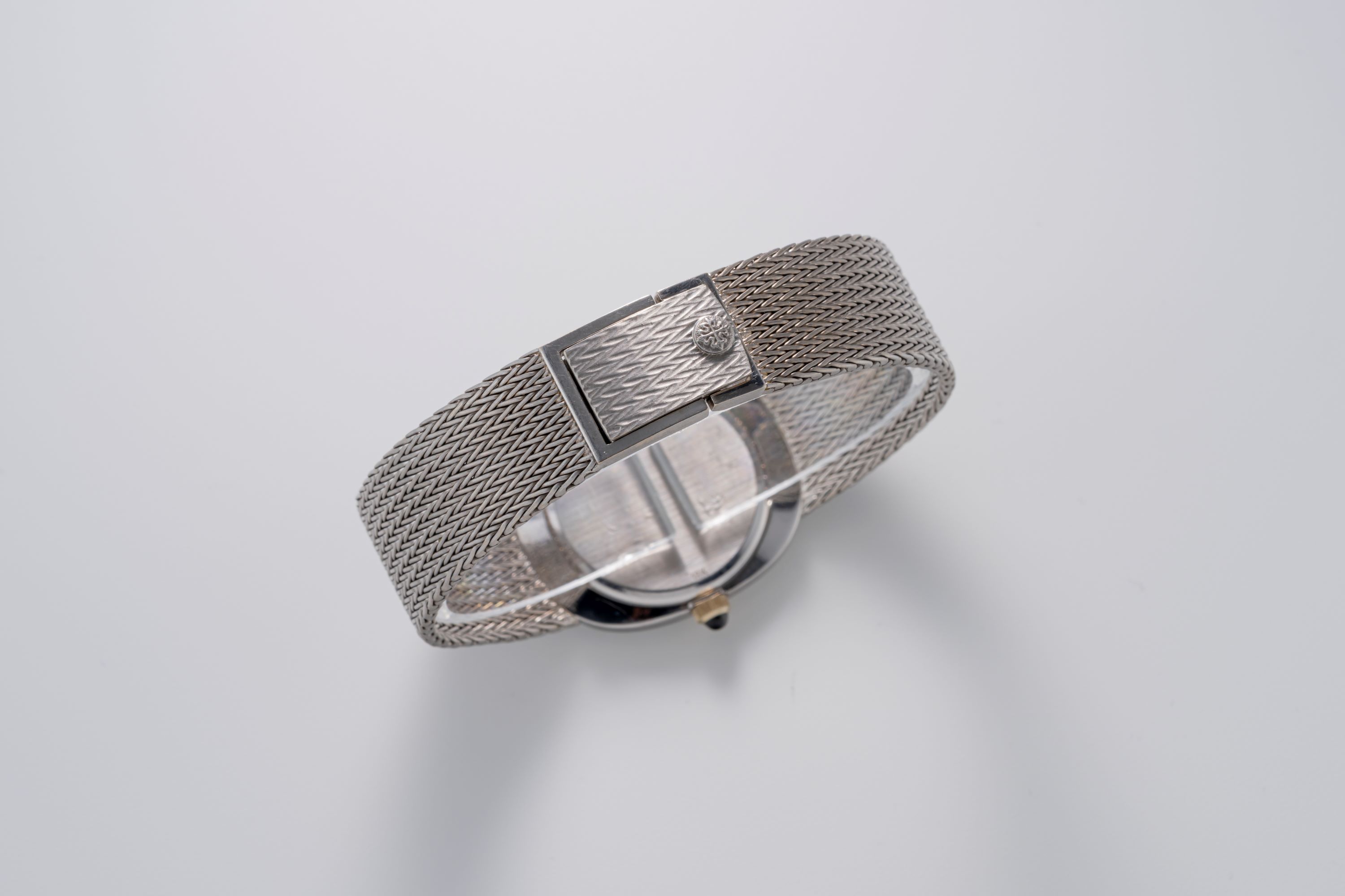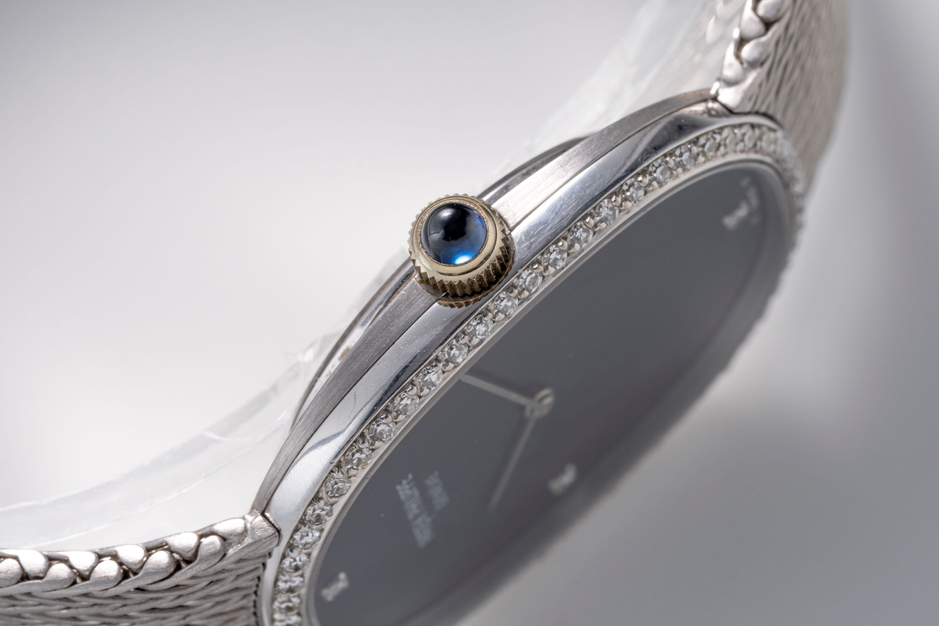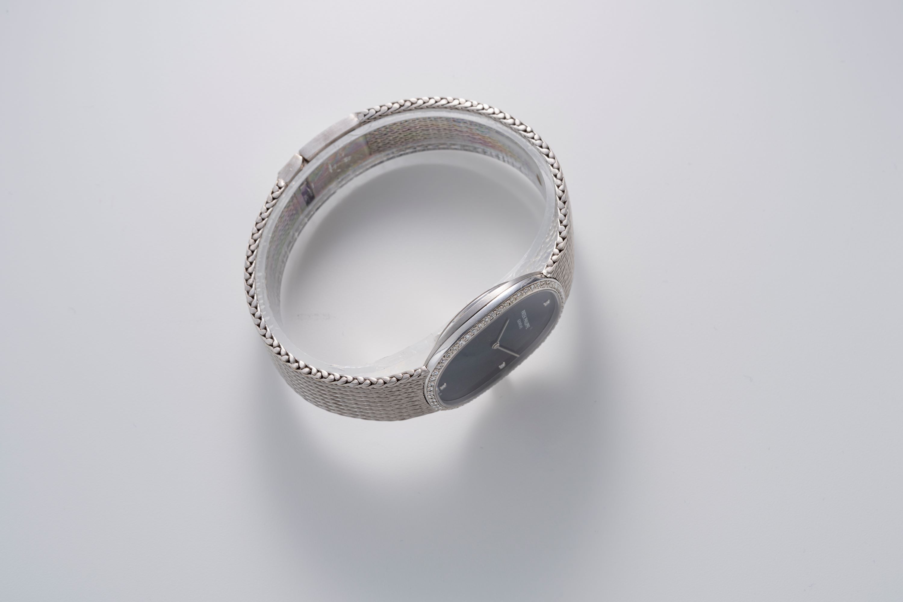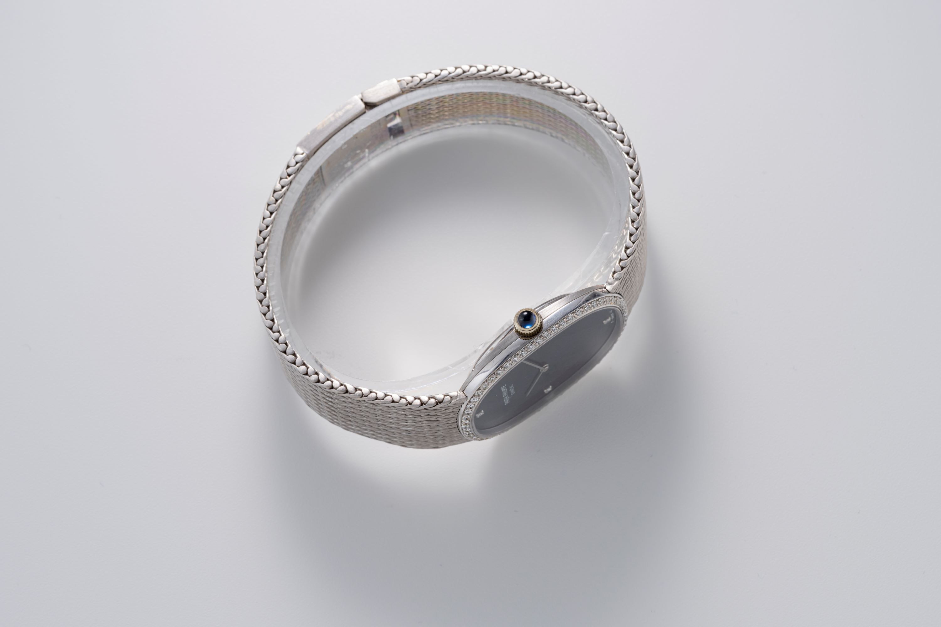CaseElliptical case in 18k white gold with crown at 3 o'clock, factory diamond-set bezel, solid caseback