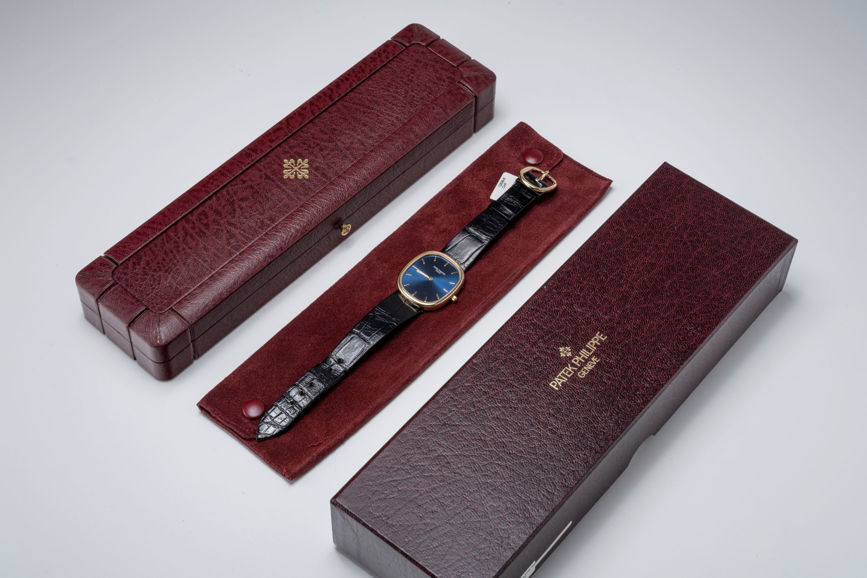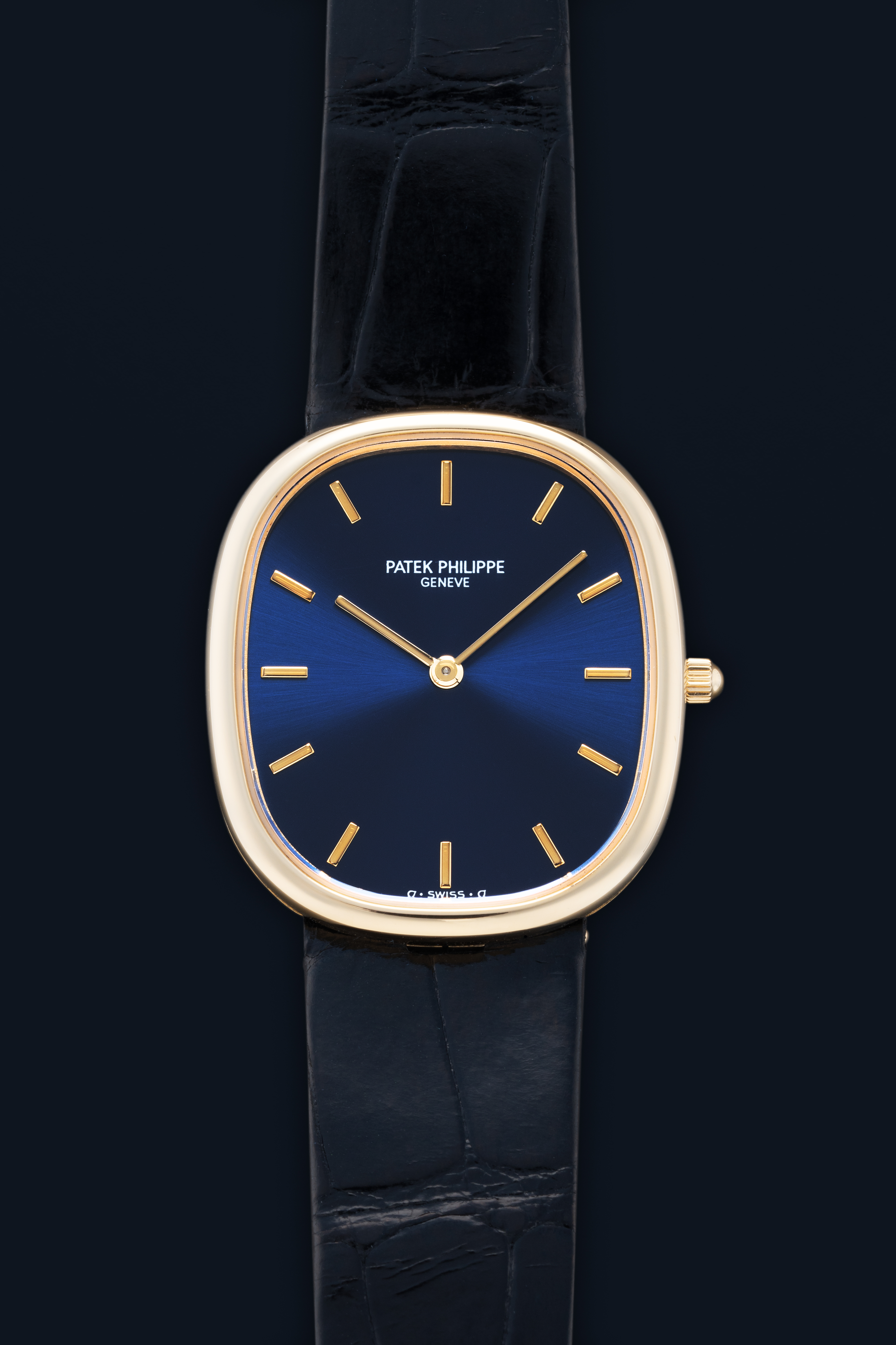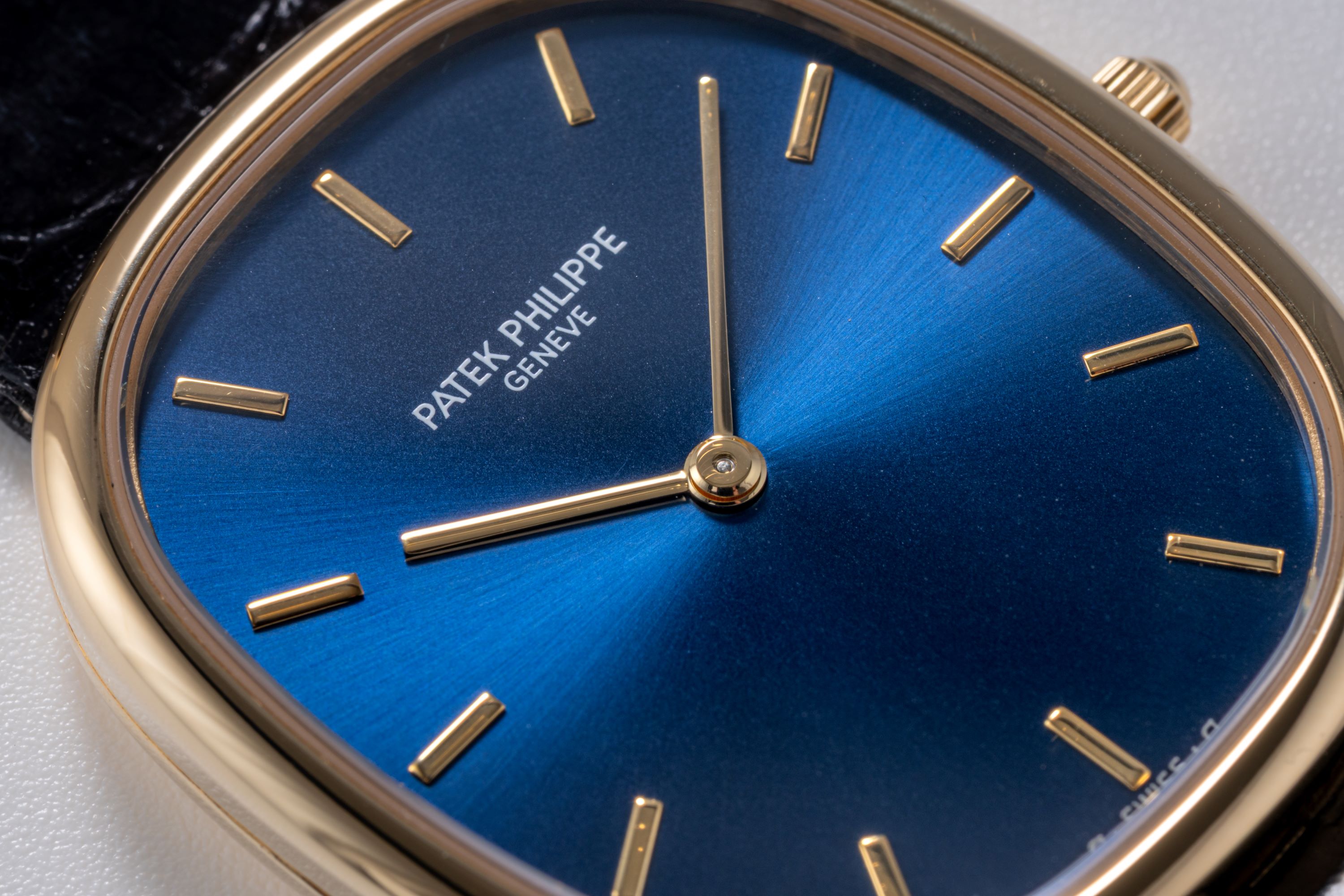 DialBlue sunburst dial with gold indices, gold hands, signed 'Patek Philippe' at 12 o'clock