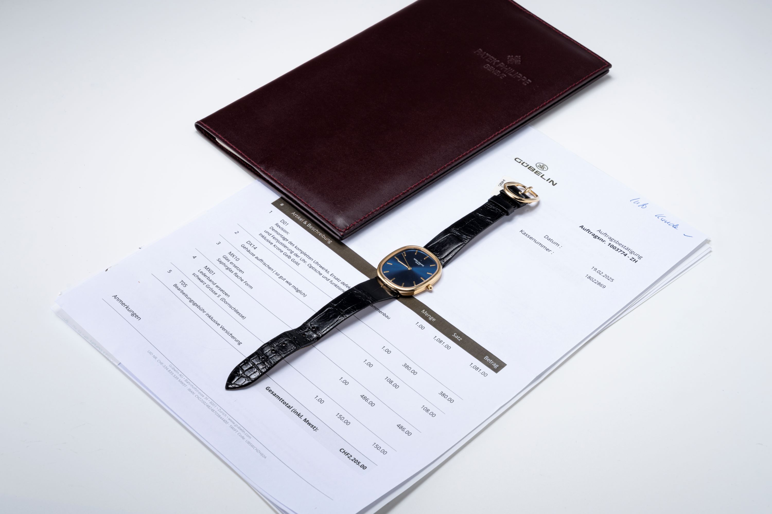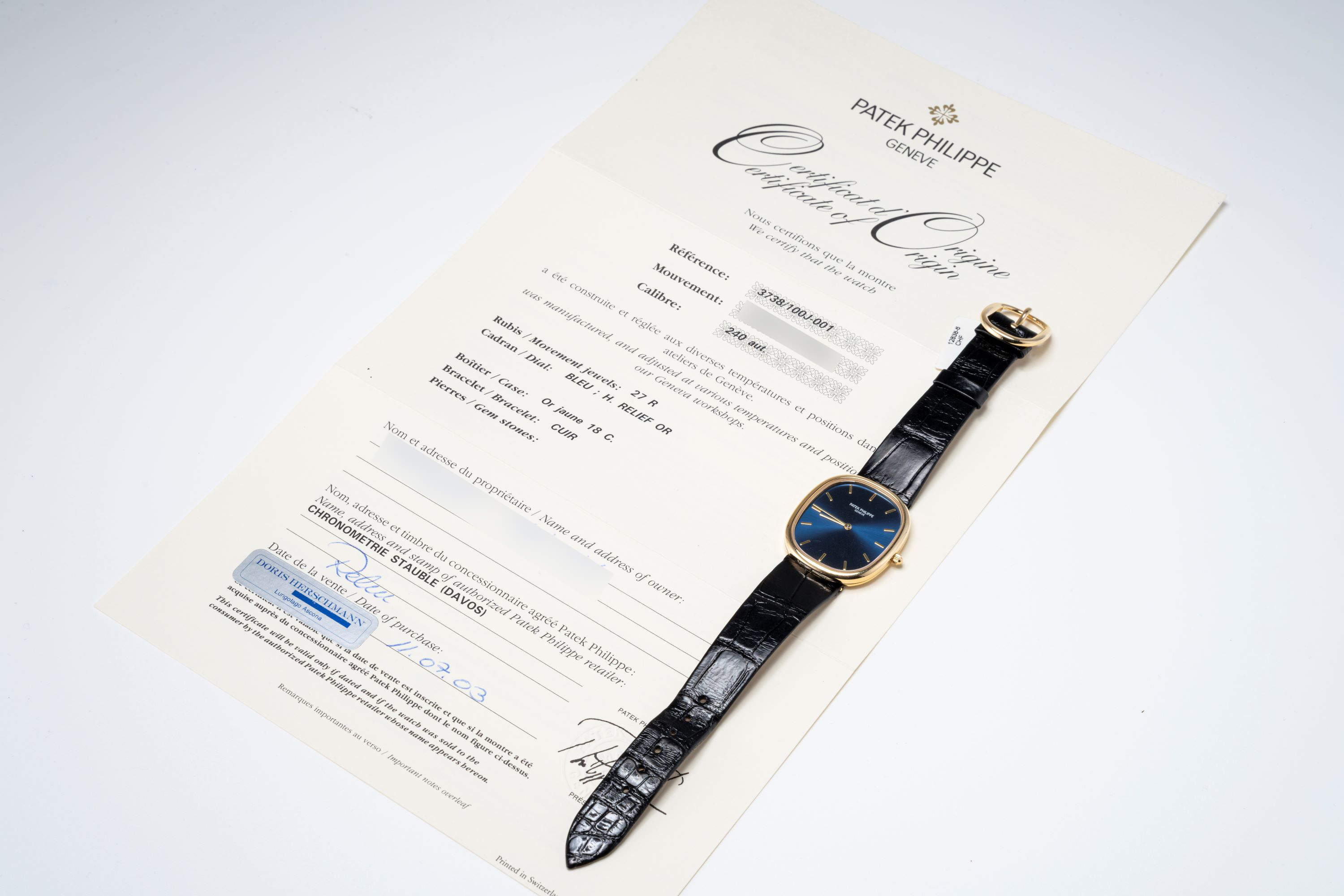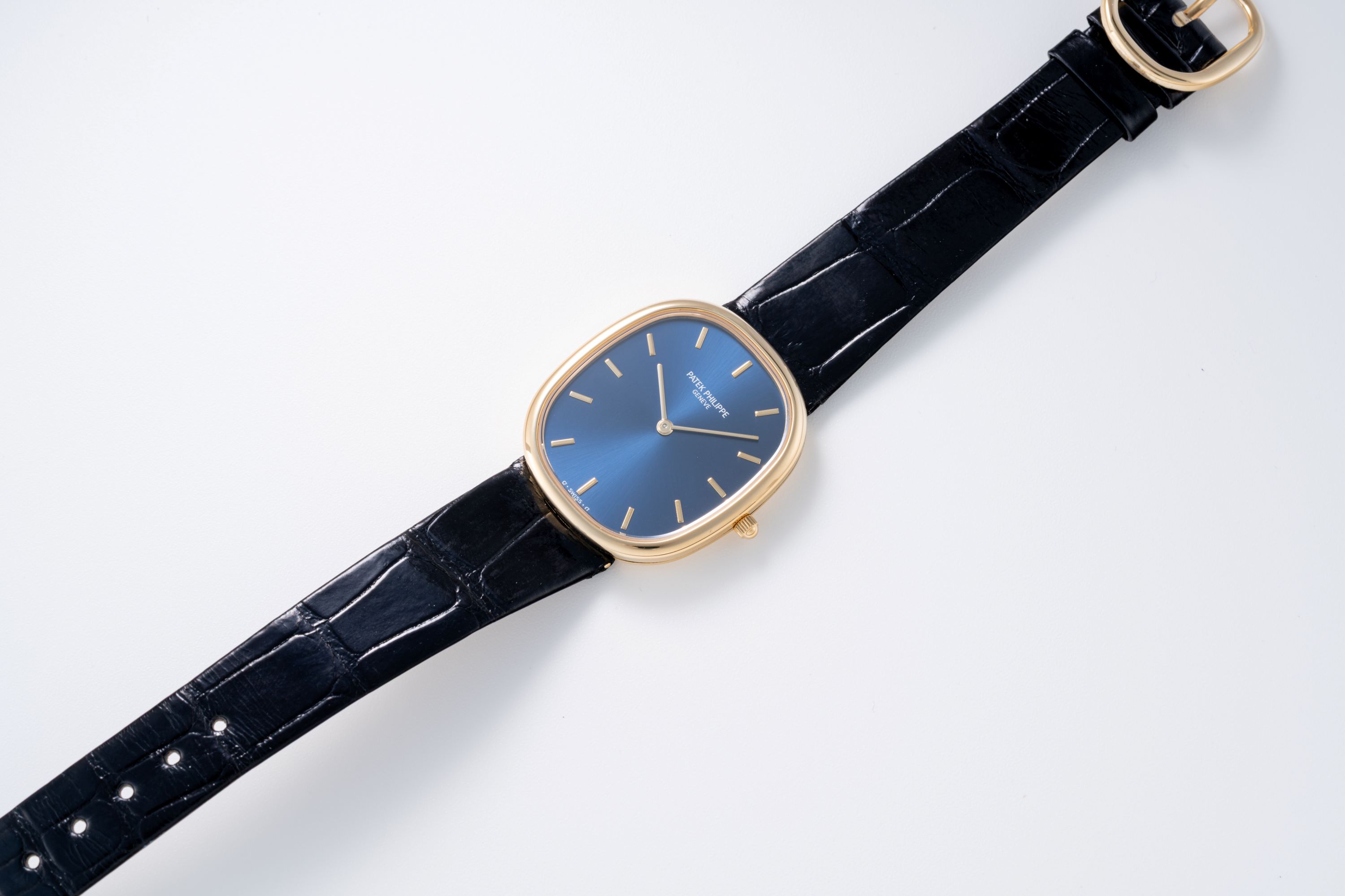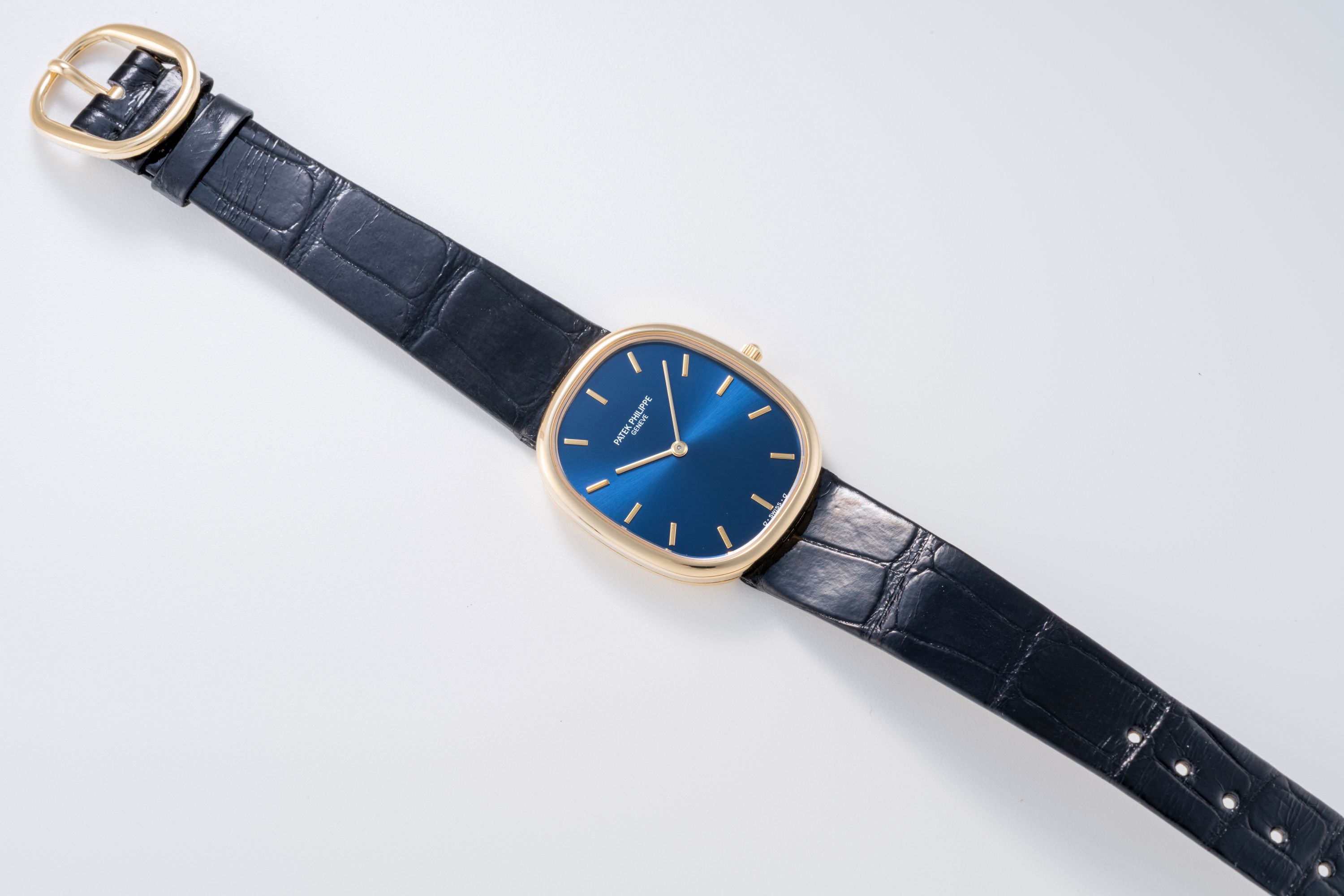 DialBlue sunburst dial with gold indices, gold hands, signed 'Patek Philippe' at 12 o'clock