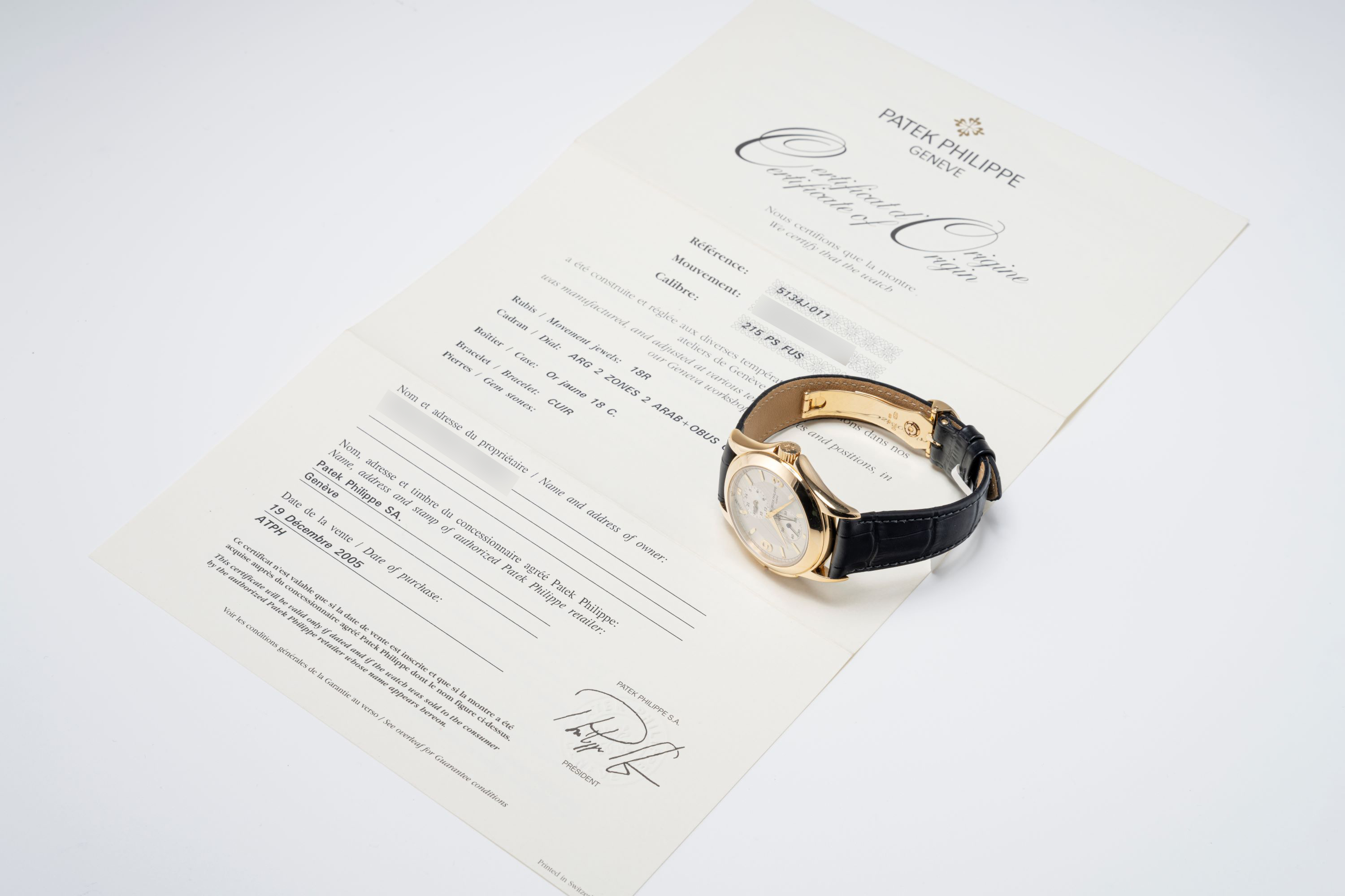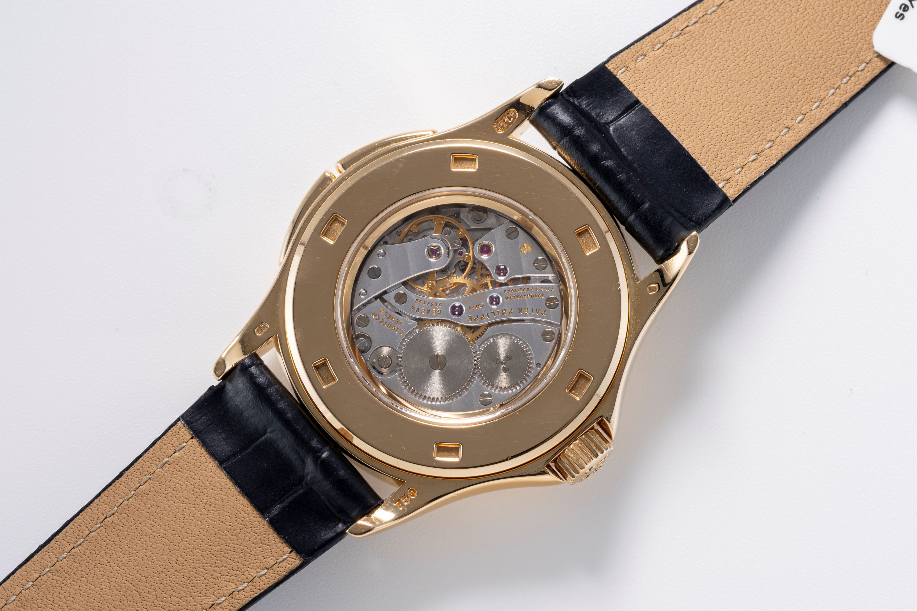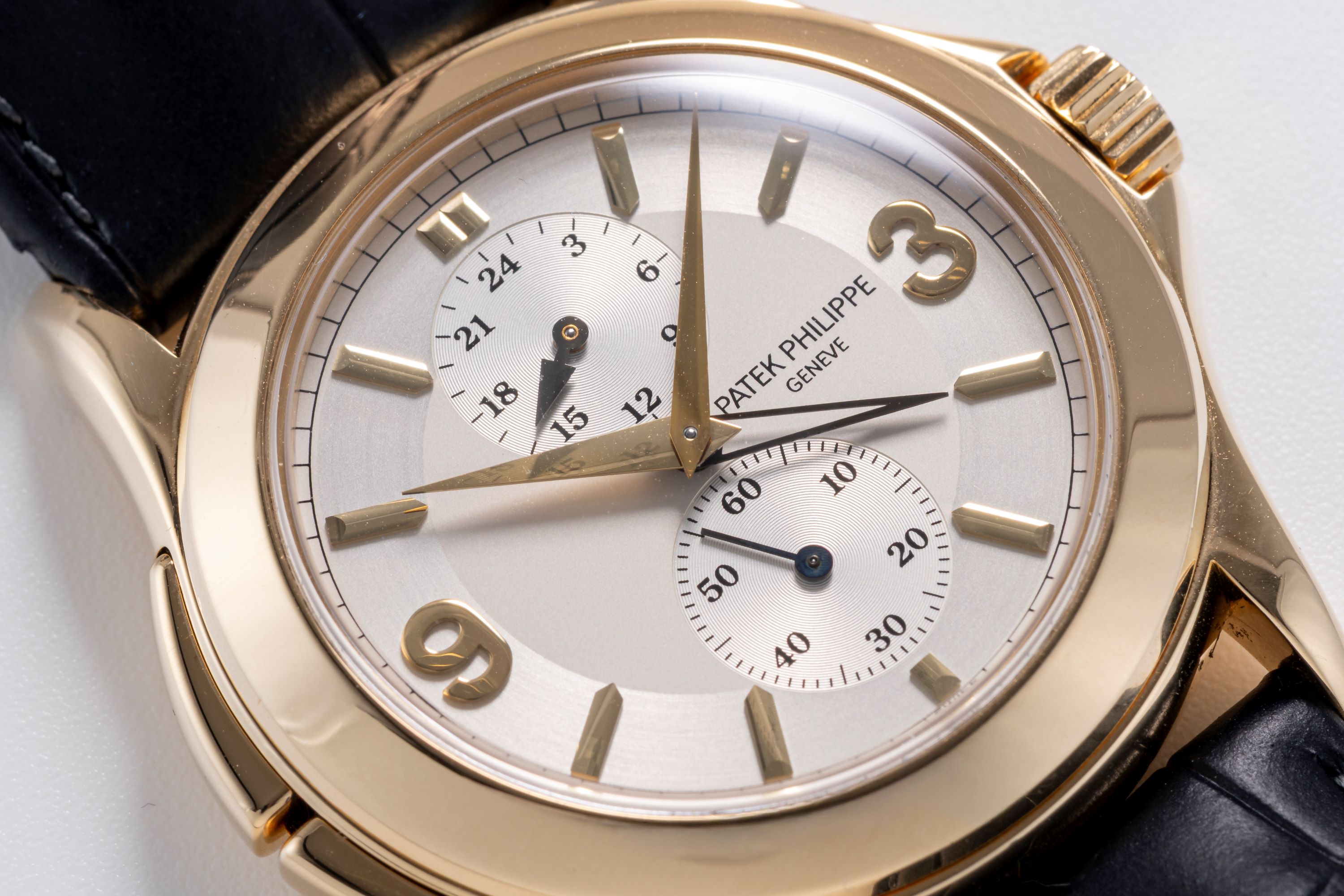DialSilver dial with applied indices and numerals at 3 and 9 o'clock, gold dauphine hands, skeletonized black second hour hand, small seconds at 6 o'clock, 24 hour indicator at 12 o'clock, signed 'Patek Philippe' at 3 o'clock