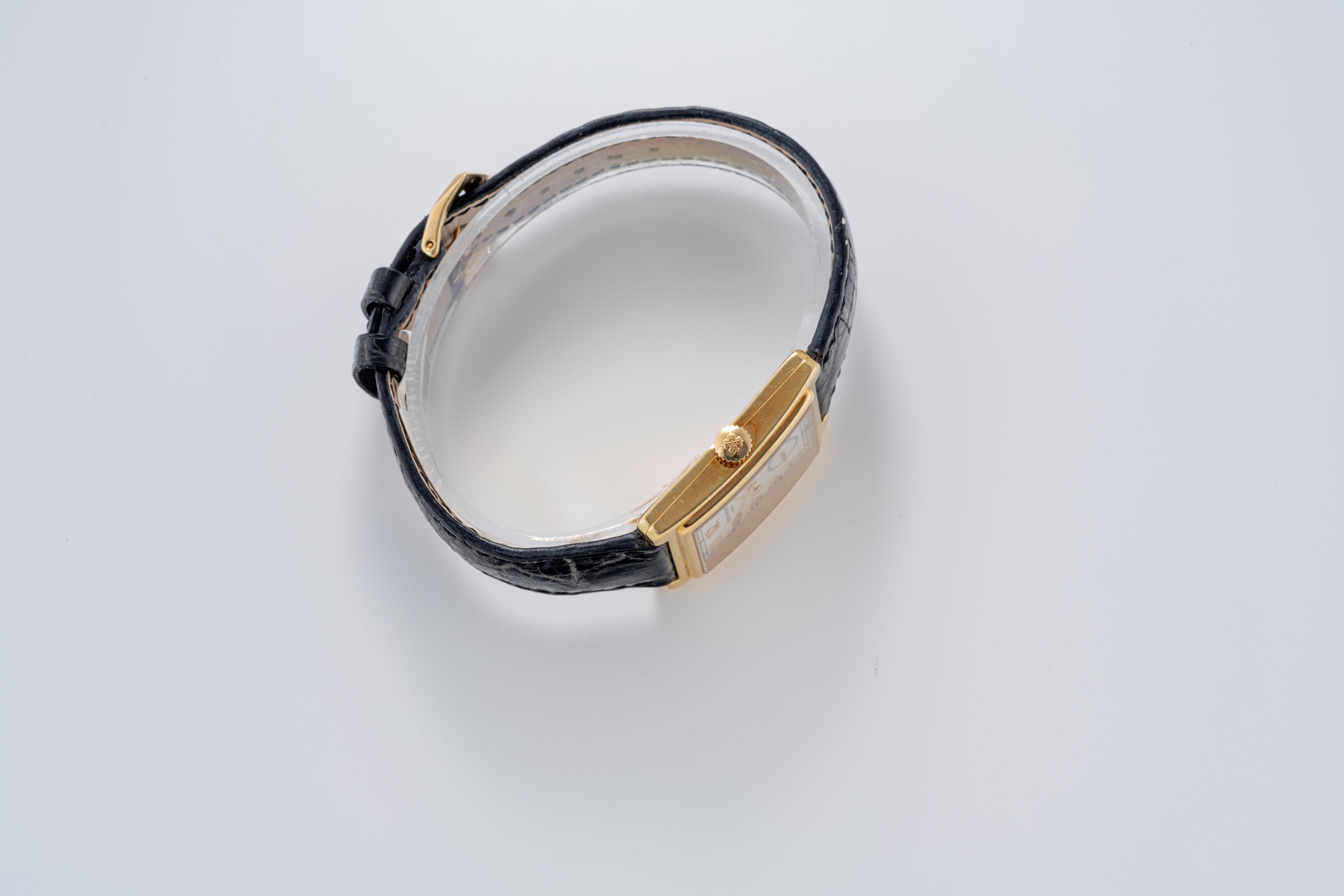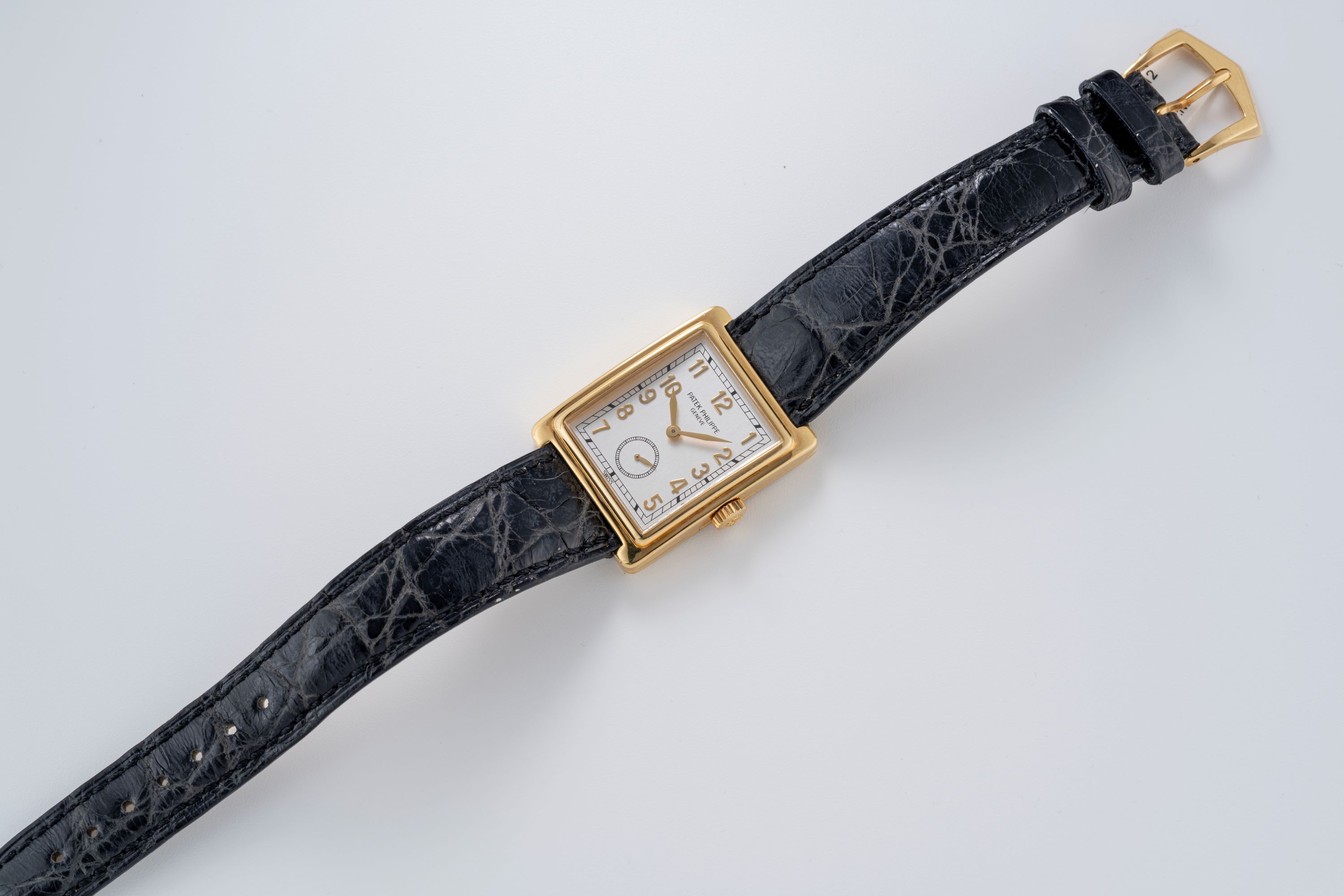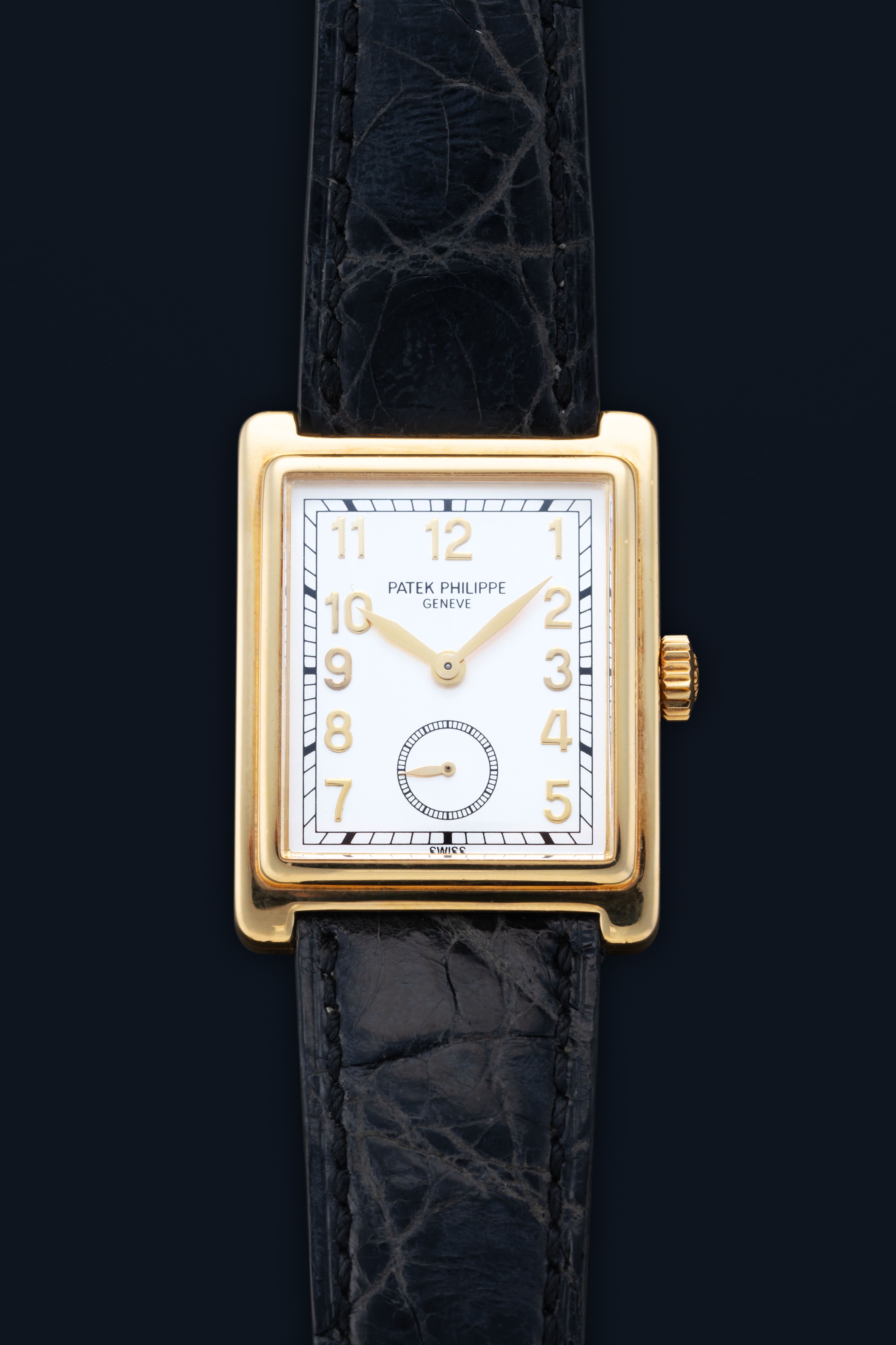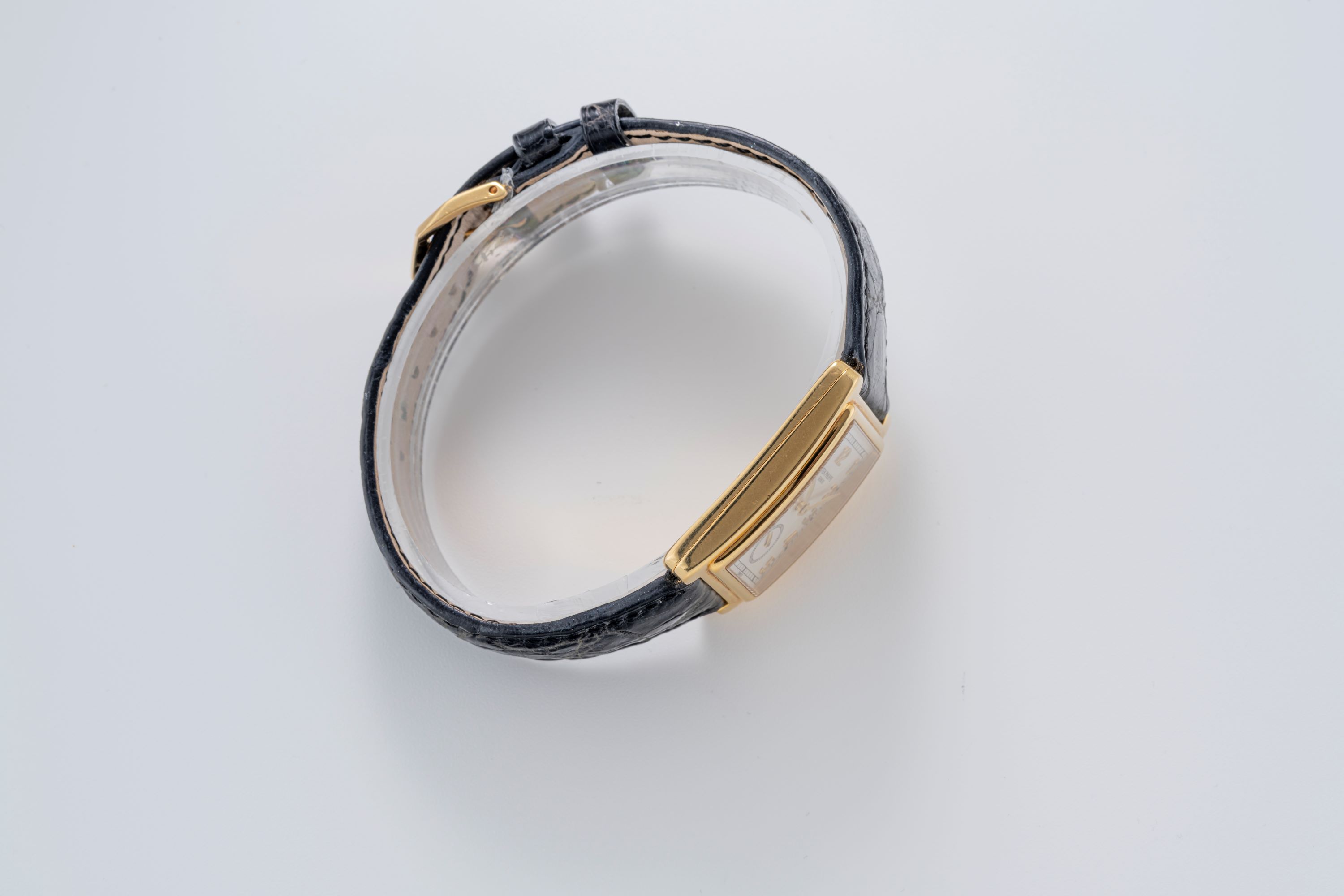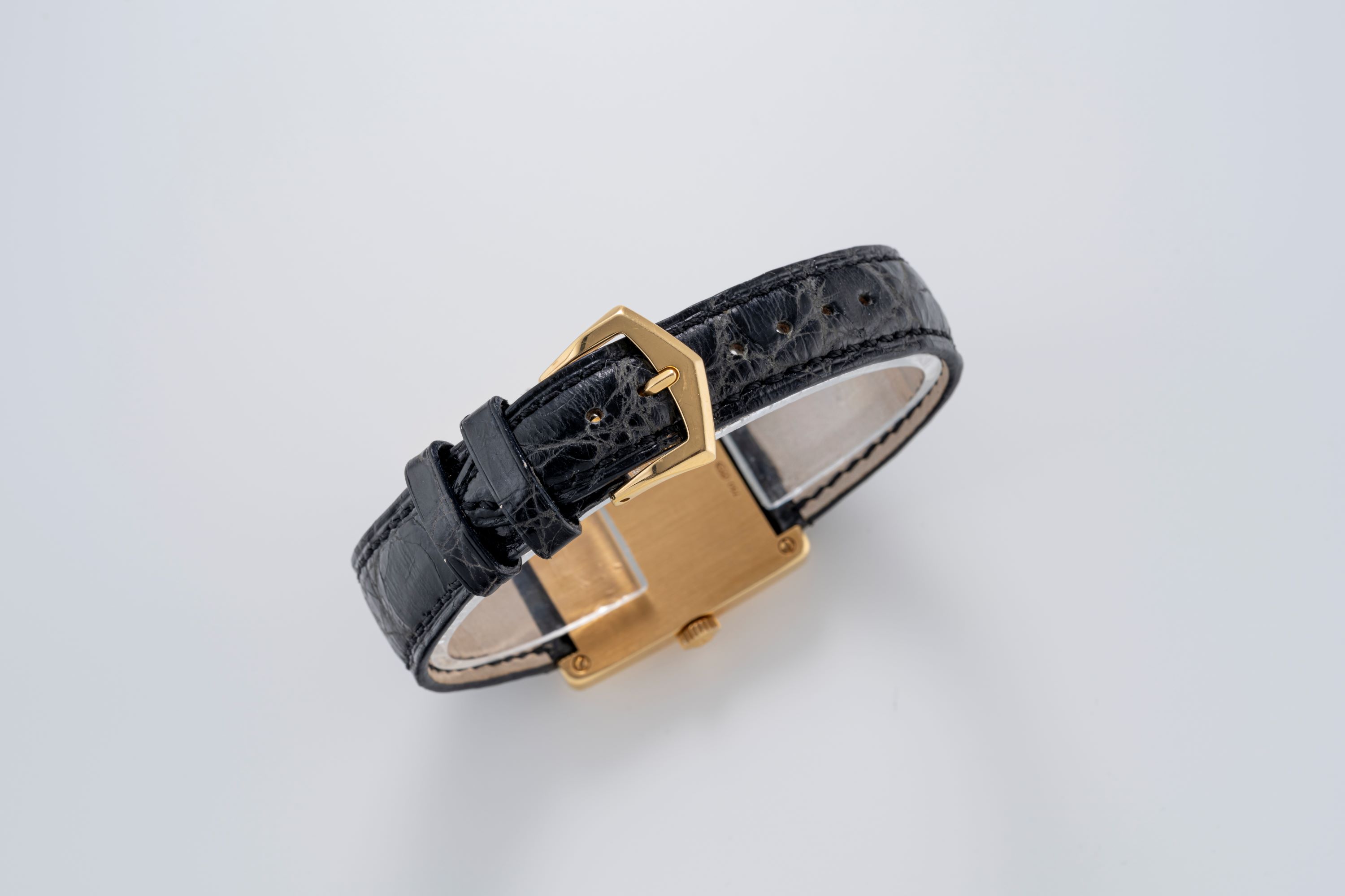 CaseRectangular case in 18k yellow gold with winding crown at 3 o'clock, stepped bezel, solid caseback