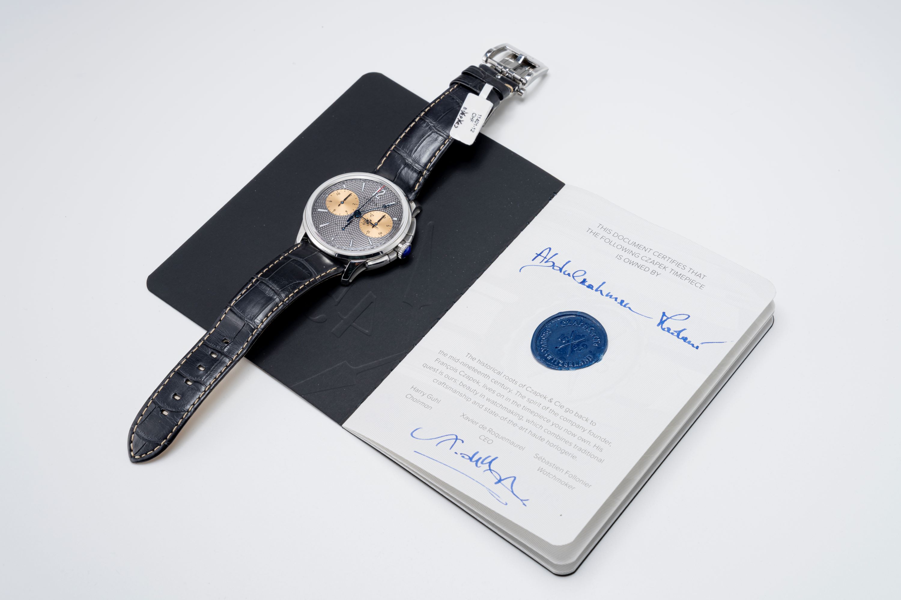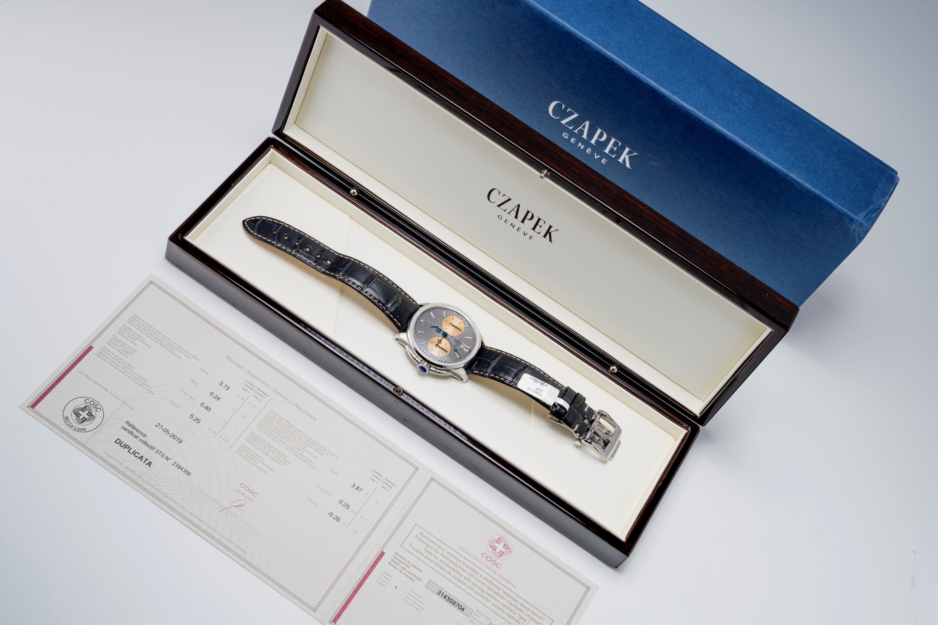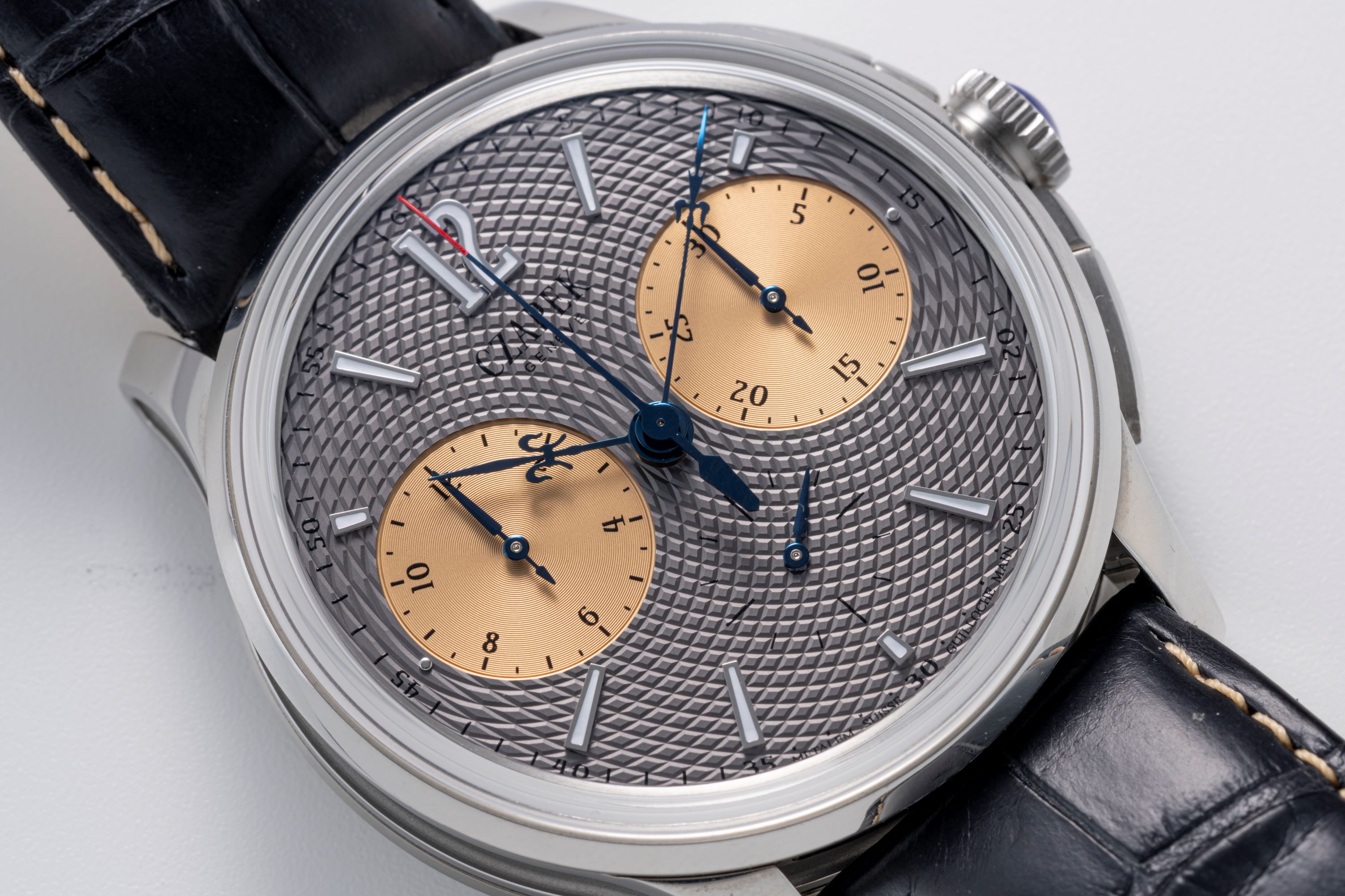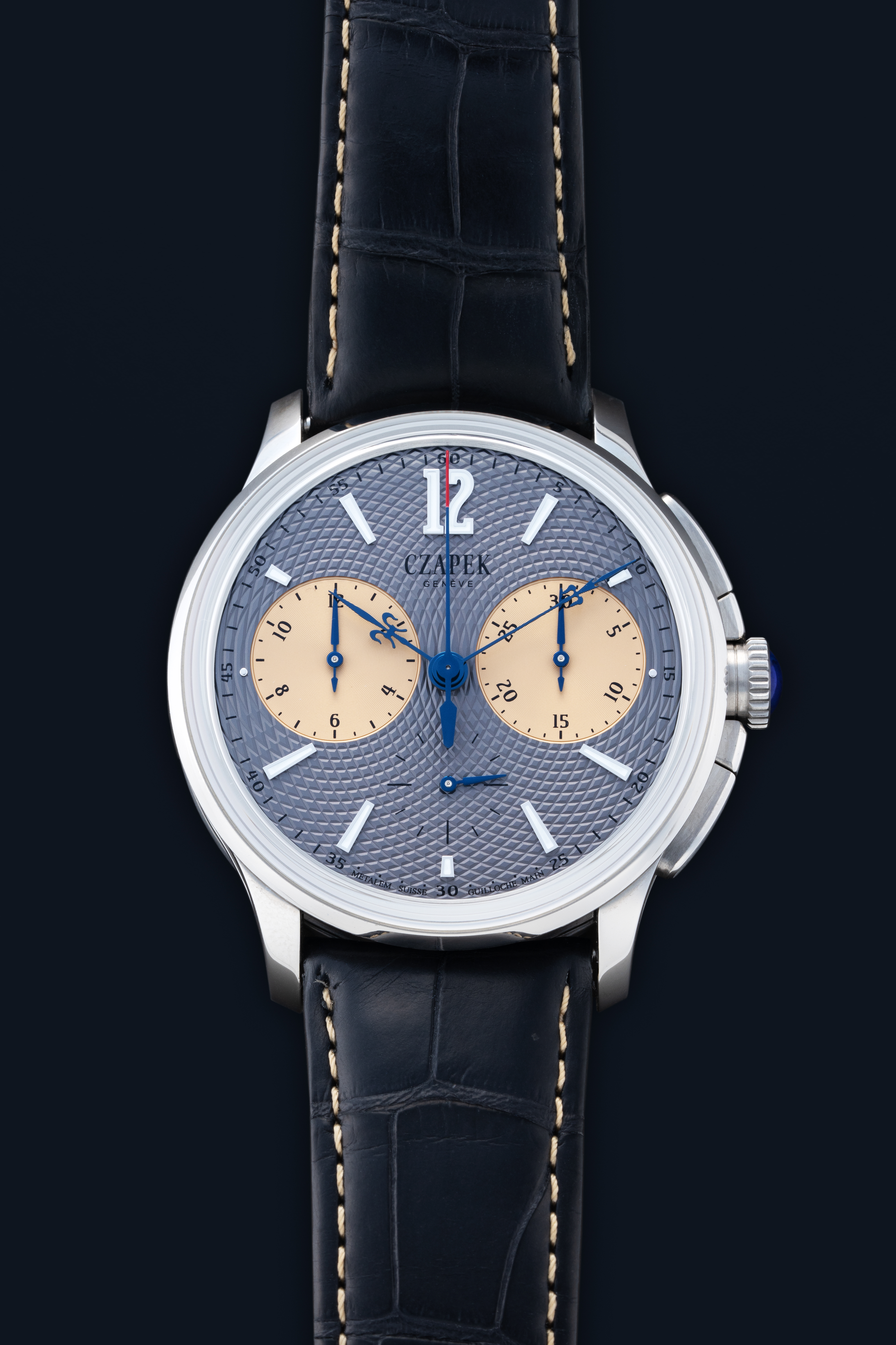DialGrey guilloche dial with gold/yellow subdials, applied luminous indices, heat-blued hands, small seconds at 6 o'clock, 12 hour chronograph counter at 9 o'clock, and 30 minute chronograph counter at 3 o'clock, signed 'Czapek' at 12 o'clock