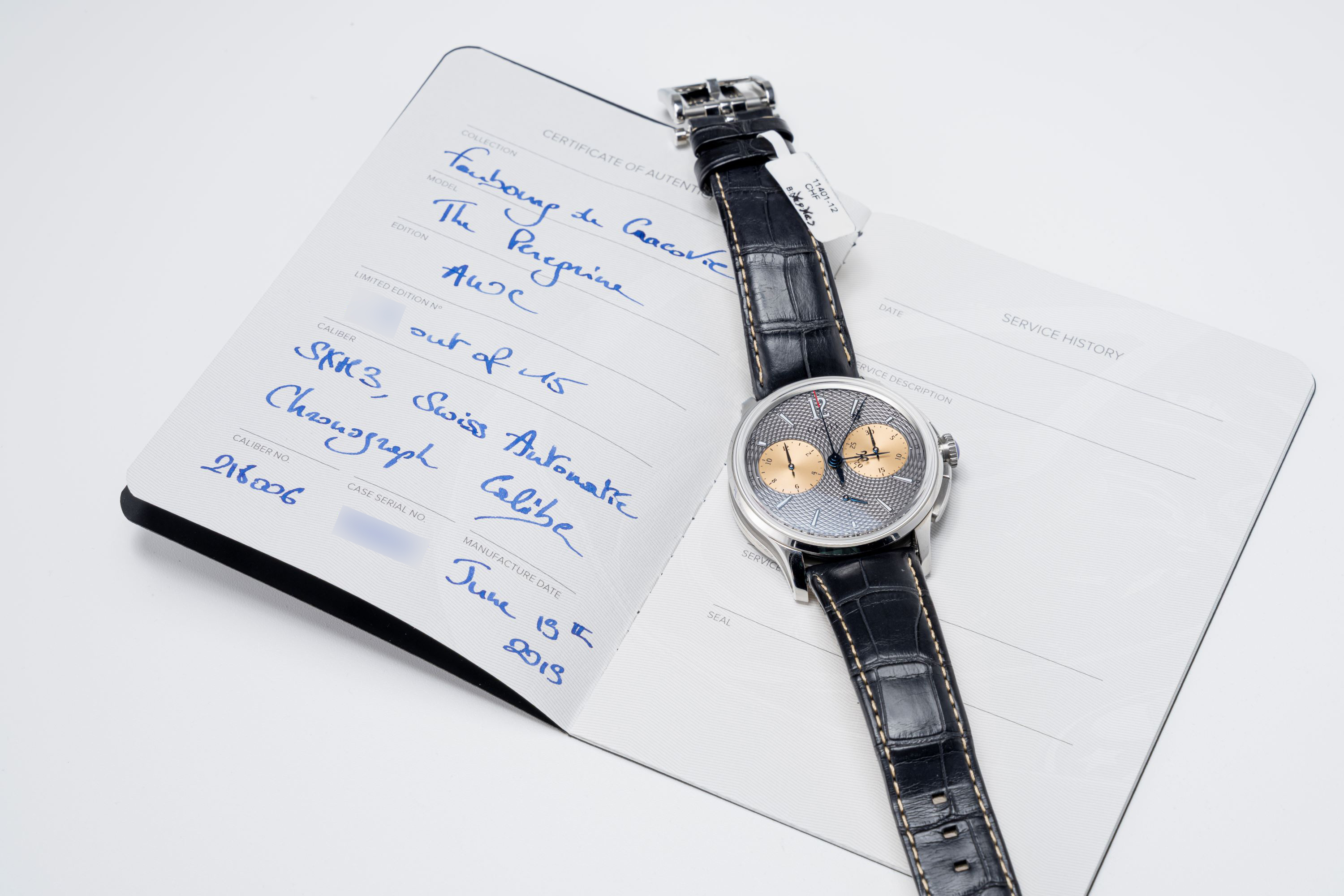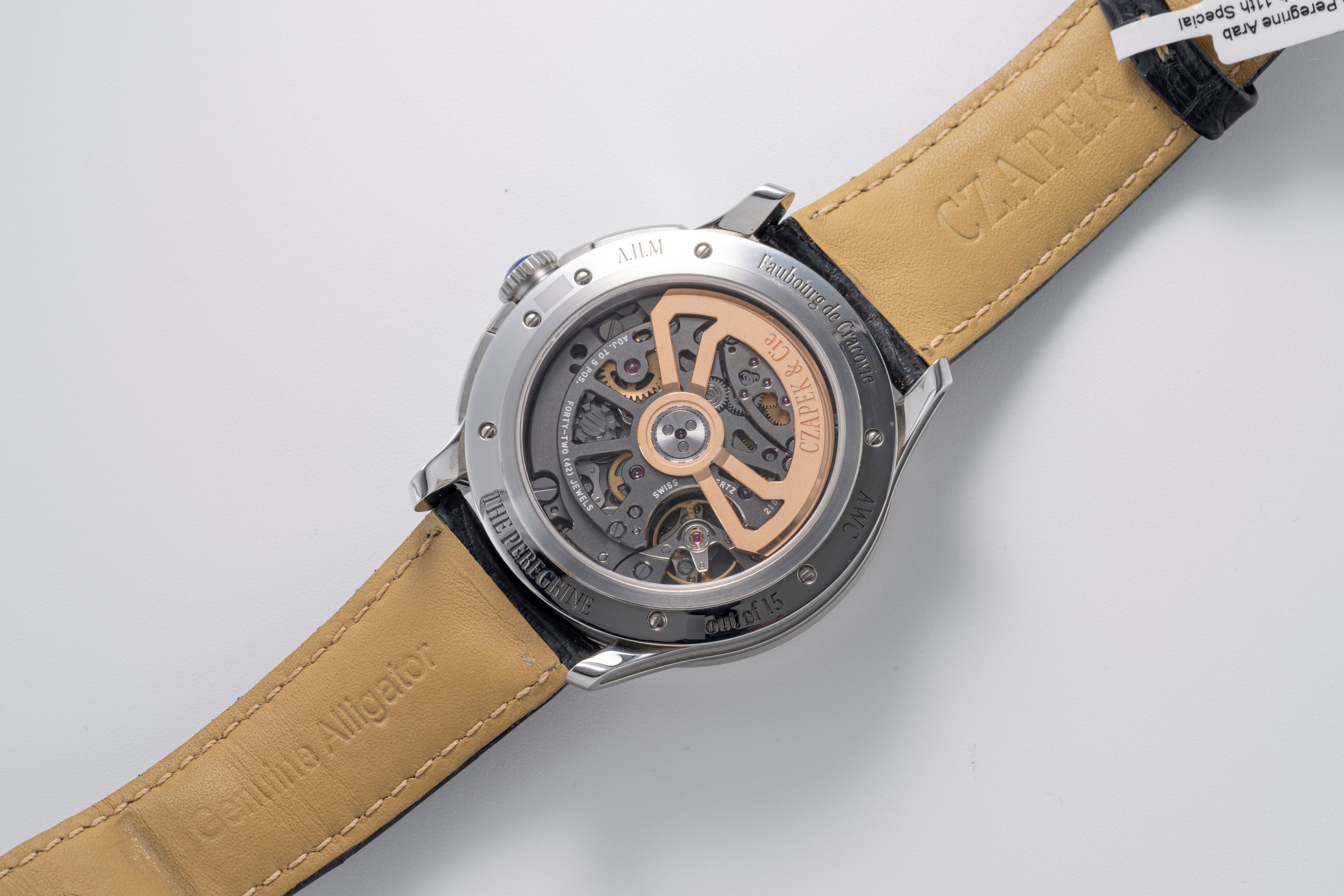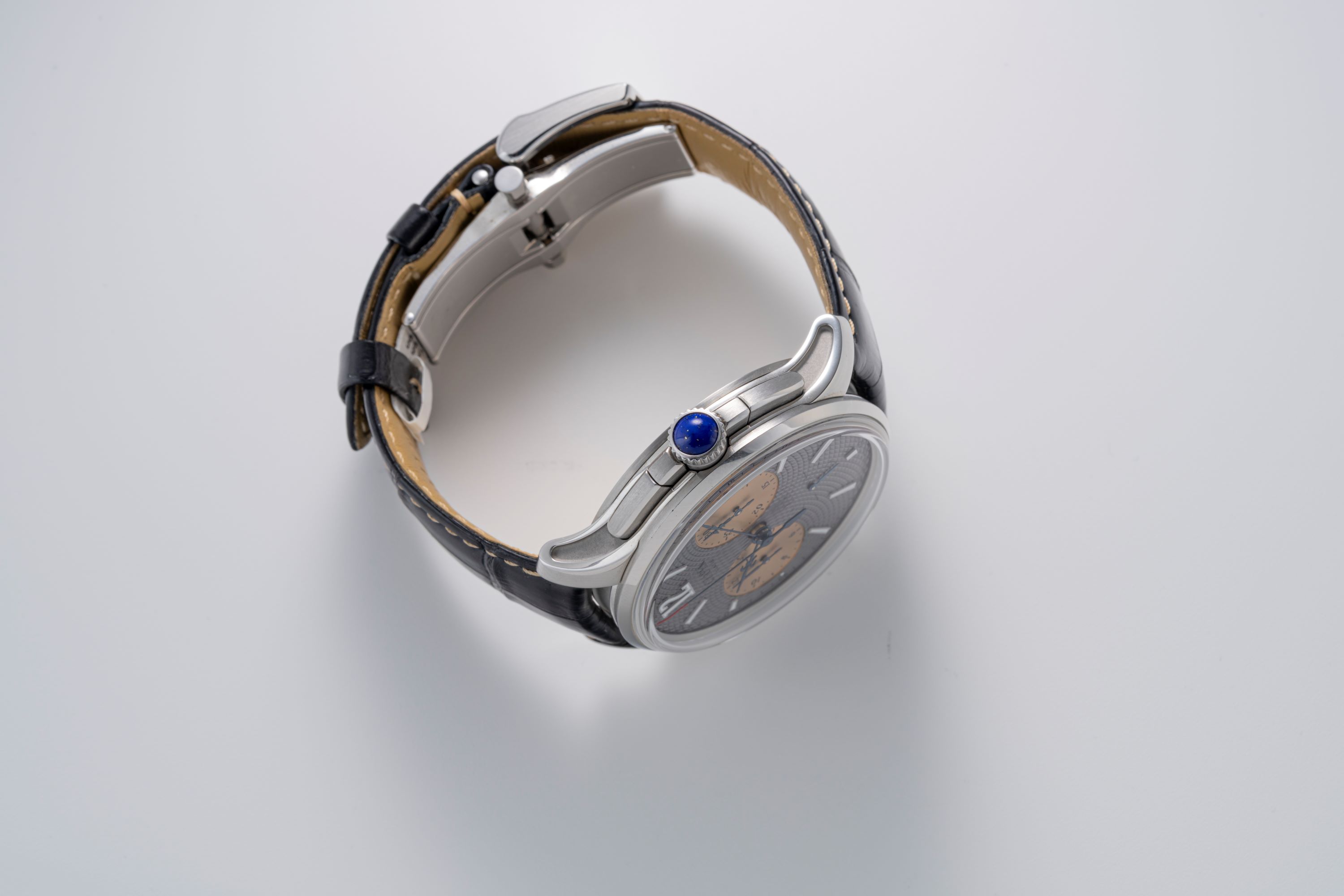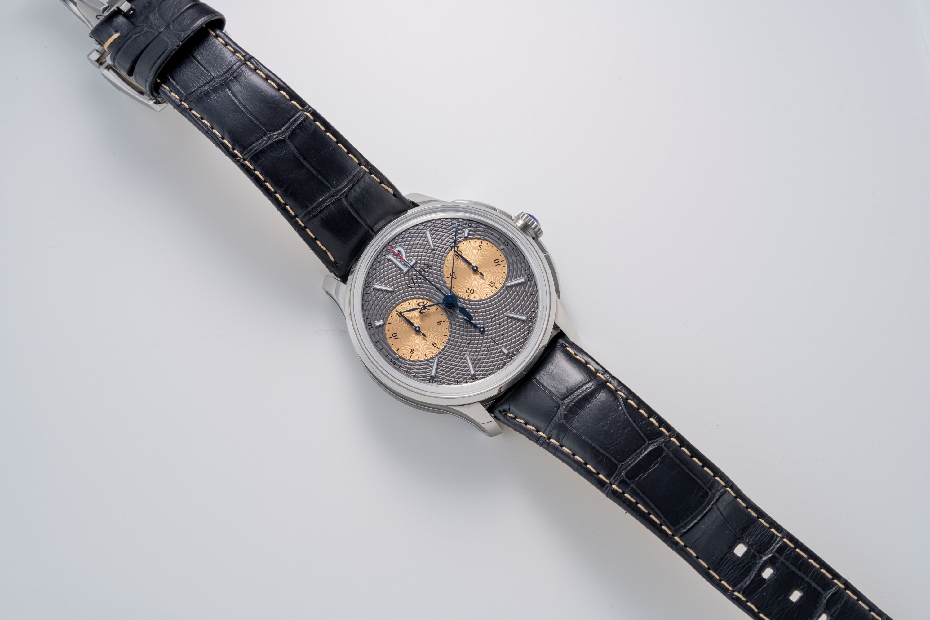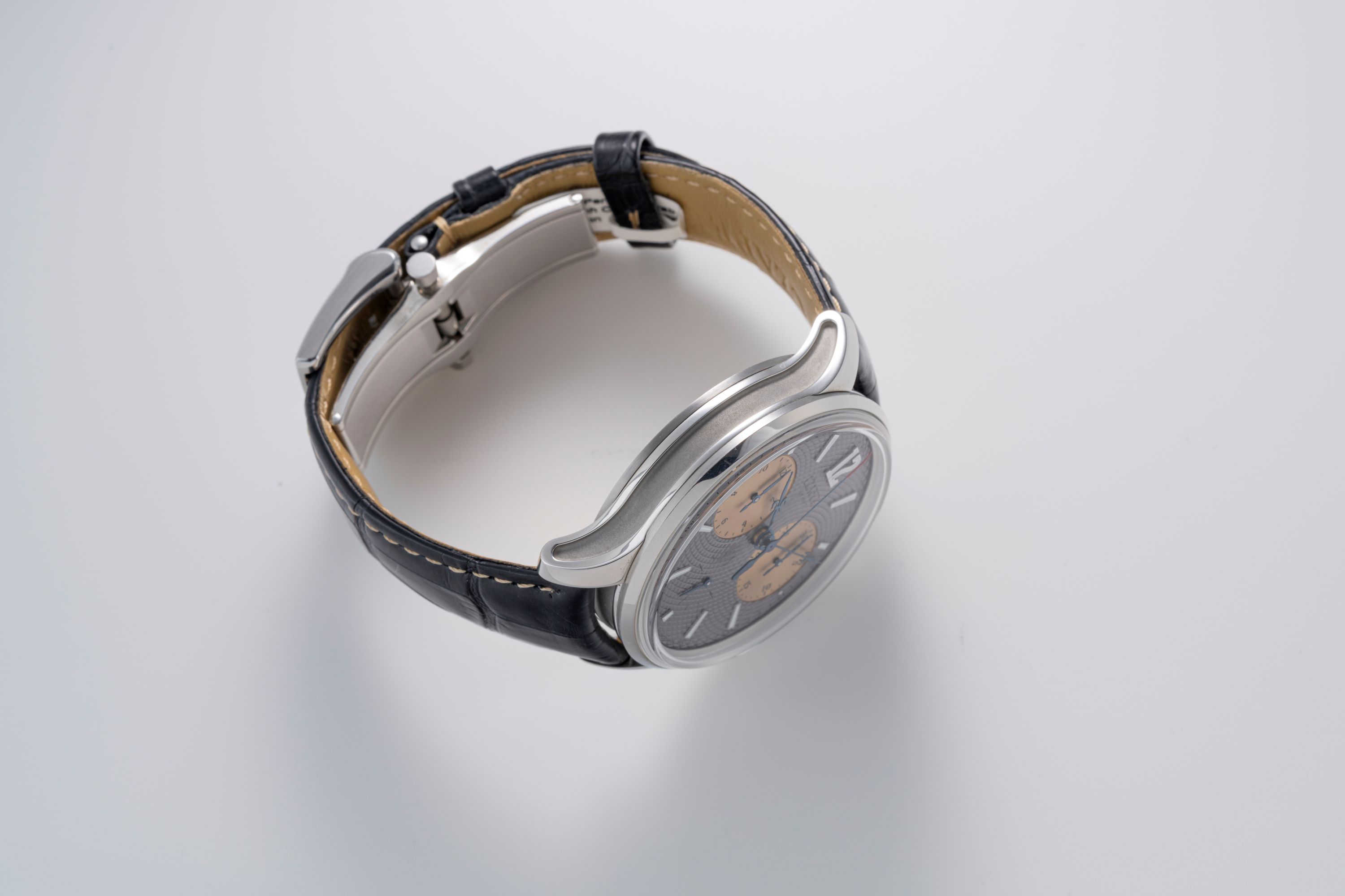 DialGrey guilloche dial with gold/yellow subdials, applied luminous indices, heat-blued hands, small seconds at 6 o'clock, 12 hour chronograph counter at 9 o'clock, and 30 minute chronograph counter at 3 o'clock, signed 'Czapek' at 12 o'clock