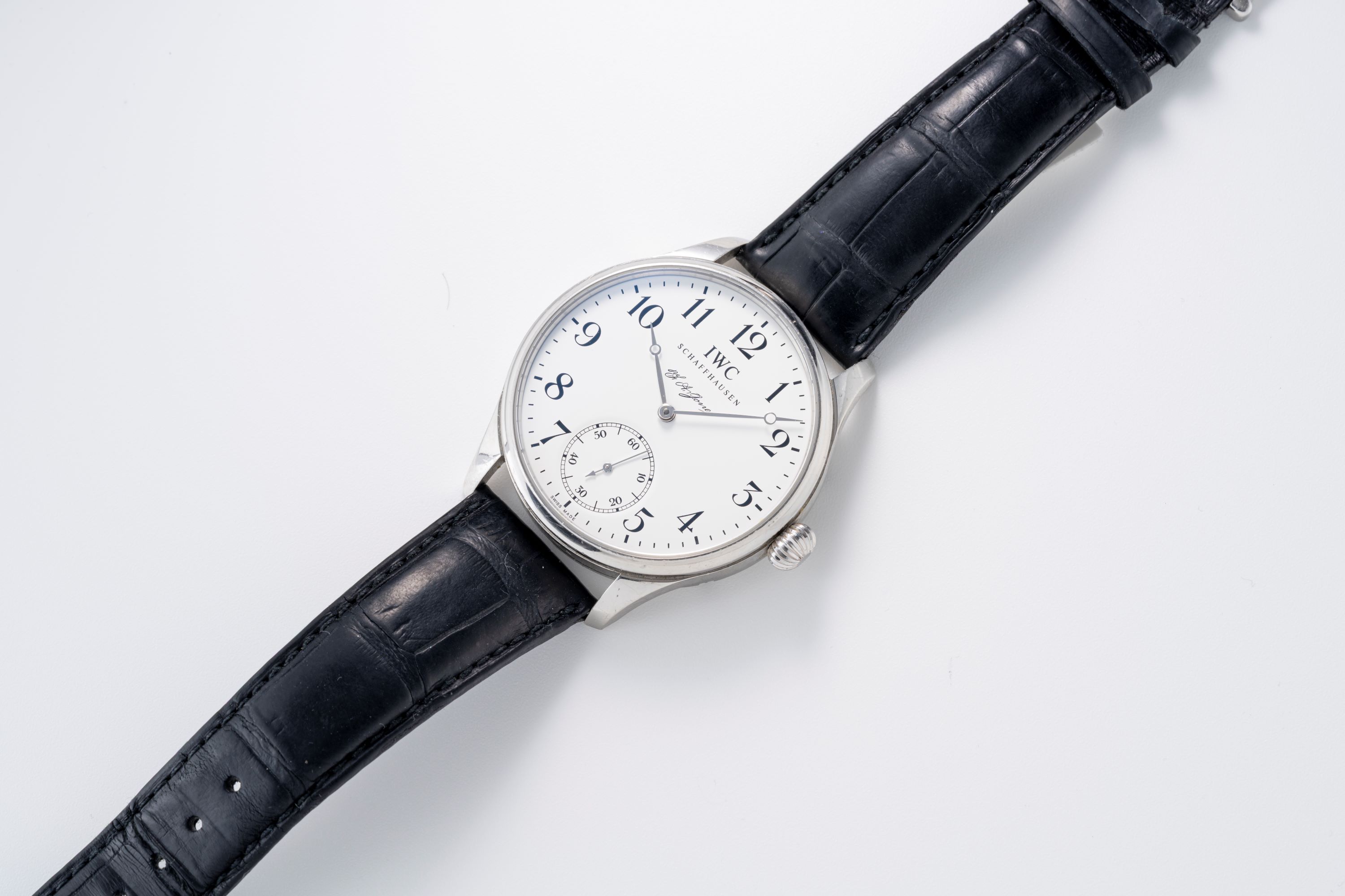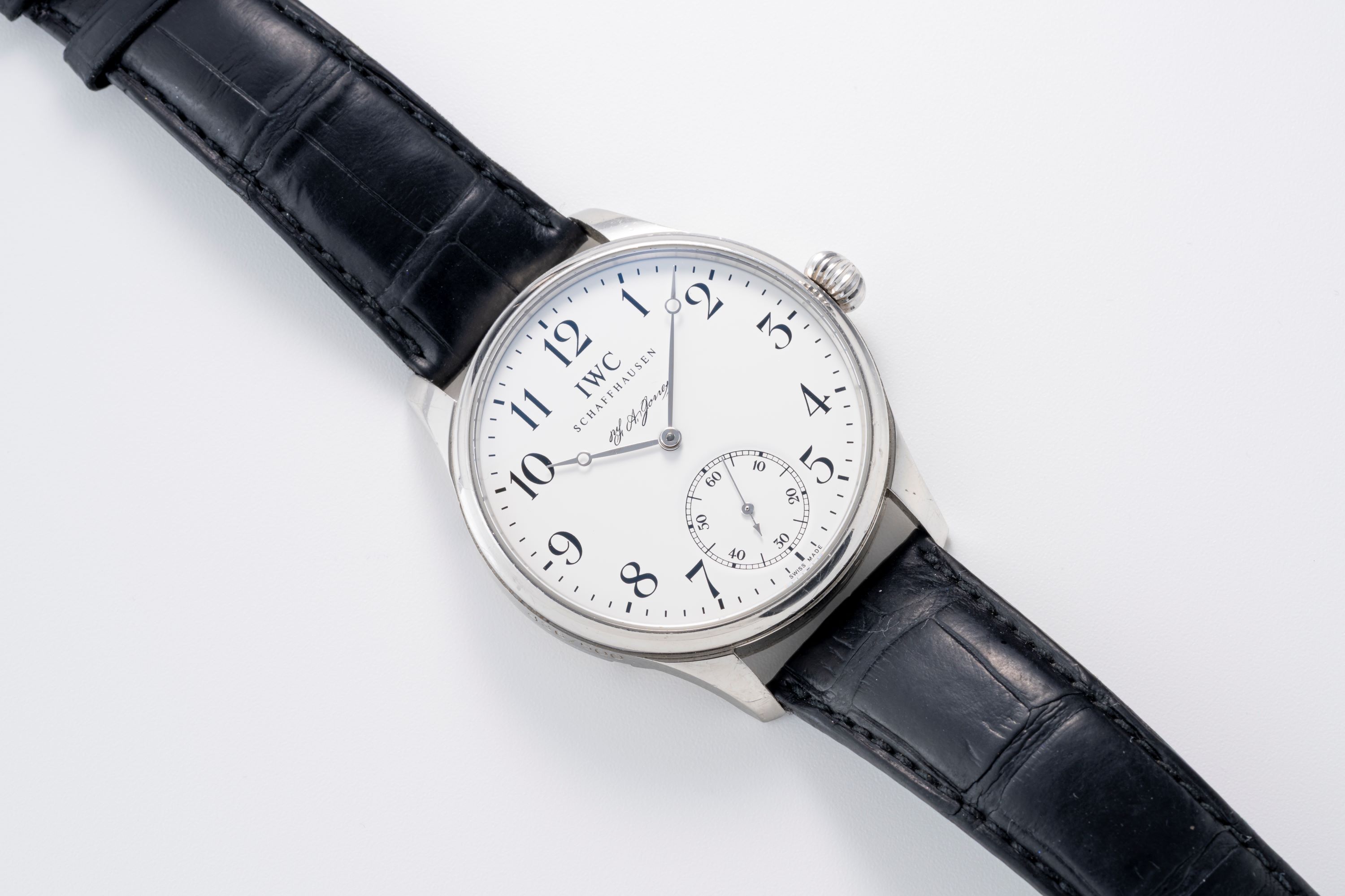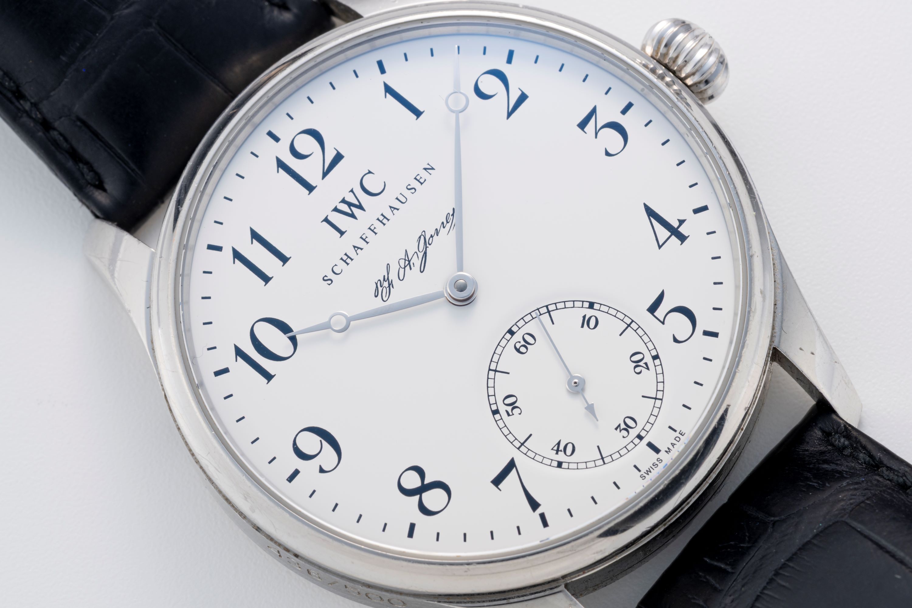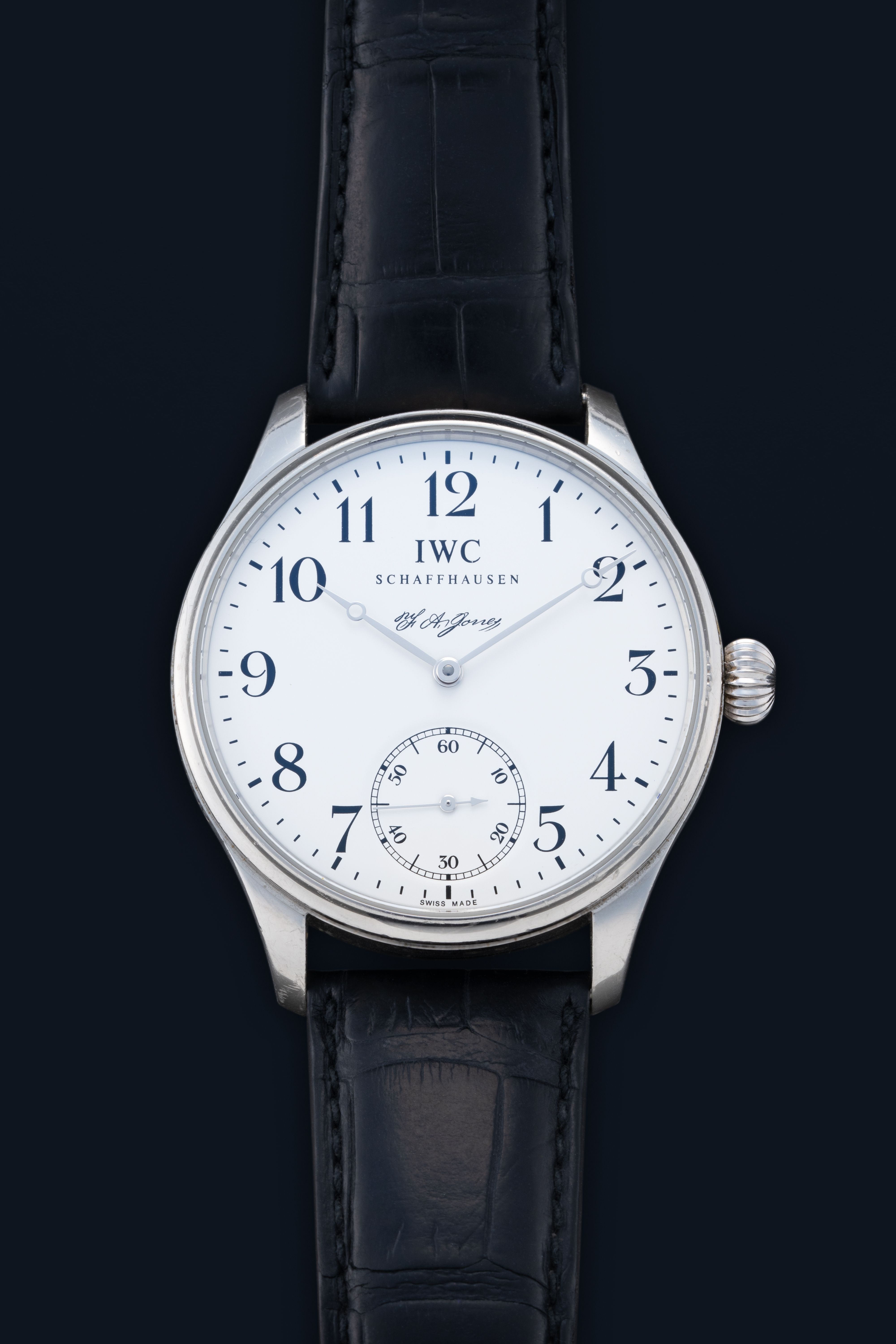 DialWhite enamel dial with black numerals, Breguet hands, small seconds at 6 o'clock, signed 'IWC' and 'F.A. Jones' at 12 o'clock