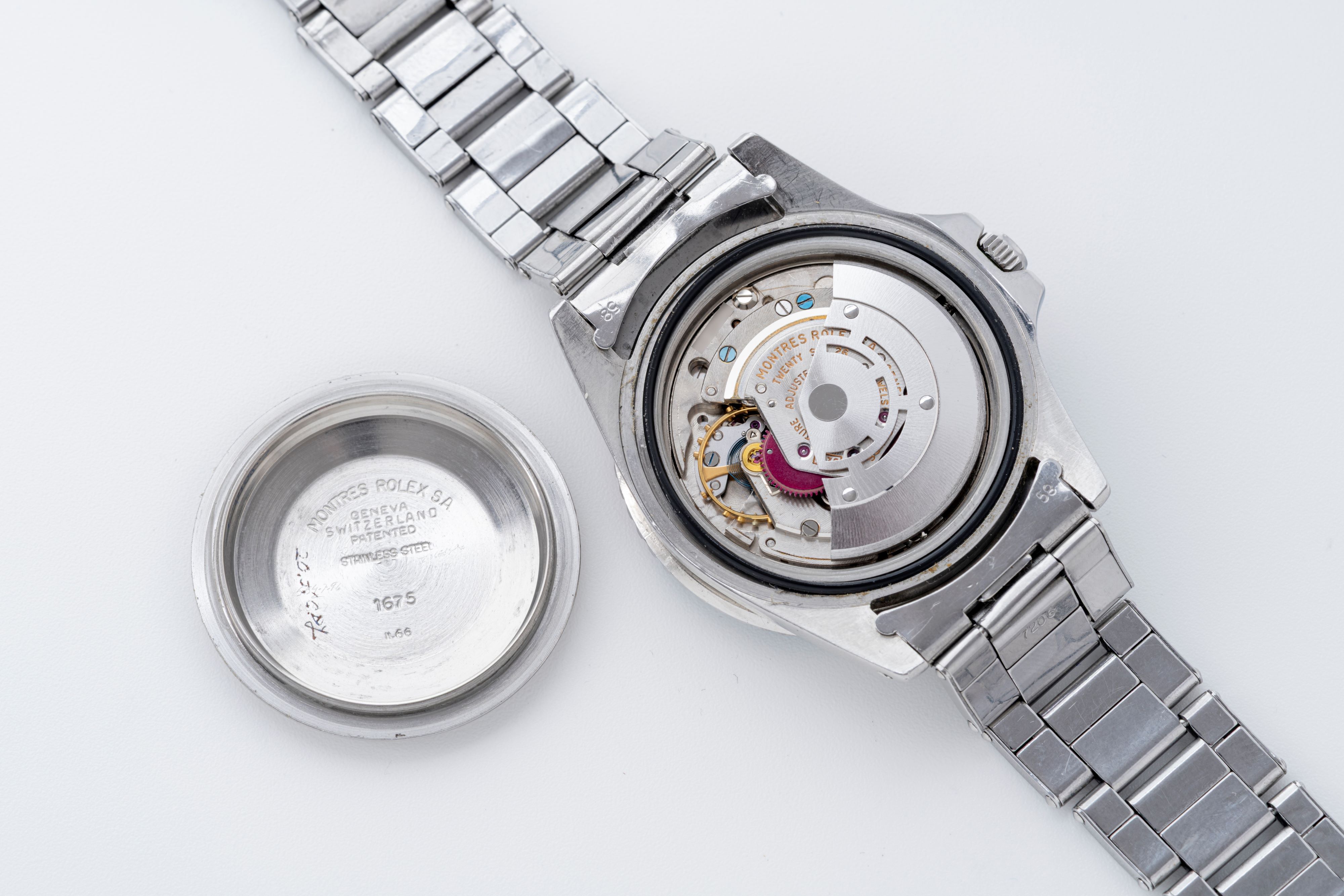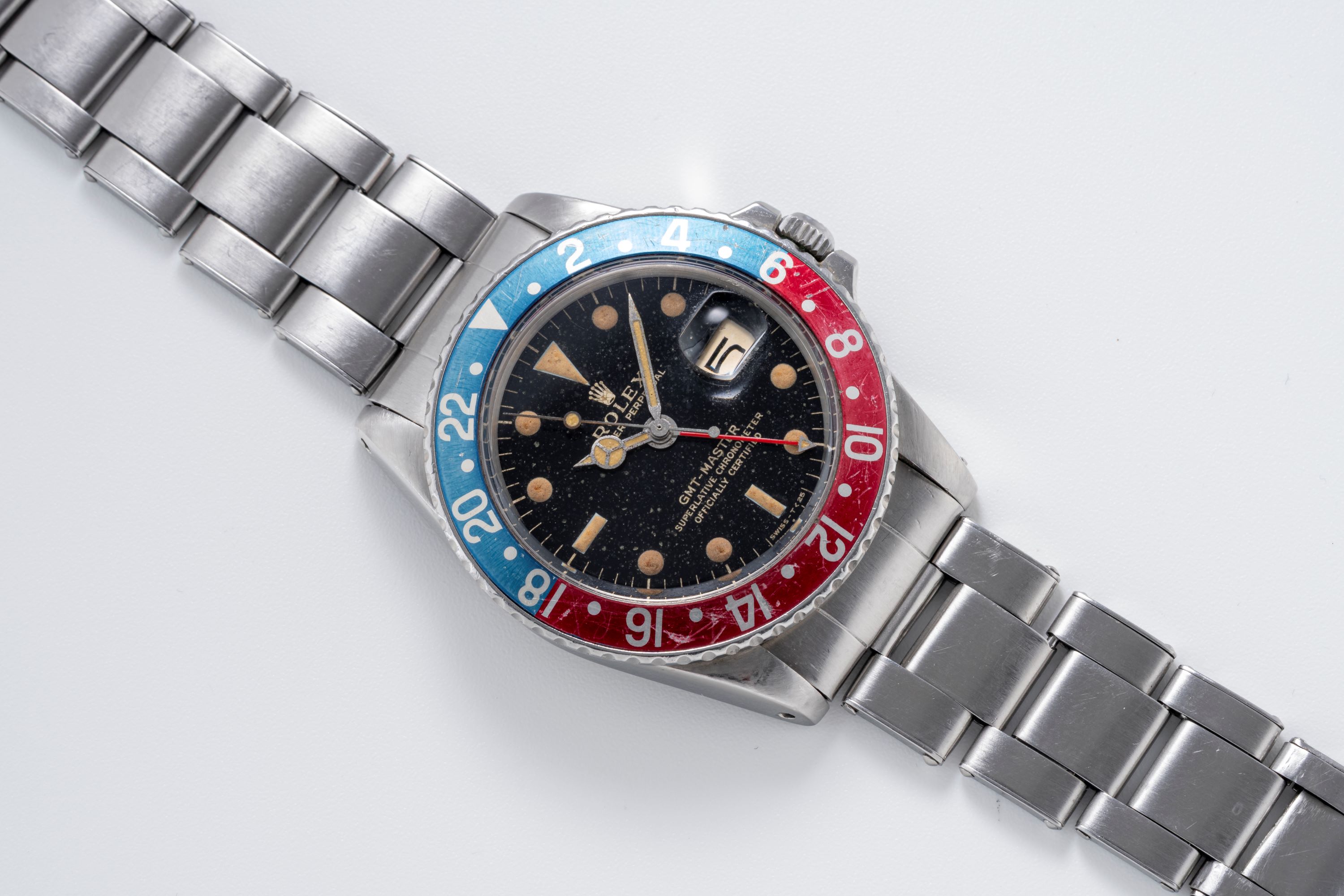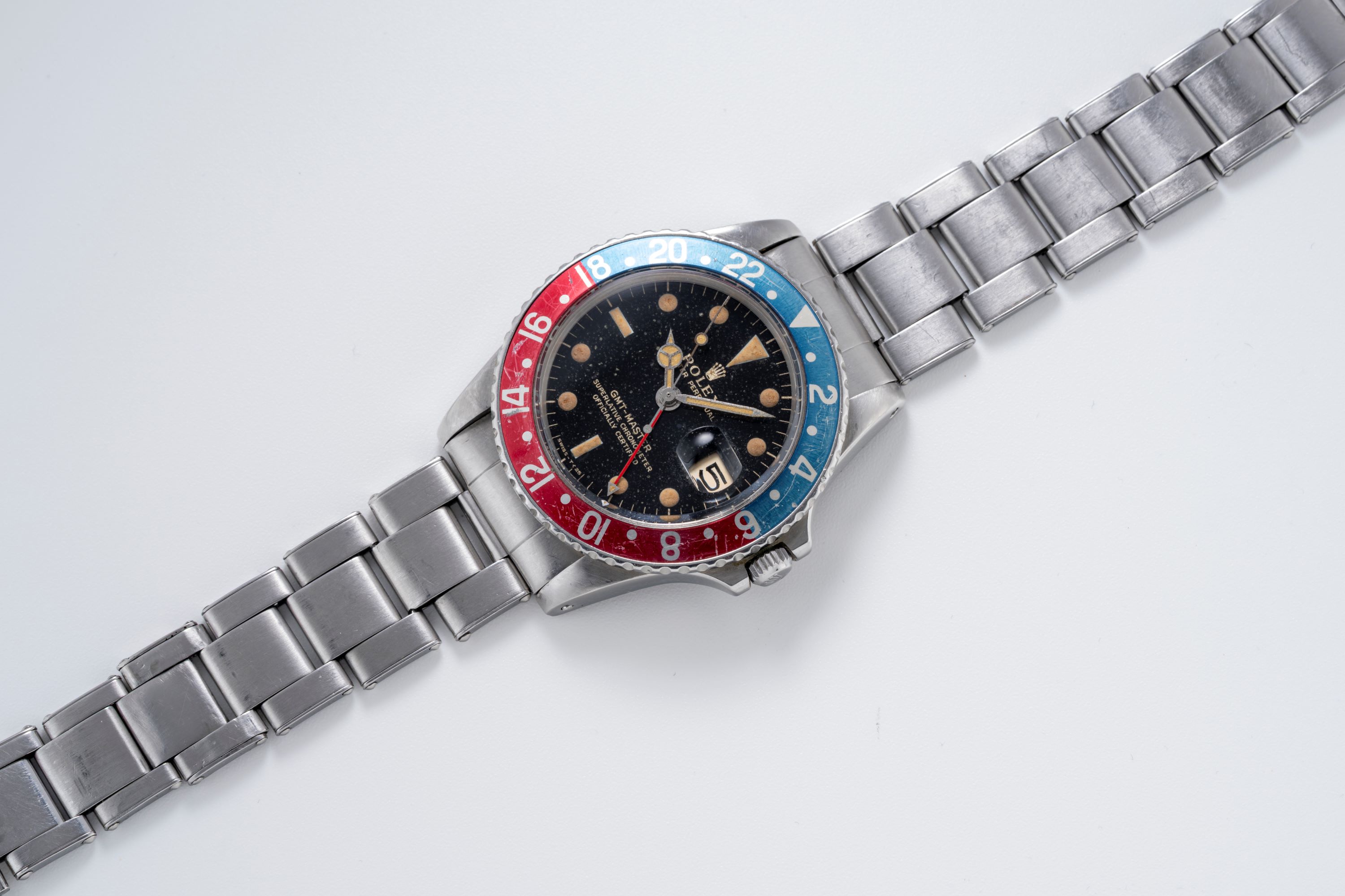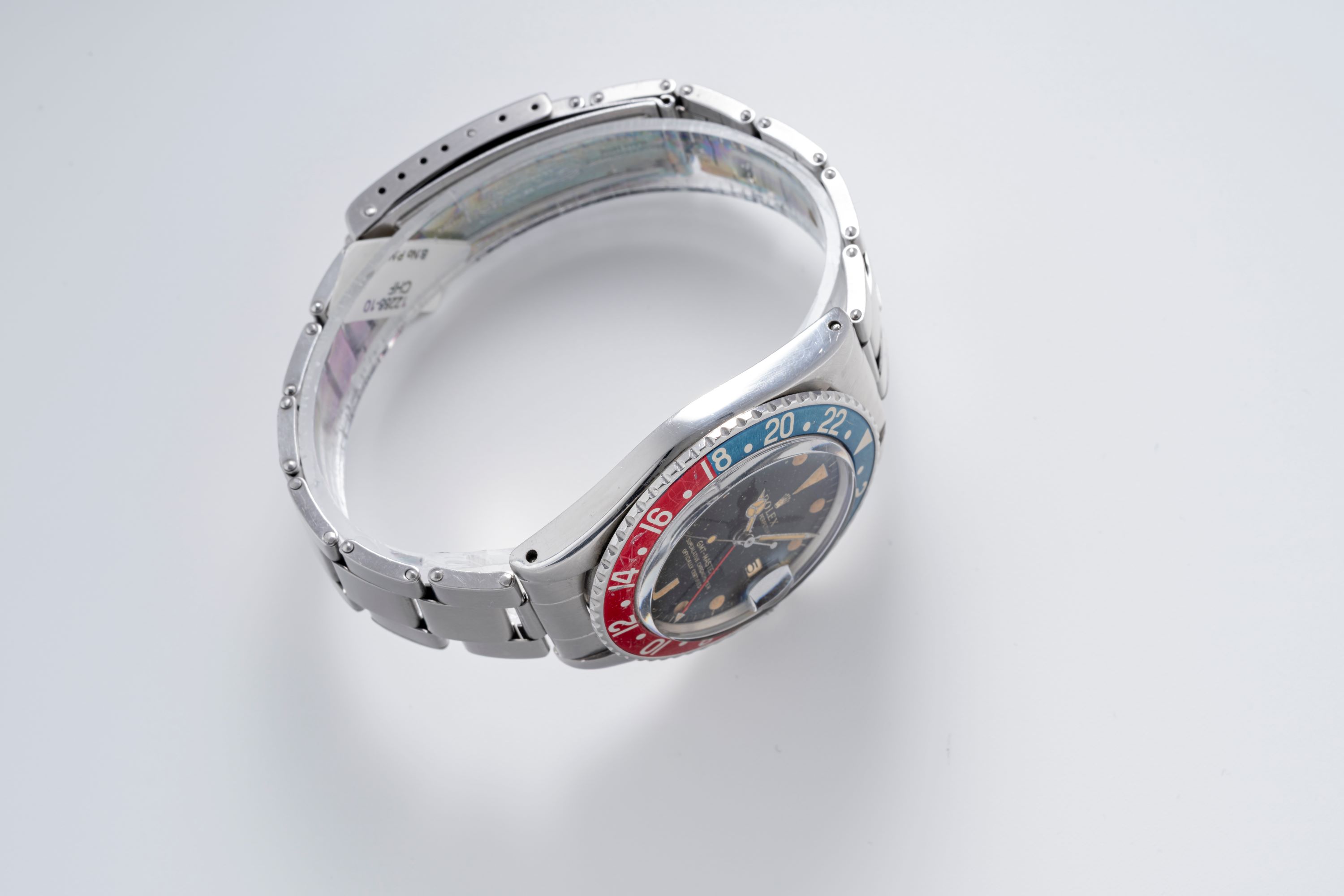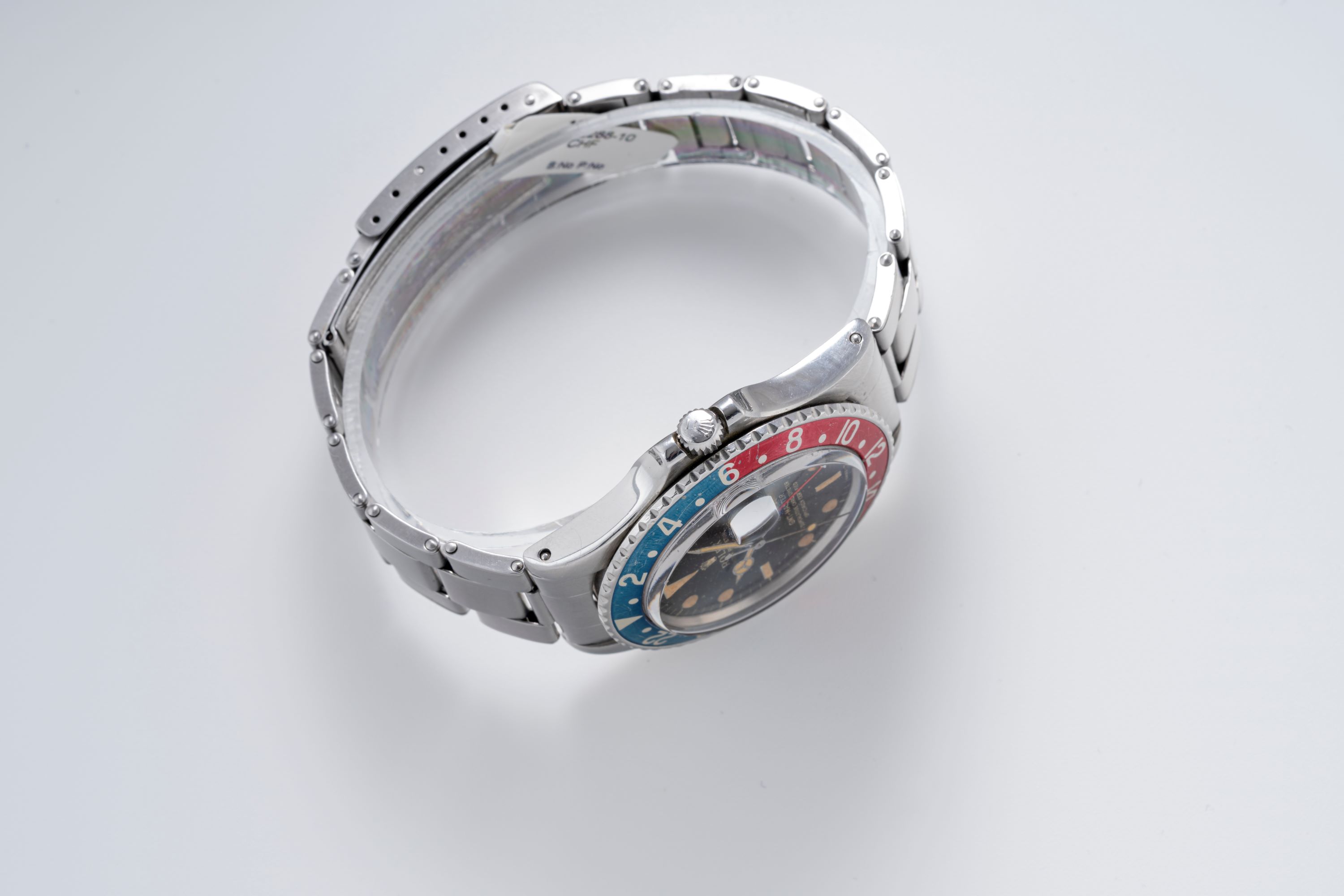 CaseRound case in stainless steel with crown at 3 o'clock, bi-directional rotating bezel with Pepsi aluminium insert, solid caseback