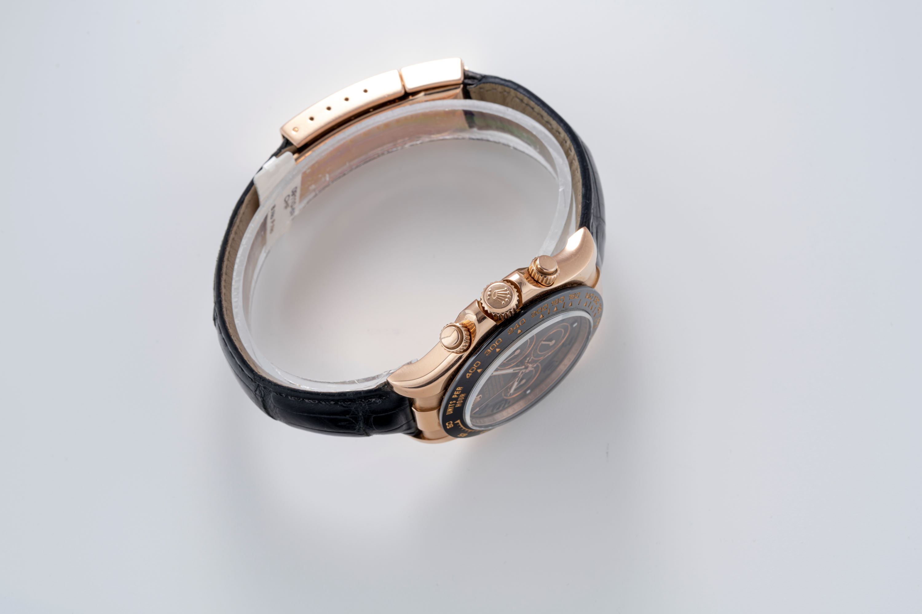 DialBrown sunburst dial with applied numerals, rose gold hands, small seconds at 6 o'clock, 30 minute chronograph counter at 3 o'clock, 12 hour chronograph counter at 9 o'clock, signed 'Rolex' at 12 o'clock