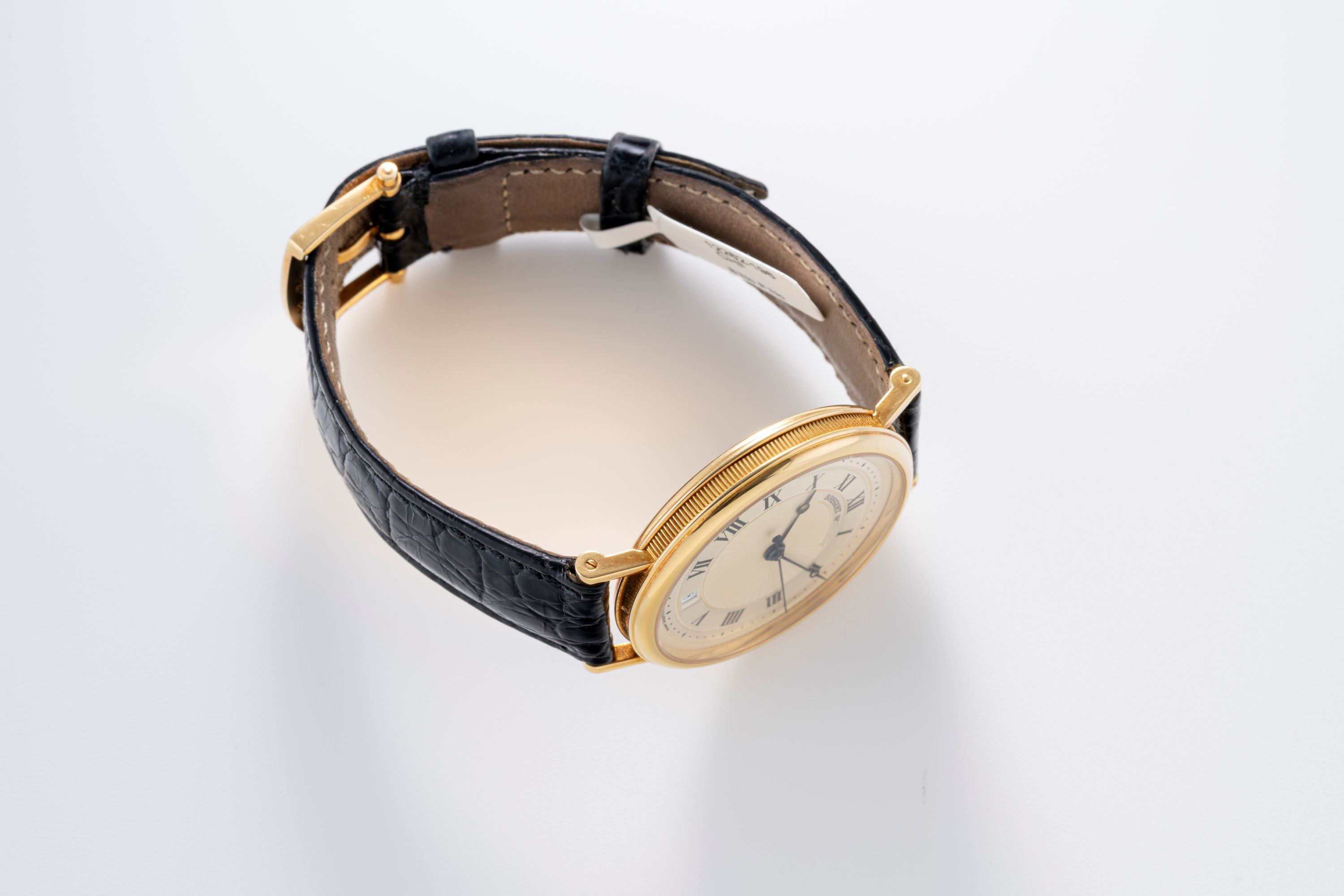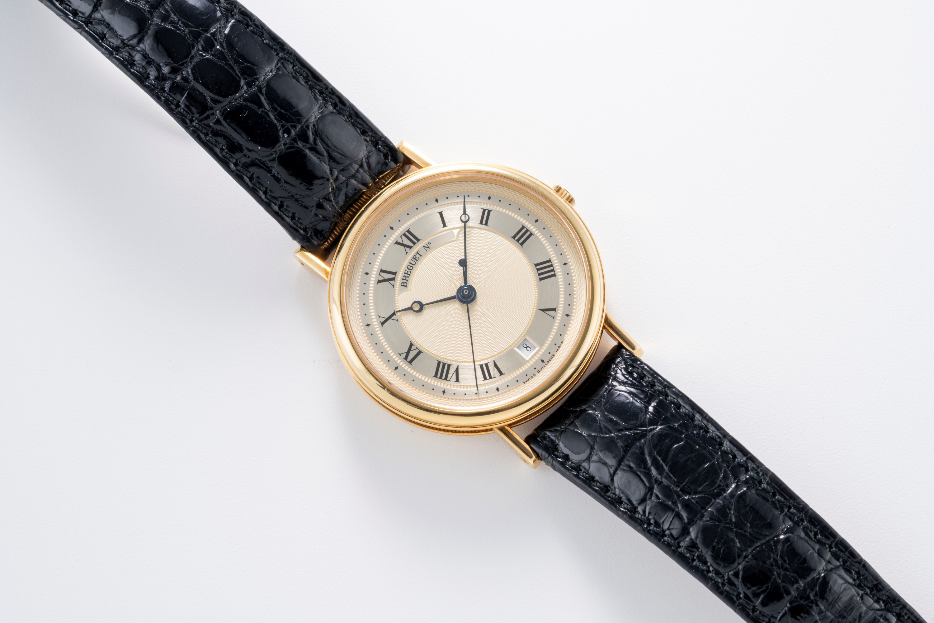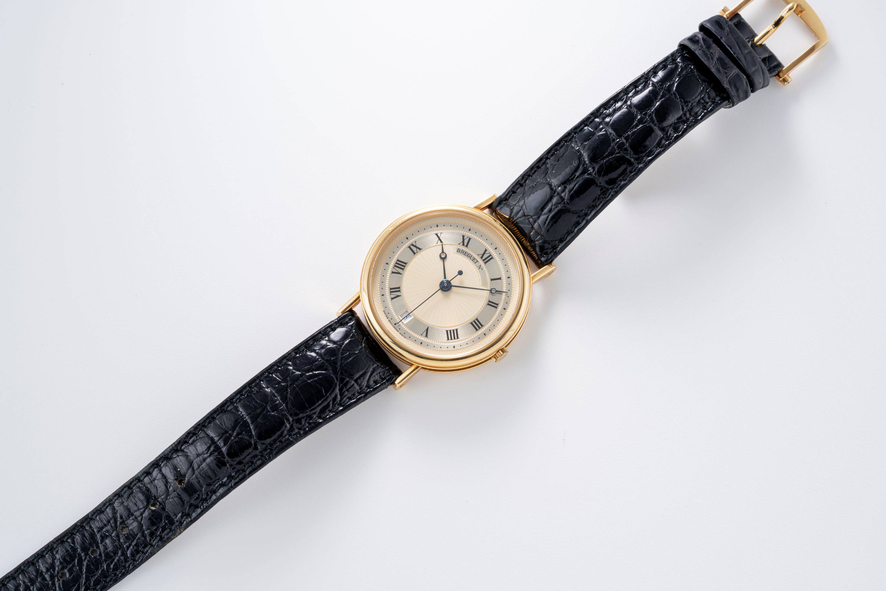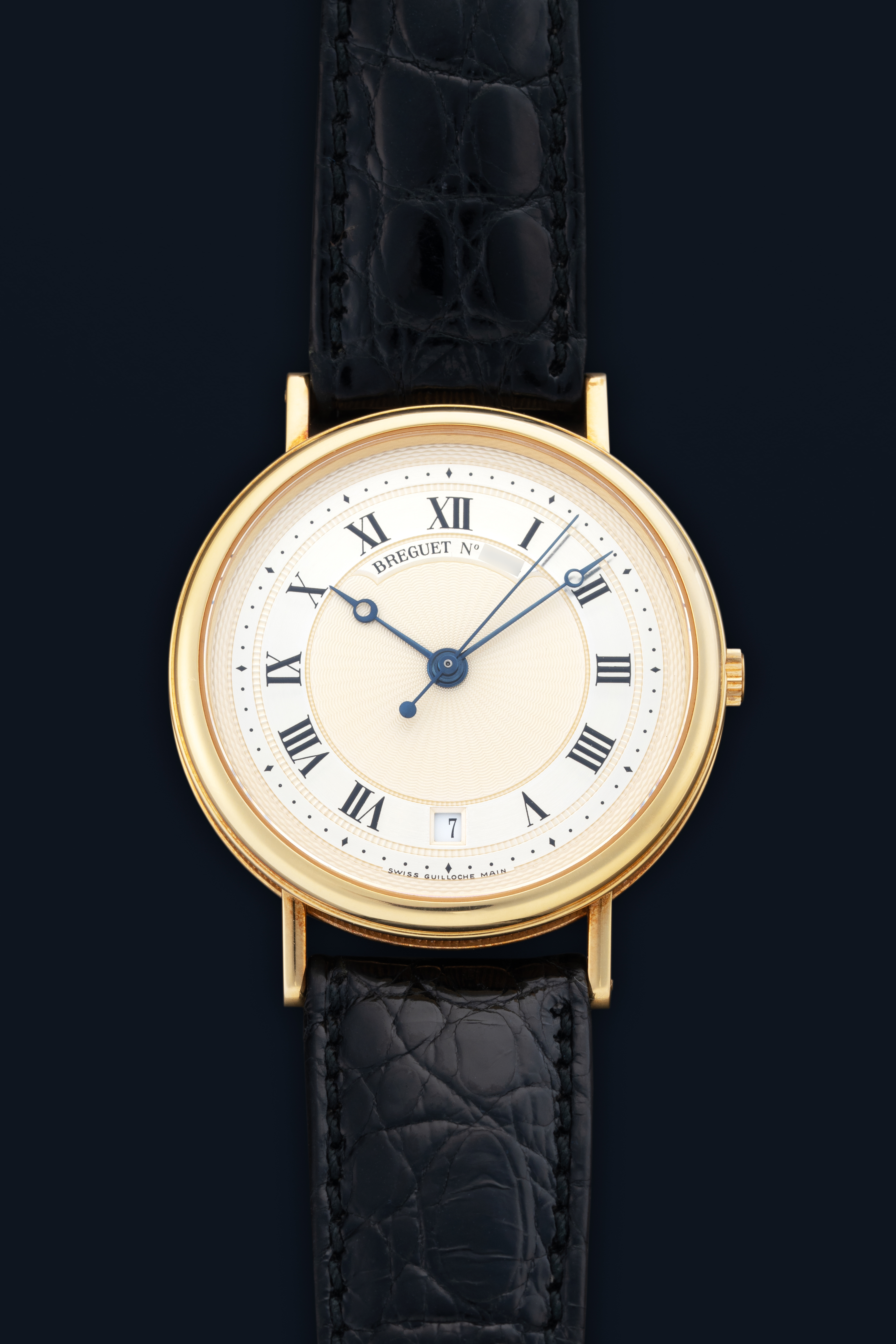 DialSilver guilloche dial with roman numerals, heat-blued Breguet hands, date window at 6 o'clock, signed 'Breguet' at 12 o'clock