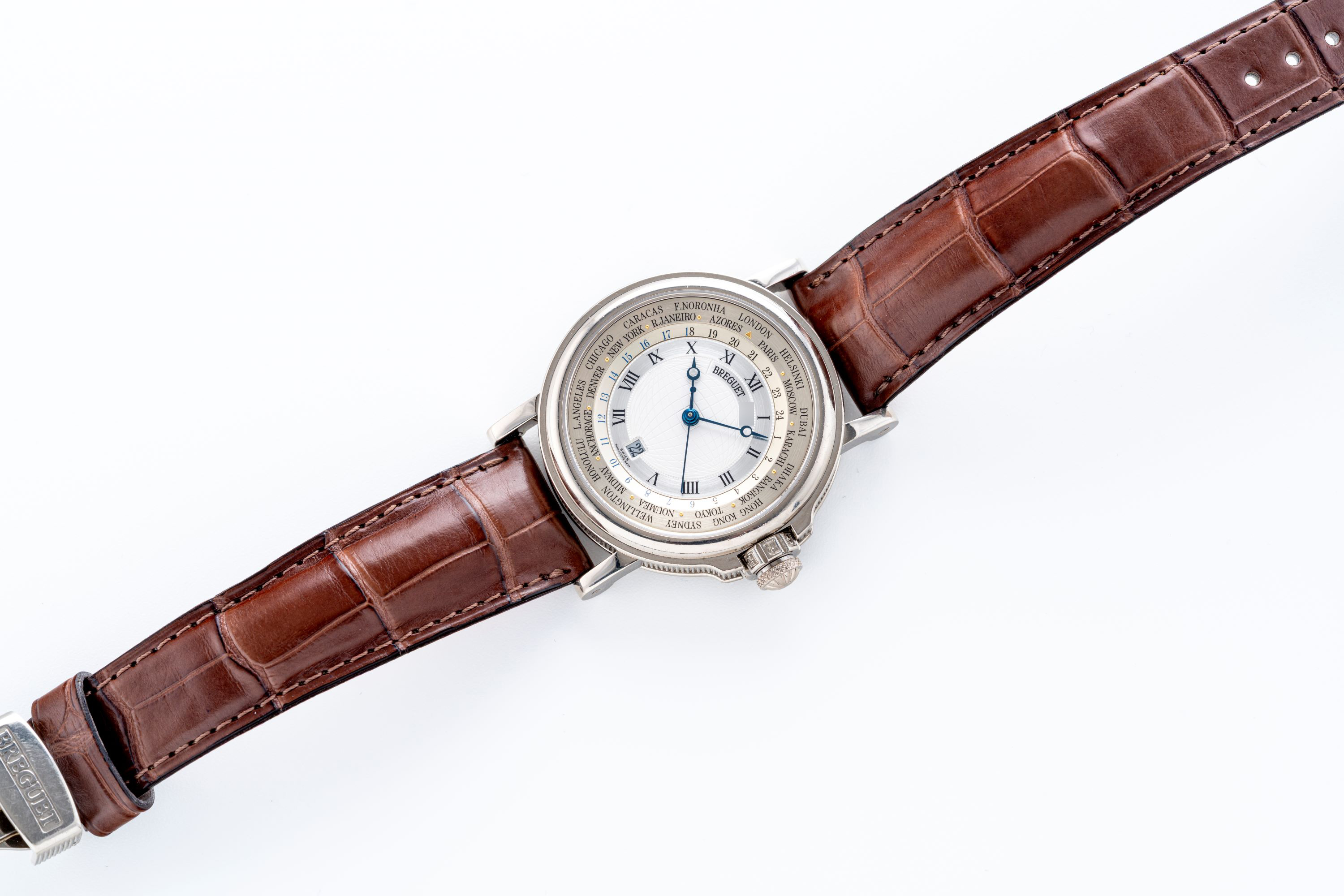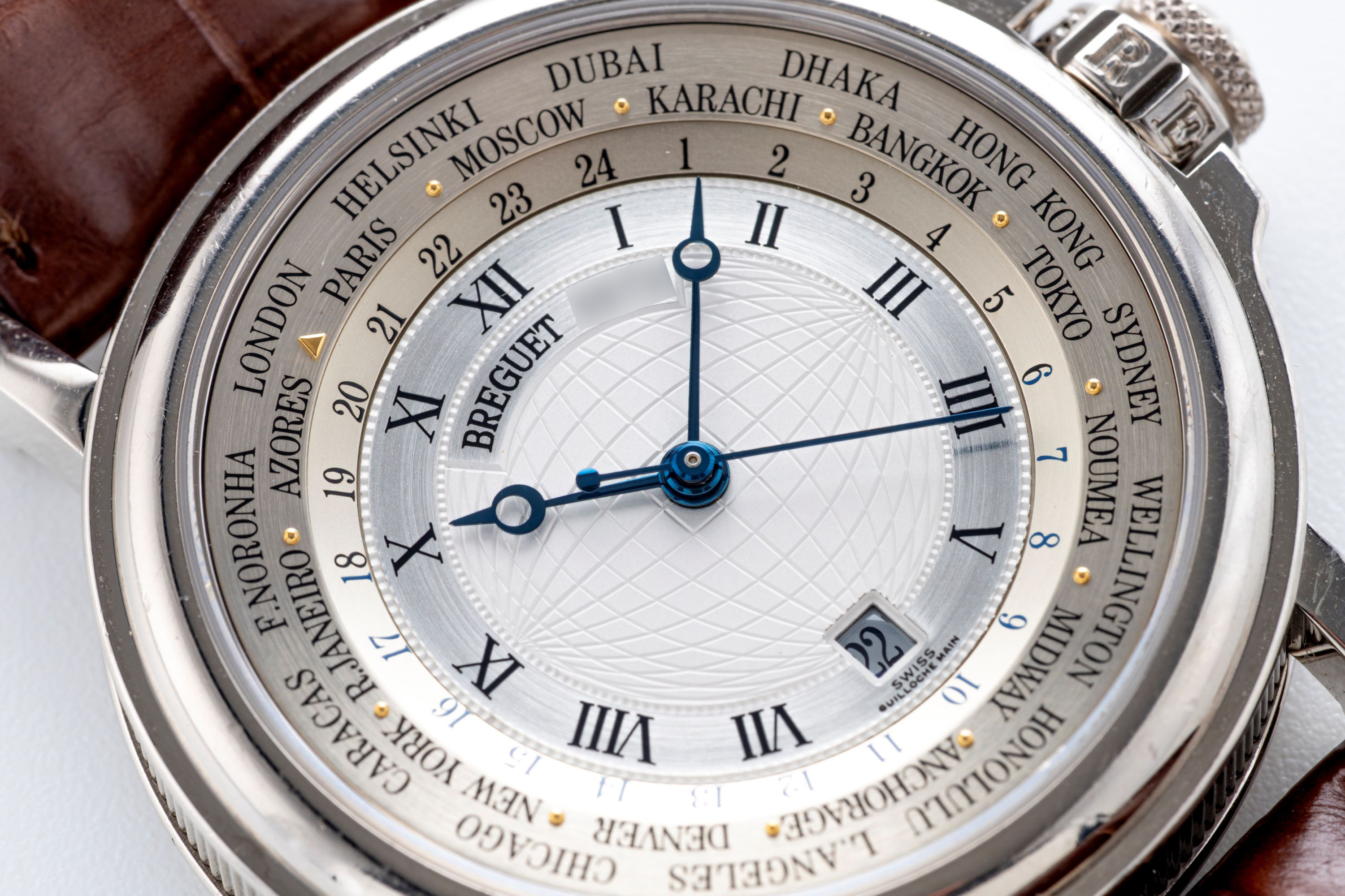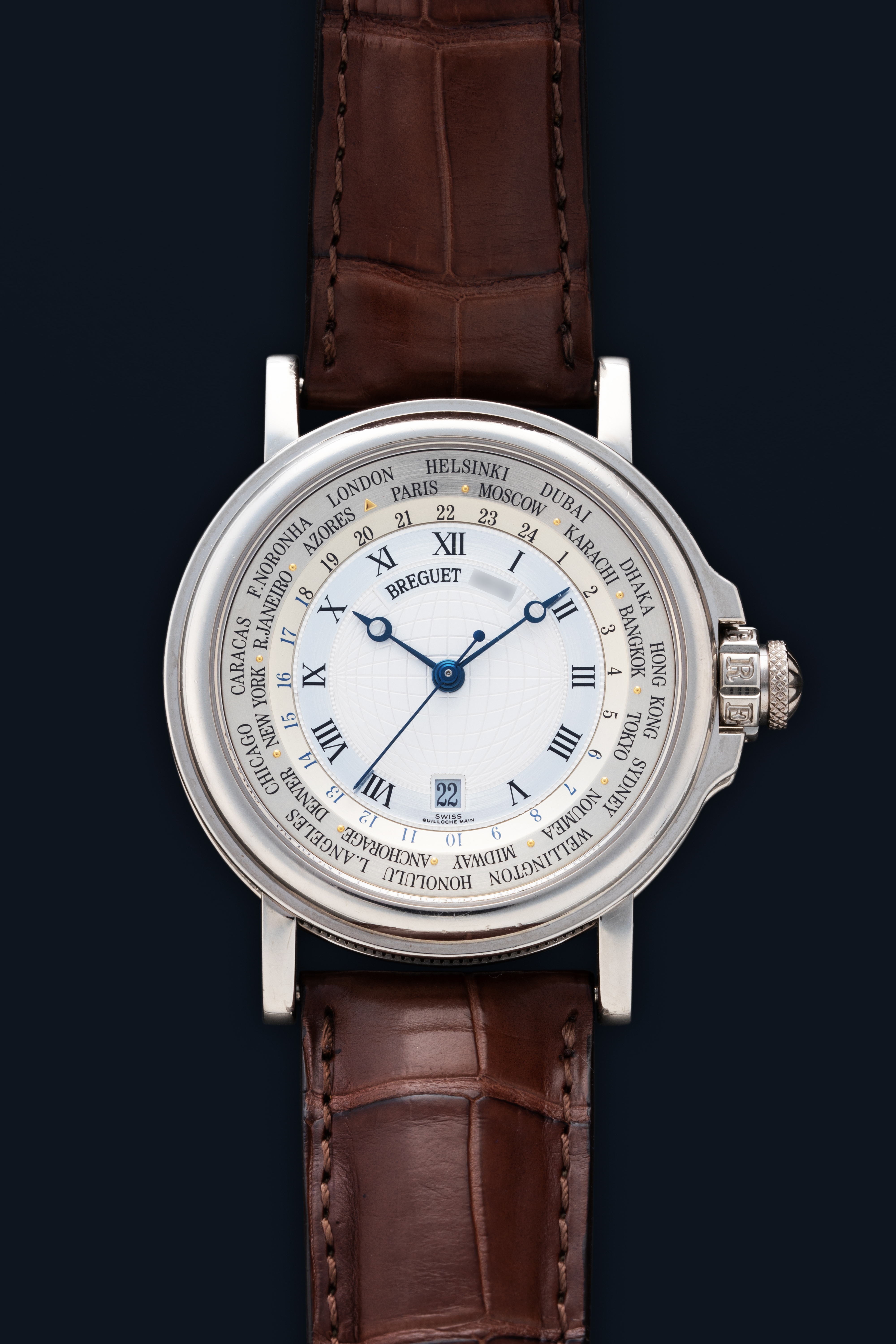 DialSolid gold silvered dial, signed ‘Breguet’, central zone with ‘meridians and parallels’ engraved motif, blued steel ‘pomme de Breguet’ hour and minute hands, central seconds hand, date aperture at 6 o’clock, black Roman numerals, peripheral 24-hour world time display with city names
