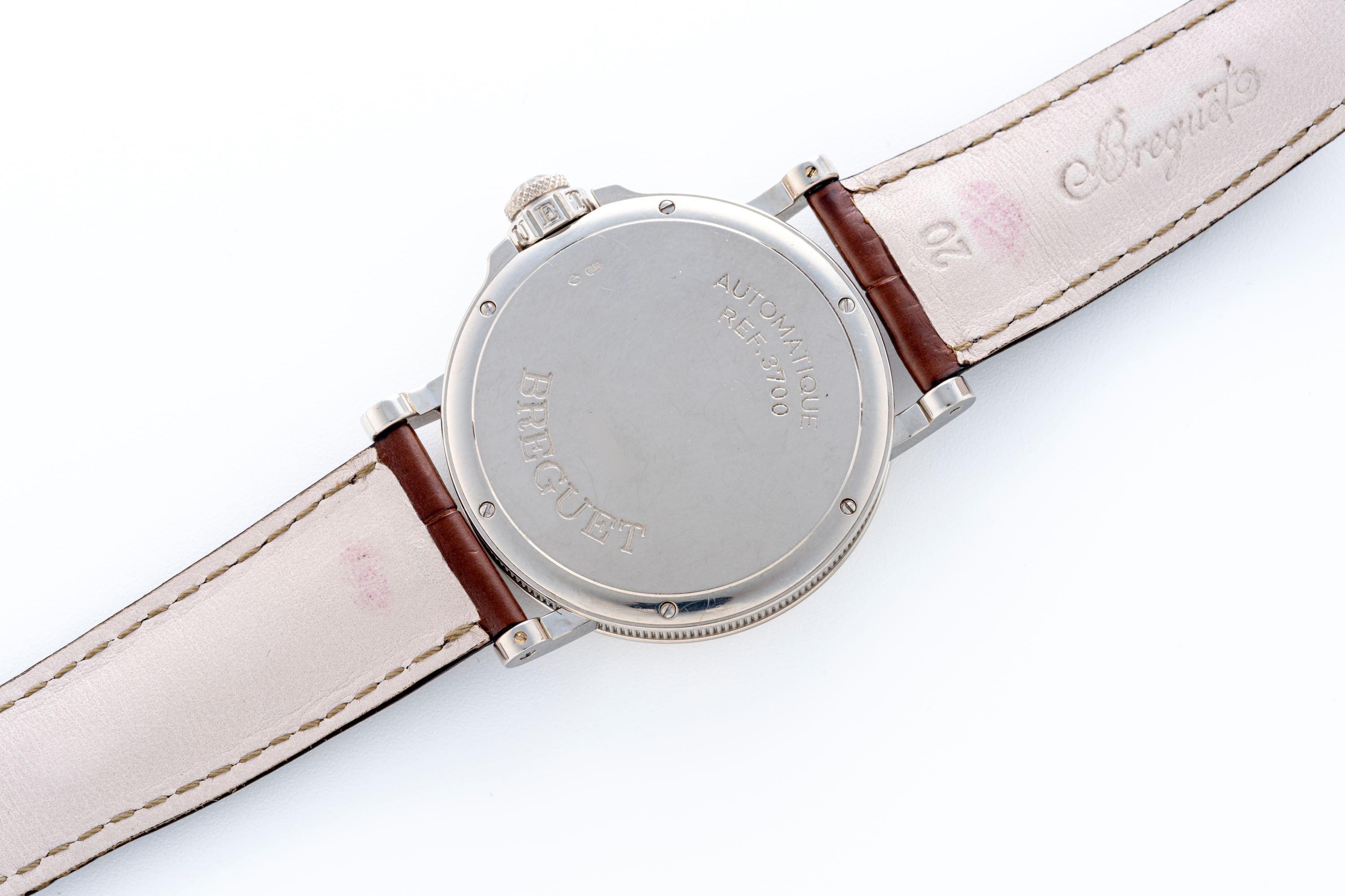 CaseRound case in 18k white gold, polished, fixed bezel in 18k white gold, polished, ribbed caseband, solid gold caseback fixed on 6 screws, engraved with Breguet logo, ‘Automatique’, reference and case numbers, Breguet Marine crown at 3 o’clock between protective shoulders of the case, signed Breguet