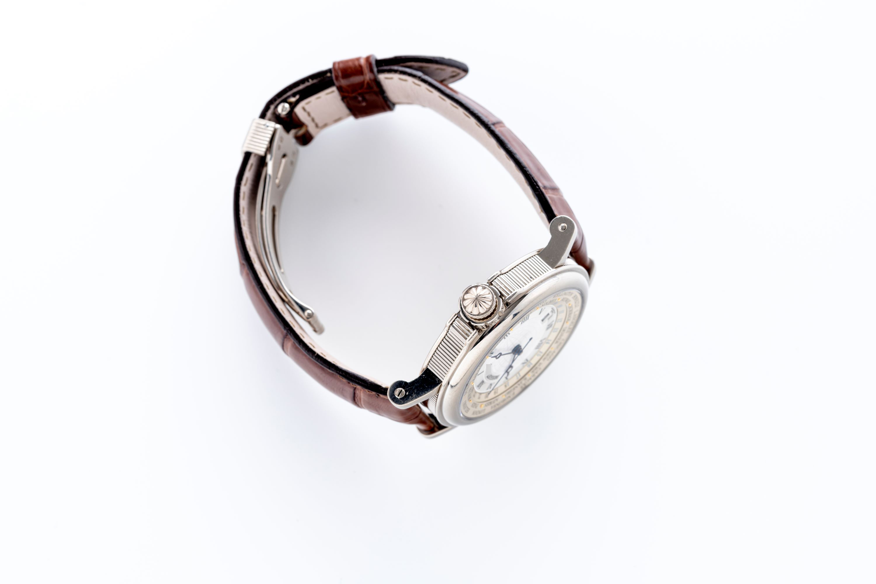 MovementSelf-winding mechanical movement, rhodium-plated, bridges with Cotes de Geneve, mainplate with perlage, engraved and guilt inscriptions, functions: hours, minutes, seconds, date, world time
